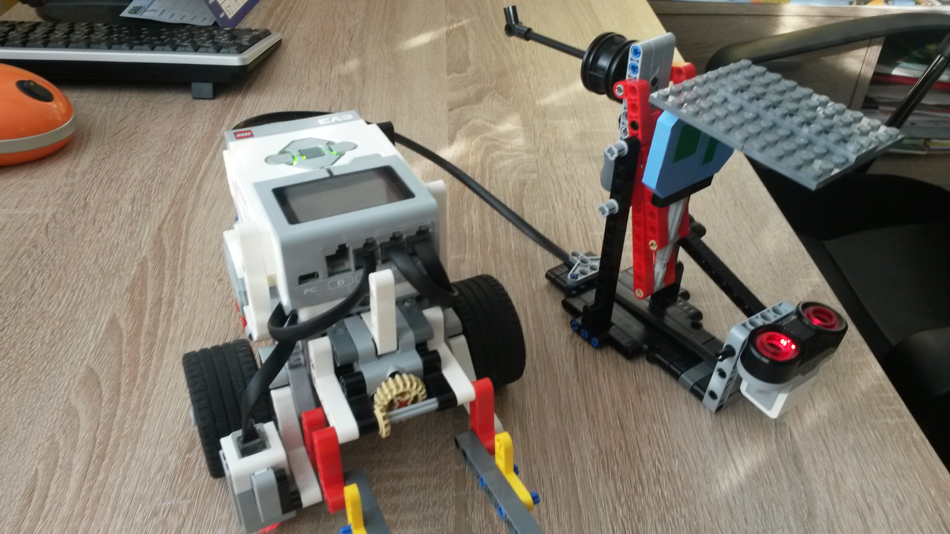 Misia Páková váha nás tiež zaujala a tak sme sa rozhodli, že ju vylepšíme, aby sme uľahčili porotcom odčítavanie. Na obrázku vidieť, že sme ku konštrukcii pridali: ultrazvukový senzor, vrchnú plošinu a malé protizávažie. Robot na odvoz a ukladanie závaží použil klasický vyklápací systém.