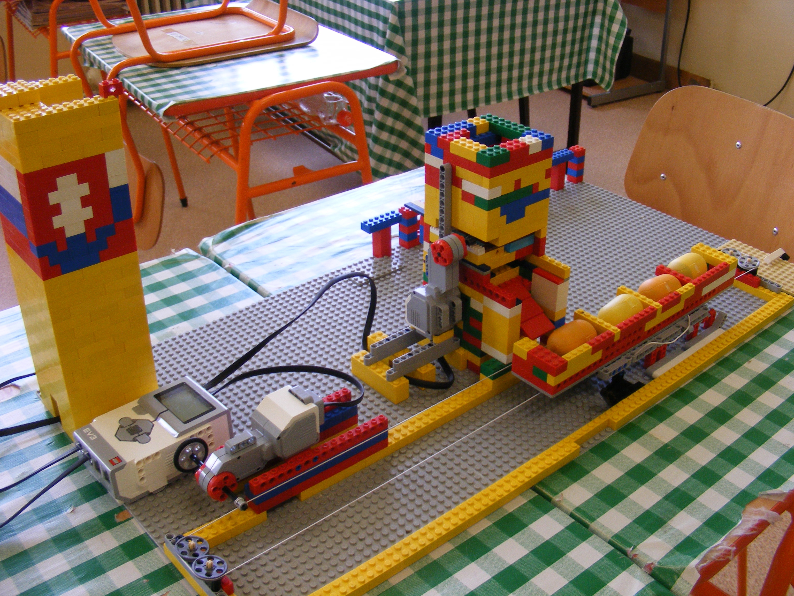 Náš robot najsôr pomocou ultrazvukového senzora zmeria "hmotnosť" vajíčok a zapíše nameranú hodnotu do premennej aj s poradím merania. Na meranie hmotnosti sme požili kabínku zavesenú na gumičke. Pri väčšej hmotnosti sa gumička natiahne viac. Potom program usporiada hodnoty hmotnosti. Pri každej hodnote hmotnosti je uložené aj poradie pri vážení (použitá je premenná Array). Nakoniec robot vyloží vajíčka pred seba na posuvnú plochu.