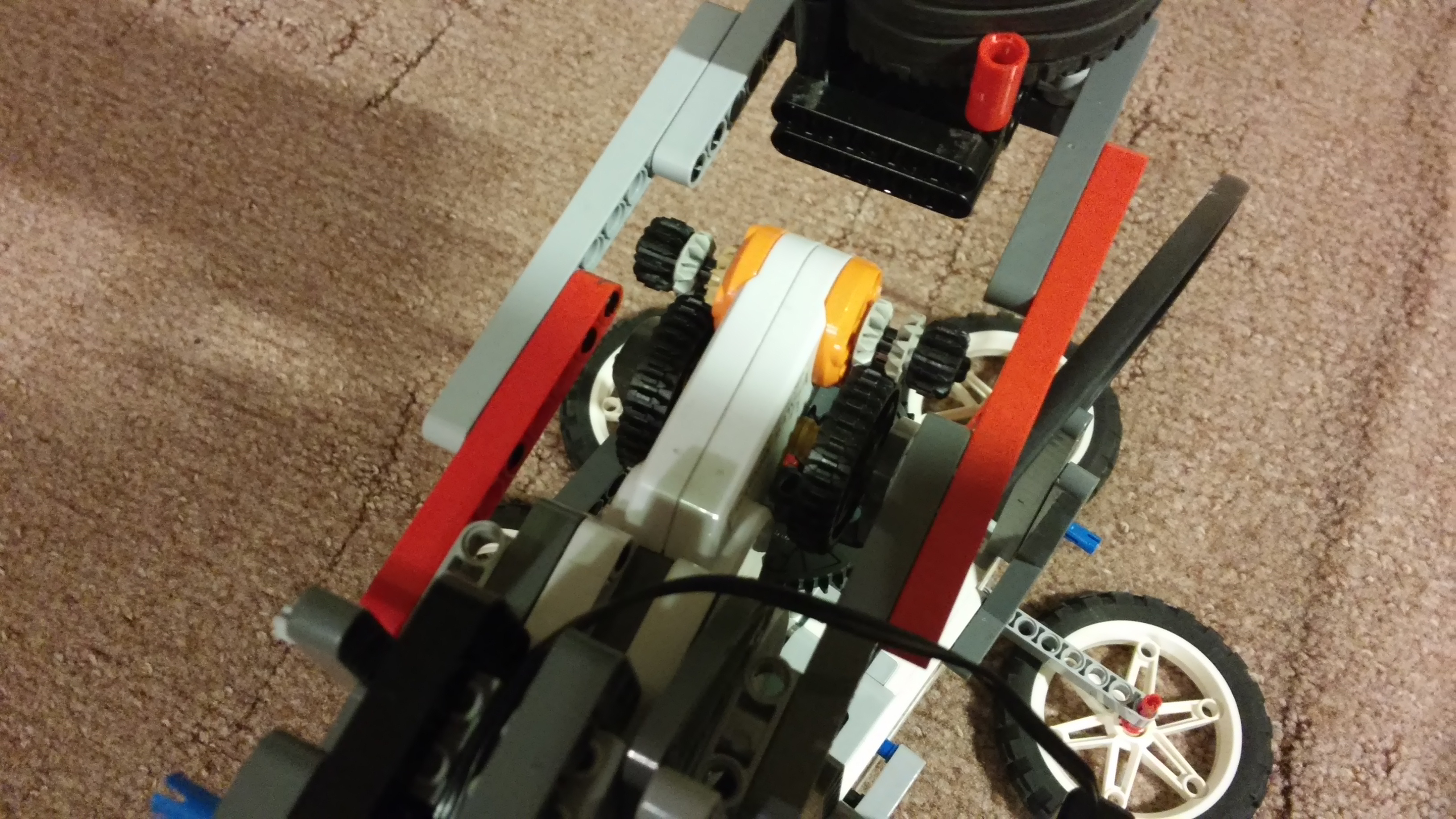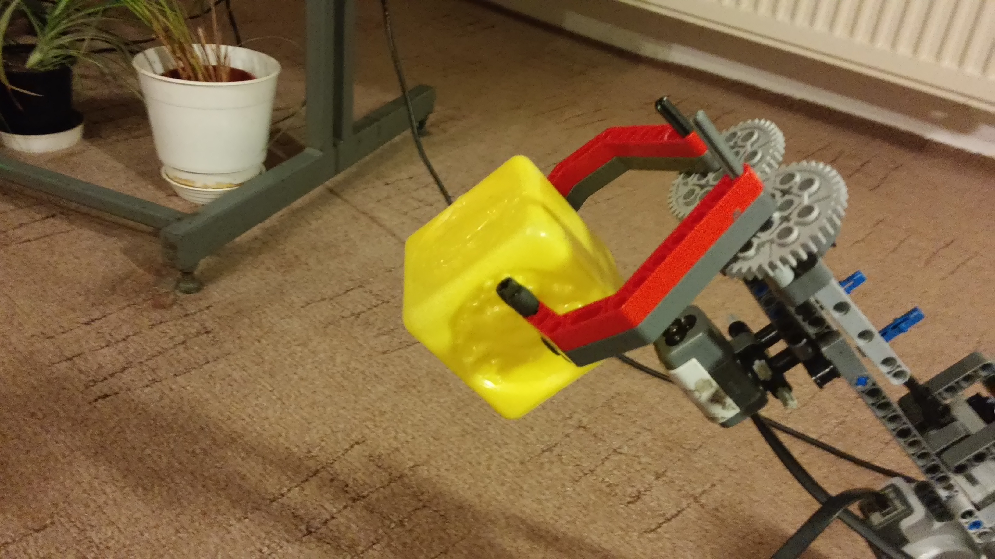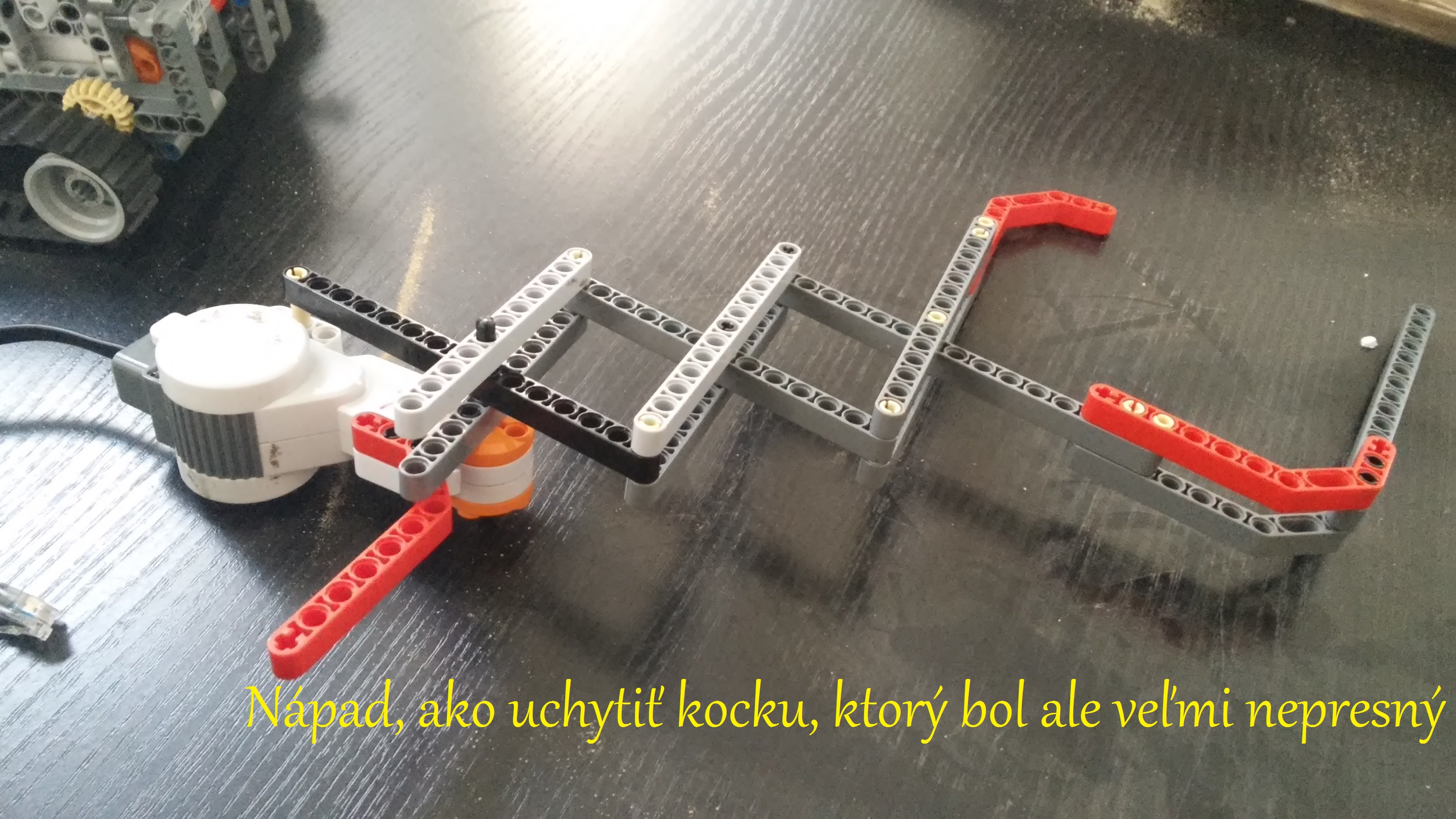 Na začiatku sklopí rameno ku kocke, zistí jej farbu uloží si ju(1. kocka bola žltá, žltá je na 1. pozícii;2.kocka je modrá, modrá je na 2. pozícii). Následne ju uchopí, zdvihne a odloží si ju do skladu. Tento cyklus môžeme zopakovať.