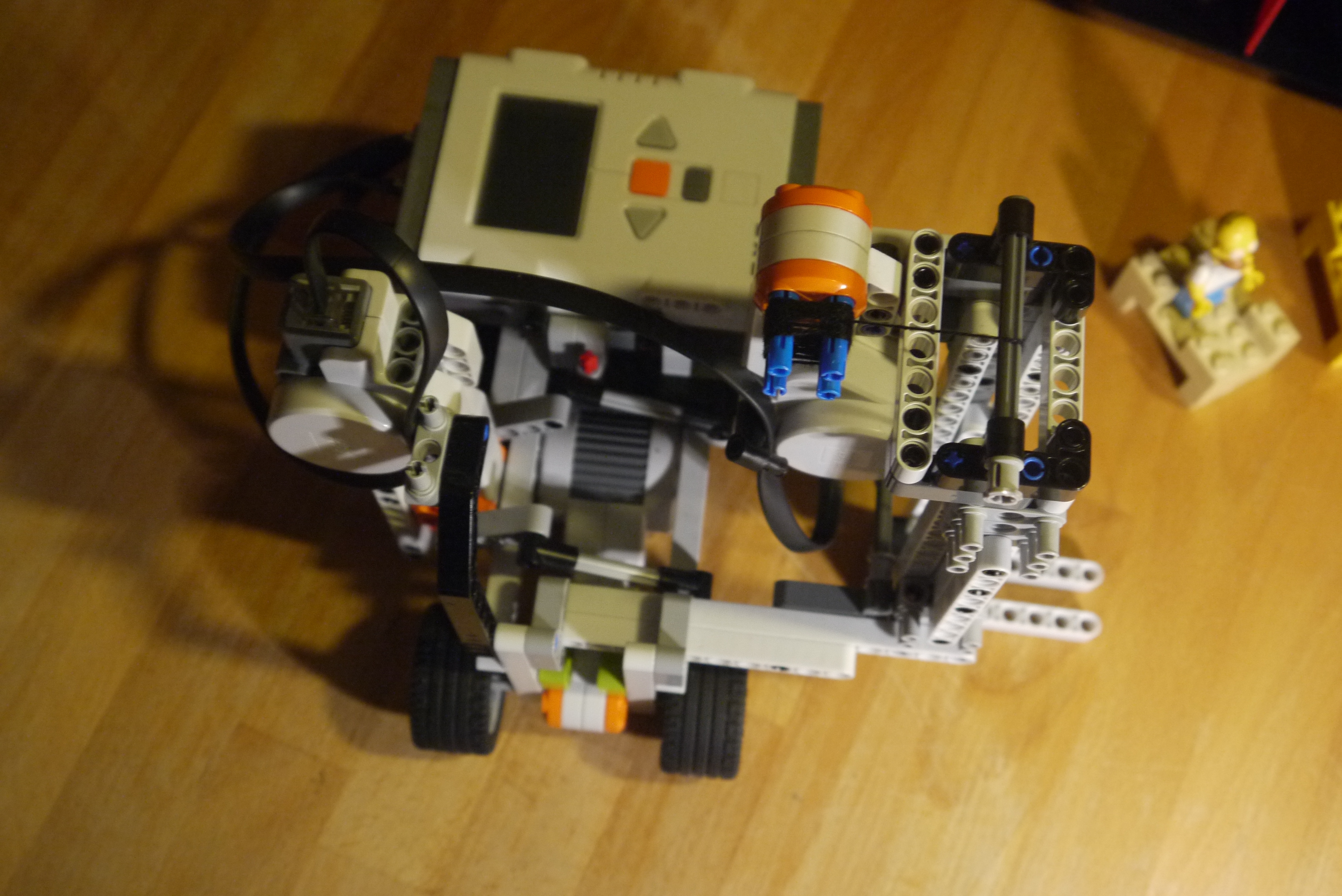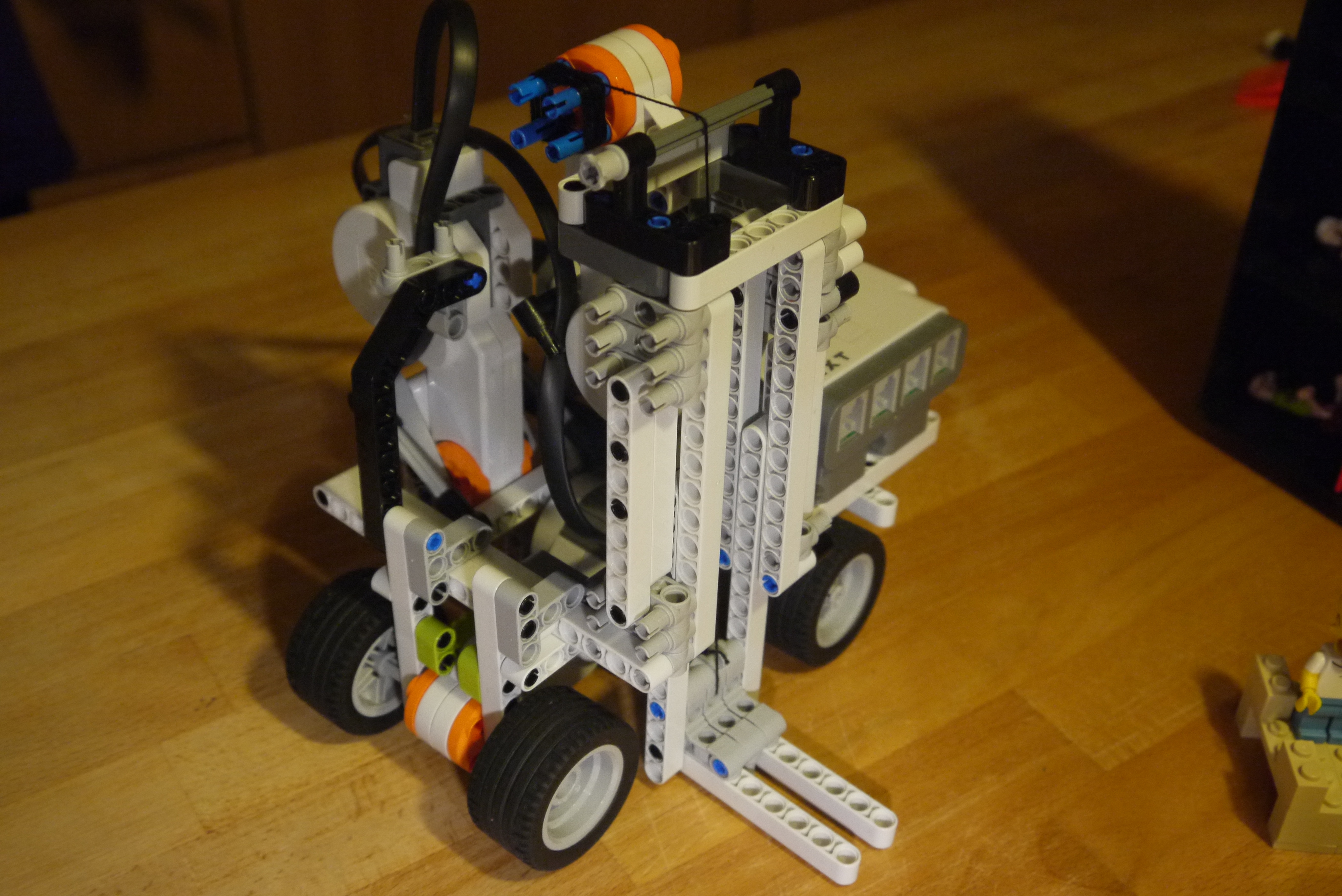 Robot má 3 motory, jedným sa pohybuje dopredu/dozadu, druhým zdvíha pološinu hore a dole a tretím robí vyklápanie plošiny do boku.