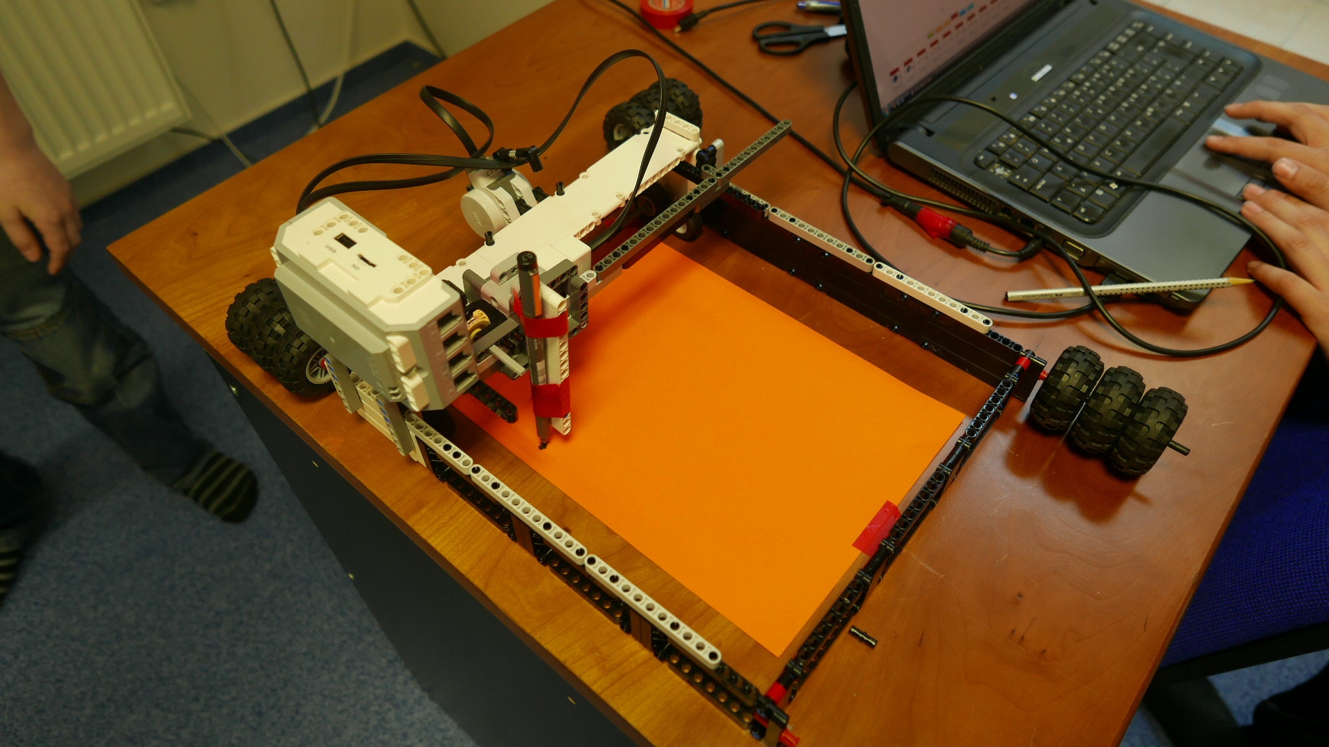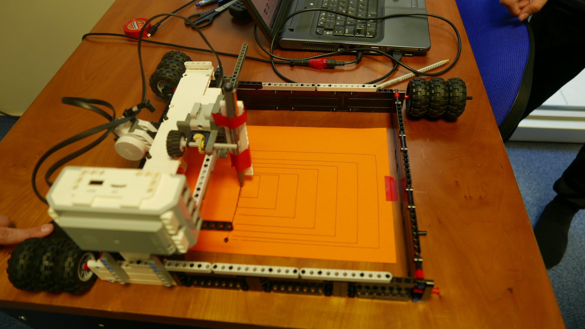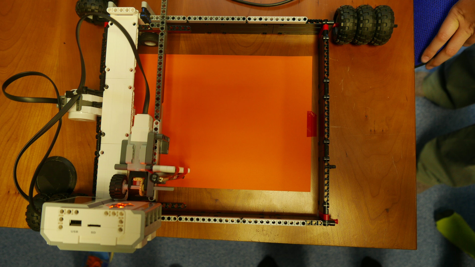 Ploter má štvorcovú konštrukciu veľkosti približne papiera A4. Na ráme je položený vozík s EV3 kockou a malým motorom. Rám konštrukcie slúži ako vodiaca koľajnica pre pohyb vozíka v smere jednej osi pomocou veľkého motora a malý motor pohybuje perom v smere druhej osi. Program postupne pohybuje perom po papieri a kreslí obĺžnikové útvary, ktorým postupne mení veľkosť.