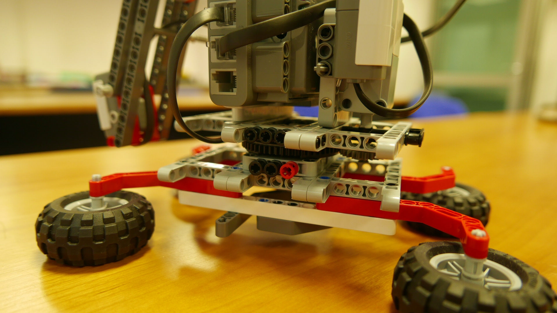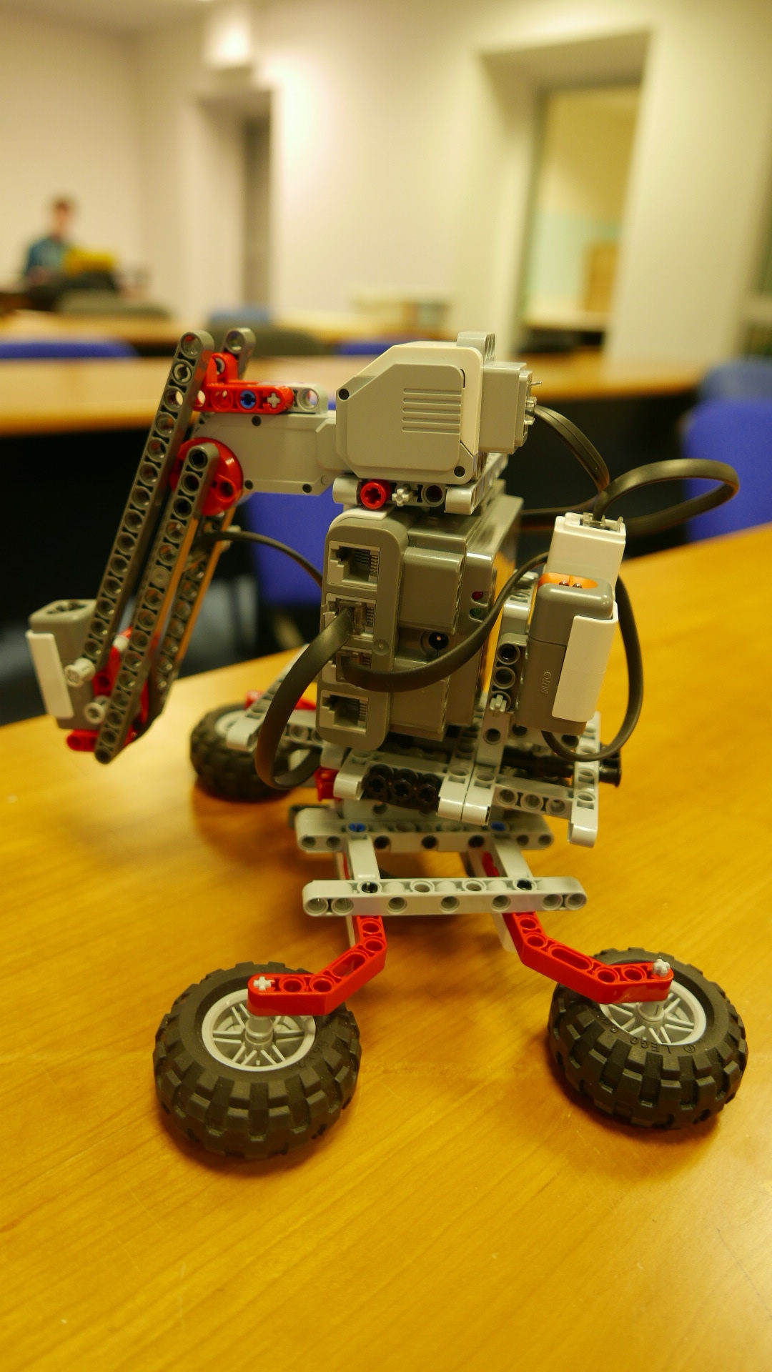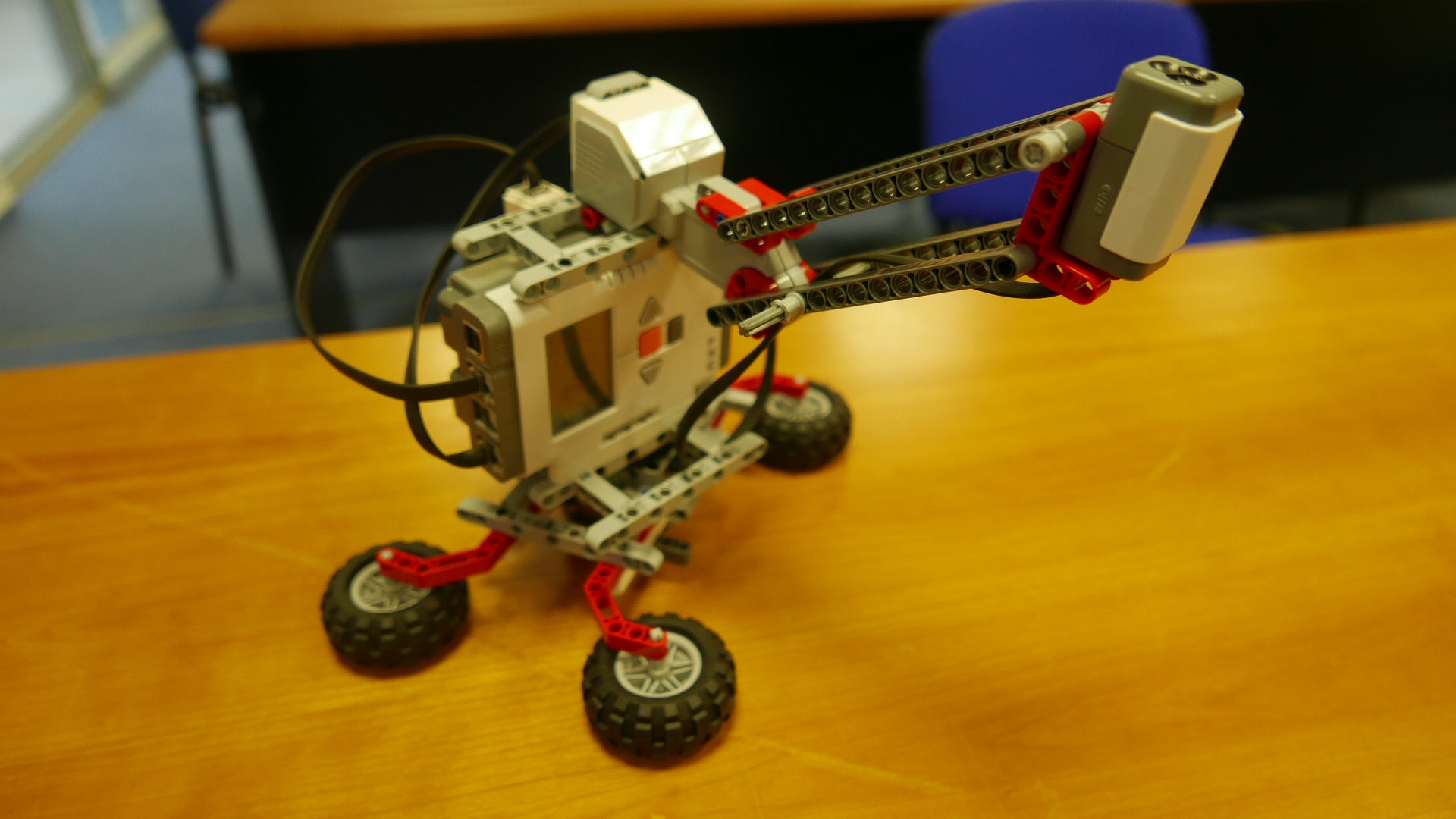 Použili sme otáčajúci sa stolík, ktorého spodná časť je pripevnená ku pevnému stojanu. Celý robot je postavený na vrchnej časti, ktorá sa celá otáča vďaka malému motoru. Na druhý motor je pripevnené rameno s farebným senzorom, ktorý sme použili v režime lampy a tak funguje ako štetec maliara. V zadnej časti je druhý svetelný senzor, ktorý sníma osvetlenie okolia a robot pomocou neho zisťuje, či je v miestnosti tma a on môže začať maľovať.