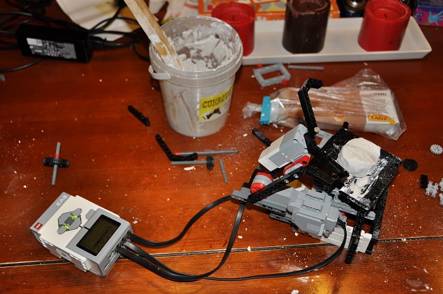 Náš prvý nápad bolo spraviť hrnčiarsky kruh (pozri foto) a nechať robota spraviť vázu. Ale nenašli sme vhodný materiál, s ktorým by sa dobre pracovalo. Skúšali sme sadru, plastelínu aj modelovaciu hmotu, ale robot to nedokázal dobre tvarovať a tak sme sa rozhodli spraviť niečo iné.