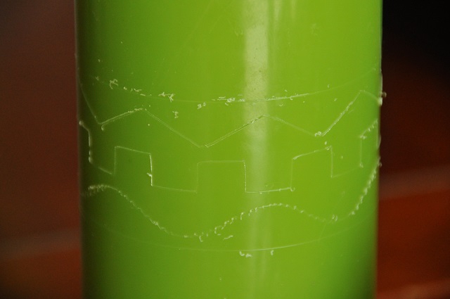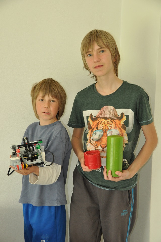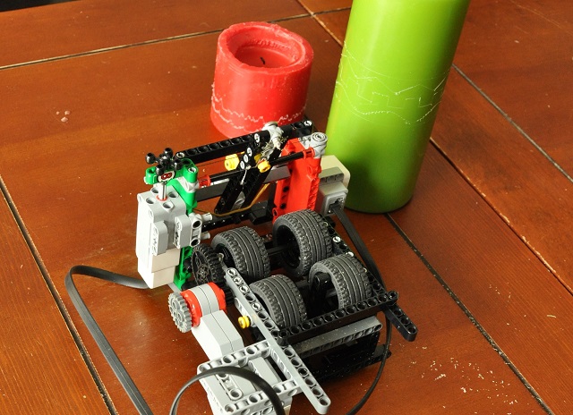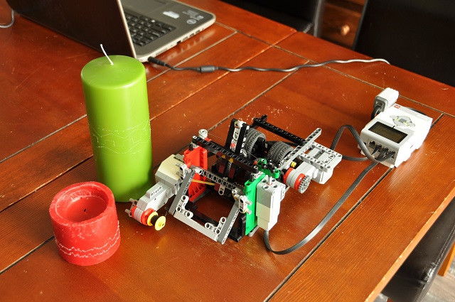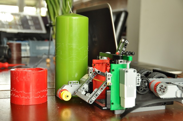 Náhodou sme narazili na článok o fonografe a ten nás inšpiroval k nápadu ozdobovať sviečky. Ozdobovali sme ich podobne ako fonograf zapisoval zvuk na kovové valčeky. Sviečka sa otáča pomocou štyroch koliesok, na ktorých je položená. Rýpeme do nej pomocou šróbu s ostrým hrotom, ktorý sa môže hýbať pomocou špagátu doľava a doprava a tretím motorom zdvíhame hrot zo sviečky.
