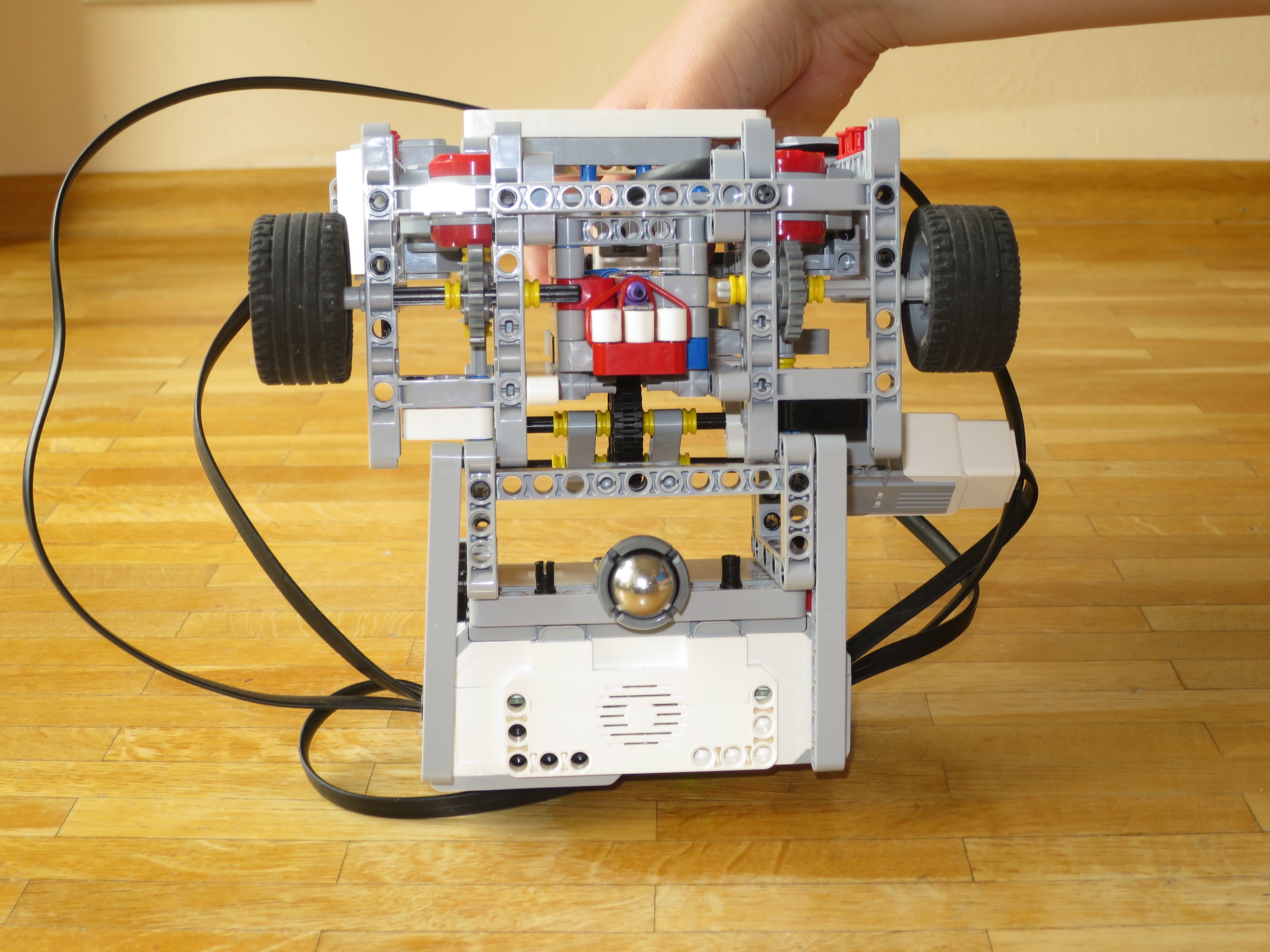 Robot pomocou maleho motora dava pero dole alebo hore a pomocou velkych motorov sa pohybuje.