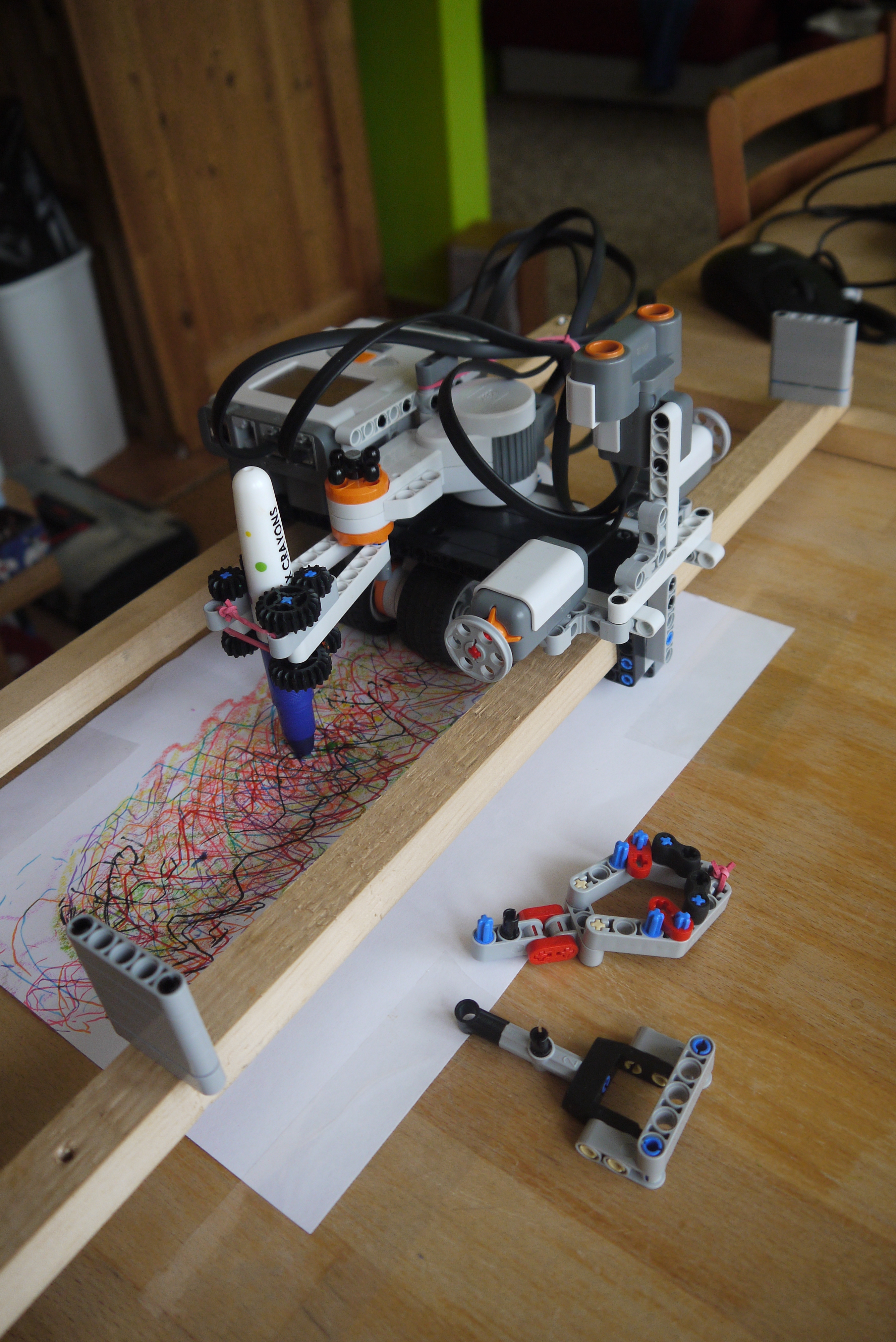 Popri pohybe dopredu a dozadu kýve ramenom na ktorom má farbičku alebo fixku. Vždy rameno náhodne vychýli a trochu tam zafarbí. Ak nie je nič pred ultrazvukovým senzorom, tak rameno chodí náhodne po celej šírke, inak iba vľavo, v strede alebo vpravo podľa toho, ako blízko je niečo pred senzorom.