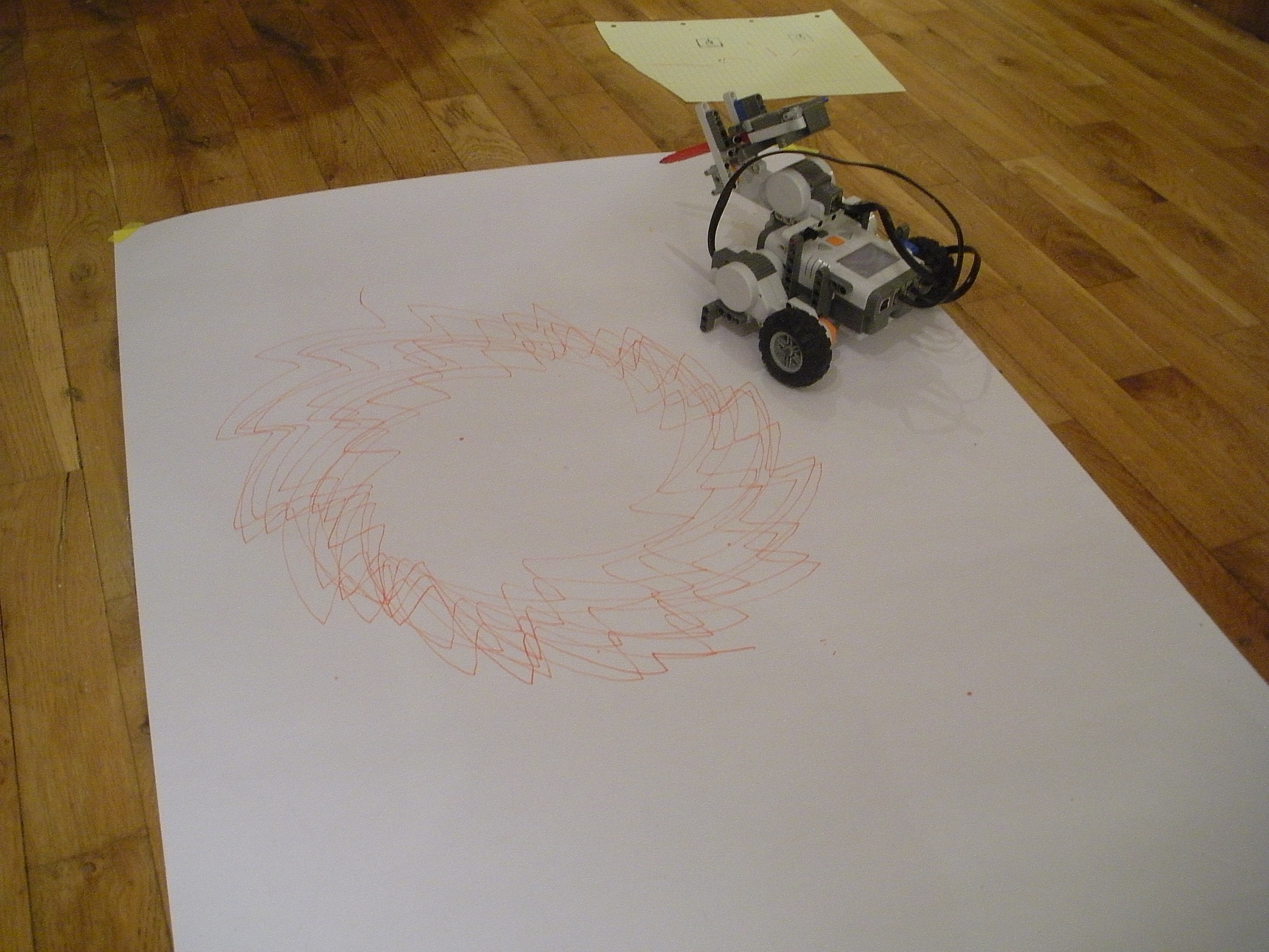 Robot kresli fixou, drzanou motorom, dalsimi 2 motormi sa pohybuje po papieri a kresli obrazky. Obrazky nakresli do 2 minut. Pre kazdy obrazok je napisany samostatny program s pouzitim "My Blocks".