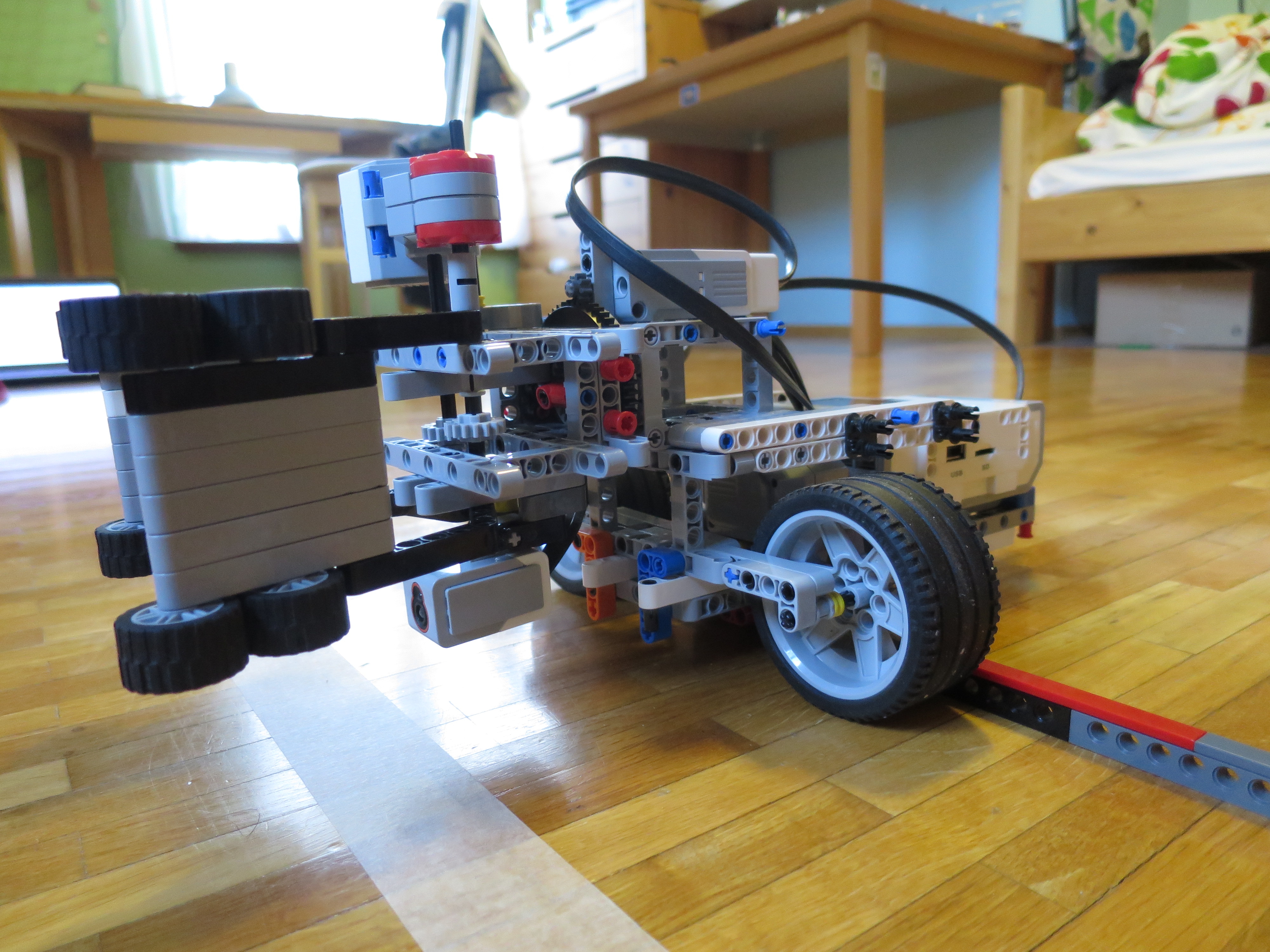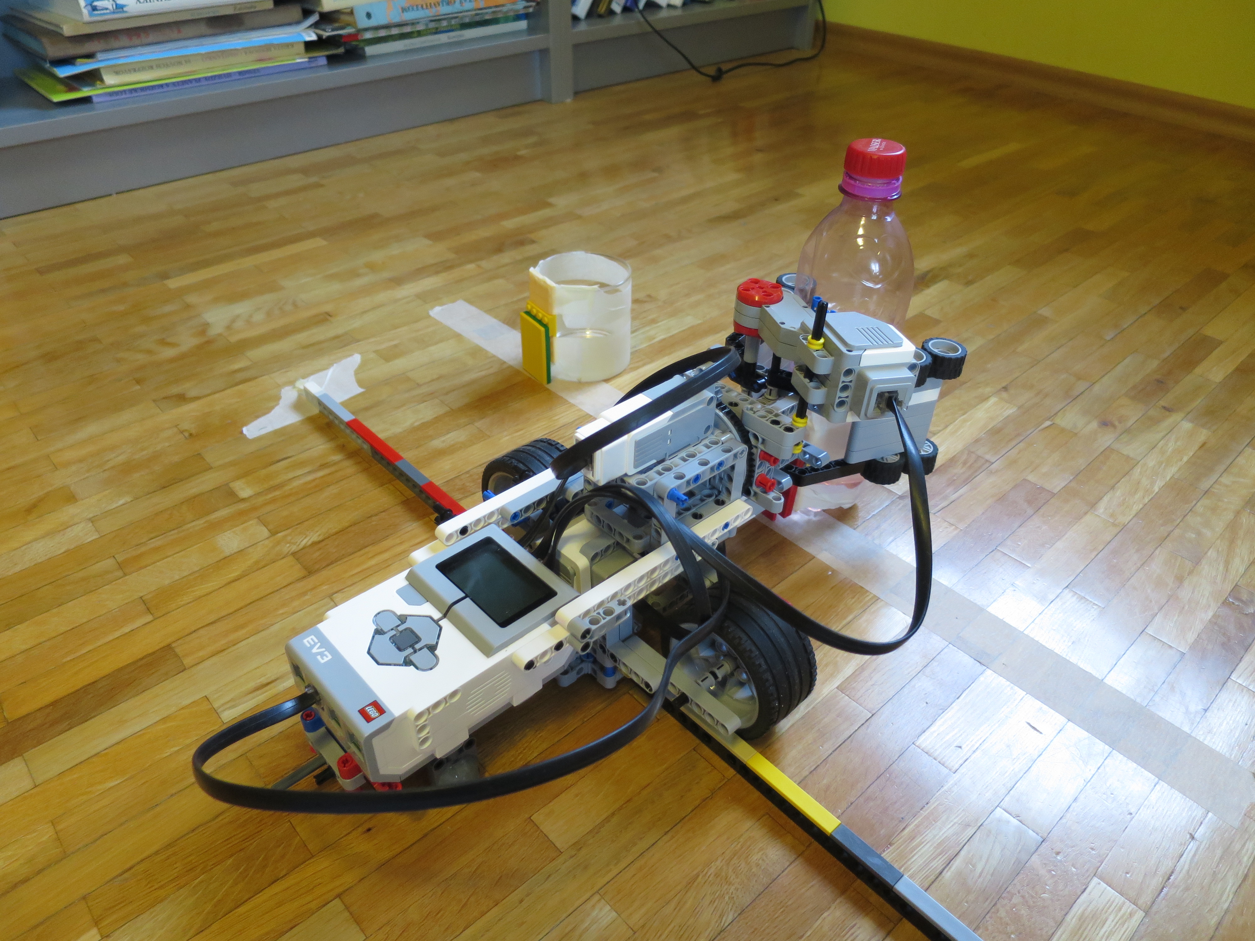 Nas robot najprv pomocou senzora najde predmet a podla farby vie, ci je to flasa alebo pohar. Potom hlada a najde druhy predmet a urobi to iste. Potom pride k flasi, zoberie ju a odnesie k poharu. Nakoniec vodu do pohara naleje.