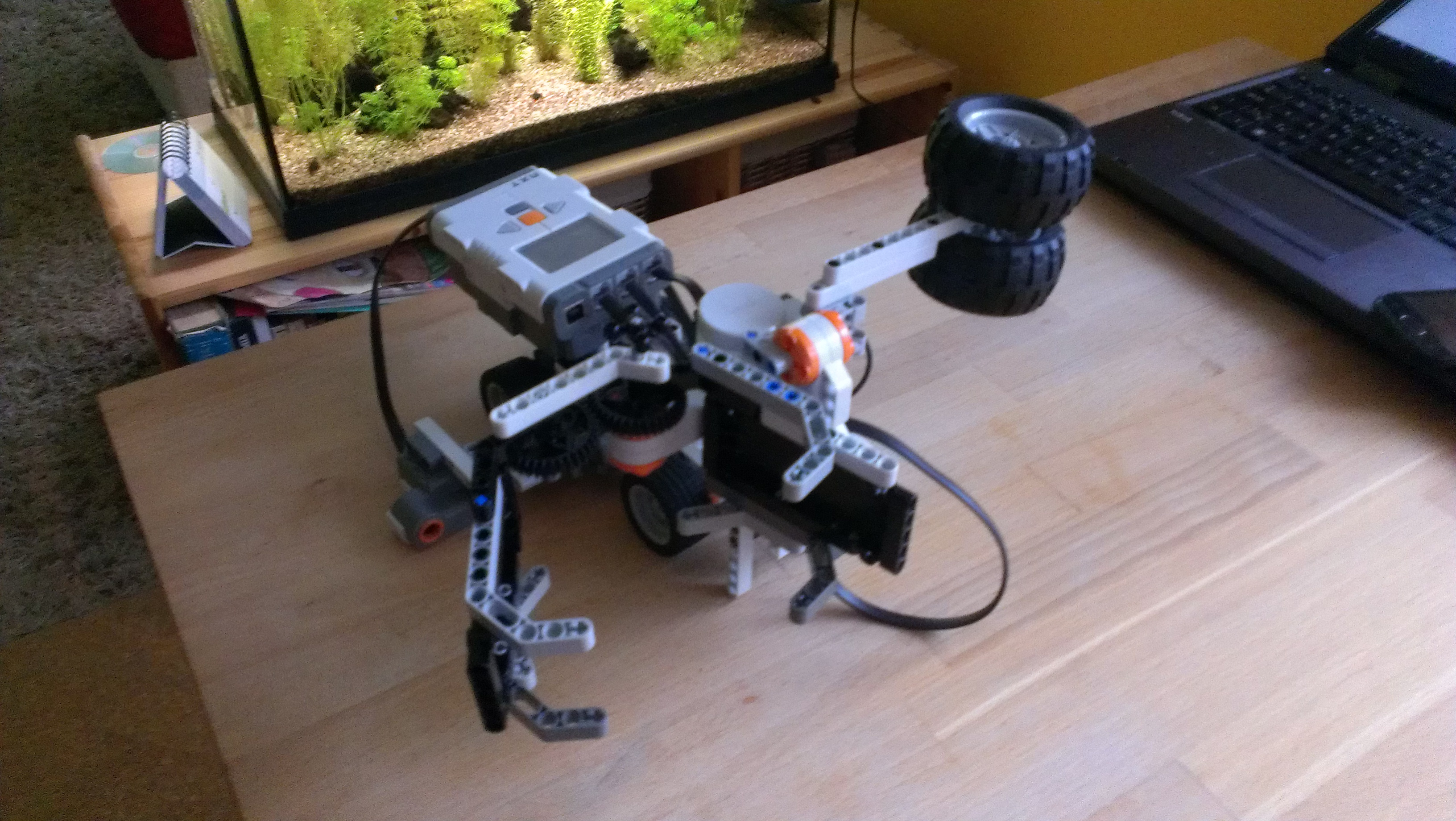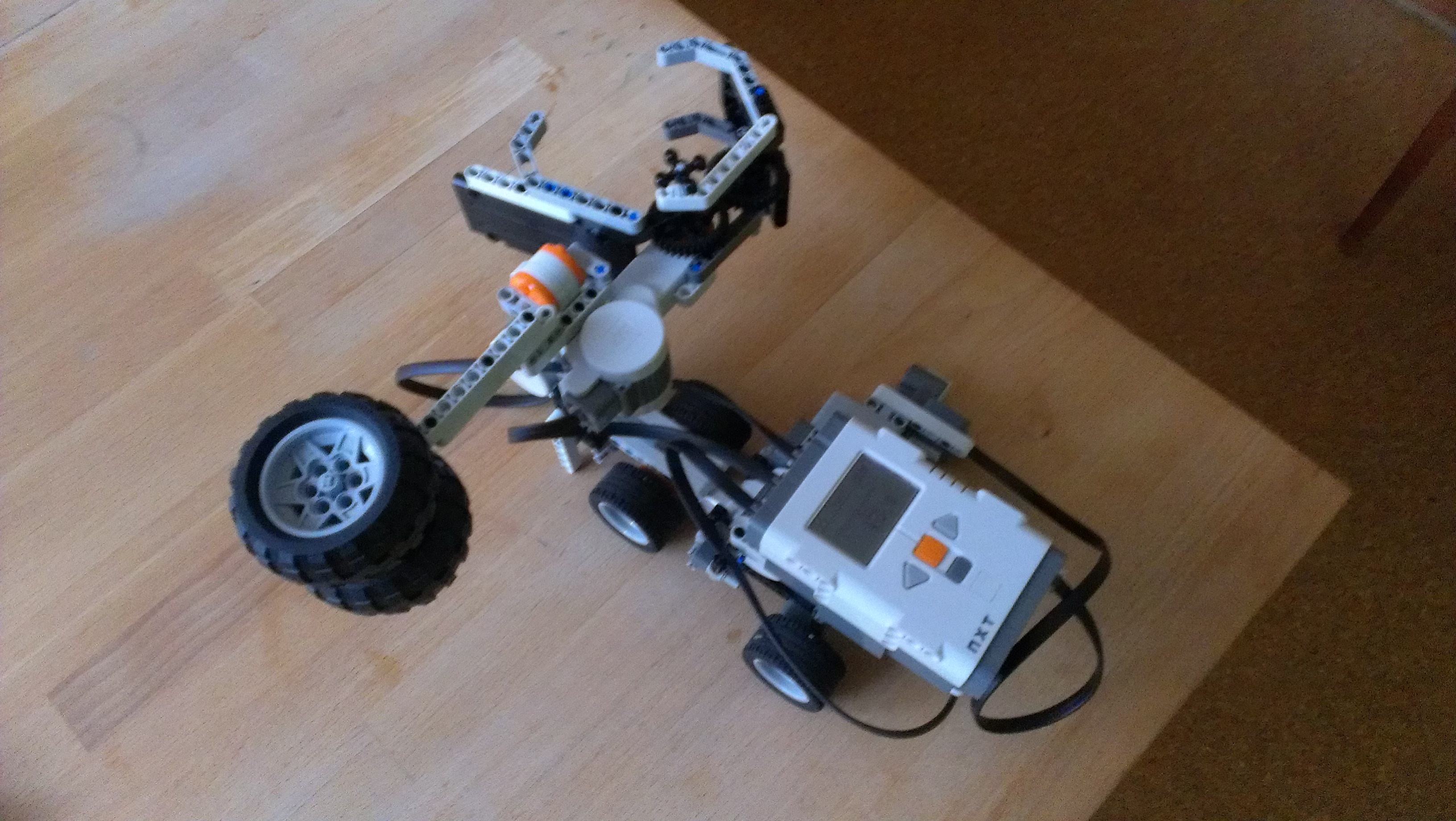 Na robota sme použili 3 motory (1. pohyb vpred/vzad;2. úchyt fľaše;3. nalievanie) a ultrasonický senzor.