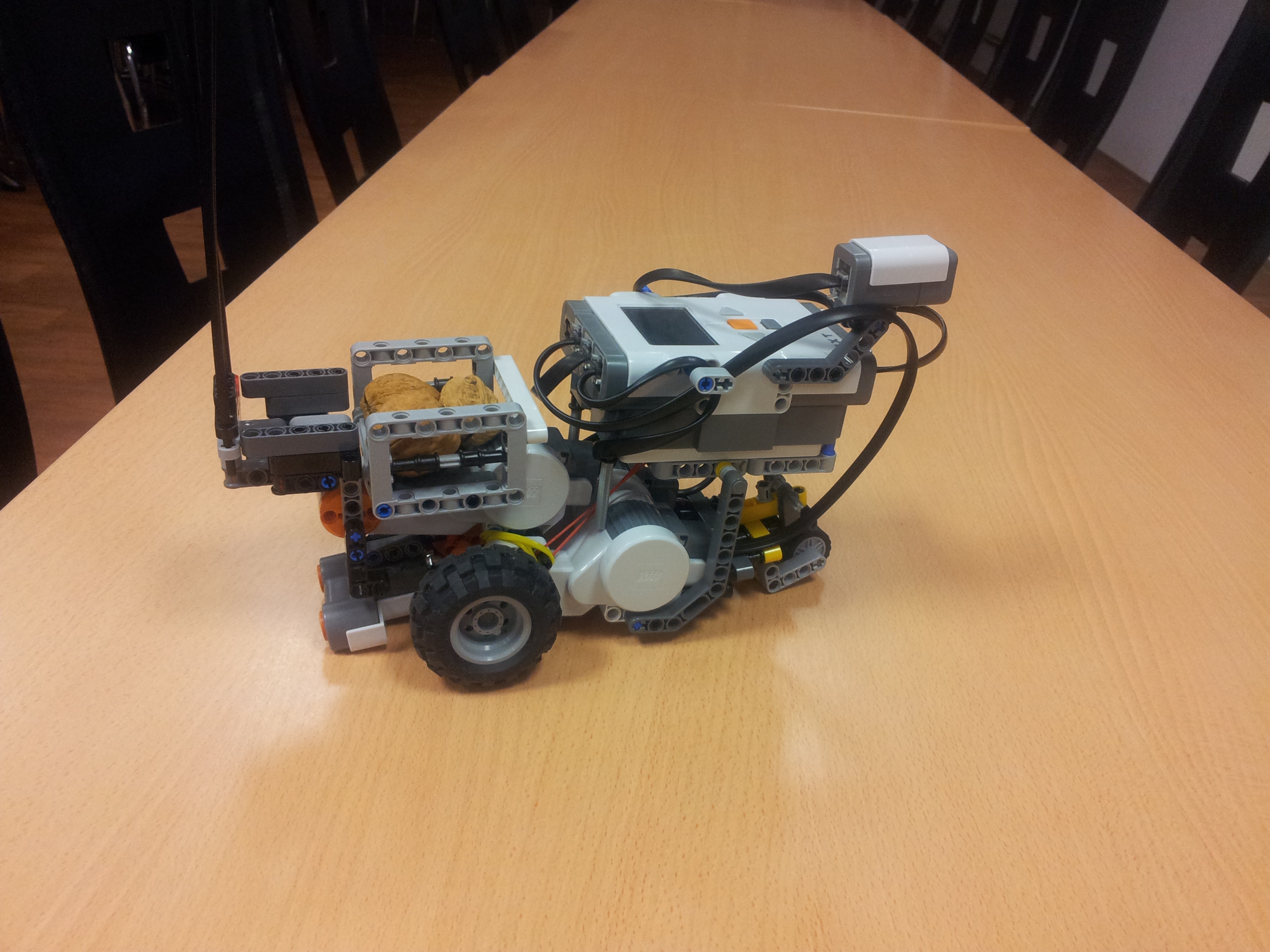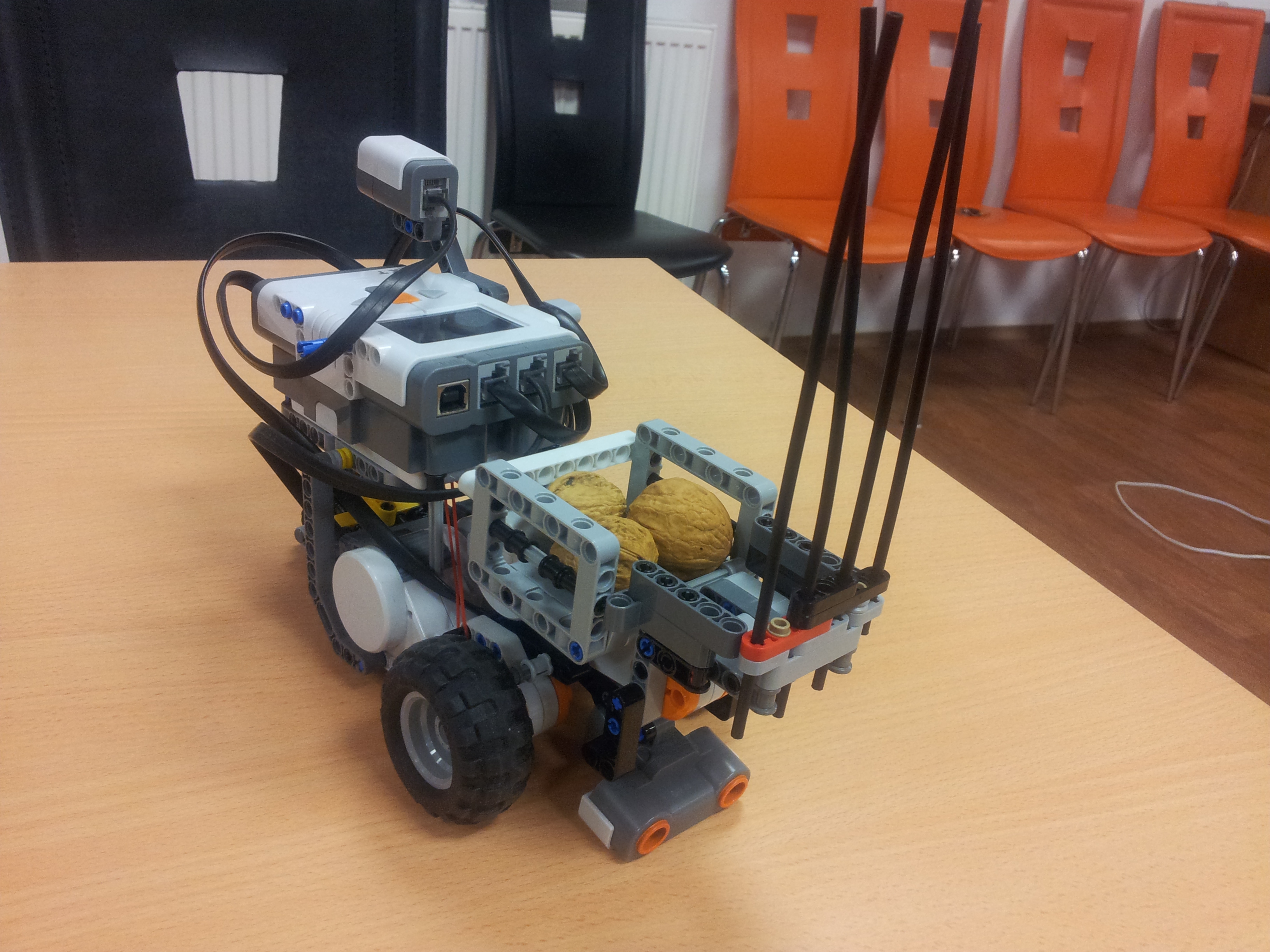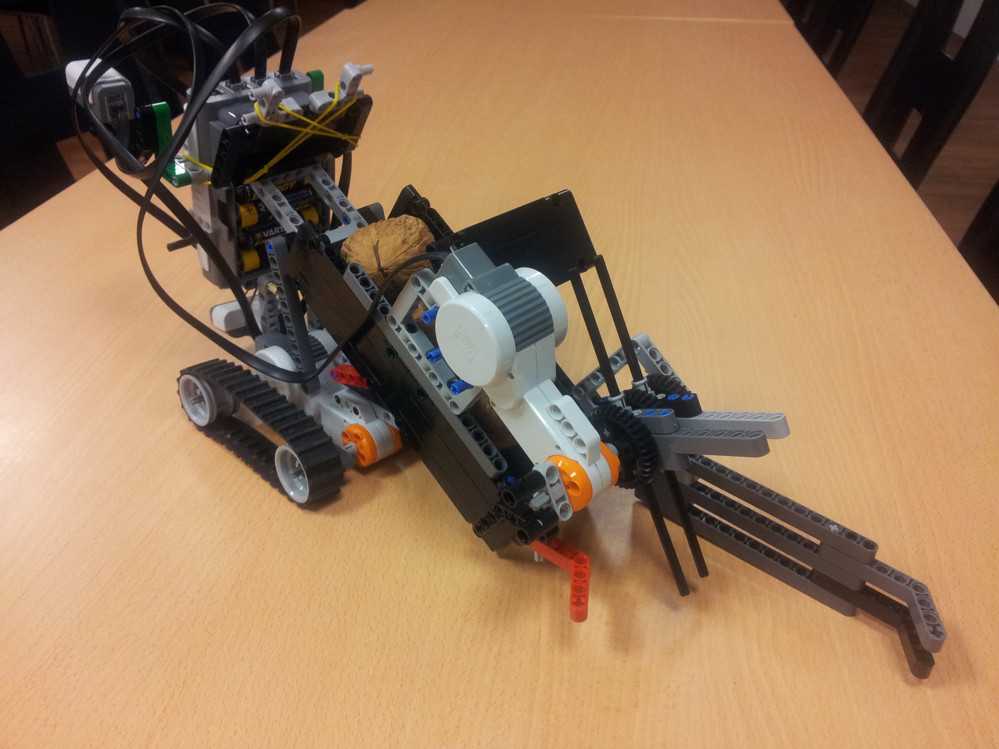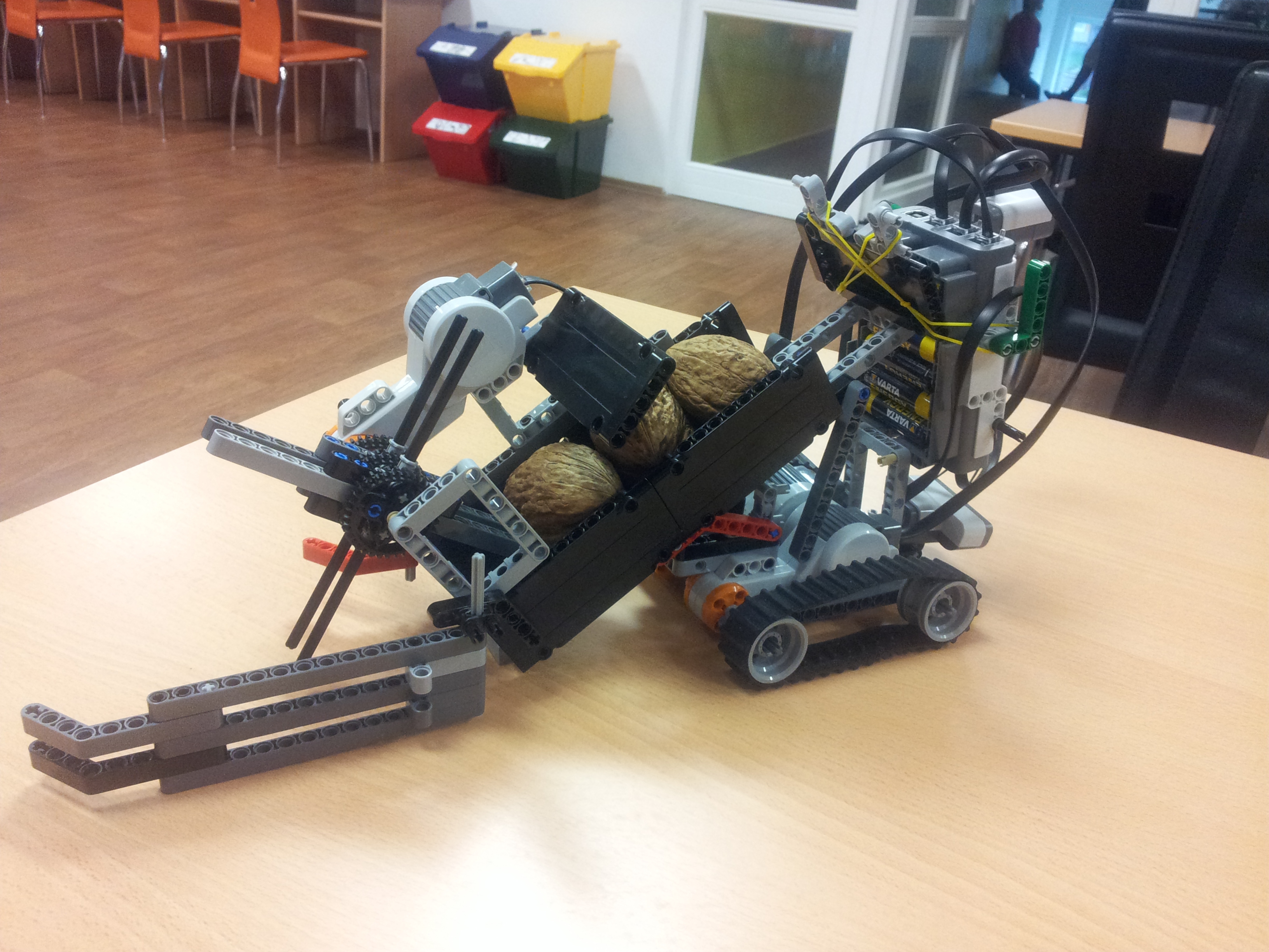 Vyhľadávanie nebolo celkom spoľahlivé, museli ste trochu dopomáhať rukou. Pekné, že ste skúsili aj iné riešenie, hoci tiež nefungovalo úplne. Zaujimavé radlice na naberanie orechov. Veľmi stručný popis robota a jeho fungovania, dopomáhanie zberu orechov aj udržaniu v zbernej časti robota.