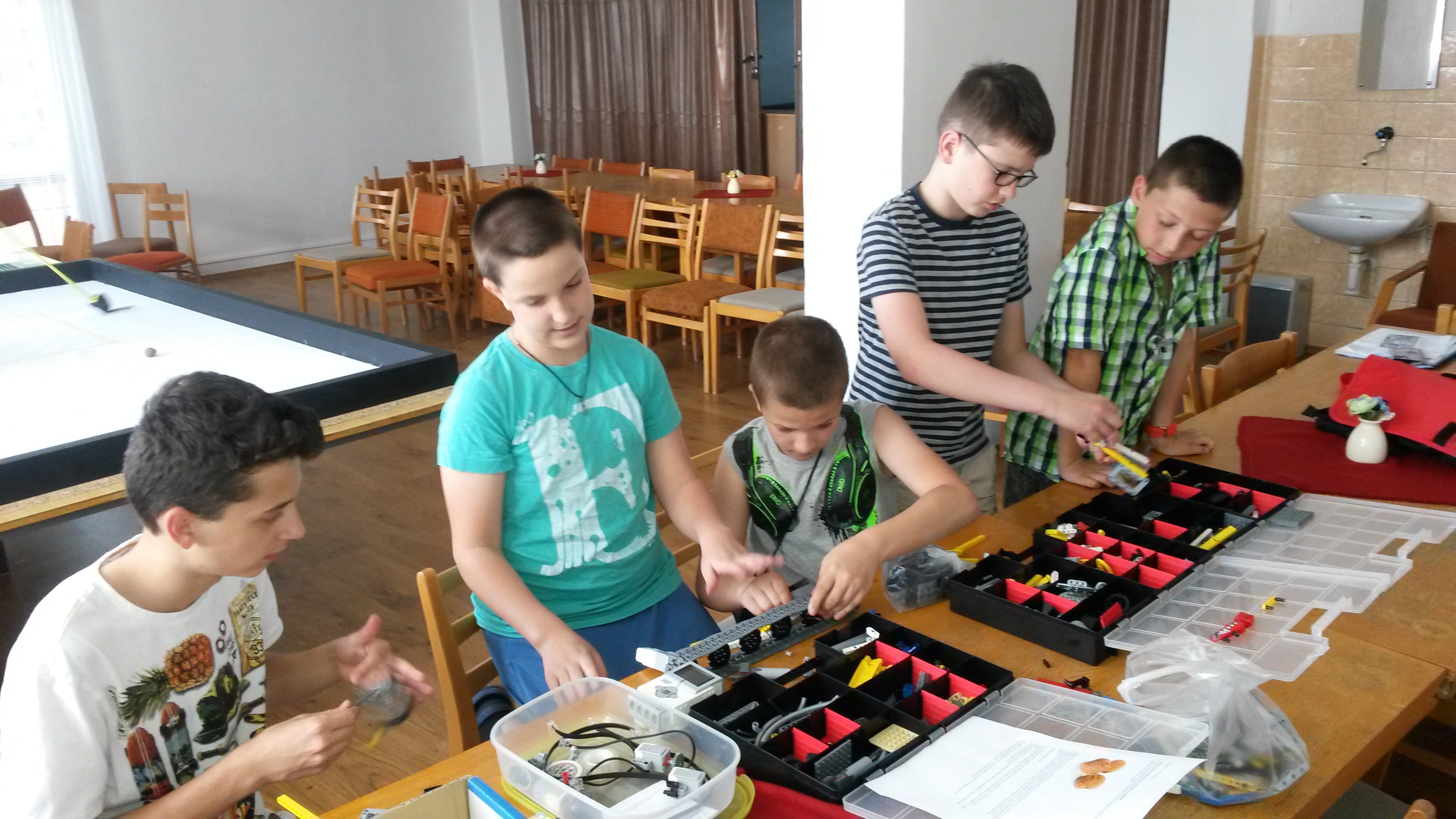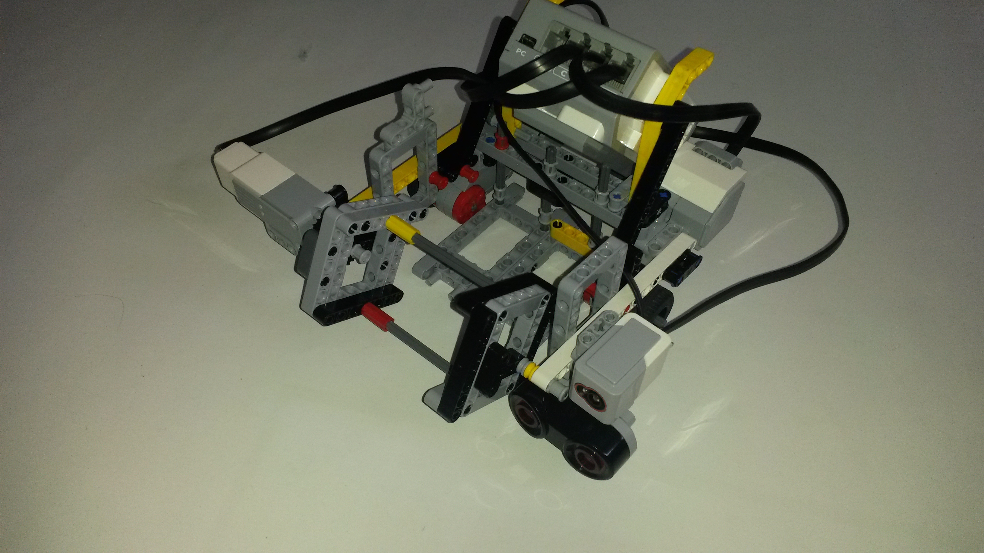 ROBOT: na zber orieškov sme zostrojili rotačný nádstavec, ktorý pripomína kombajn, no dobre funguje aj na zber orieškov, poháňa ho medium motor. Orechy zbierame na pripravenú plošinu umiestnenú v strede. Dva large motory slúžia na pohyb celého robota.