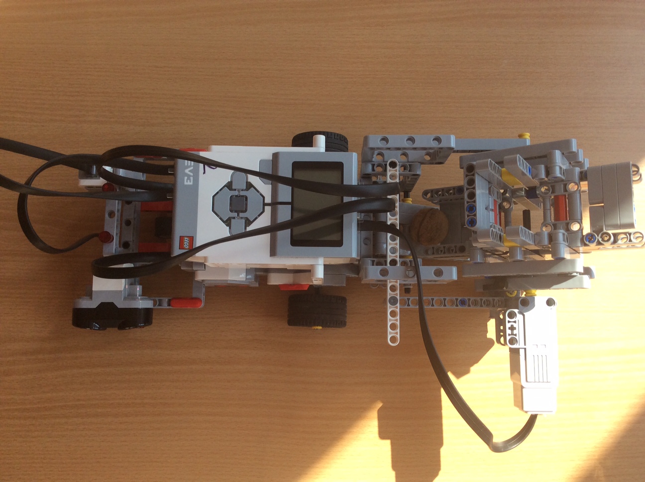 Robot sa skladá z troch motorov (dva veľké a jeden malý) a dvoch senzorov (ultrasonický a farebný). Veľké motory slúžia na pohyb a otáčanie robota. Malý motor umožní naložiť a vyložiť orechy. Ultrasonický senzor zbadá orech. Máme štvorec s rozmermi 70 x 70 cm. Jeden roh je označený čiernou páskou, tam robot štartuje. Robot ide dopredu po strane štvorca až kým nezbadá orech na pravoboku. Preto sme v tomto zadaní nepotrebovali, aby z jedného rohu svietilo svetlo. Ultrasonickým senzorom si odmeria vzdialenosť od orecha, ktorú potom prejde. Otáčky sme počítali z priemeru kolesa. Potom sa otočí a ide dopredu až ku orechu. Robot naberie orech, vráti sa dozadu a natočí tým smerom ktorým bol otočený skôr, ako orech zbadal. Túto procedúru zopakuje trikrát. Potom sa vracia na miesto, kde začal. Farebný senzor slúži na zastavenie robota pri prechode cez čiernu pásku. V podlahe sme mali aj čierne škvrny, tak sme nakoniec dali modrú farbu.