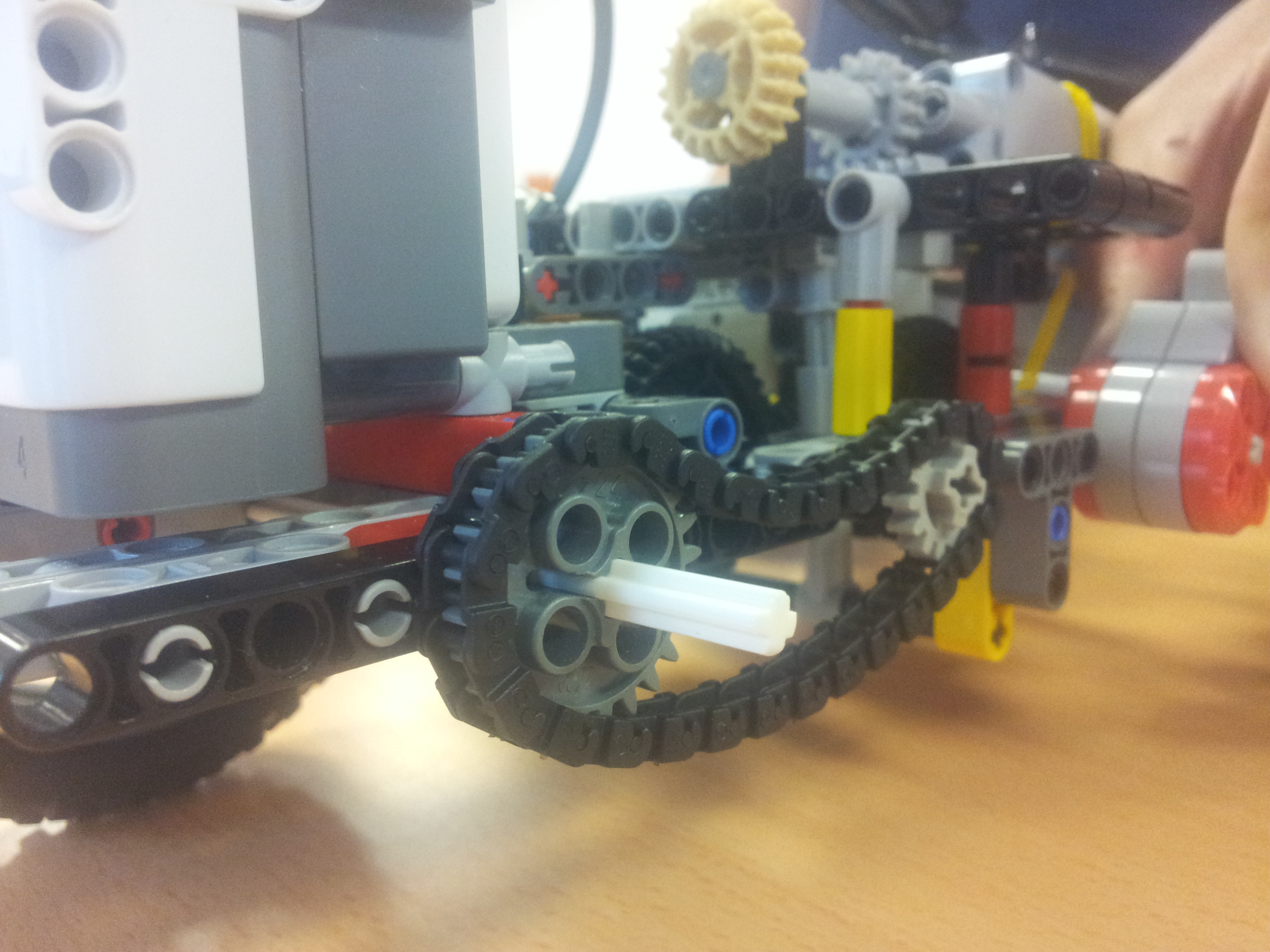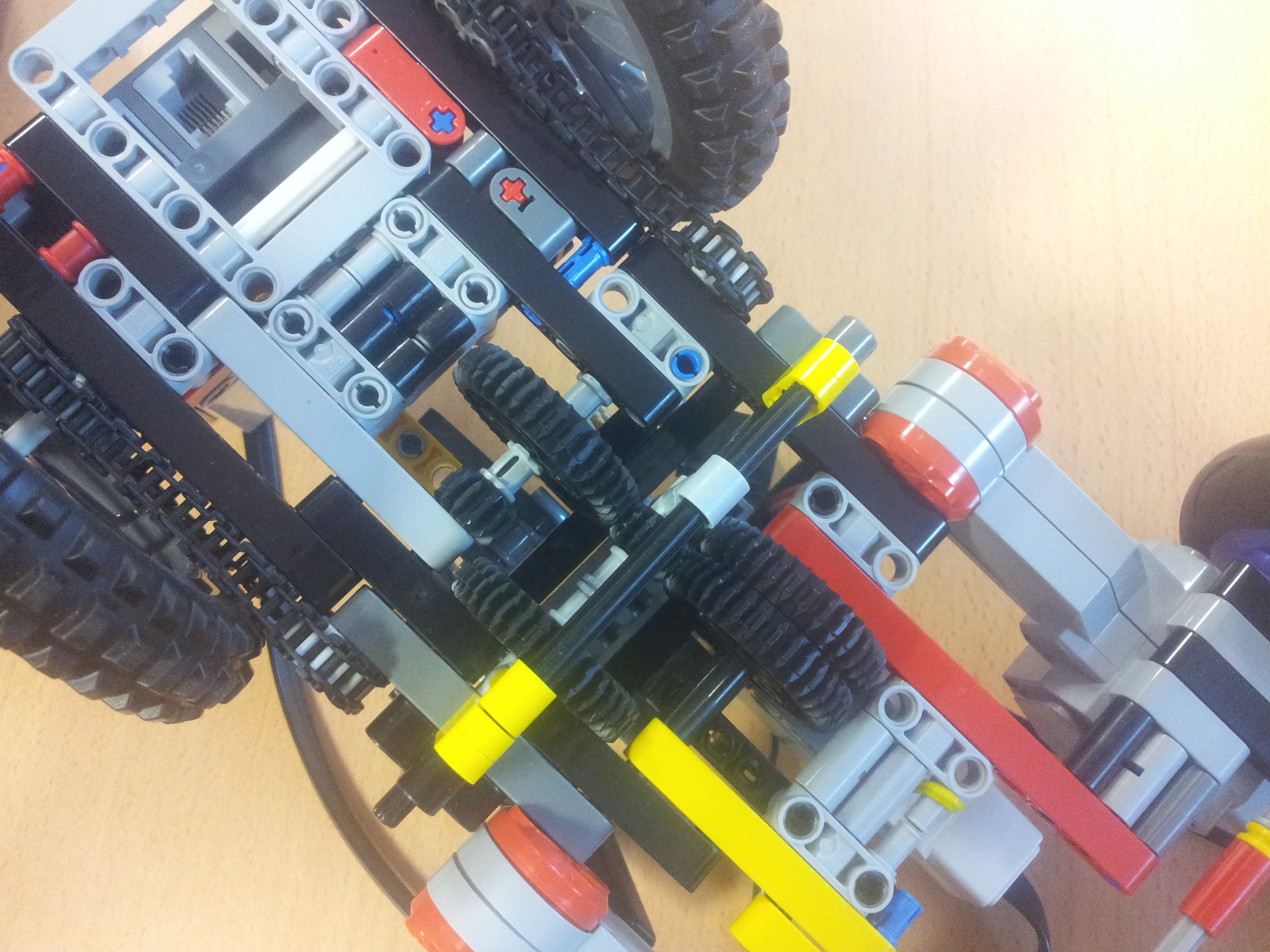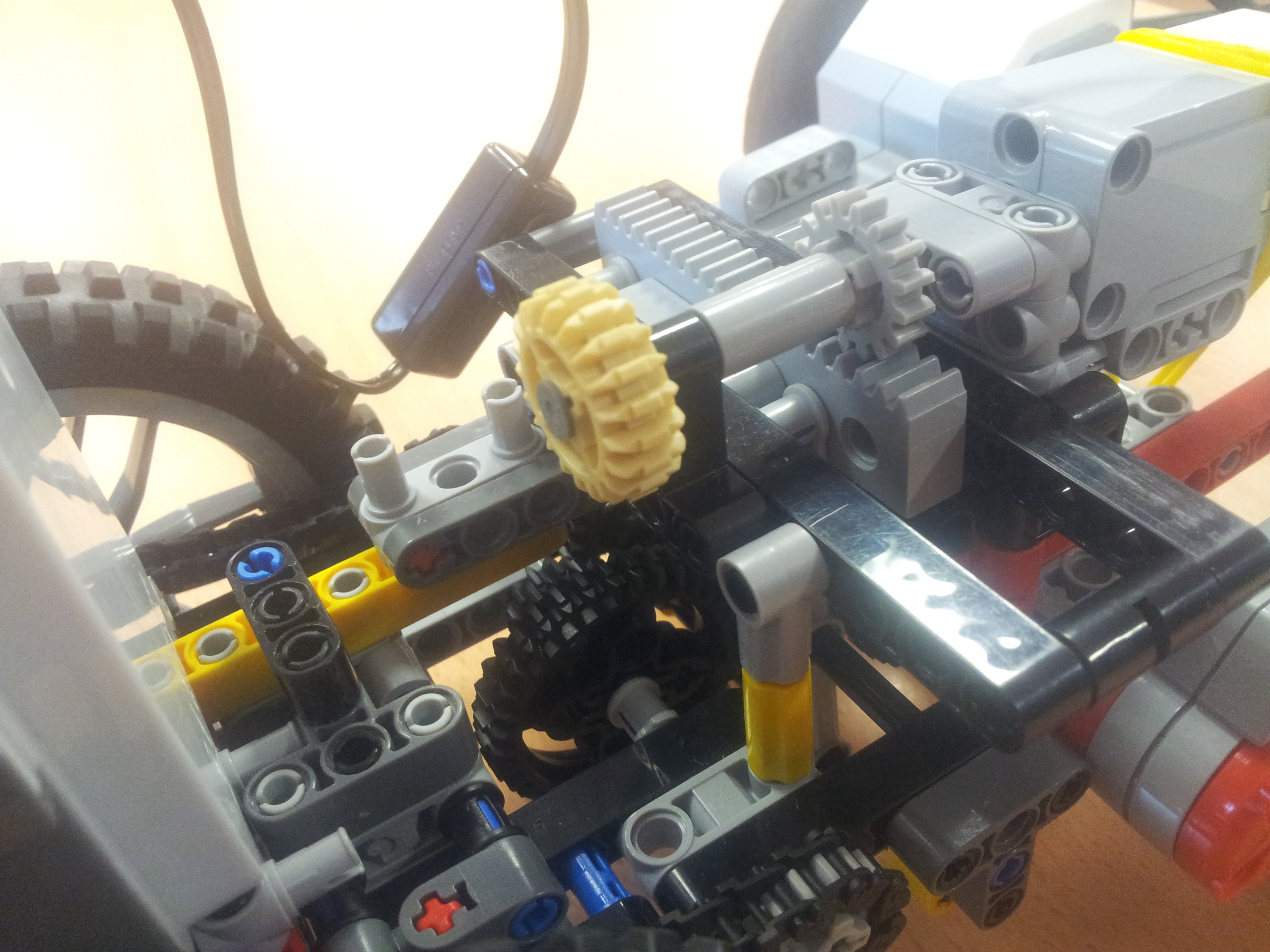 Robot sa pohybuje dvoma L-motormi, ktoré sú oba zapojené v porte C. Prevodovku riadi M-motorom v porte B. Prevodovka je zostavou troch radov ozubených kolies, pričom je stredný rad pohyblivý. Robot má predný náhon z dôvodu lepšej presnosti chodu robota. Namáhanie prevodovky sa dá znížiť výmenou ťažných kolies za menšie.