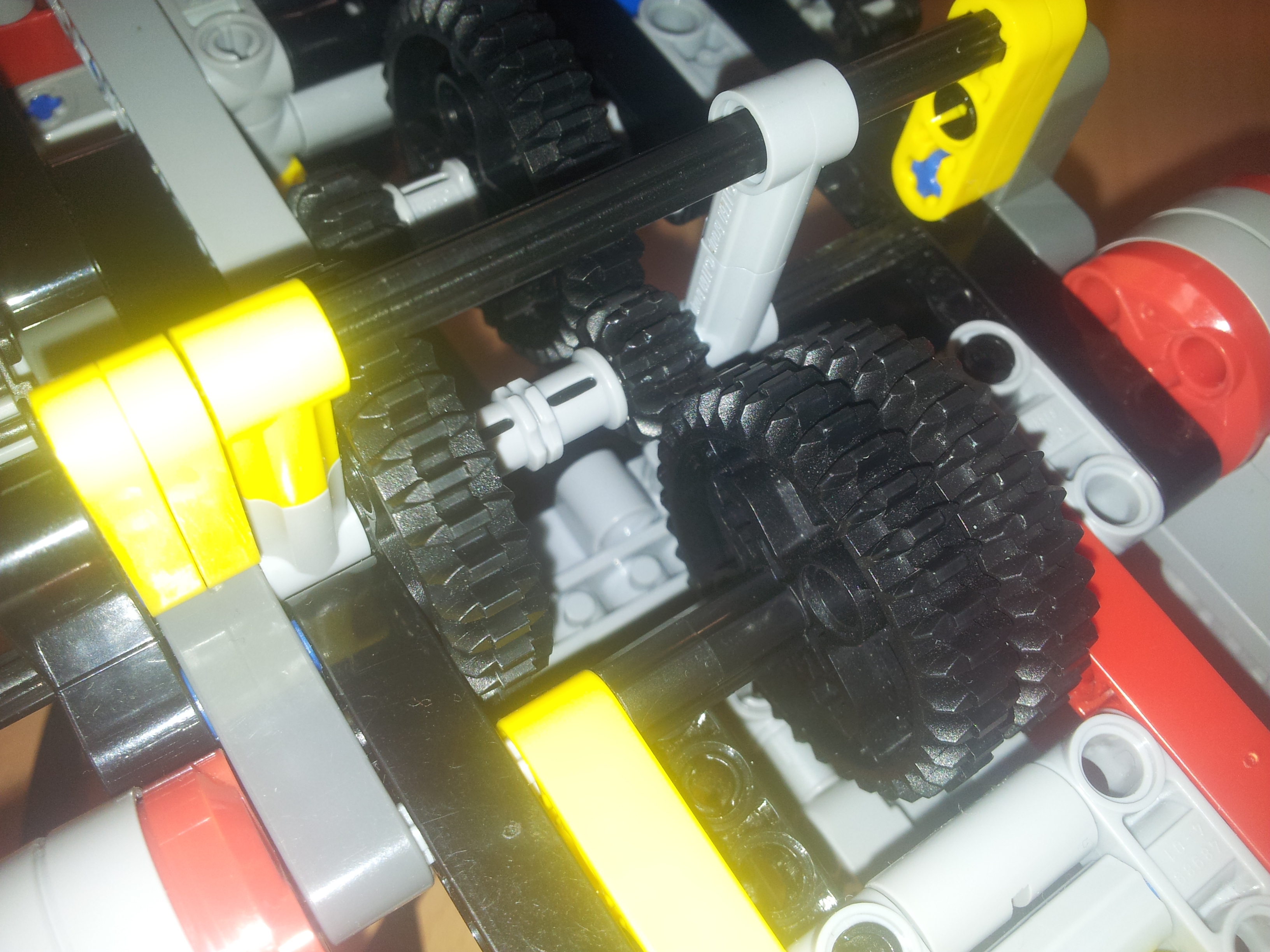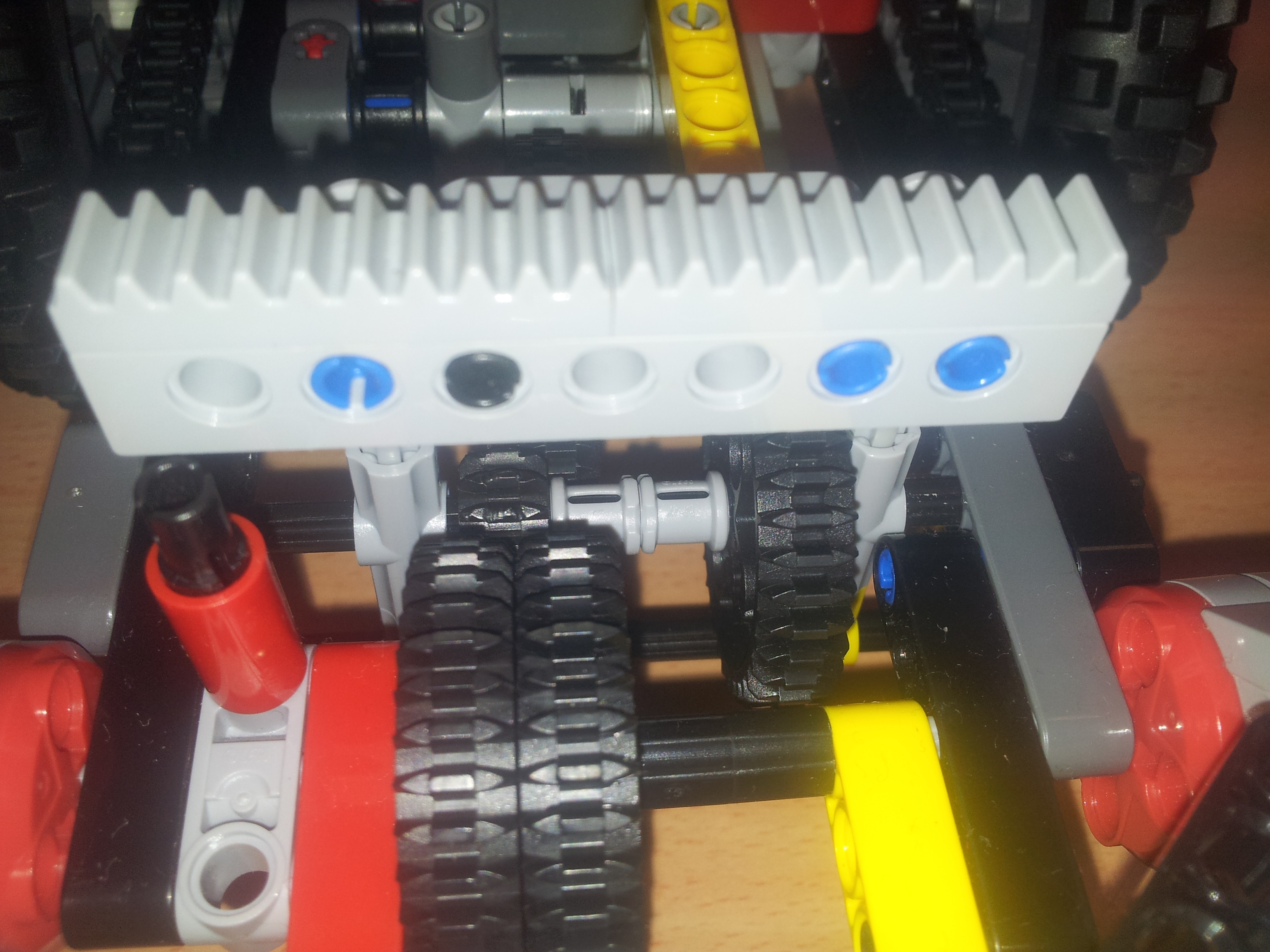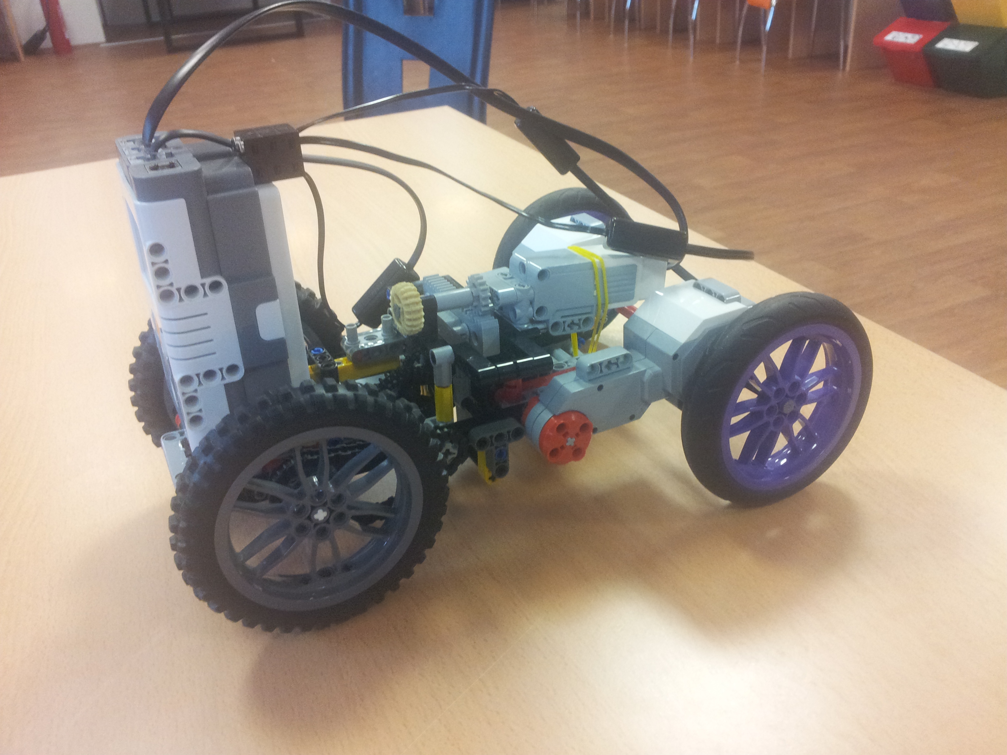 Robot sa pohybuje dvoma L-motormi, ktoré sú oba zapojené v porte C. Prevodovku riadi M-motorom v porte B. Prevodovka je zostavou troch radov ozubených kolies, pričom je stredný rad pohyblivý. Robot má predný náhon z dôvodu lepšej presnosti chodu robota. Namáhanie prevodovky sa dá znížiť výmenou ťažných kolies za menšie.