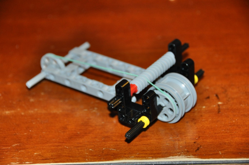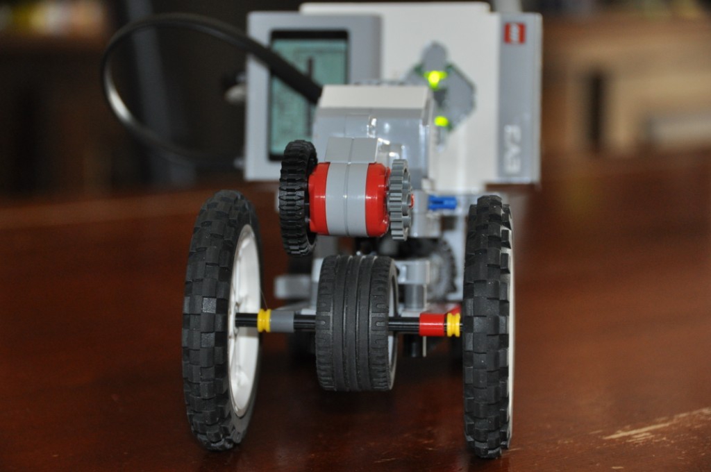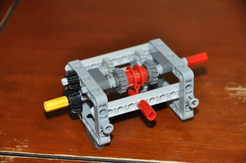 Nakoniec sme vymysleli pohon, pri ktorom sa dve rozdielne veľké ozubené kolieska poháňané jedným motorom pritláčaju na gumené koleso spojené s kolesami autíčka. Prevody sa prehadzujú tak, že celý motor sa posúva zo strany na stranu, aby sa naraz pritláčalo len jedno ozubené koleso. Voľnobeh bol vtedy, keď nebolo pritlačené ani jedno ozubené koliesko a konečné fungoval celkoom dobre....