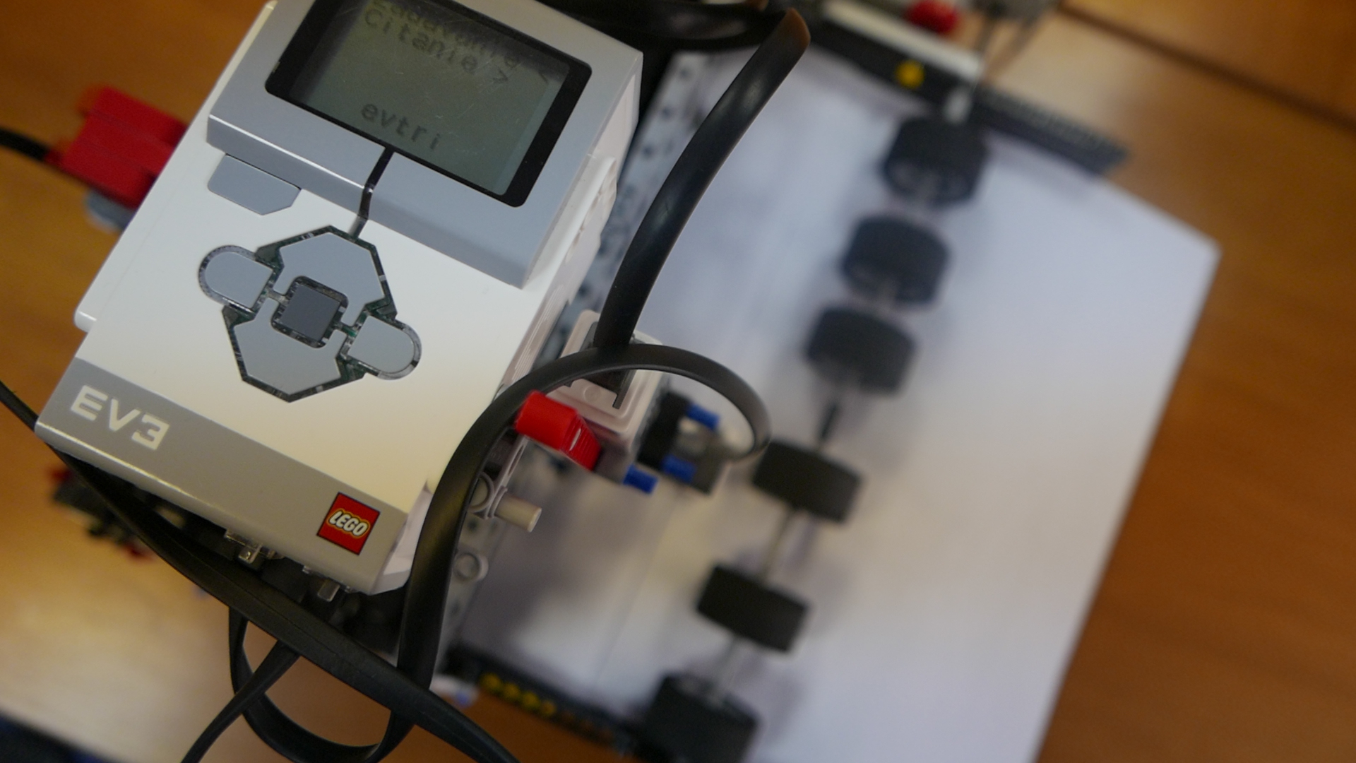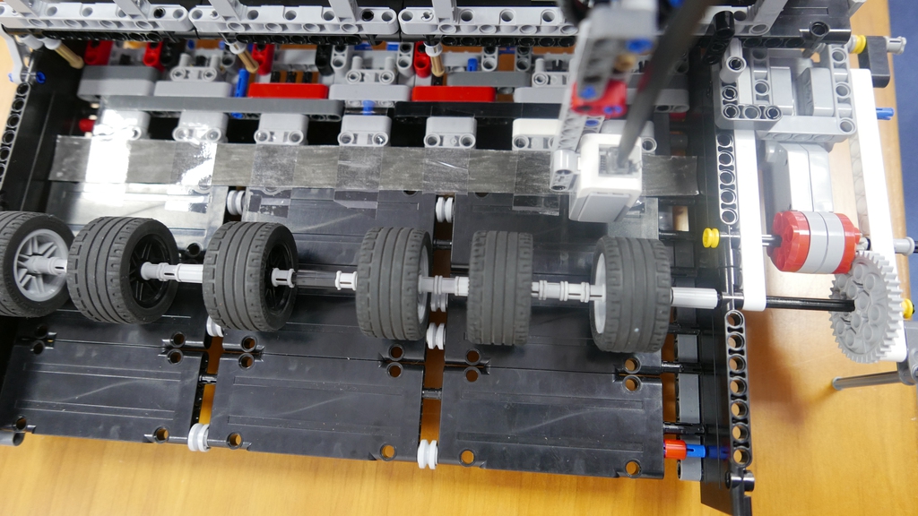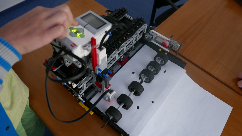 Na konštrukcii najviac pracoval náš nováčik Paťo, na konci ju dokončoval aj Tomáš. Pôvodnú verziu sme po dvoch schôdzkach museli rozobrať, lebo bola veľmi malá a uvedomili sme si, že nemusí spoľahlivo pracovať. Základom je posuvné zariadenie na papier A4, jeden veľký motor otáčaním kolies posúva papier vždy na ďalší riadok. Otáčanie motora je sprevodované, aby bol posun presnejší. Rozhodli sme sa skonštruovať zapisovač na 6-bitové hodnoty, to stačí na zaznamenanie 64 rôznych znakov. Ponad podávač chodí vozík s EV3 kockou po "koľajniciach" z pásov. Pohyb vozíka ovláda malý motor a je sprevodovaný pre čo najväčšiu presnosť. Vozík posúva celú zapisovaciu a čítaciu "hlavu". Tá sa skladá z dierkovača, ktorý je vytvorený z ďalšieho malého motora, farebného senzora, ktorý slúži na čítanie dierok v papieri a ešte jedného svetelného senzora, ktorý z druhej strany podávača sníma biele značky určujúce polohu jednotlivých bitov. Vozík nosí aj EV3 kocku.