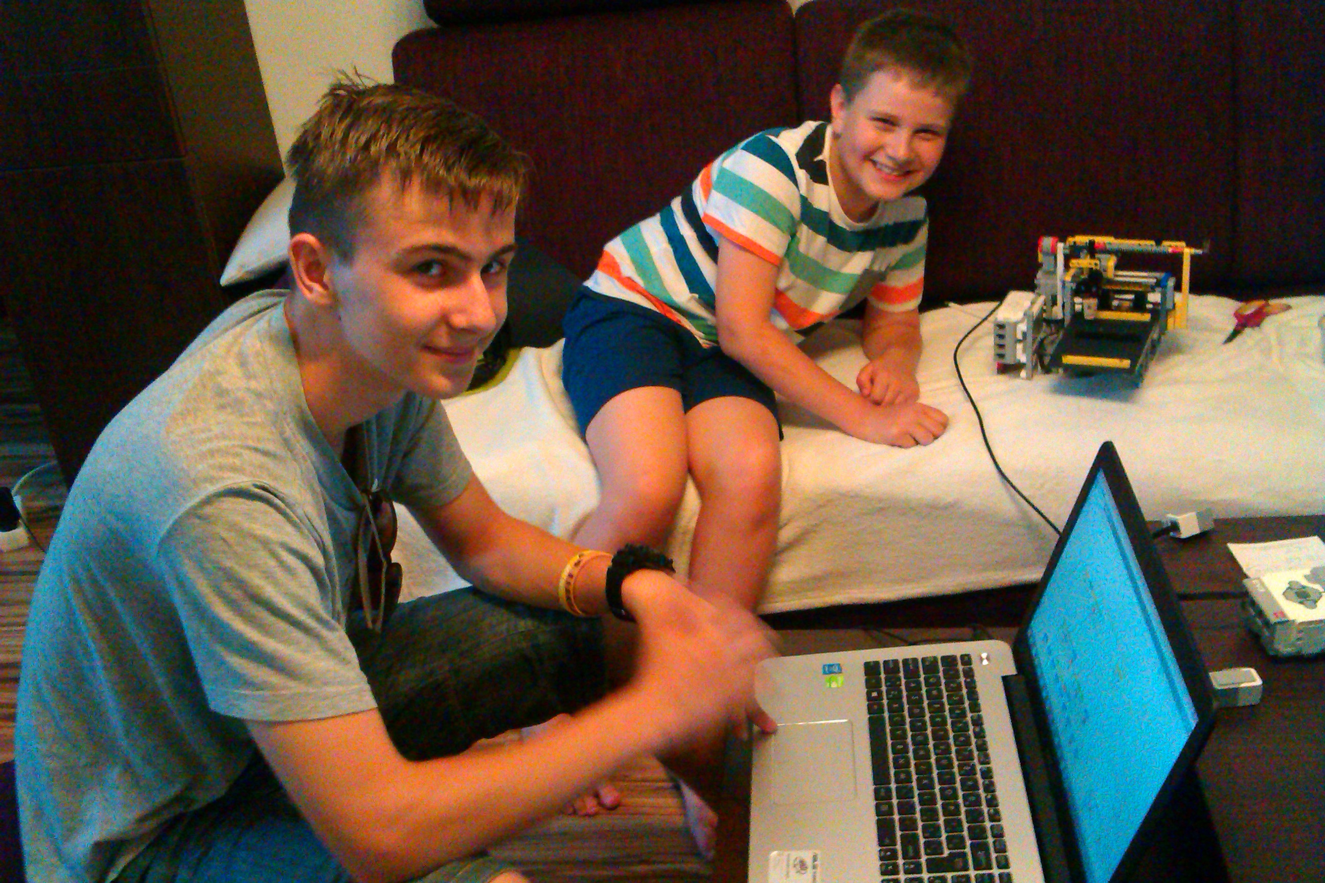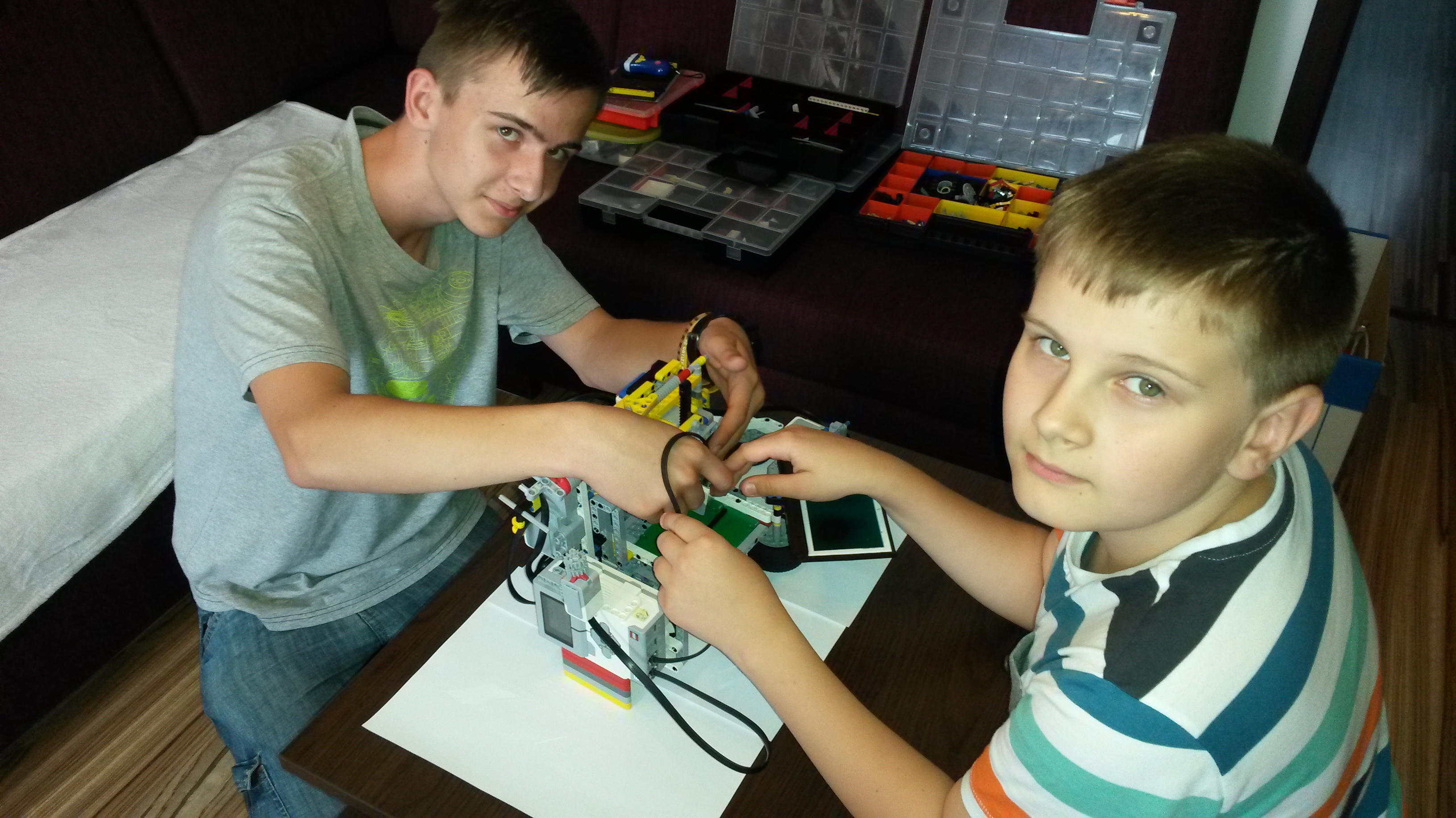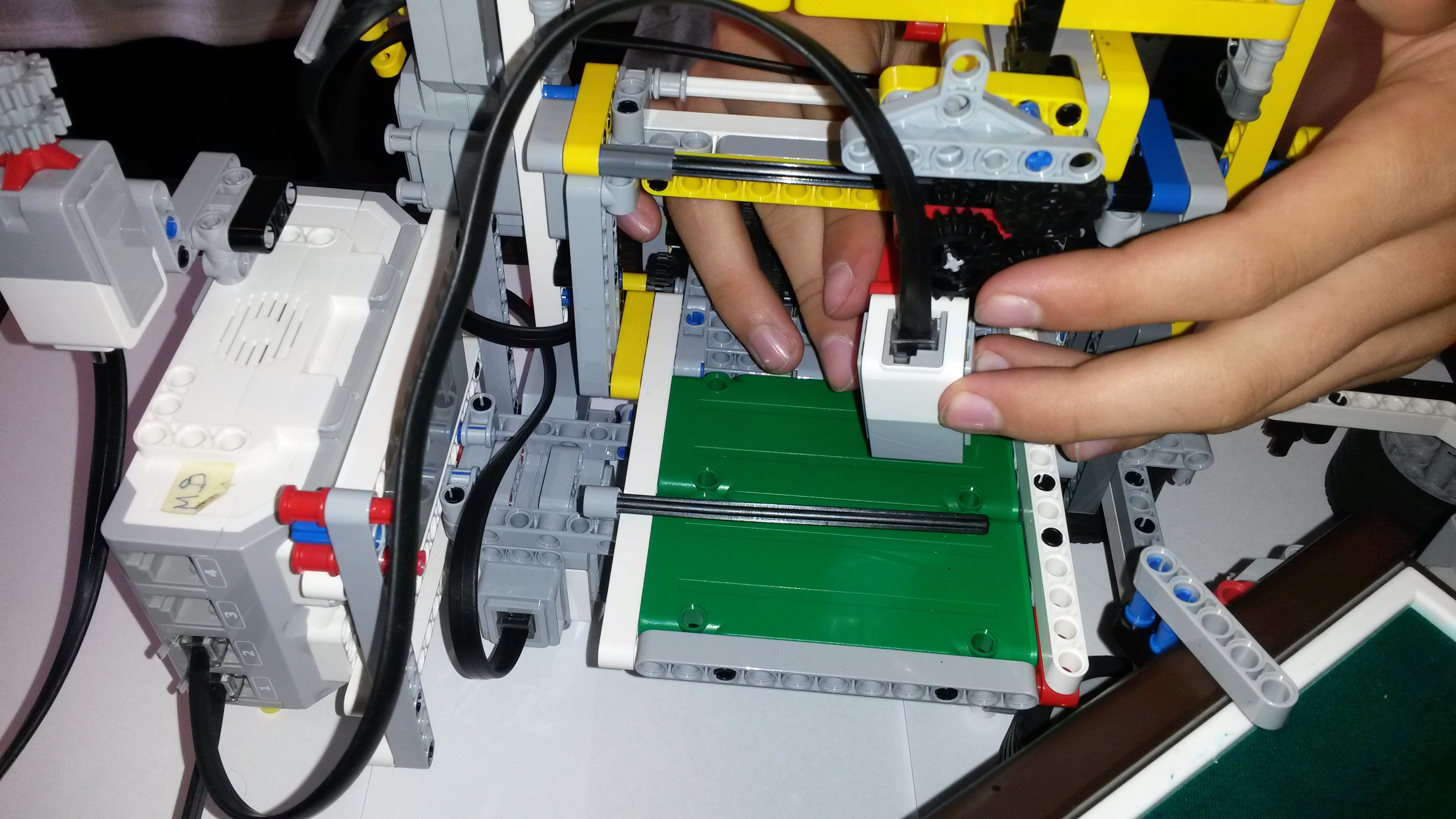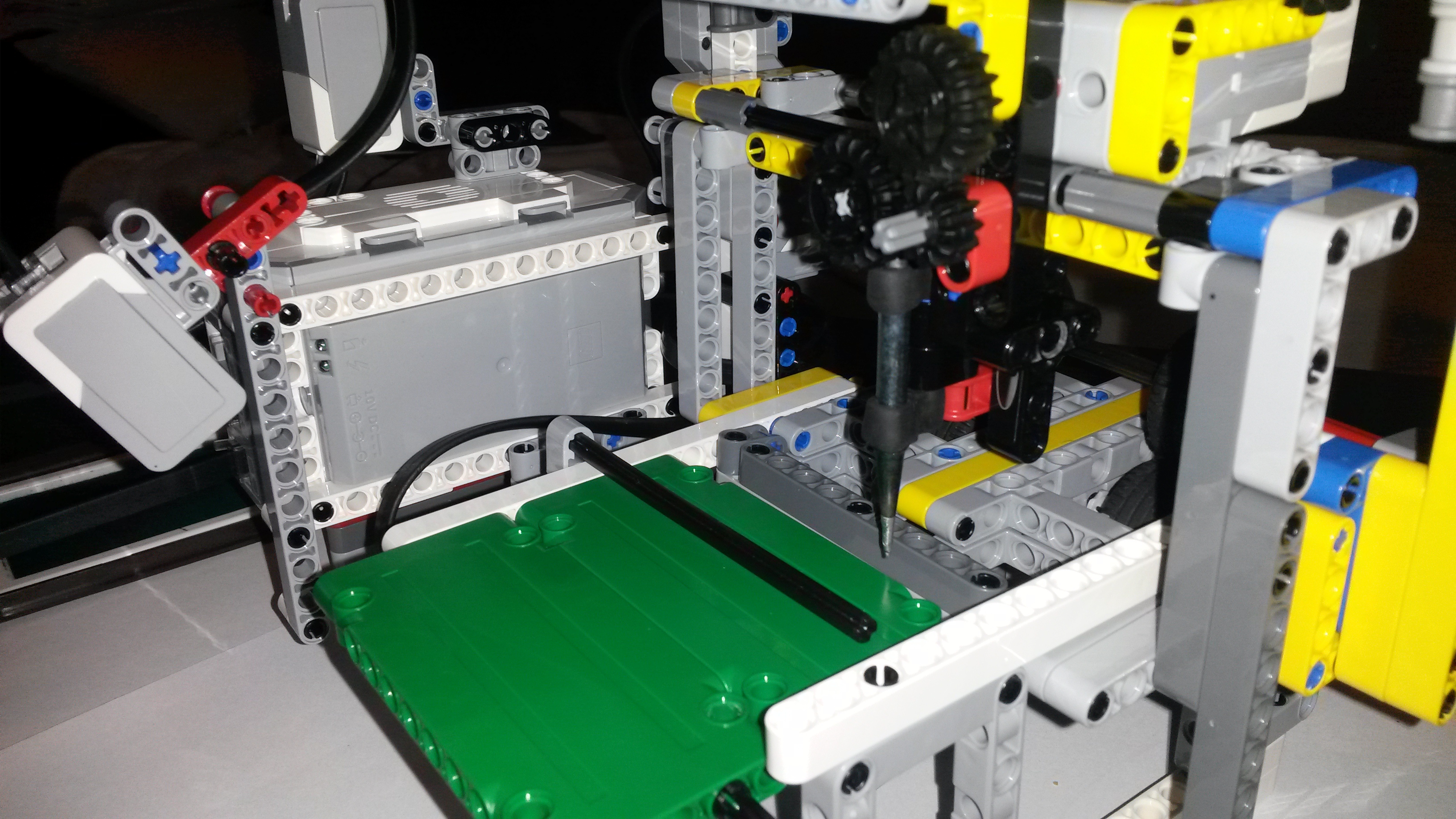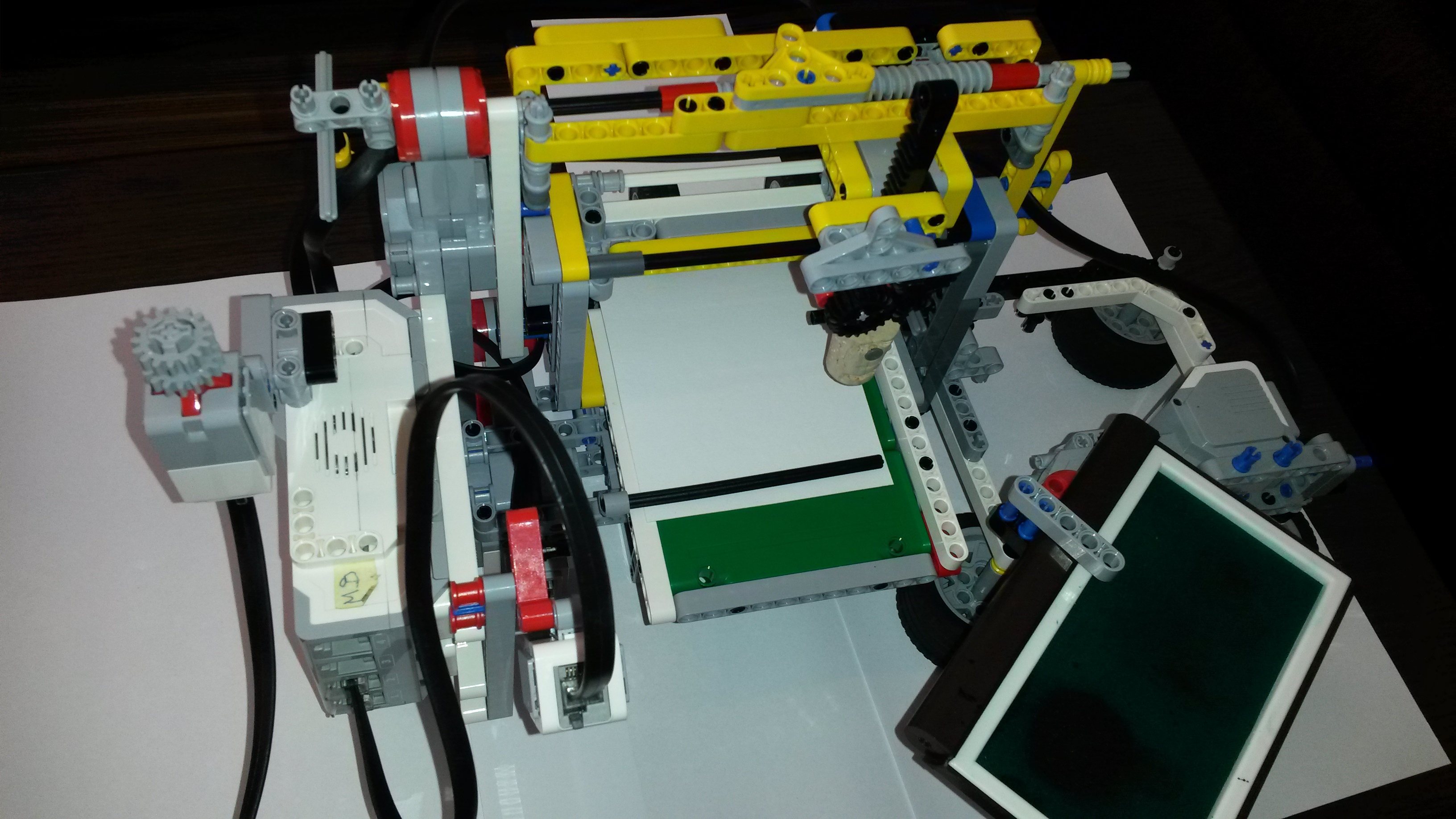Robota sme zostrojili tak, že sa po malých úpravách dal použiť na obidve techniky a v každej aj na zápis, aj na čítanie. Najdôležitejšou časťou robota je vertikálny posun – dierovača /na ktorý sme použili ostrý kovový hrot z mikropájky/ a aj pohyb pečiatky /na ktorú sme použili korkovú zátku s plsteným kolieskom naspodu/. Tento pohyb zabezpečoval medium motor s ozubenými kolieskami prepojený s ozubenou rovnou koľajnicou. Tu sme riešili aj najväčšie problémy – nakoľko sme pri obidvoch technikách potrebovali väčší prítlak a vôľa v ozubených prevodoch to niekedy komplikovala. Na horizontálny posuv celého medium motora aj s nástavcami sme použili „šnekové“ súčiastky pripevnené cez paličky na large motor. Pri pečiatkovaní sme ešte museli mať prídavné namáčacie zariadenie – poduška otočne pripevnená k druhému motoru.