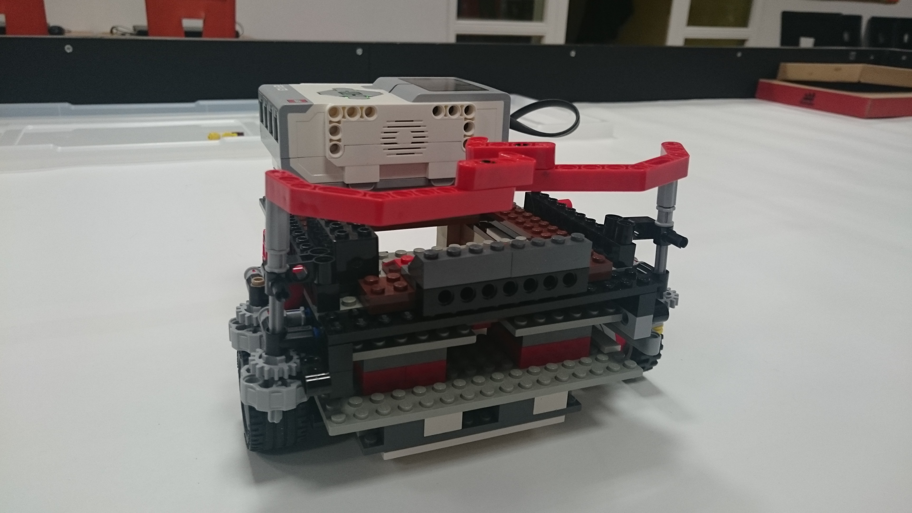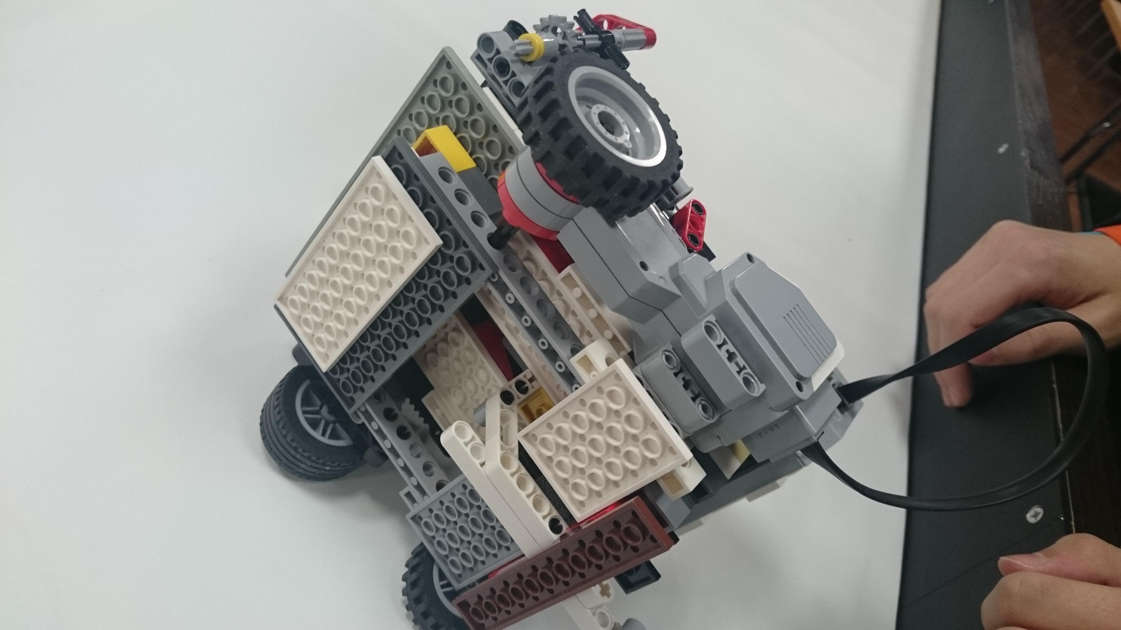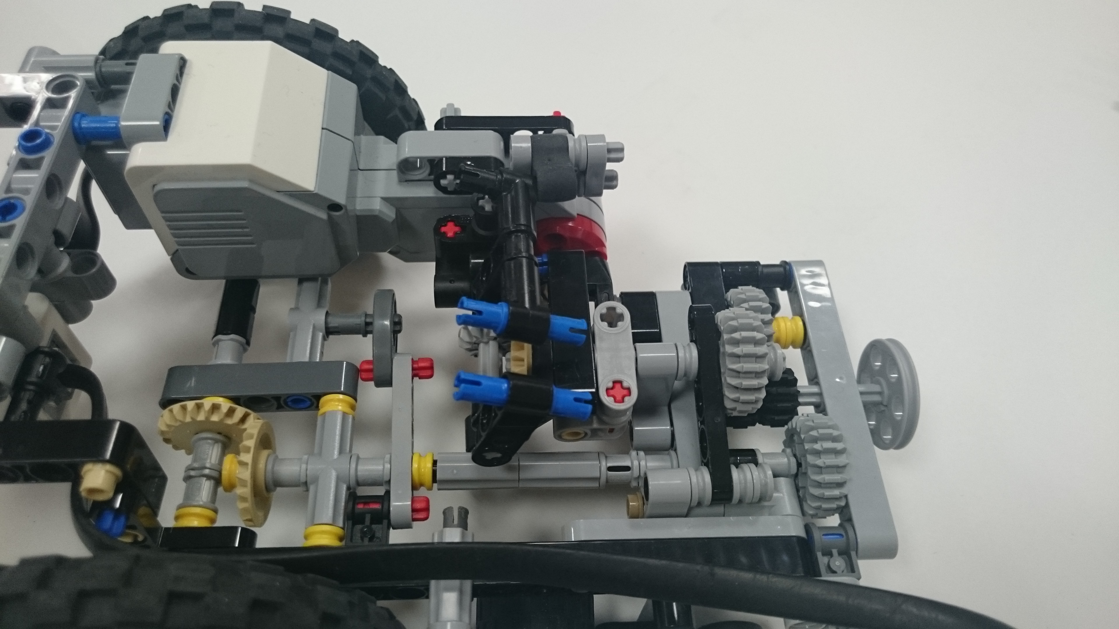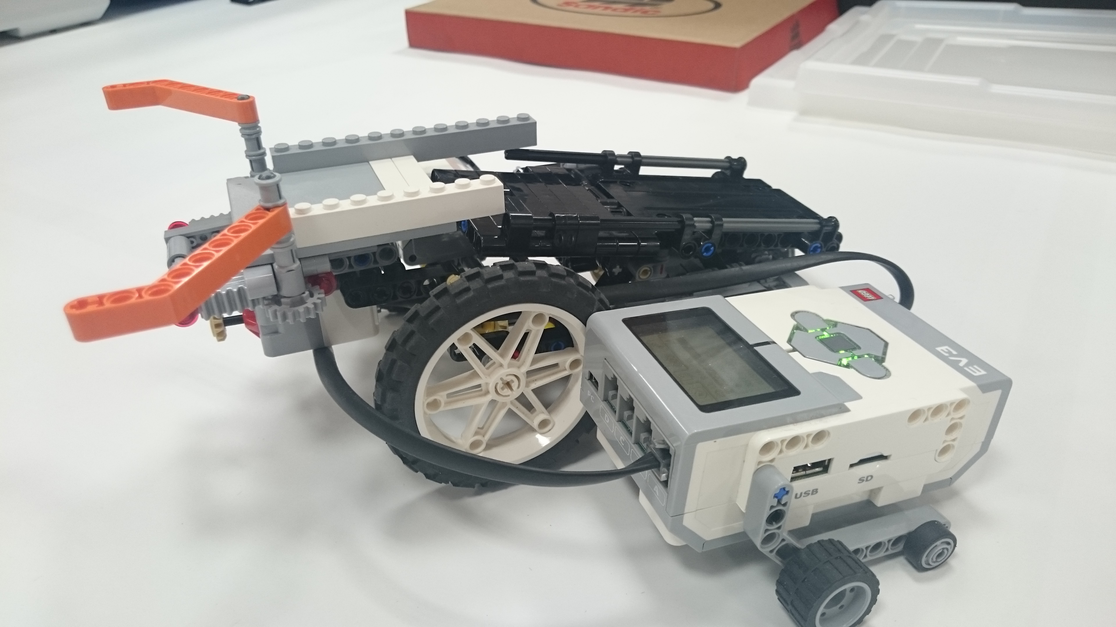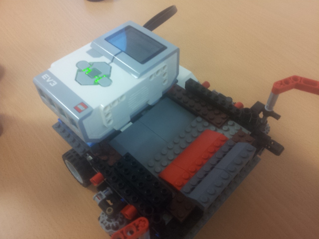 Možnosť A: Robot (plavidlo) sa pohybuje pomocou 2 veľkých kolies, ktoré sú napojené na motor. Robinsona naloďuje pomocou predného klepeta, ktoré sa zatvára nárazom na ostrov, vtedy sa Robinson dostane na zadnú palubu plavidla. Potom robot cúva až kým sa nedostane k pevnine, pri náraze na pevninu sa mu prehodí prevod, vďaka ktorému už motor nie je prepojený s kolesami ale so zadnou palubou, ktorú vyklápa dozadu až kým nevyloží Robinsona na pevninu. Možnosť B: Robot má na motor napojené dve kolesá, ktoré používa na pohyb po oceáne. Ide 30 cm dopredu a keď narazí na ostrov zasunú sa mu dve ozubené časti. Pomocou prevodu sa k sebe dajú dve ramená, ktoré zoberú Robinsona z ostrova a hodia na palubu. Keď robot príde k brehu zatlačí sa nárazová plošina a tým sa otvorí paluba a Robinson sa po naklonenej rovine zadným otvorom v lodi dostane na súš. Nakoniec sa robot robot odzdraví a odchádza späť do oceánu. Presný pohyb: Robot štartoval vždy z toho istého miesta a rovnako natočený, a na konci jeho jazdy sme vždy metrom zmerali a zapísali odchýlku z pôvodného miesta. Merali sme aj odchýlku natočenia robota, ktorú si meral sám gyro-senzorom. -v programe je spravený "block" v ktorom si podľa parametrov pneumatík a zadanej vzdialenosti v cm vypočíta koľko otáčok motorom musí spraviť aby prešiel presne 1 meter. Po pokuse sme zistili, že robotovi sa postupne zvyšovala odchýlka (možno kvôli vybíjaní batérie), ale bolo to viac-menej náhodné. Po analýze experimentu sme sa rozhodli, že robotovi dáme menšie kolesá ďalej od seba a v programe mu znížime rýchlosť a nastavíme mu, aby sa otáčal podľa gyroskopu. Po týchto zmenách bol oveľa presnejší, a dá sa povedať že výsledok bol neporovnateľný s prvým pokusom.