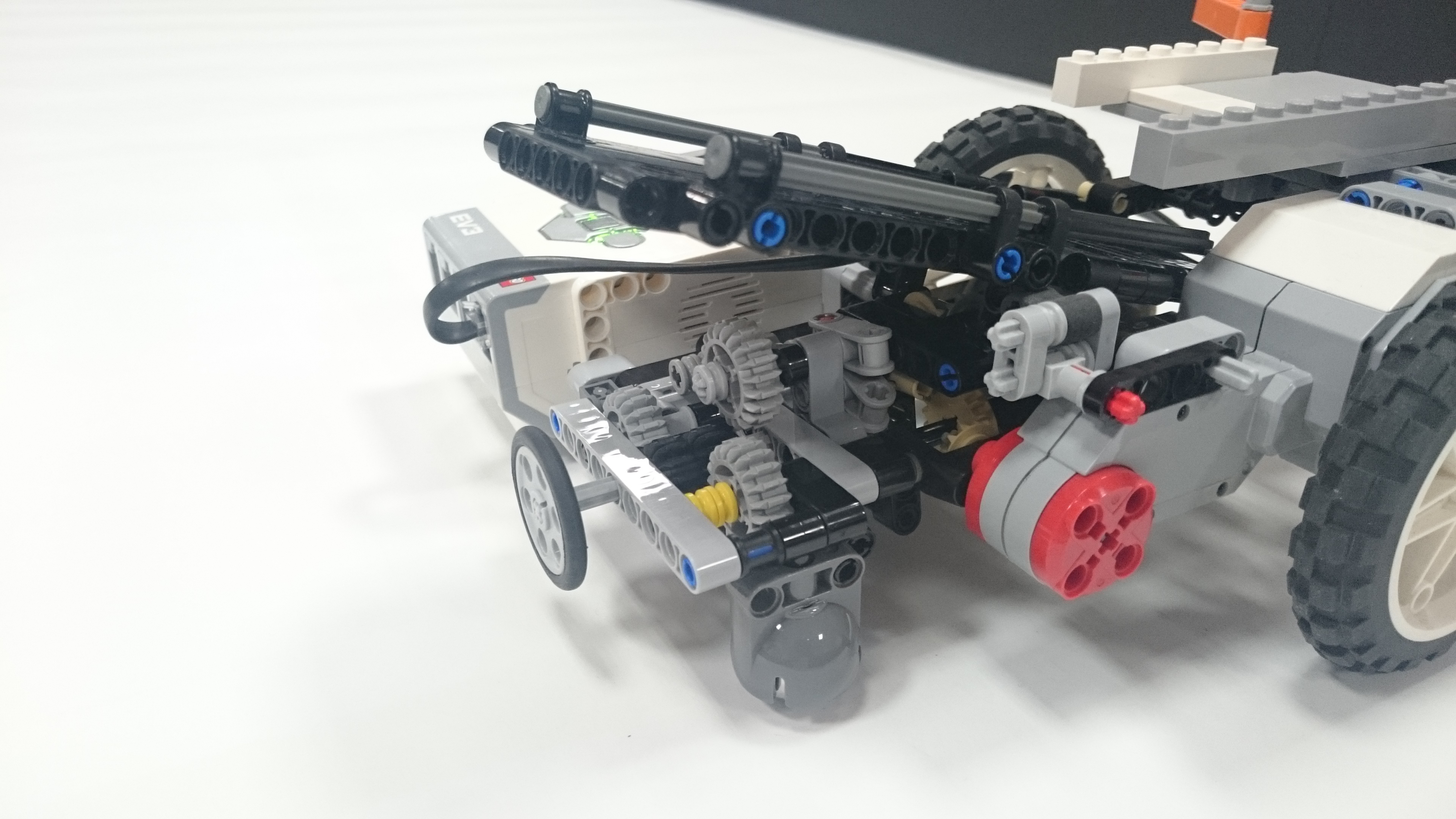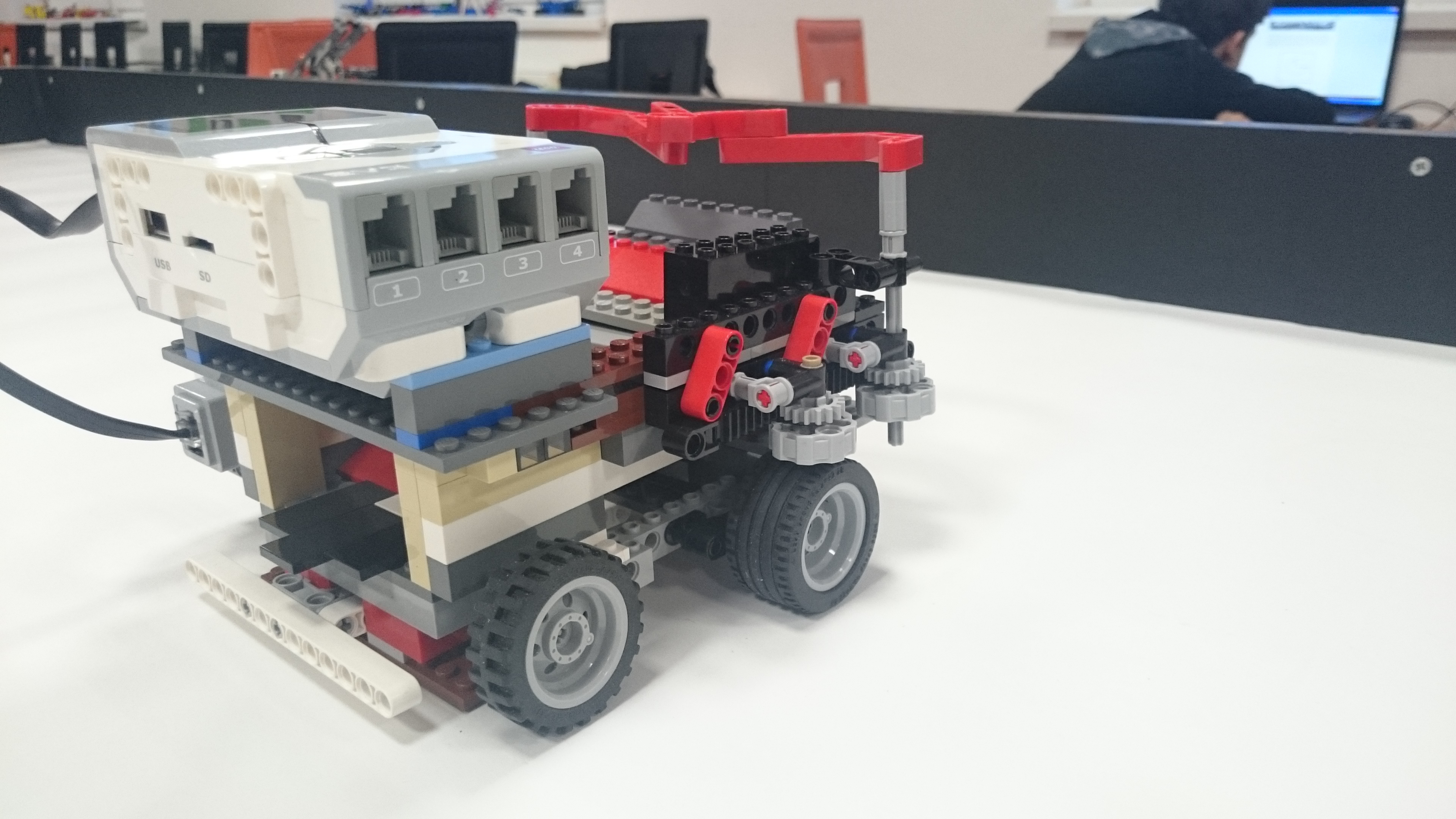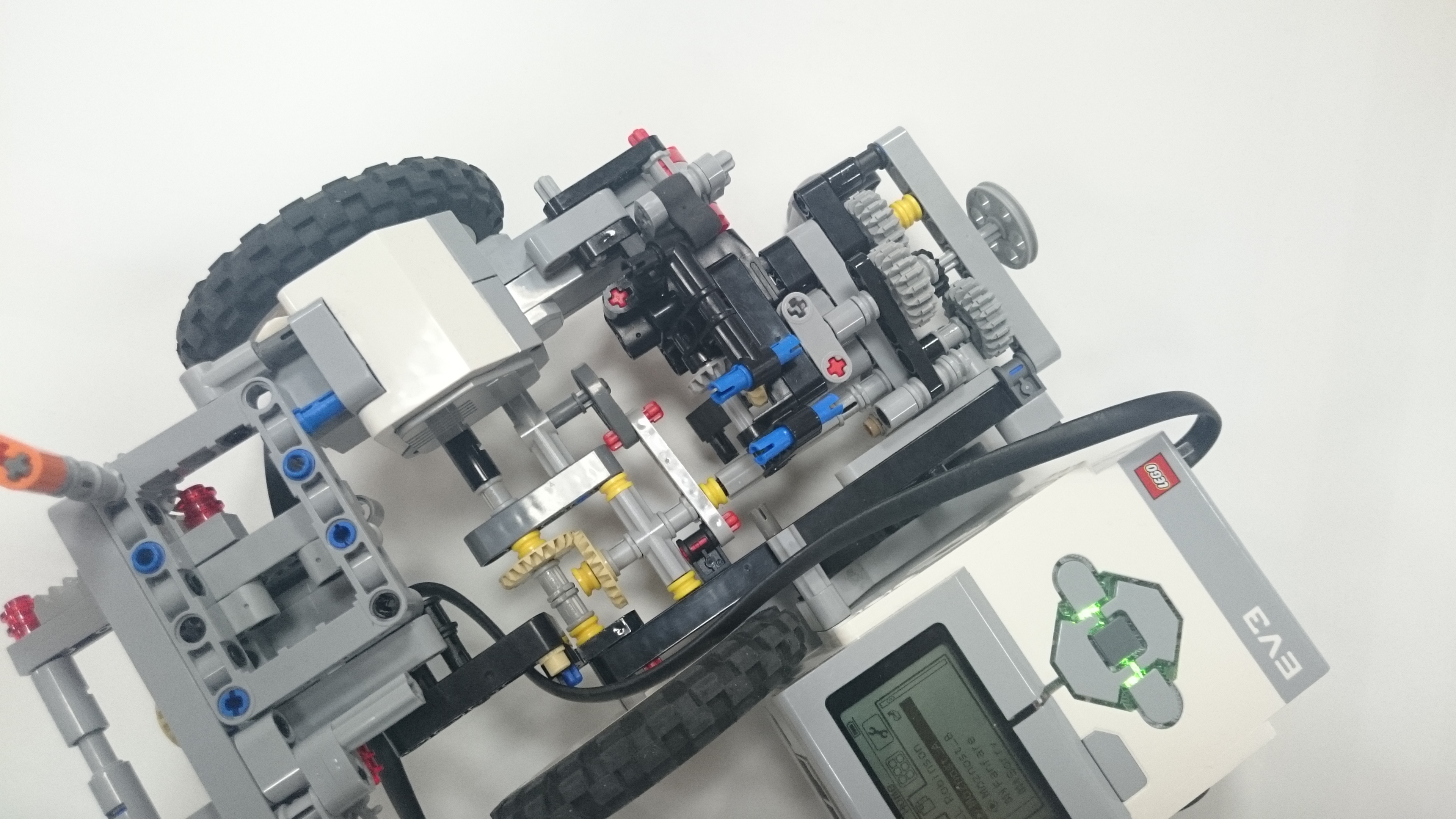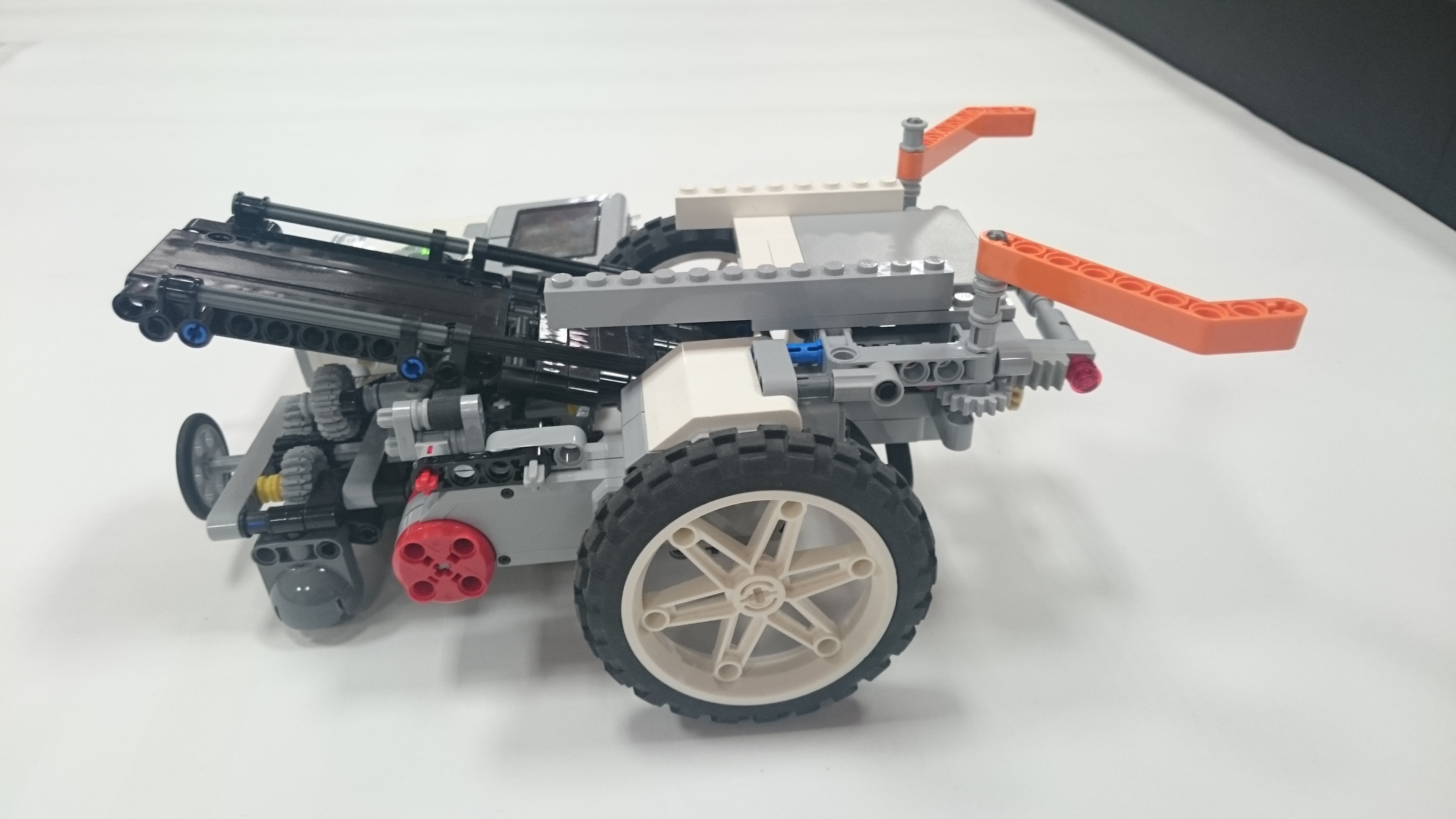 Možnosť A: Robot (plavidlo) sa pohybuje pomocou 2 veľkých kolies, ktoré sú napojené na motor. Robinsona naloďuje pomocou predného klepeta, ktoré sa zatvára nárazom na ostrov, vtedy sa Robinson dostane na zadnú palubu plavidla. Potom robot cúva až kým sa nedostane k pevnine, pri náraze na pevninu sa mu prehodí prevod, vďaka ktorému už motor nie je prepojený s kolesami ale so zadnou palubou, ktorú vyklápa dozadu až kým nevyloží Robinsona na pevninu. Možnosť B: Robot má na motor napojené dve kolesá, ktoré používa na pohyb po oceáne. Ide 30 cm dopredu a keď narazí na ostrov zasunú sa mu dve ozubené časti. Pomocou prevodu sa k sebe dajú dve ramená, ktoré zoberú Robinsona z ostrova a hodia na palubu. Keď robot príde k brehu zatlačí sa nárazová plošina a tým sa otvorí paluba a Robinson sa po naklonenej rovine zadným otvorom v lodi dostane na súš. Nakoniec sa robot robot odzdraví a odchádza späť do oceánu. Presný pohyb: Robot štartoval vždy z toho istého miesta a rovnako natočený, a na konci jeho jazdy sme vždy metrom zmerali a zapísali odchýlku z pôvodného miesta. Merali sme aj odchýlku natočenia robota, ktorú si meral sám gyro-senzorom. -v programe je spravený "block" v ktorom si podľa parametrov pneumatík a zadanej vzdialenosti v cm vypočíta koľko otáčok motorom musí spraviť aby prešiel presne 1 meter. Po pokuse sme zistili, že robotovi sa postupne zvyšovala odchýlka (možno kvôli vybíjaní batérie), ale bolo to viac-menej náhodné. Po analýze experimentu sme sa rozhodli, že robotovi dáme menšie kolesá ďalej od seba a v programe mu znížime rýchlosť a nastavíme mu, aby sa otáčal podľa gyroskopu. Po týchto zmenách bol oveľa presnejší, a dá sa povedať že výsledok bol neporovnateľný s prvým pokusom.