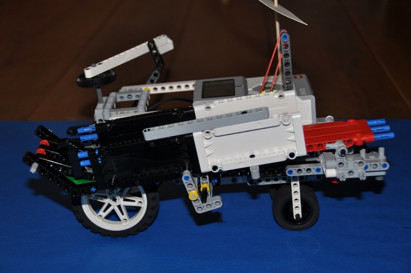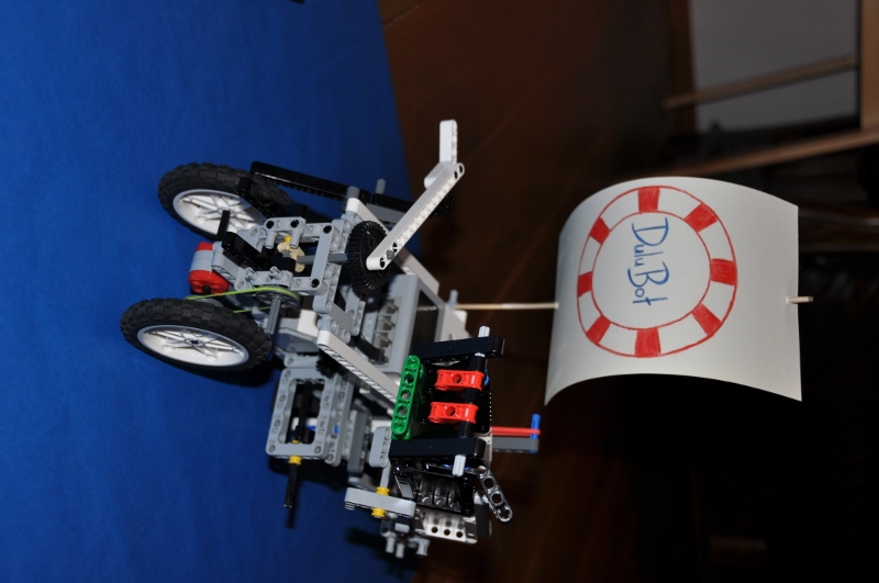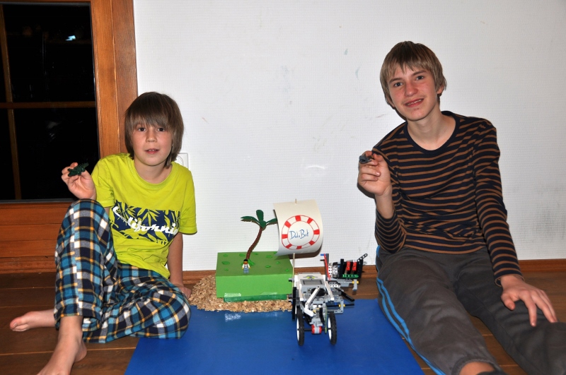 Riešenie najprv vyzeralo veľmi jednoducho, ale prakticky bolo ťažké umiestniť rameno a spraviť prevod, aby sa kolesá a rameno otáčali naraz. Nevedeli sme nájsť riešenie, aby motor ovládal aj vyloženie Robinsona a tak sme spravili šmykľavku, ktorá je upevnená na gumičke. Na začiatku je šmykľavka zachytená pomocou západky, ktorá sa uvoľní až vtedy, keď robot narazí do pevniny a nárazník potlačí do západky a tým ju uvoľní a tým Robinsona vyklopí. Keďže sa termín posunul na pondelok, rozhodli sme sa pridať pár dekorácií a trochu sme pohrali so strihaním videa ...:-) Program je veľmi jednoduchý, pretože robot (záchranná loď) ide pomocou jedného motora len dopredu a potom dozadu. Program sme pre istotu nahrali aj vo formáte zip aj ev3.