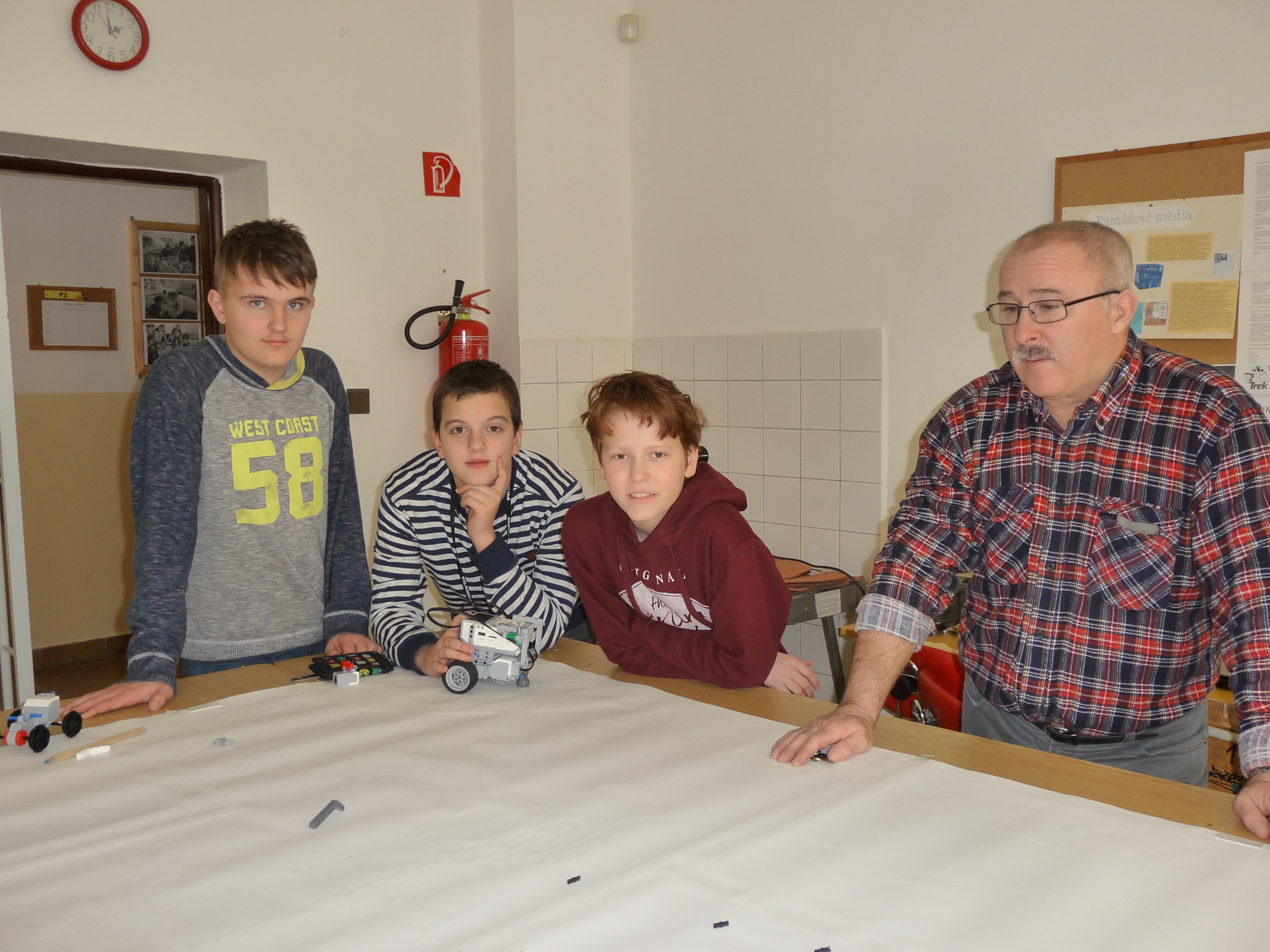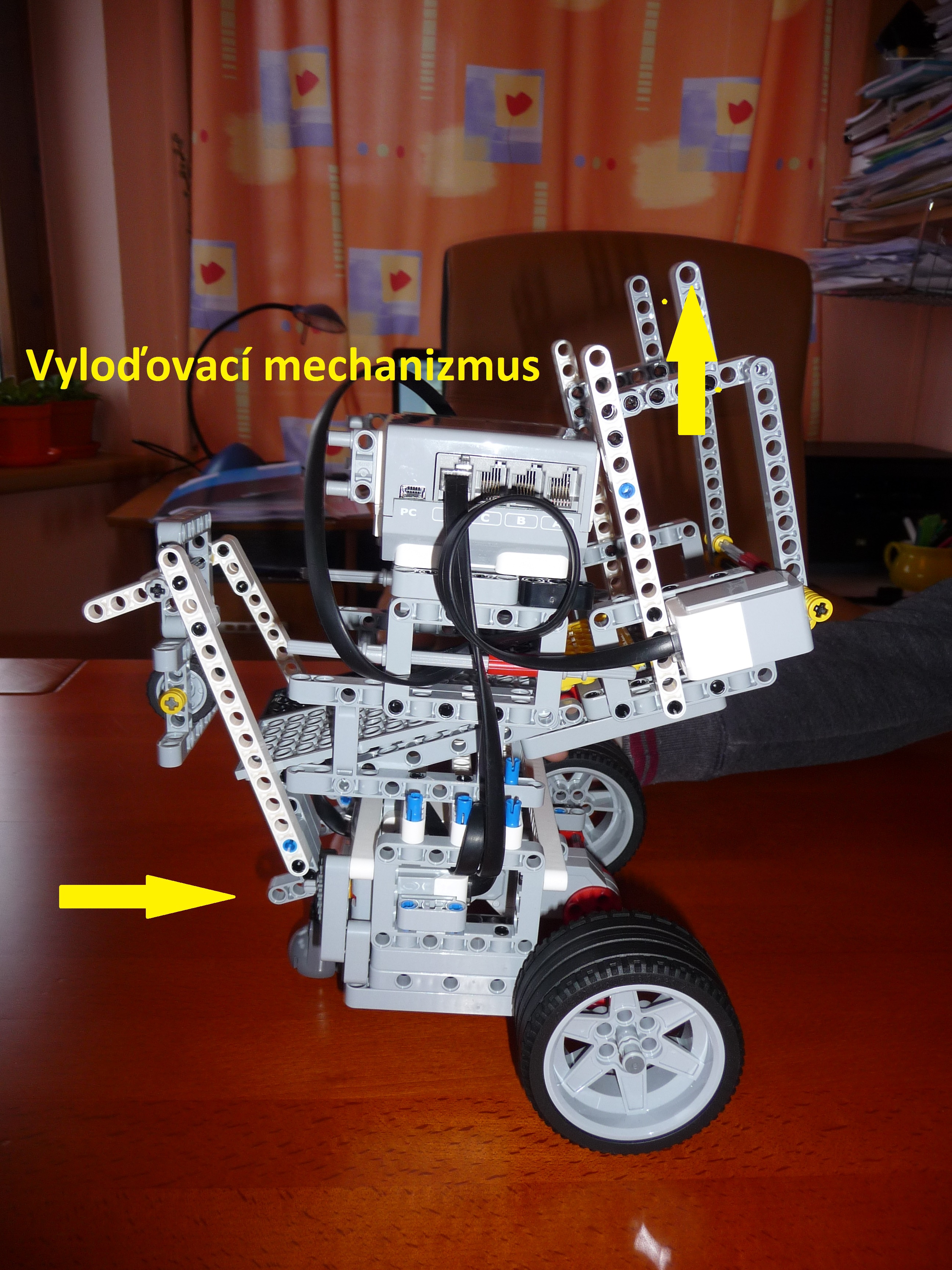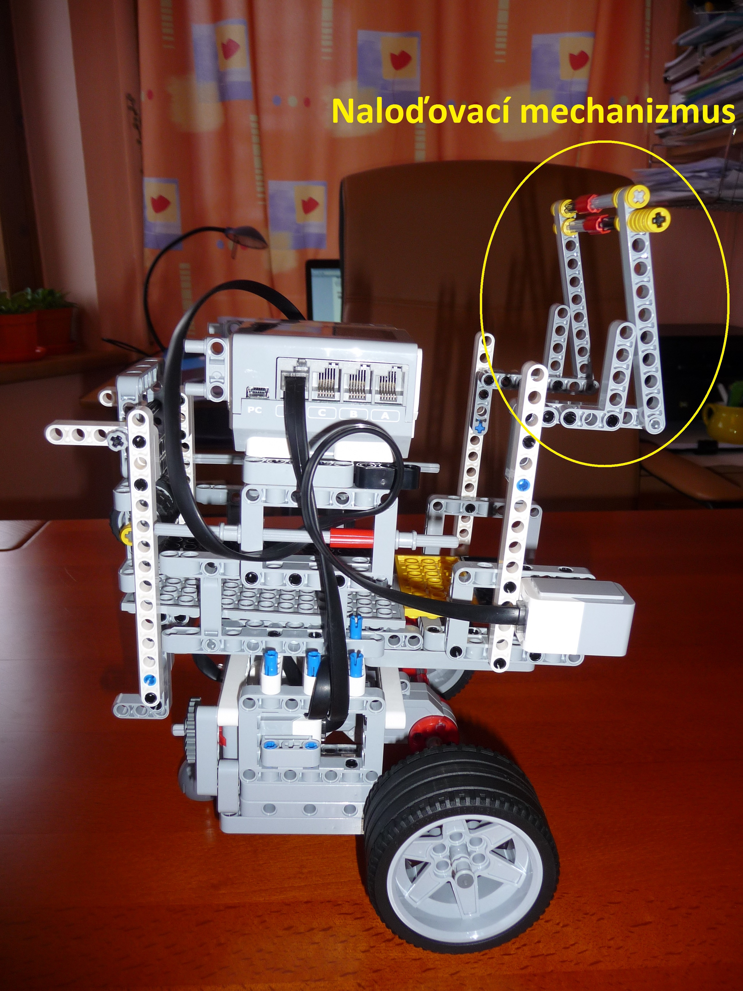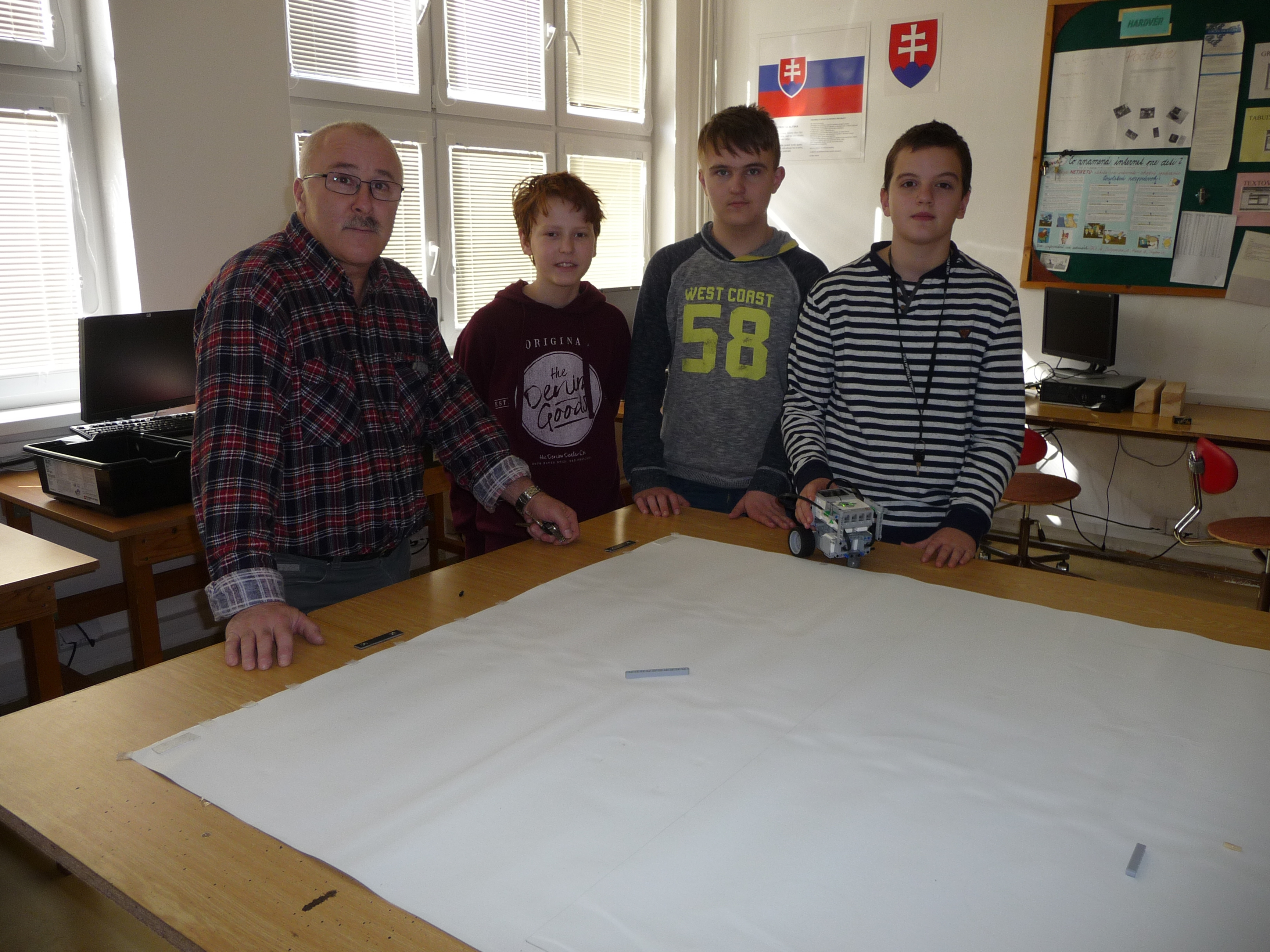Robinson: Pri pouziti jedneho motora sa lod pohybuje smerom k ostrovu. Nalodovaci mechanizmus pri naraze do brehu ostrova "spadne" a otocnym pohybom nalodi Robinsona do vnutra lode. Na opacnej strane lode je klapka, ktora zastavi pohyb Robinsona aby nespadol do mora. Zaroven snimac farby zaznamena ze nalodovaci mechanizmus Robinsona nalodil a da pokyn motoru lode na opacny pohyb lode smerom k pevnine. Lod s Robinsonom sa pohybuje smerom k pevnine. Lod za pomoci vystupkov pri naraze na pevninu spusti vylodovaci mechanizmus. Cela paluba lode sa tym nakloni a Robinson pohodlne vystupi na pevninu. Ak by sa Robinsonovi nechcelo vystupit, lod este par krat cuvne a znovu narazi na pevninu, cim ulahci Robinsonovi vylodenie. Zaroven tlakovy senzor zaznamena vylodenie a da pokyn motoru lode na opustenie pevniny. Paluba lode je mierne naklonena aby kraj lode bol pri nalodovani a zaroven pri vylodovani presne vo vyske pevniny. Presny pohyb: Zostrojili sme robota s dvomi motormi a vytvorili program pre pohyb robota do stvorca so stranou 1 meter. Rozhodli sme sa ze nebudeme merat vzdialenosti od miesta startu a konecnej pozicie robota, ale budeme zaznamenavat konecnu polohu robota v osiach X a Y od miesta startu. V 1.testovacom kole sme urobili 10 pokusov a vysledky sme zaznamenali do Excel tabulky. Podla grafu sa nam zdalo, ze robot konci vpredu v osi Y. V programe sme upravili hodnoty aby robot zatacal viac vlavo. V 2.testovanom kole sme urobili tiez 10 pokusov. Vysledky boli presnejsie k miestu startu, ale stale boli dost rozhadzane. Keby sme mali sme viac casu na urobenie viac testovacich kol asi by sme sa pokusili: 1. zmenit rychlost robota 2. zatazit robota aby sa kolesa nepretacali 3. pouzit gyrosenzor na zatacanie