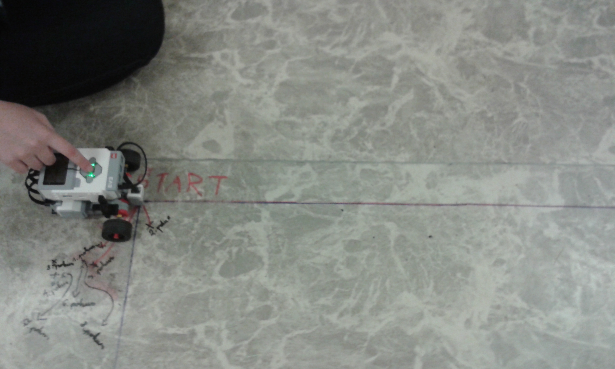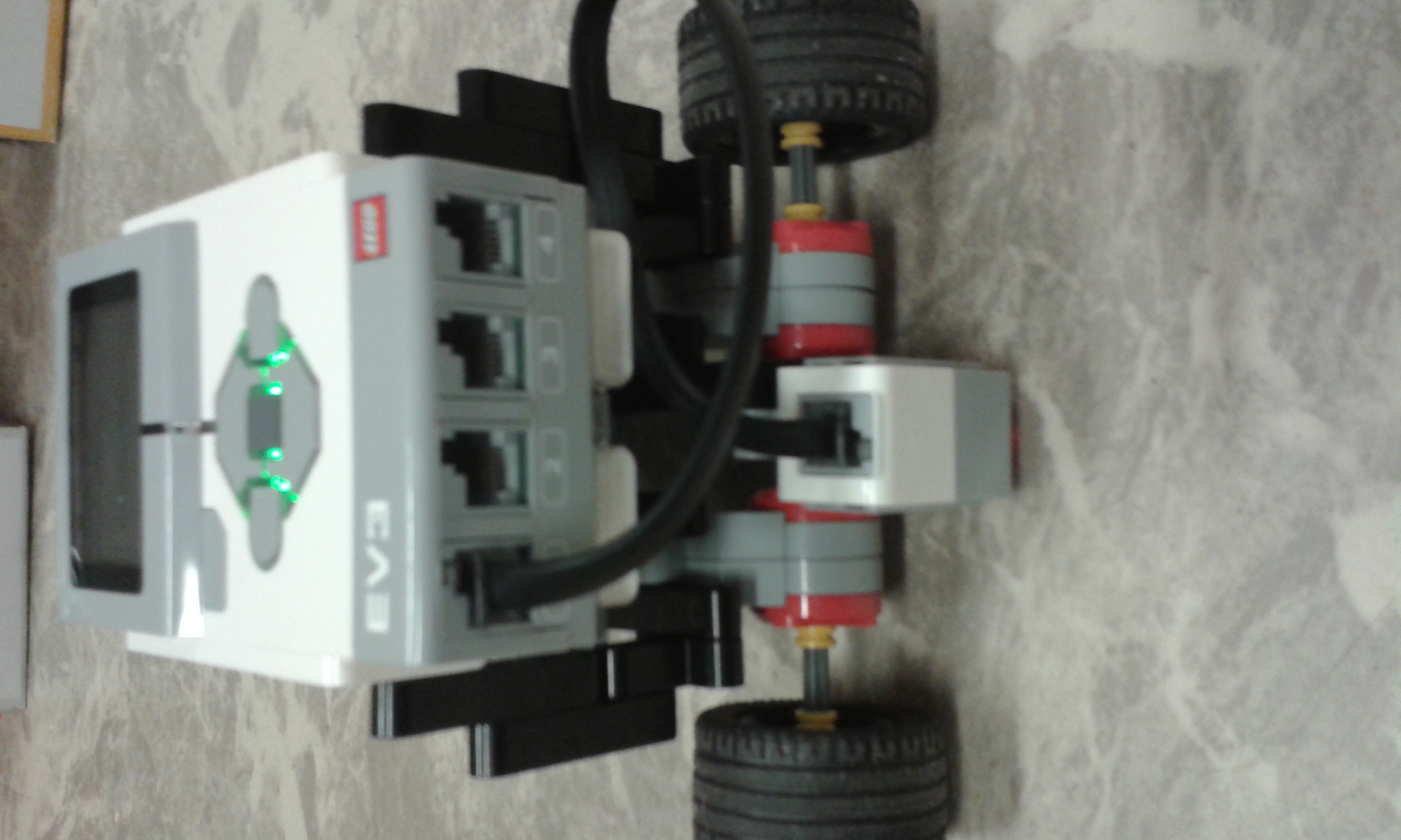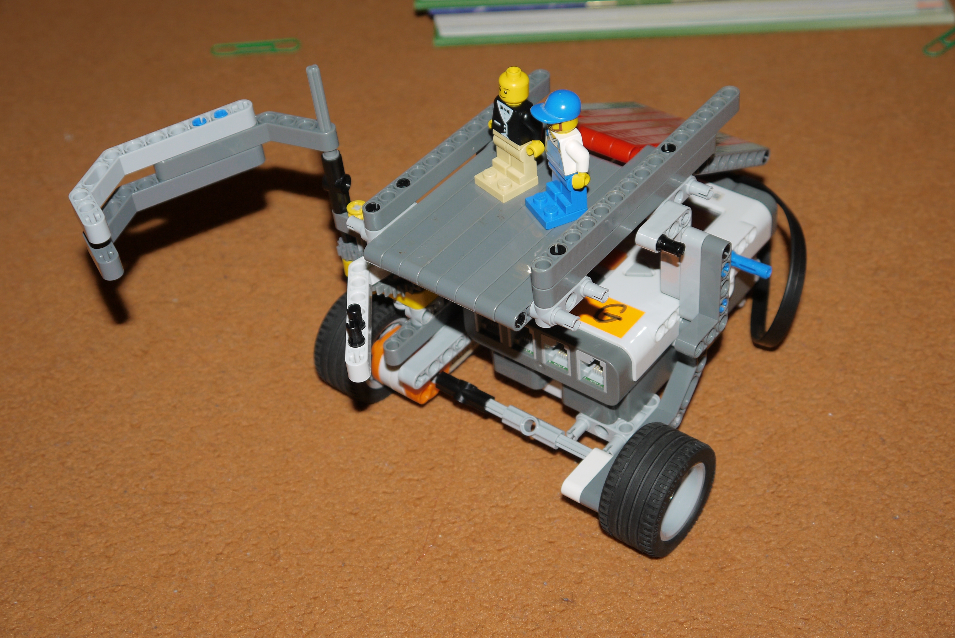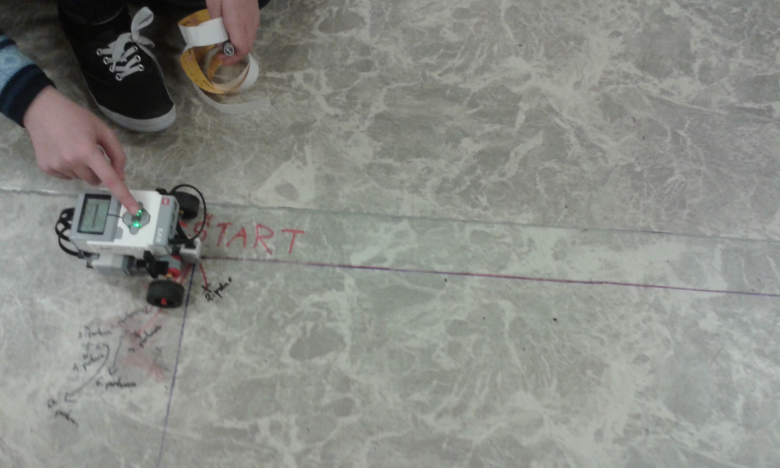 1.úloha - postup: Vytvorili sme model,ktorý mal jeden motor,ktorý poháňal predné kolesá. Naberacia konštrukcia funguje na troch ozubených kolieskach ( 1 veľké a 2 malé aby naberadlo bolo rýchle). Keď tyčka na veľkom ozubenom kolese nabúra otočí sa koleso, ktoré otočí druhé a to otočí tretie, s ktorým sa otočí páčka, ktorá je pripevnená ku koliesku a tá zhrabne Robinsona resp. Piatka. Po nabratí Robinsona sa robot vráti a ručne ho vyklopíme po šmýkalke na súš. 2.úloha - postup: Vytvorili sme si jednoduchý model autíčka s 2 kolesami a 2 motormi. Svetelný senzor slúžil iba ako presný bod pre kontrolu štartového a cieľového bodu. Naše výsledky boli pri každom pokuse rozdielne. Vzdialenosti sa pohybovali pri 20 pokusoch od 5 do 20 cm. Nepresnosti vznikli pre nerovnú jazdu autíčka aj keď malo nastavený pohyb rovno a tiež pri nepresnom otáčaní sa v rohoch o 90°. Snažili sme sa opraviť konštrukciu, kde sme dali preč všetky časti, ktoré neboli symetrické na modeli. Programovo sme upravovali počet otáčok a veľkosť rotácie. Posielame graf s meraniami.