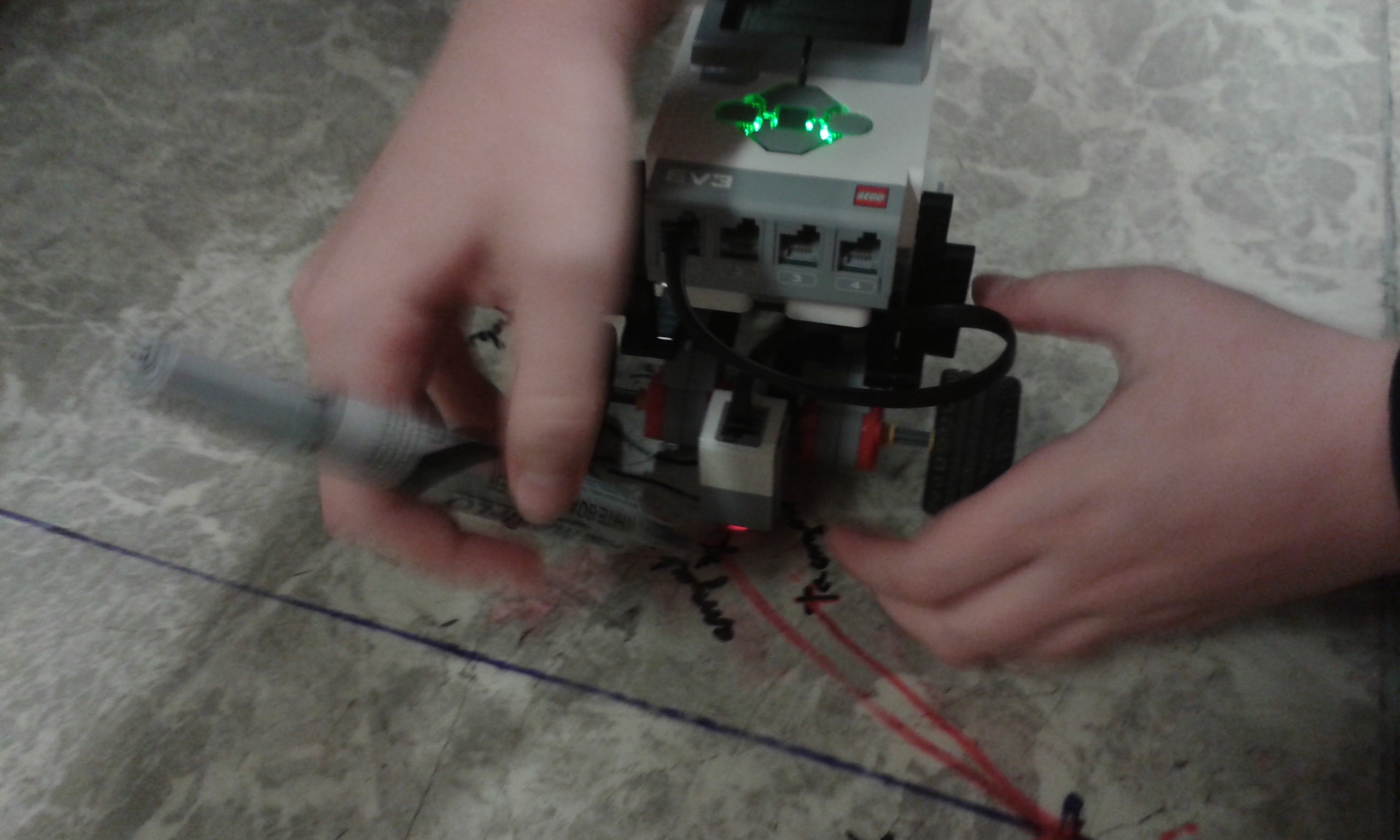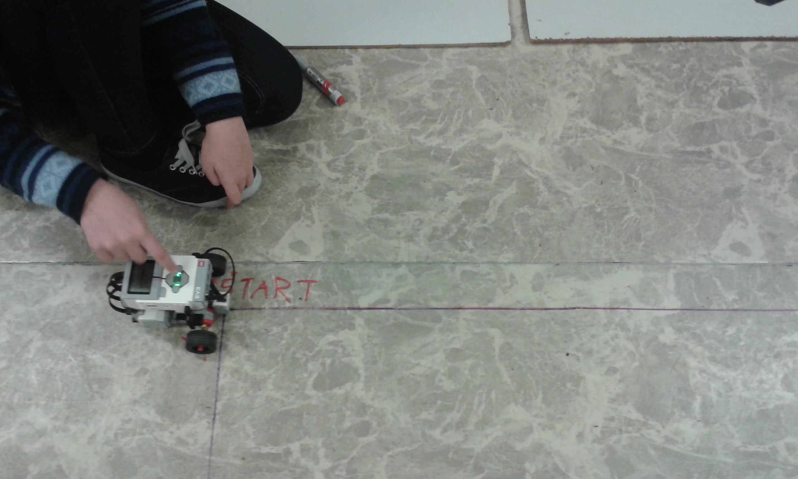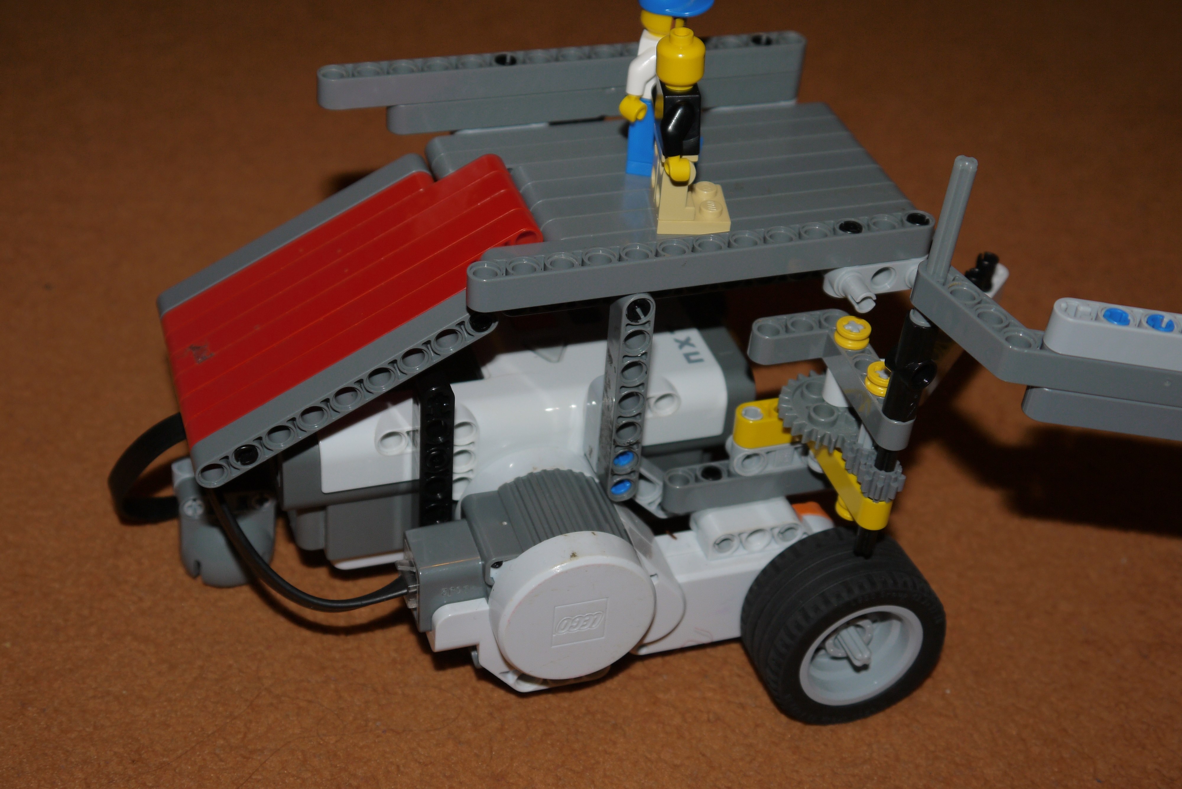 1.úloha - postup: Vytvorili sme model,ktorý mal jeden motor,ktorý poháňal predné kolesá. Naberacia konštrukcia funguje na troch ozubených kolieskach ( 1 veľké a 2 malé aby naberadlo bolo rýchle). Keď tyčka na veľkom ozubenom kolese nabúra otočí sa koleso, ktoré otočí druhé a to otočí tretie, s ktorým sa otočí páčka, ktorá je pripevnená ku koliesku a tá zhrabne Robinsona resp. Piatka. Po nabratí Robinsona sa robot vráti a ručne ho vyklopíme po šmýkalke na súš. 2.úloha - postup: Vytvorili sme si jednoduchý model autíčka s 2 kolesami a 2 motormi. Svetelný senzor slúžil iba ako presný bod pre kontrolu štartového a cieľového bodu. Naše výsledky boli pri každom pokuse rozdielne. Vzdialenosti sa pohybovali pri 20 pokusoch od 5 do 20 cm. Nepresnosti vznikli pre nerovnú jazdu autíčka aj keď malo nastavený pohyb rovno a tiež pri nepresnom otáčaní sa v rohoch o 90°. Snažili sme sa opraviť konštrukciu, kde sme dali preč všetky časti, ktoré neboli symetrické na modeli. Programovo sme upravovali počet otáčok a veľkosť rotácie. Posielame graf s meraniami.