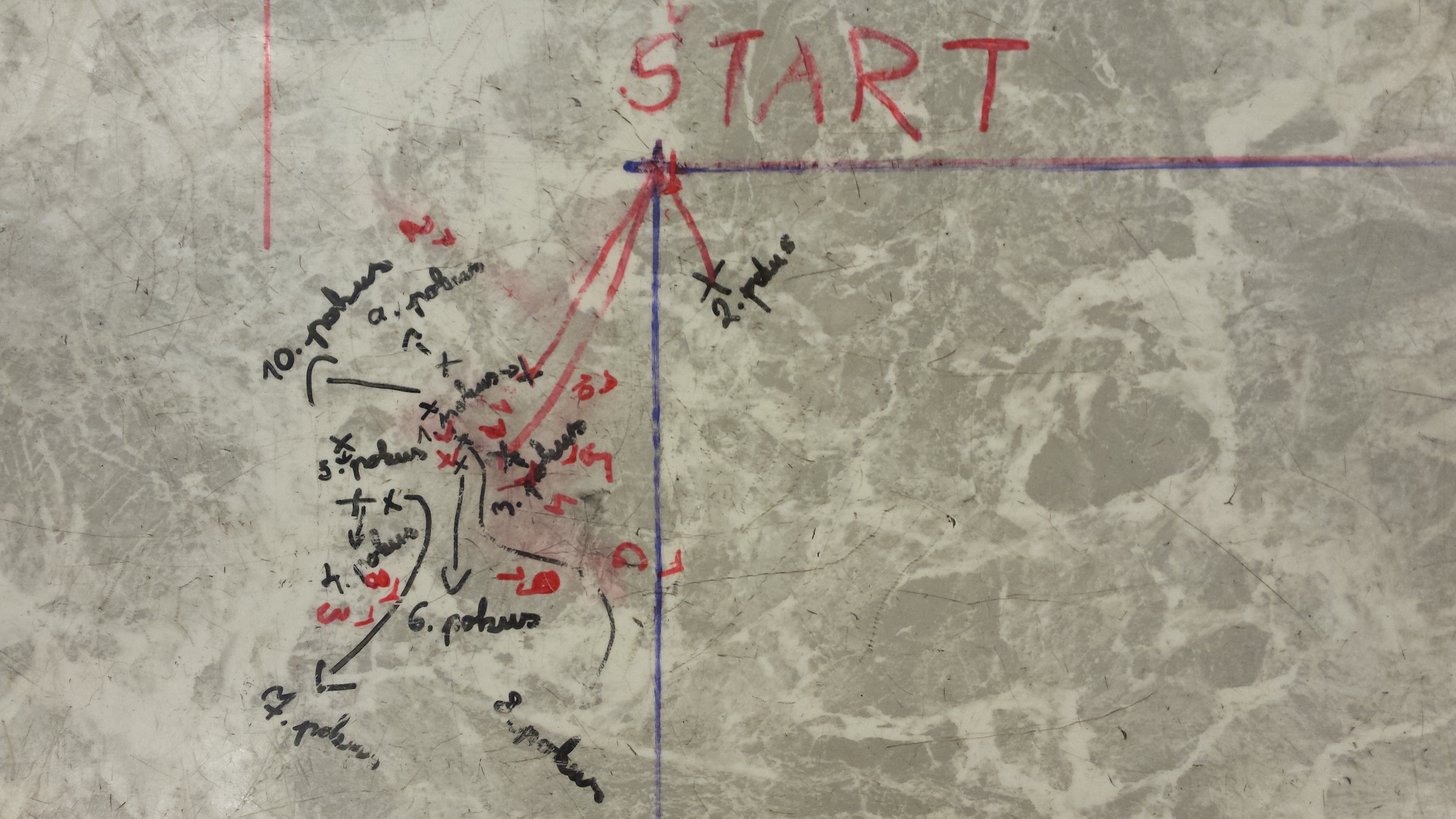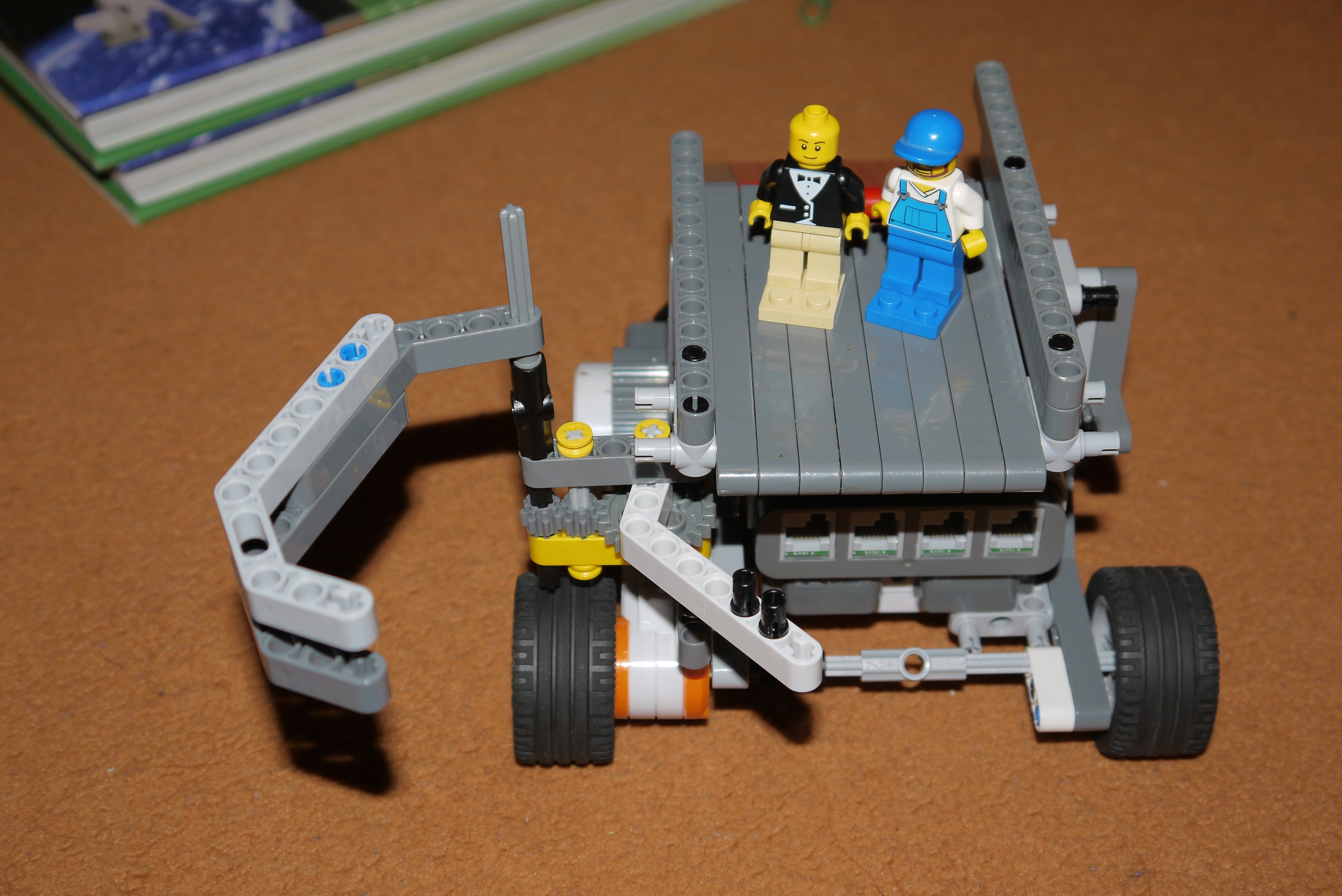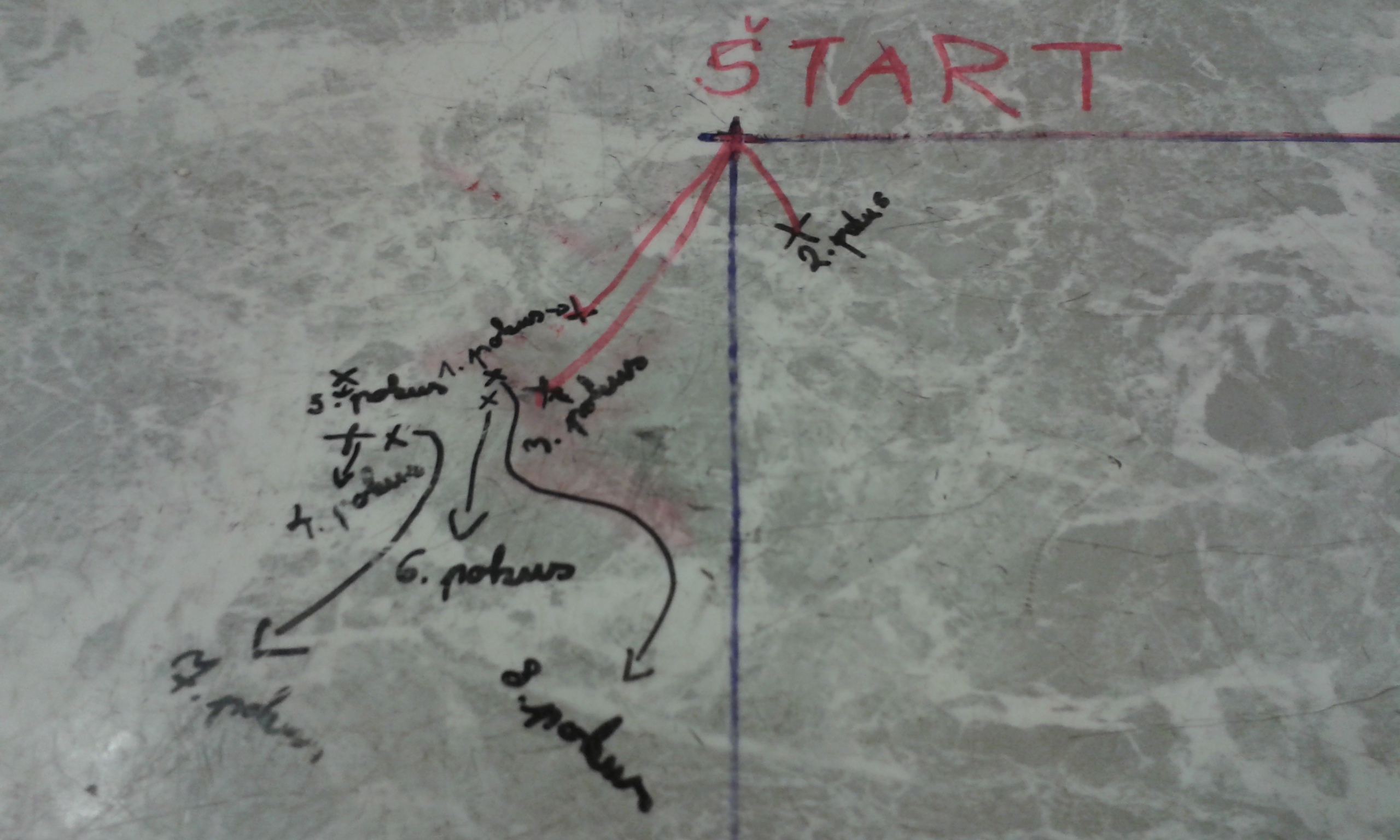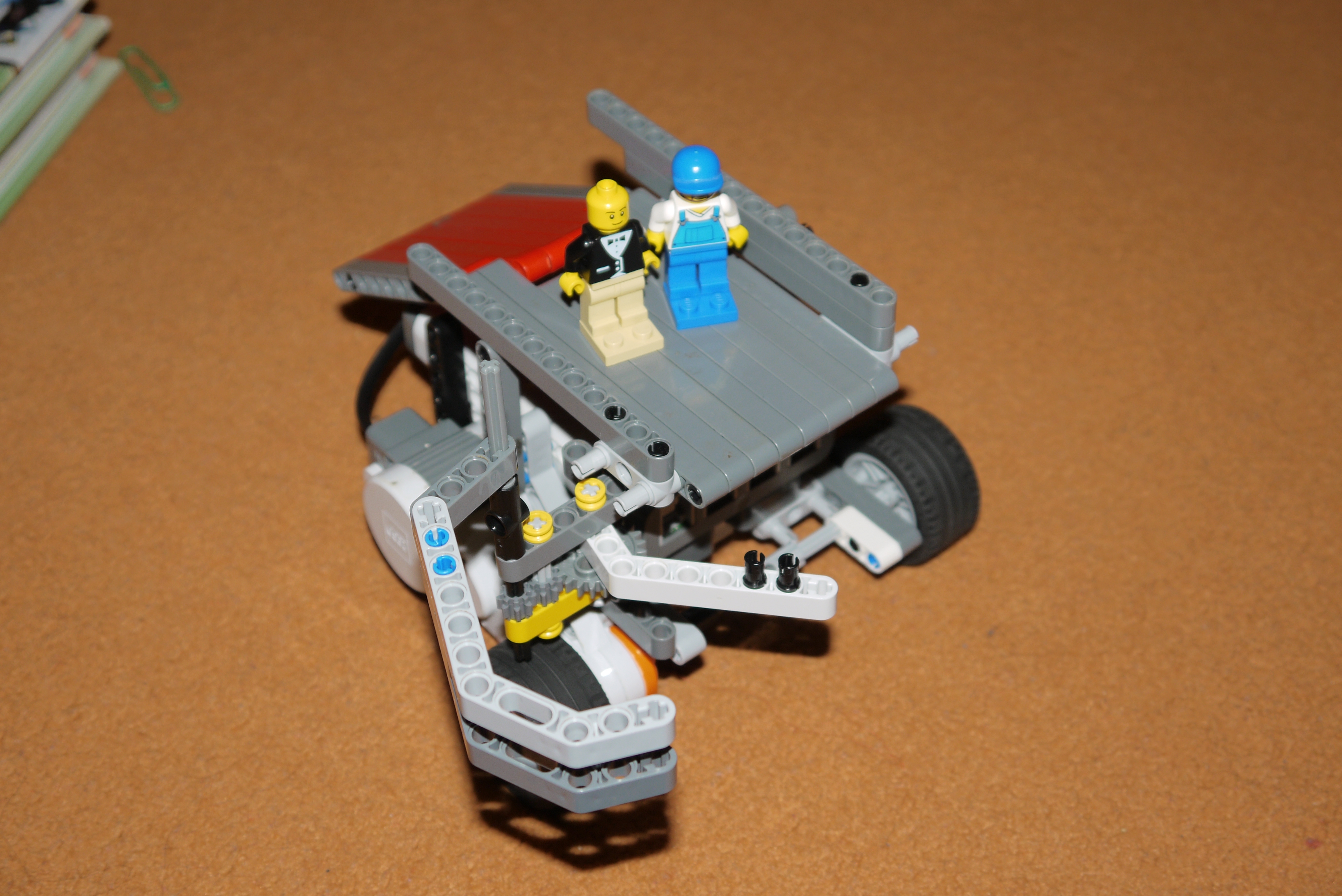 1.úloha - postup: Vytvorili sme model,ktorý mal jeden motor,ktorý poháňal predné kolesá. Naberacia konštrukcia funguje na troch ozubených kolieskach ( 1 veľké a 2 malé aby naberadlo bolo rýchle). Keď tyčka na veľkom ozubenom kolese nabúra otočí sa koleso, ktoré otočí druhé a to otočí tretie, s ktorým sa otočí páčka, ktorá je pripevnená ku koliesku a tá zhrabne Robinsona resp. Piatka. Po nabratí Robinsona sa robot vráti a ručne ho vyklopíme po šmýkalke na súš. 2.úloha - postup: Vytvorili sme si jednoduchý model autíčka s 2 kolesami a 2 motormi. Svetelný senzor slúžil iba ako presný bod pre kontrolu štartového a cieľového bodu. Naše výsledky boli pri každom pokuse rozdielne. Vzdialenosti sa pohybovali pri 20 pokusoch od 5 do 20 cm. Nepresnosti vznikli pre nerovnú jazdu autíčka aj keď malo nastavený pohyb rovno a tiež pri nepresnom otáčaní sa v rohoch o 90°. Snažili sme sa opraviť konštrukciu, kde sme dali preč všetky časti, ktoré neboli symetrické na modeli. Programovo sme upravovali počet otáčok a veľkosť rotácie. Posielame graf s meraniami.