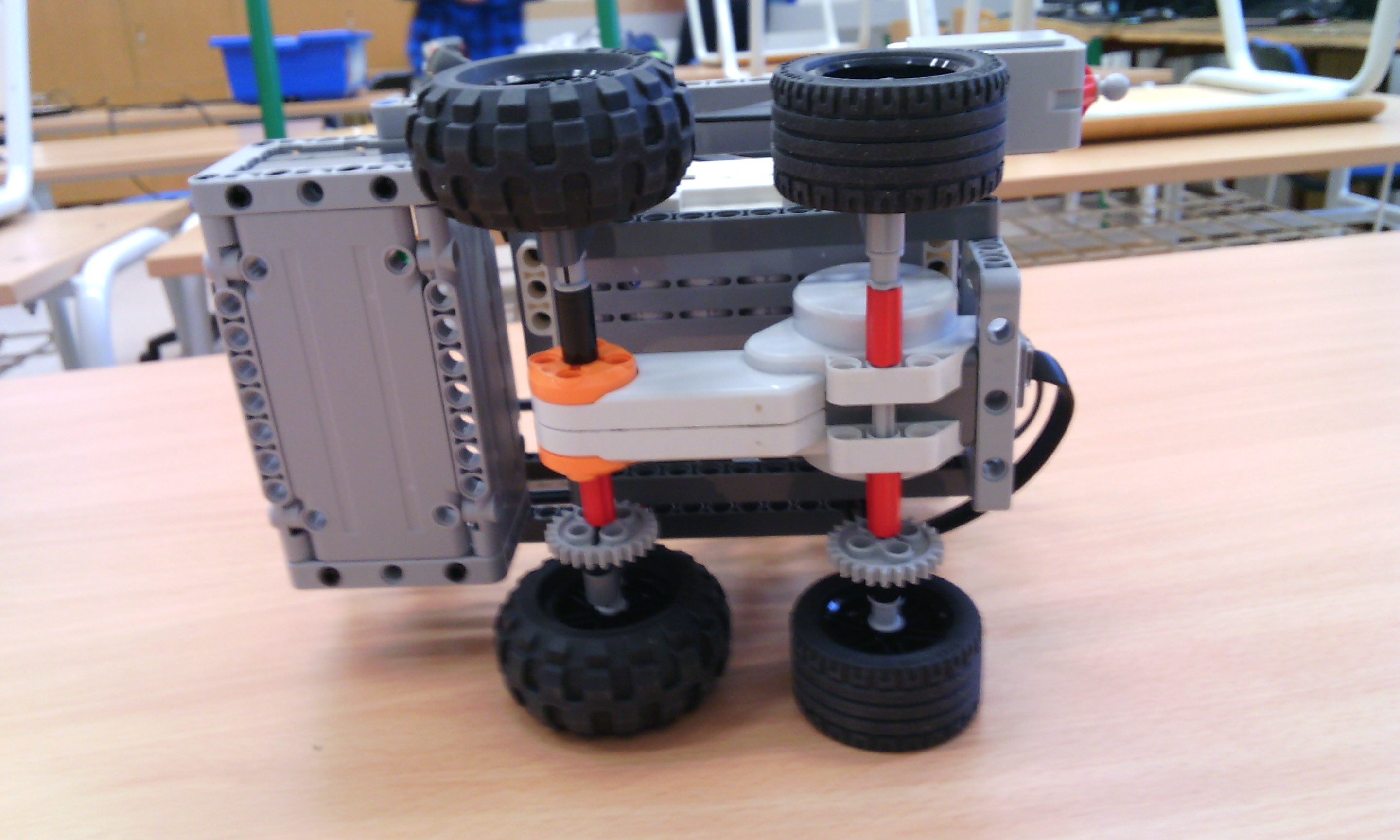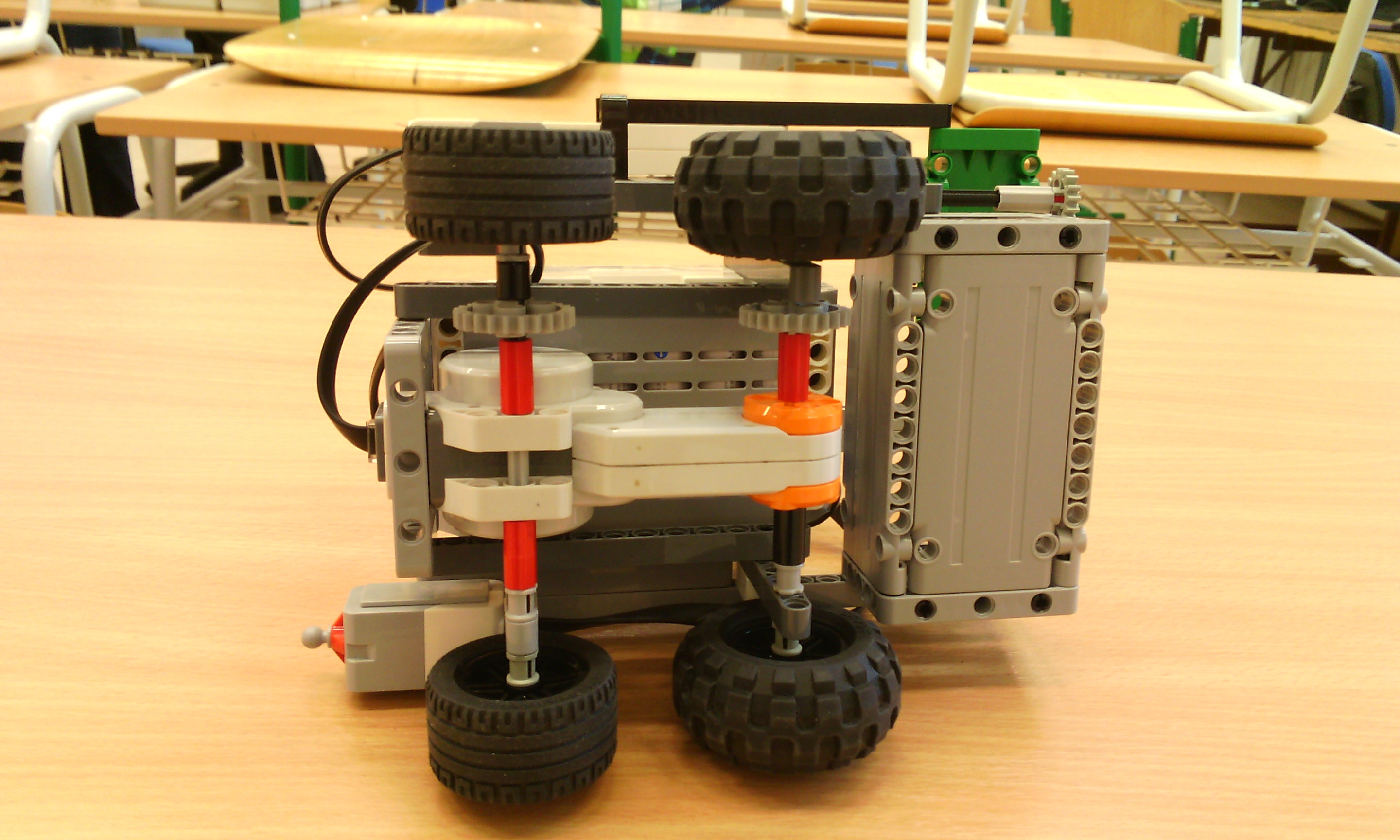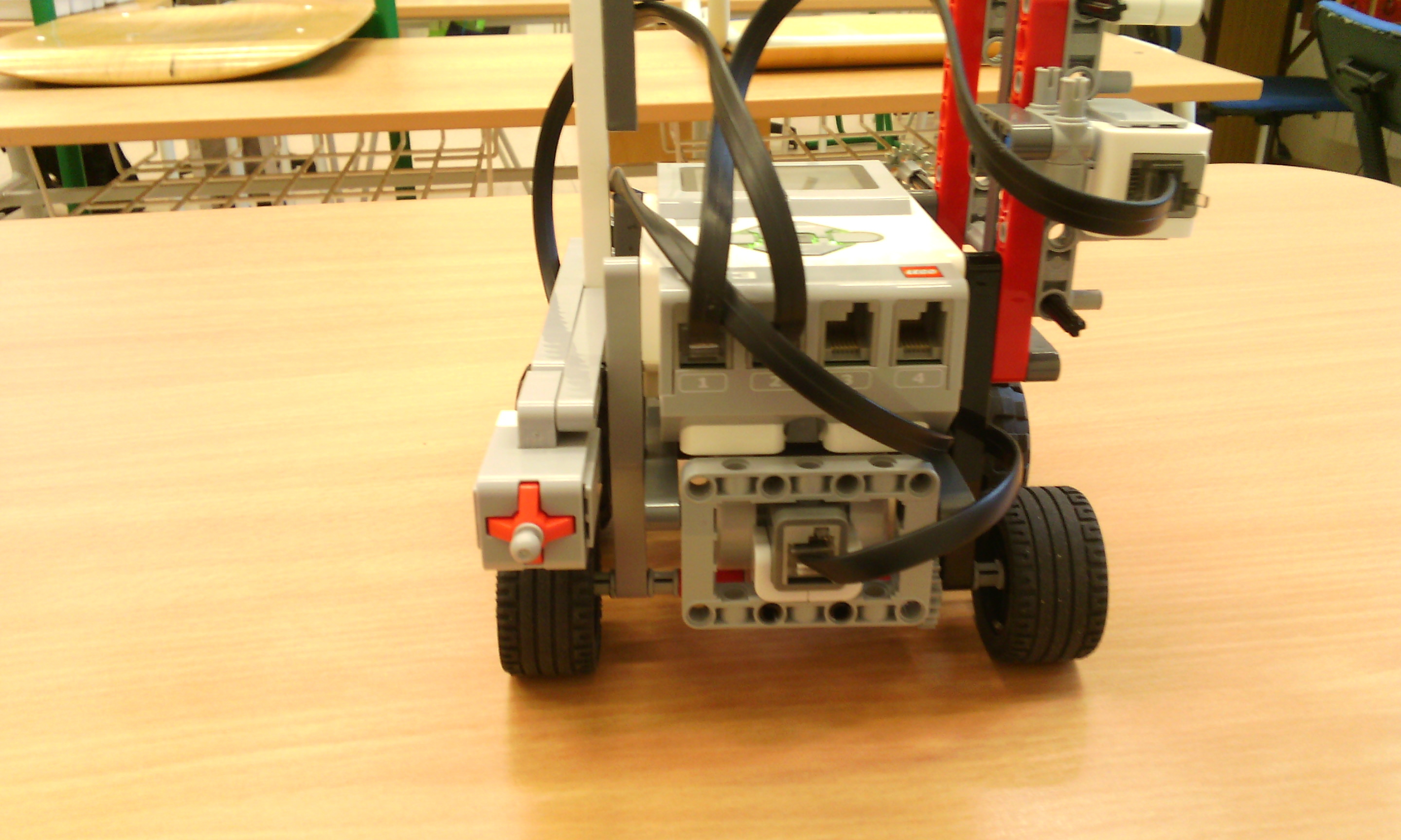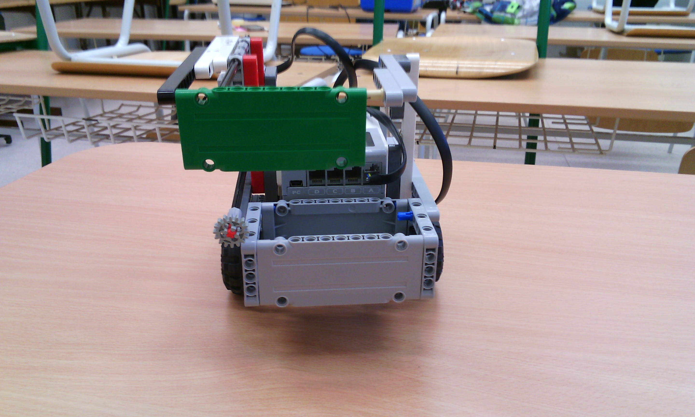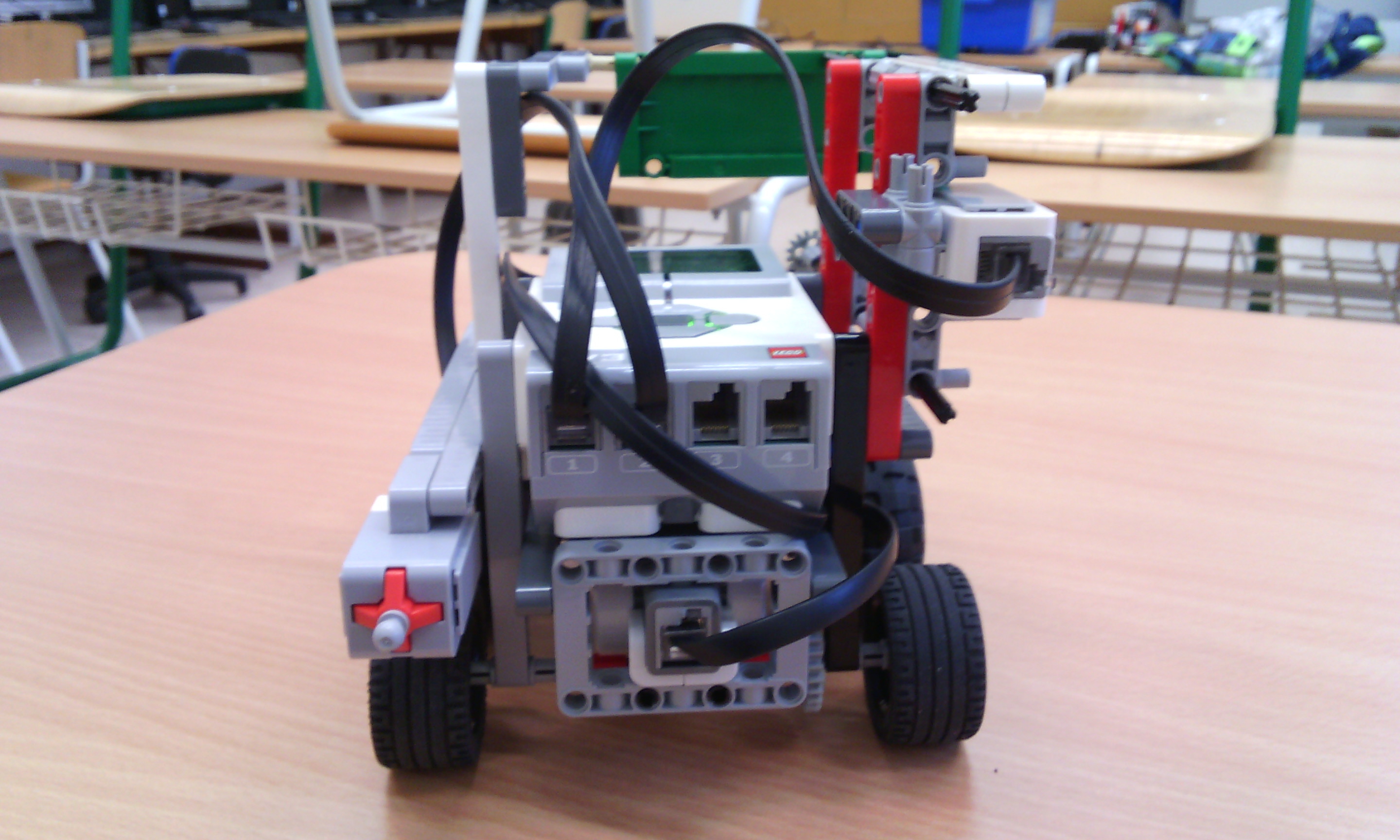 Riešenie 1. kola: Záchrana Robinsona Náš robot má 1 motor a 2 dotykové senzory. Motor slúži na pohyb dopredu a dozadu. Dotykové senzory slúžia na zaregistrovanie brehov. Robot ide najskôr dopredu dokým, vysunutá časť mechanického posúvača nie je posunutá. Tá zatlačí prvý dotykový senzor a zároveň odistí lopatku. Lopatka štuchne Robinsona a tak ho nalodí. Robot čaká 2 sekundy a potom cúva smerom k pevnine pokiaľ nie je druhý dotykový senzor smerujúci dozadu zatlačený o pevninu. Vtedy program skončí.