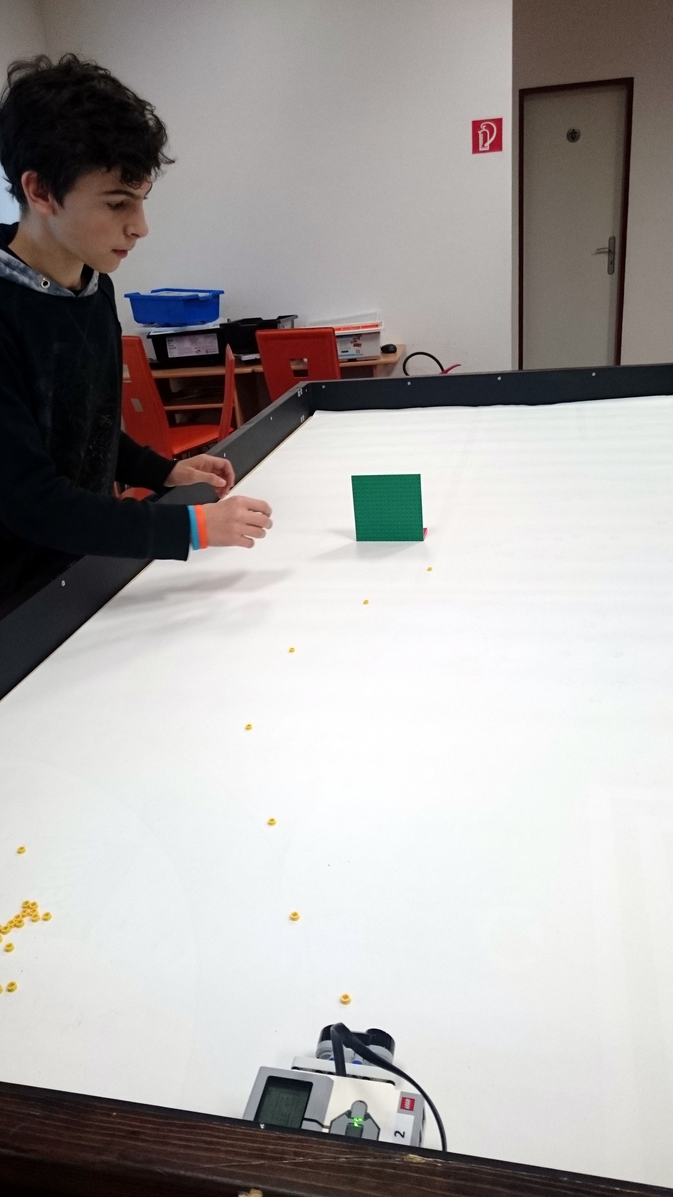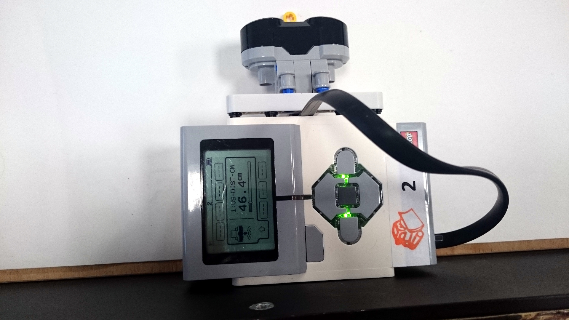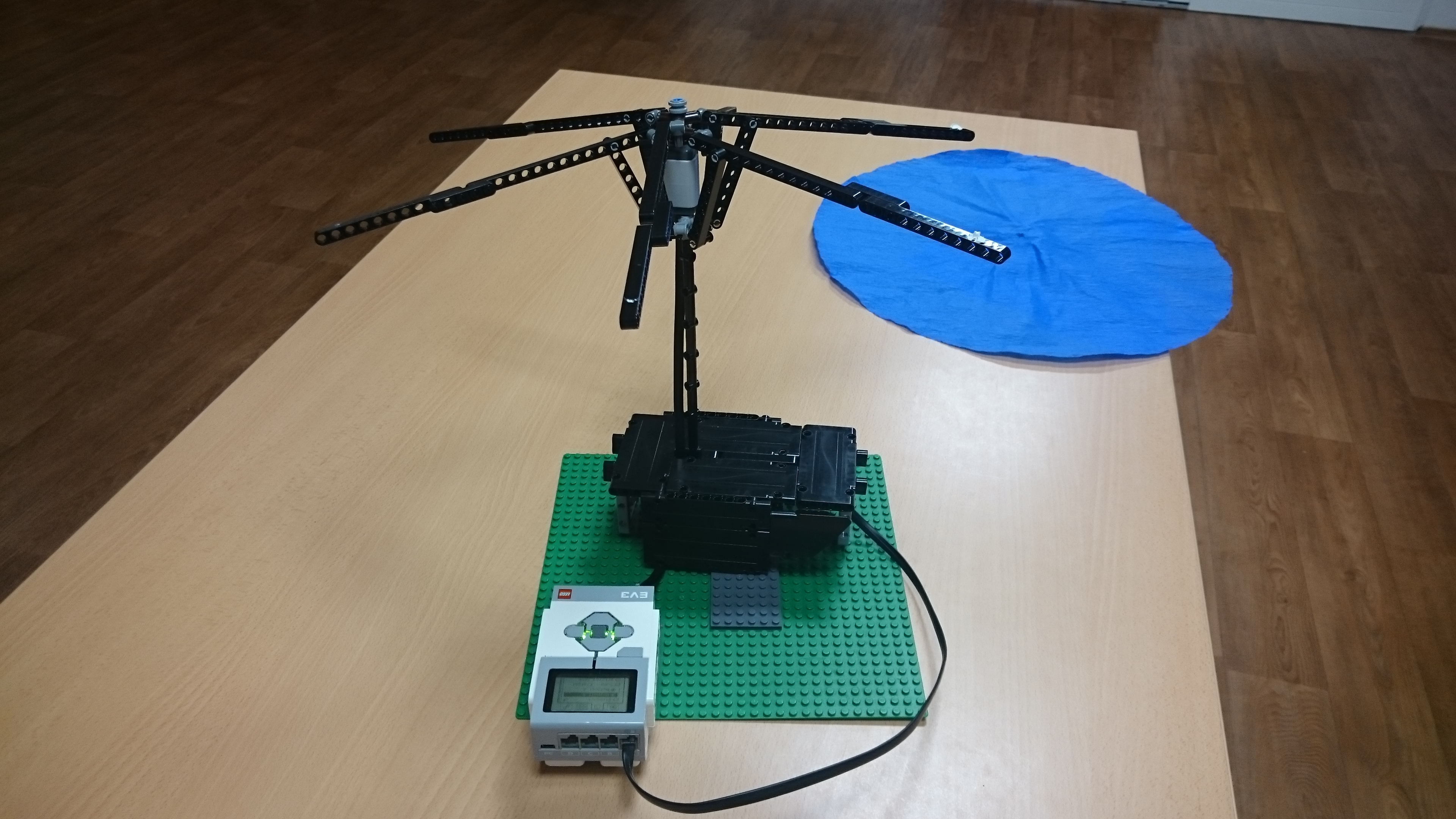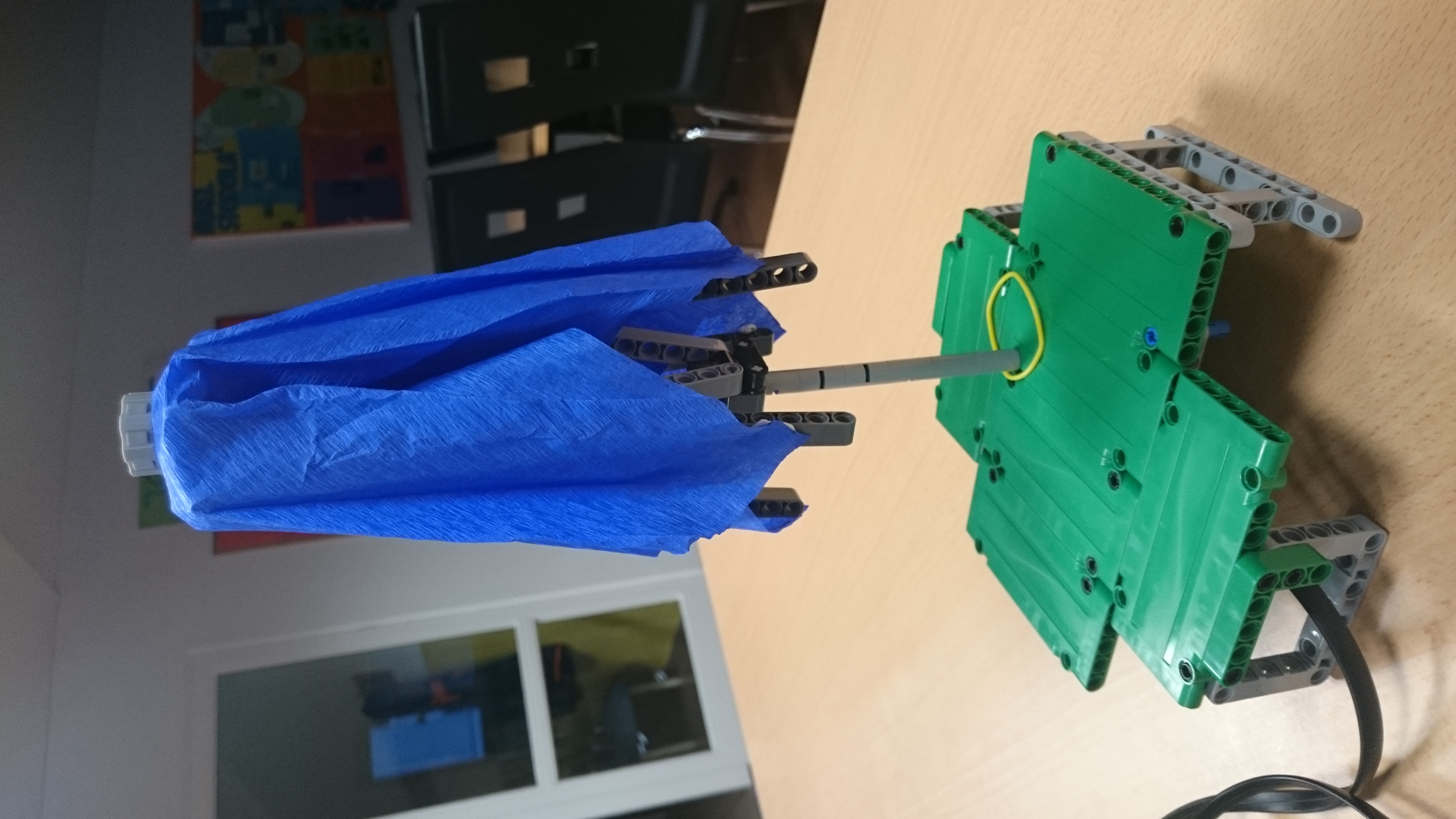 Možnosť A Slnečník V tejto možnosti má slnečník štyri pohyblivé ramená napojené na vrch slnečníka, podopreté štyrmi menšími ramenami, ktoré sú vedené zo stredov ramien na posuvný kĺb, ktorý sa posúva po tyči pomocou šnúrky, ktorá je ku nemu priviazaná. Šnúrka vedie od posuvného kĺbu na vrch slnečníka cez celú stojanovú tyč až do podstavca kde končí namotaná na zmotorizovanej cievke. Senzor: Namiesto senzoru som použil slnečný kolektor zapojený do Energymeter-u, ktorý je zapojený ako senzor do EV3 riadiacej jednotky. Slnečný kolektor sníma jas svetla a energymeter určí vo Voltoch koľko energie kolektor vytvára a tieto údaje posiela riadiacej jednotke, ktorá potom už len otočí motorom. Ale pretože po zasvietení svetla sa slnečný kolektor musí najprv zahriať, sa slnečník otvára a zatvára s menším oneskorením. Slnečník Možnosť B Náš druhý slnečník samozrejme tiež funguje na princípe radiálnych ramien, ale má ich 6. Otvára a zatvára sa pohybom jeho vrchnej časti nahor a nadol, ktorou pohybuje tak, že M-motorom zaťahuje alebo vytláča kábel zapojený do svetelného senzoru z podstavy. Tieniacu plochu má ako aj naše prvé riešenie z modrého krepového papiera, v jej strede má malý otvor, cez ktorý sníma okolité svetlo NXT svetelným senzorom, ktorý je uložený v strede slnečníka. Ultrazvuk Najprv sme si zistili aký predmet náš senzor vidí najpresnejšie aj vo vysokej vzdialenosti, potom sme pomocou tohto predmetu zisťovali tvar ultrazvukového signálu senzora. Vždy sme skúšali kde maximálne môže byť položený predmet aby ho senzor dokázal zaznamenať, a miesto sme si označili. Potom sme senzor otočili o 90 stupňov a zopakovali sme to, aby sme poznali aj výšku ultrazvukového signálu. Nakoniec sme zistili že má viac-menej nepravidelný tvar, ale asi najviac sa to podobá na kužeľ. Zistili sme že aby bol predmet zaznamenateľný naším ultrazvukovým senzorom, buď musí byť asi 2-3cm široký alebo musí byť v pohybe. Pokúšali sme sa postaviť aj robota, ktorý by ultrazvukový signál senzora dokázal zakresliť, ale nebol dostatočne presný, nemali sme dostatok času a navyše mu nepísalo pero, takže vám posielame len čiastočné riešenie s robotom. Údaje si posielali ce bluetooth.