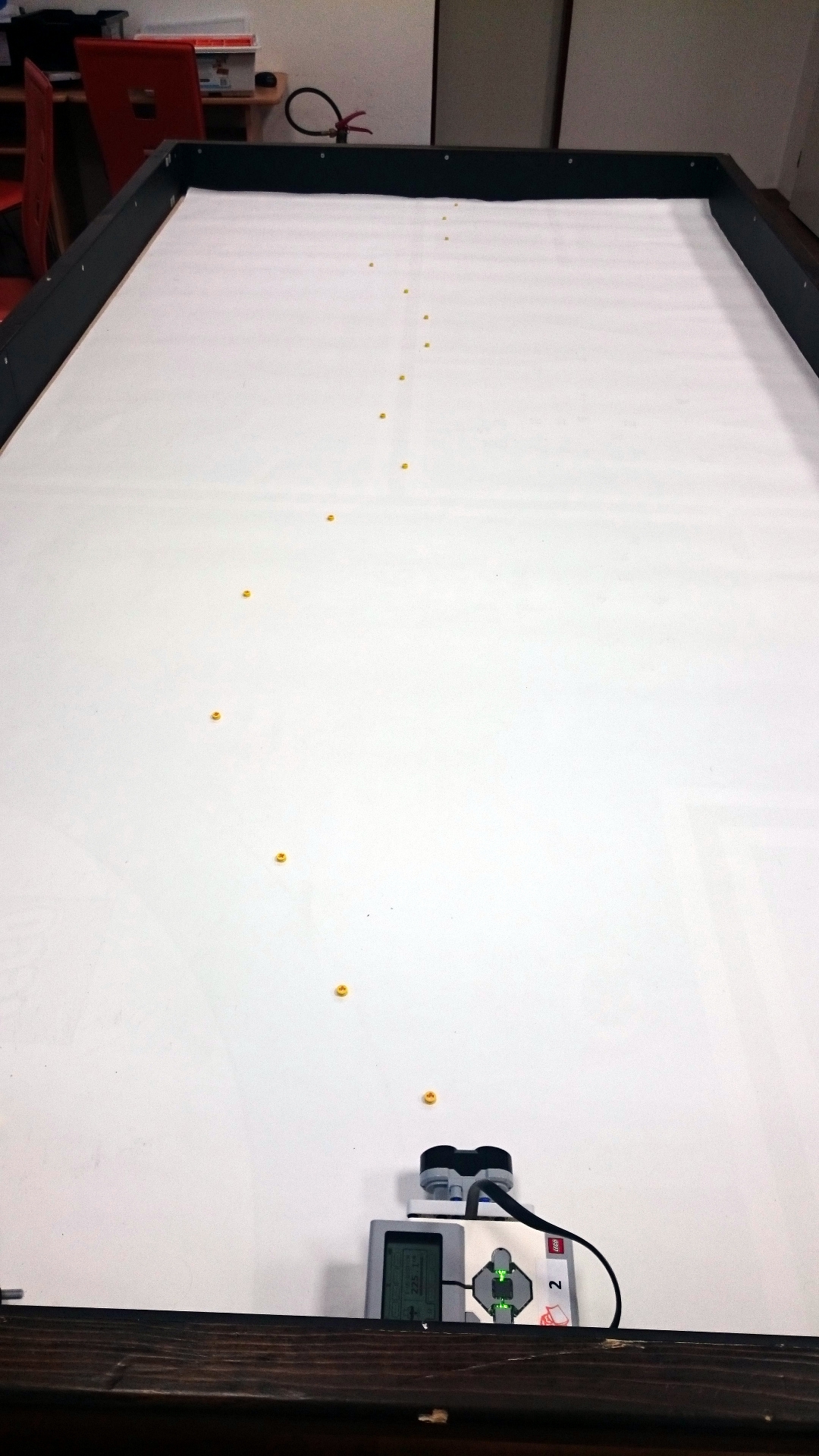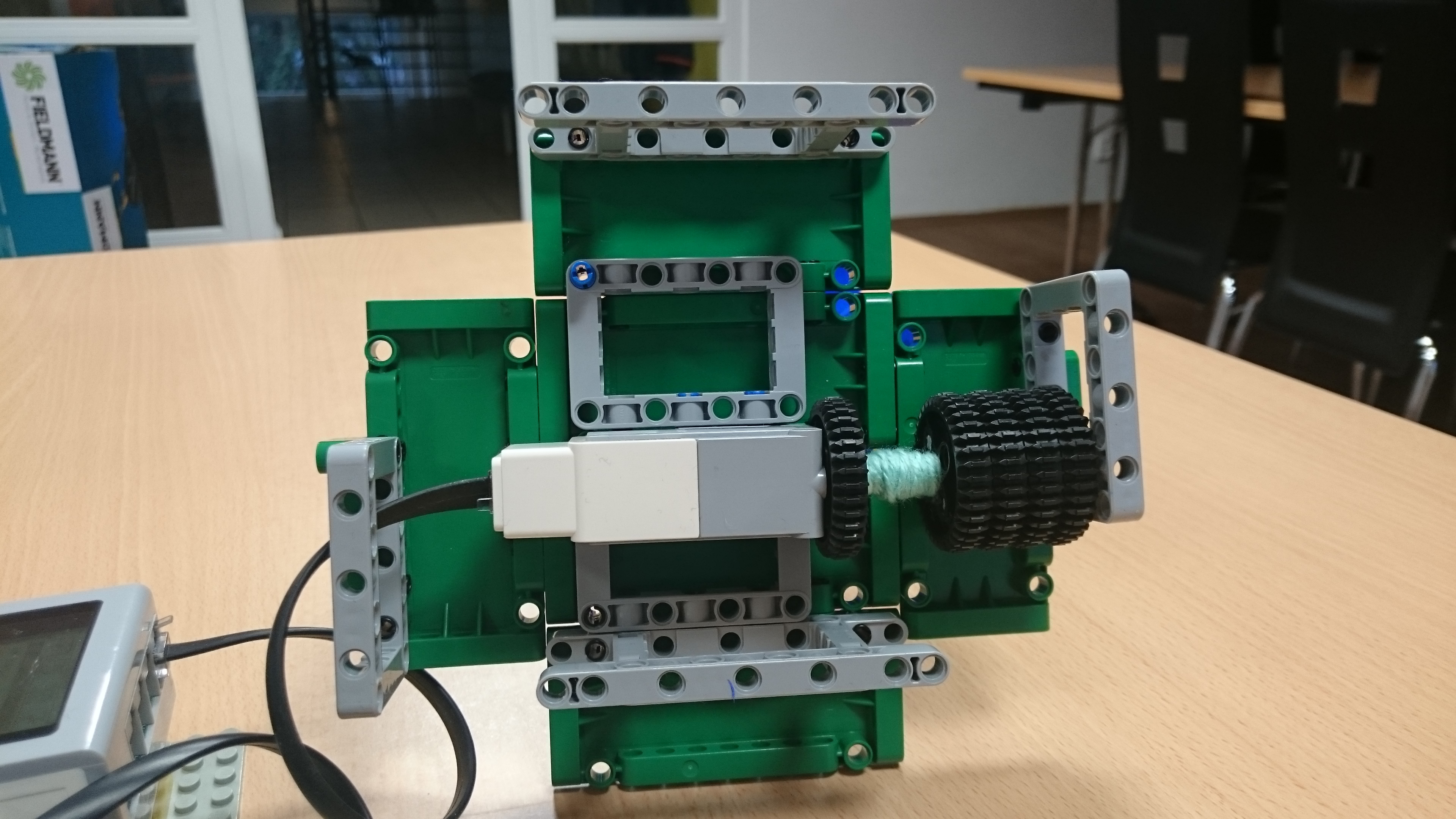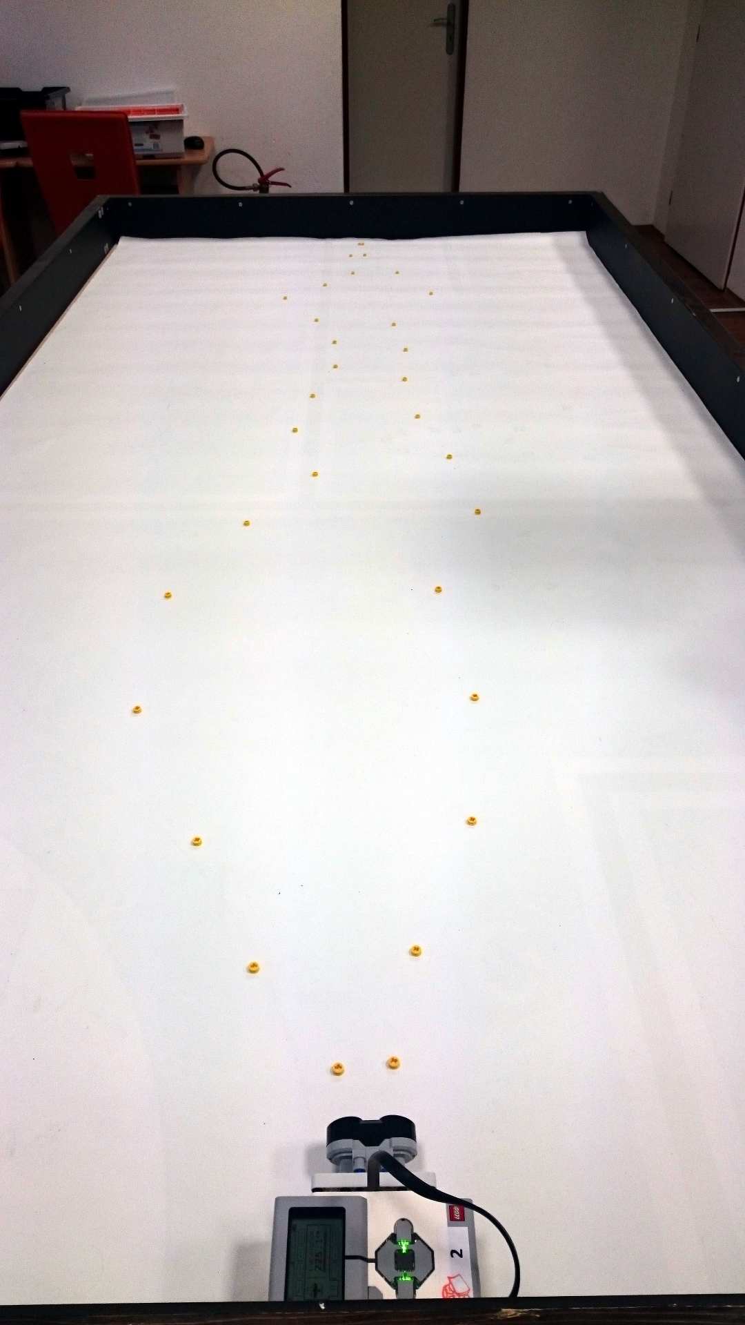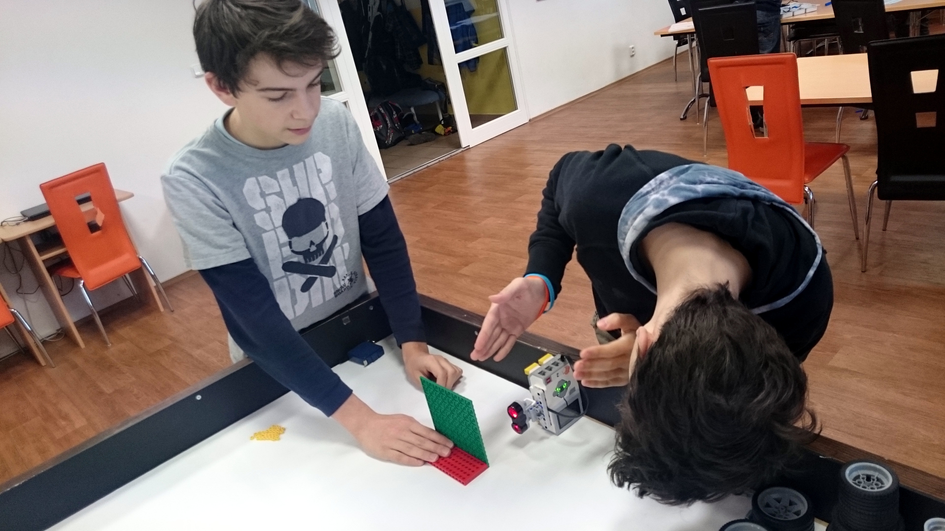 Možnosť A Slnečník V tejto možnosti má slnečník štyri pohyblivé ramená napojené na vrch slnečníka, podopreté štyrmi menšími ramenami, ktoré sú vedené zo stredov ramien na posuvný kĺb, ktorý sa posúva po tyči pomocou šnúrky, ktorá je ku nemu priviazaná. Šnúrka vedie od posuvného kĺbu na vrch slnečníka cez celú stojanovú tyč až do podstavca kde končí namotaná na zmotorizovanej cievke. Senzor: Namiesto senzoru som použil slnečný kolektor zapojený do Energymeter-u, ktorý je zapojený ako senzor do EV3 riadiacej jednotky. Slnečný kolektor sníma jas svetla a energymeter určí vo Voltoch koľko energie kolektor vytvára a tieto údaje posiela riadiacej jednotke, ktorá potom už len otočí motorom. Ale pretože po zasvietení svetla sa slnečný kolektor musí najprv zahriať, sa slnečník otvára a zatvára s menším oneskorením. Slnečník Možnosť B Náš druhý slnečník samozrejme tiež funguje na princípe radiálnych ramien, ale má ich 6. Otvára a zatvára sa pohybom jeho vrchnej časti nahor a nadol, ktorou pohybuje tak, že M-motorom zaťahuje alebo vytláča kábel zapojený do svetelného senzoru z podstavy. Tieniacu plochu má ako aj naše prvé riešenie z modrého krepového papiera, v jej strede má malý otvor, cez ktorý sníma okolité svetlo NXT svetelným senzorom, ktorý je uložený v strede slnečníka. Ultrazvuk Najprv sme si zistili aký predmet náš senzor vidí najpresnejšie aj vo vysokej vzdialenosti, potom sme pomocou tohto predmetu zisťovali tvar ultrazvukového signálu senzora. Vždy sme skúšali kde maximálne môže byť položený predmet aby ho senzor dokázal zaznamenať, a miesto sme si označili. Potom sme senzor otočili o 90 stupňov a zopakovali sme to, aby sme poznali aj výšku ultrazvukového signálu. Nakoniec sme zistili že má viac-menej nepravidelný tvar, ale asi najviac sa to podobá na kužeľ. Zistili sme že aby bol predmet zaznamenateľný naším ultrazvukovým senzorom, buď musí byť asi 2-3cm široký alebo musí byť v pohybe. Pokúšali sme sa postaviť aj robota, ktorý by ultrazvukový signál senzora dokázal zakresliť, ale nebol dostatočne presný, nemali sme dostatok času a navyše mu nepísalo pero, takže vám posielame len čiastočné riešenie s robotom. Údaje si posielali ce bluetooth.