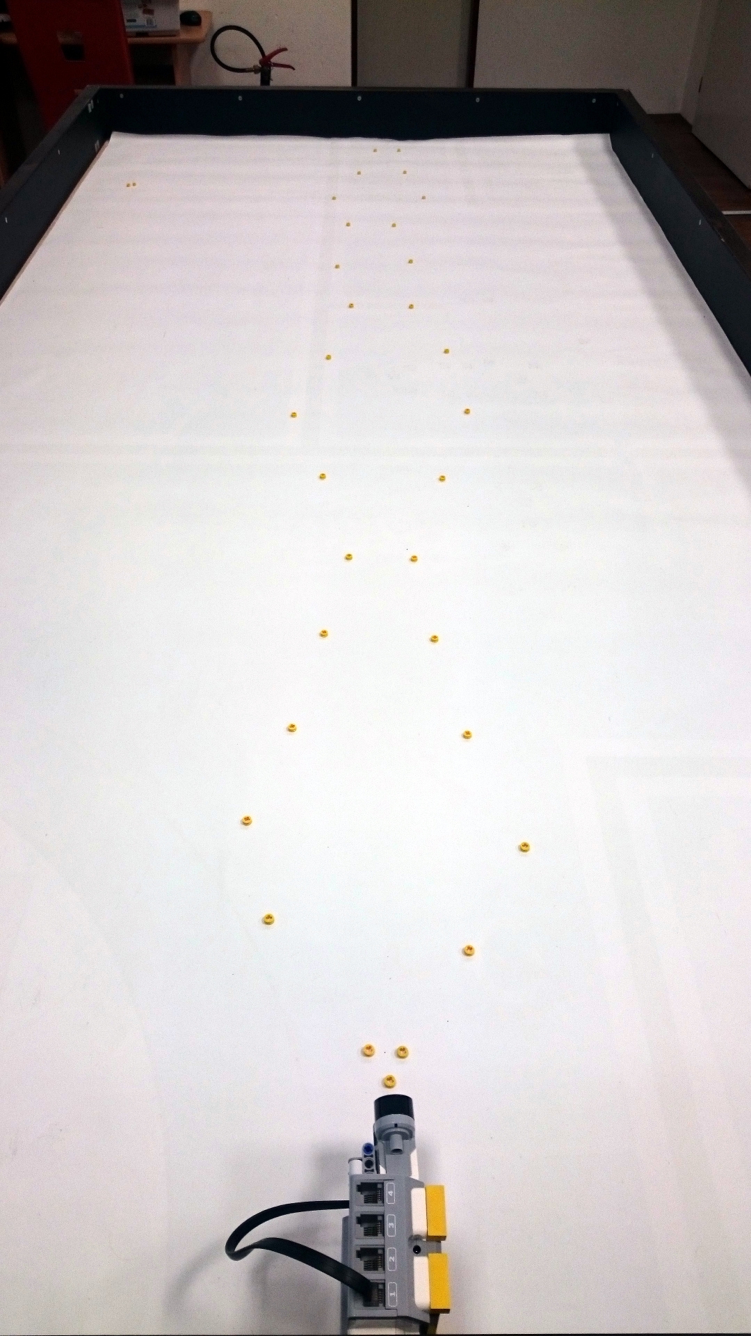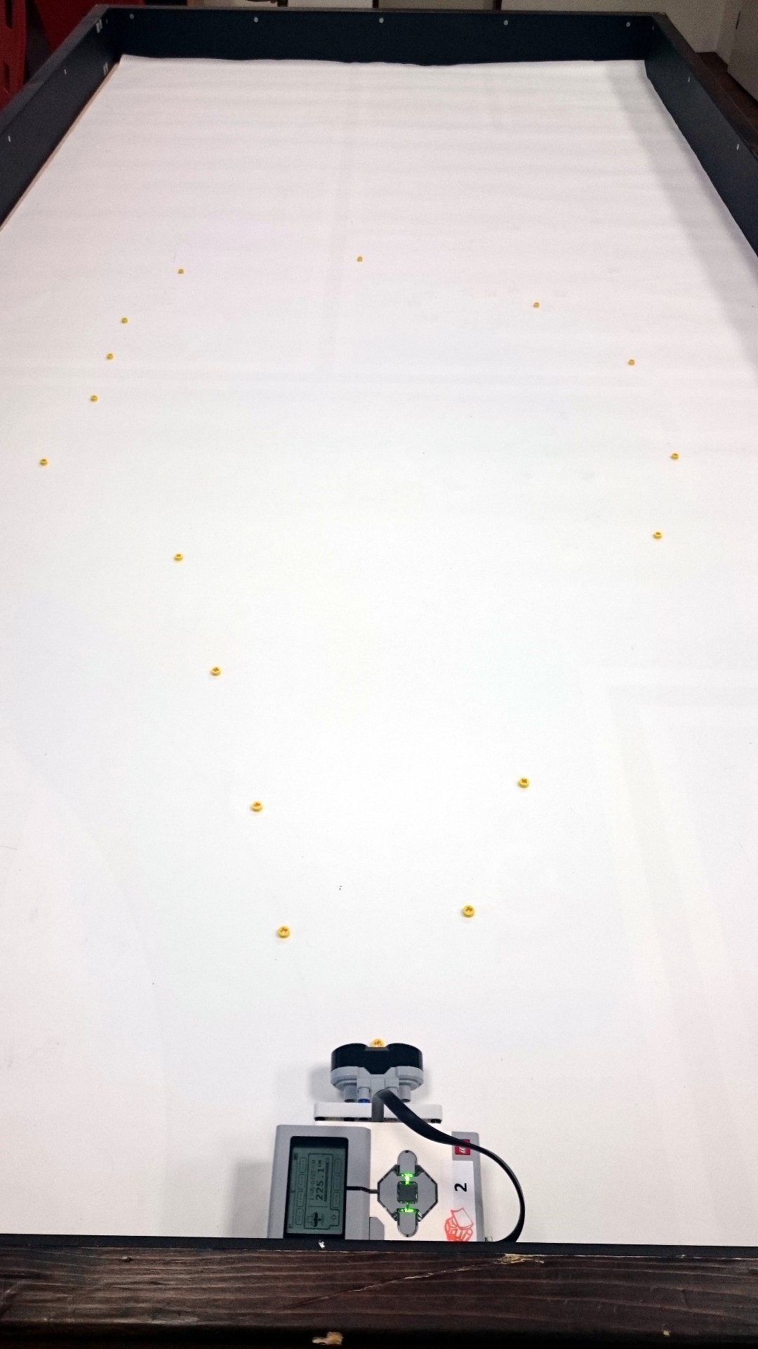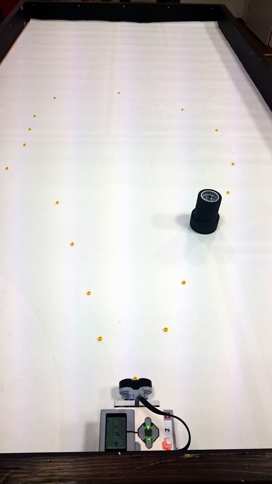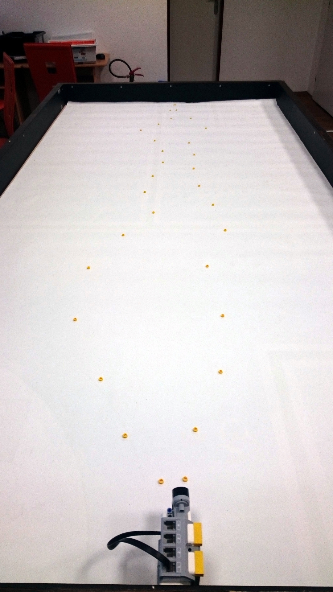 Možnosť A Slnečník V tejto možnosti má slnečník štyri pohyblivé ramená napojené na vrch slnečníka, podopreté štyrmi menšími ramenami, ktoré sú vedené zo stredov ramien na posuvný kĺb, ktorý sa posúva po tyči pomocou šnúrky, ktorá je ku nemu priviazaná. Šnúrka vedie od posuvného kĺbu na vrch slnečníka cez celú stojanovú tyč až do podstavca kde končí namotaná na zmotorizovanej cievke. Senzor: Namiesto senzoru som použil slnečný kolektor zapojený do Energymeter-u, ktorý je zapojený ako senzor do EV3 riadiacej jednotky. Slnečný kolektor sníma jas svetla a energymeter určí vo Voltoch koľko energie kolektor vytvára a tieto údaje posiela riadiacej jednotke, ktorá potom už len otočí motorom. Ale pretože po zasvietení svetla sa slnečný kolektor musí najprv zahriať, sa slnečník otvára a zatvára s menším oneskorením. Slnečník Možnosť B Náš druhý slnečník samozrejme tiež funguje na princípe radiálnych ramien, ale má ich 6. Otvára a zatvára sa pohybom jeho vrchnej časti nahor a nadol, ktorou pohybuje tak, že M-motorom zaťahuje alebo vytláča kábel zapojený do svetelného senzoru z podstavy. Tieniacu plochu má ako aj naše prvé riešenie z modrého krepového papiera, v jej strede má malý otvor, cez ktorý sníma okolité svetlo NXT svetelným senzorom, ktorý je uložený v strede slnečníka. Ultrazvuk Najprv sme si zistili aký predmet náš senzor vidí najpresnejšie aj vo vysokej vzdialenosti, potom sme pomocou tohto predmetu zisťovali tvar ultrazvukového signálu senzora. Vždy sme skúšali kde maximálne môže byť položený predmet aby ho senzor dokázal zaznamenať, a miesto sme si označili. Potom sme senzor otočili o 90 stupňov a zopakovali sme to, aby sme poznali aj výšku ultrazvukového signálu. Nakoniec sme zistili že má viac-menej nepravidelný tvar, ale asi najviac sa to podobá na kužeľ. Zistili sme že aby bol predmet zaznamenateľný naším ultrazvukovým senzorom, buď musí byť asi 2-3cm široký alebo musí byť v pohybe. Pokúšali sme sa postaviť aj robota, ktorý by ultrazvukový signál senzora dokázal zakresliť, ale nebol dostatočne presný, nemali sme dostatok času a navyše mu nepísalo pero, takže vám posielame len čiastočné riešenie s robotom. Údaje si posielali ce bluetooth.