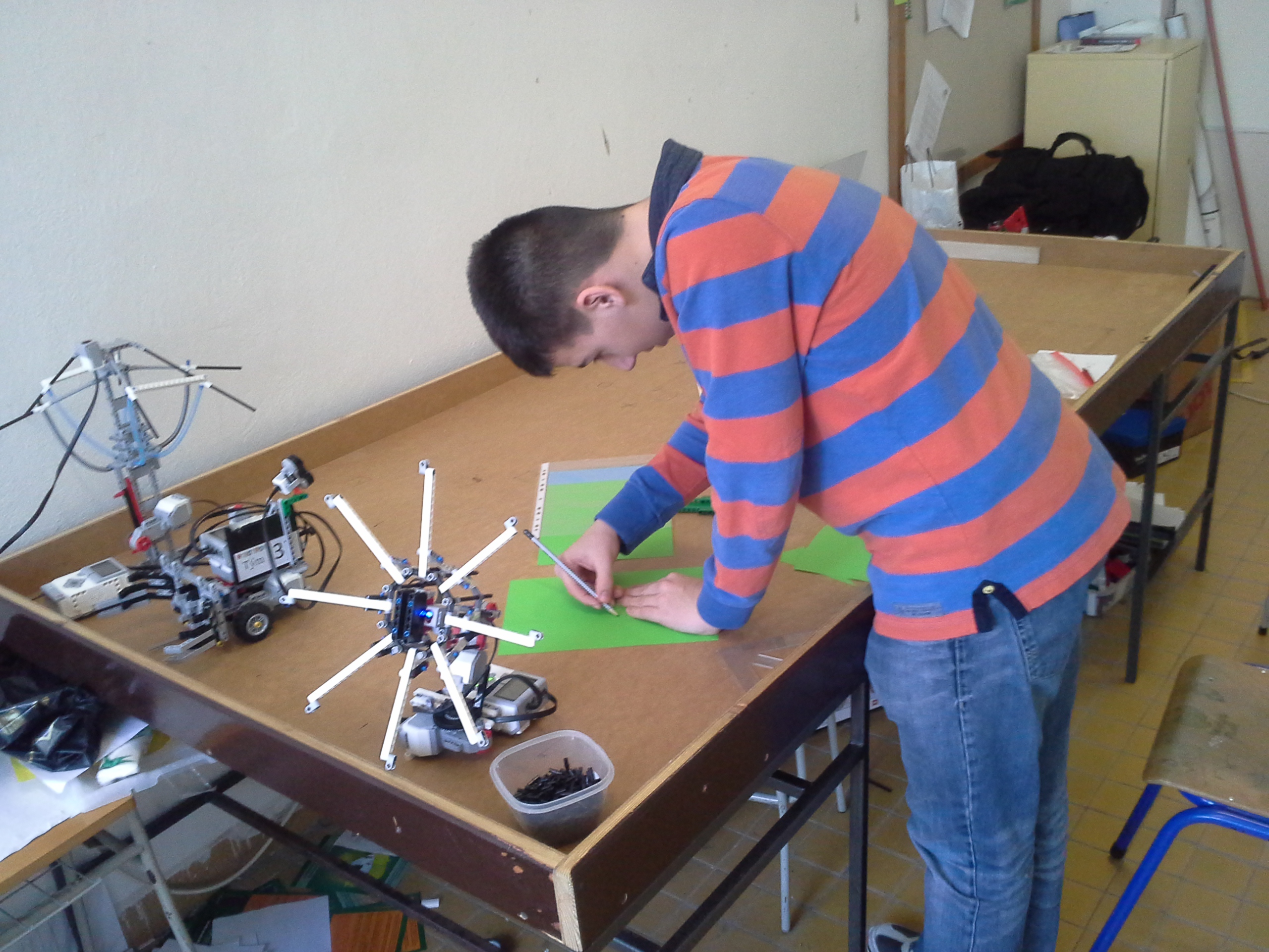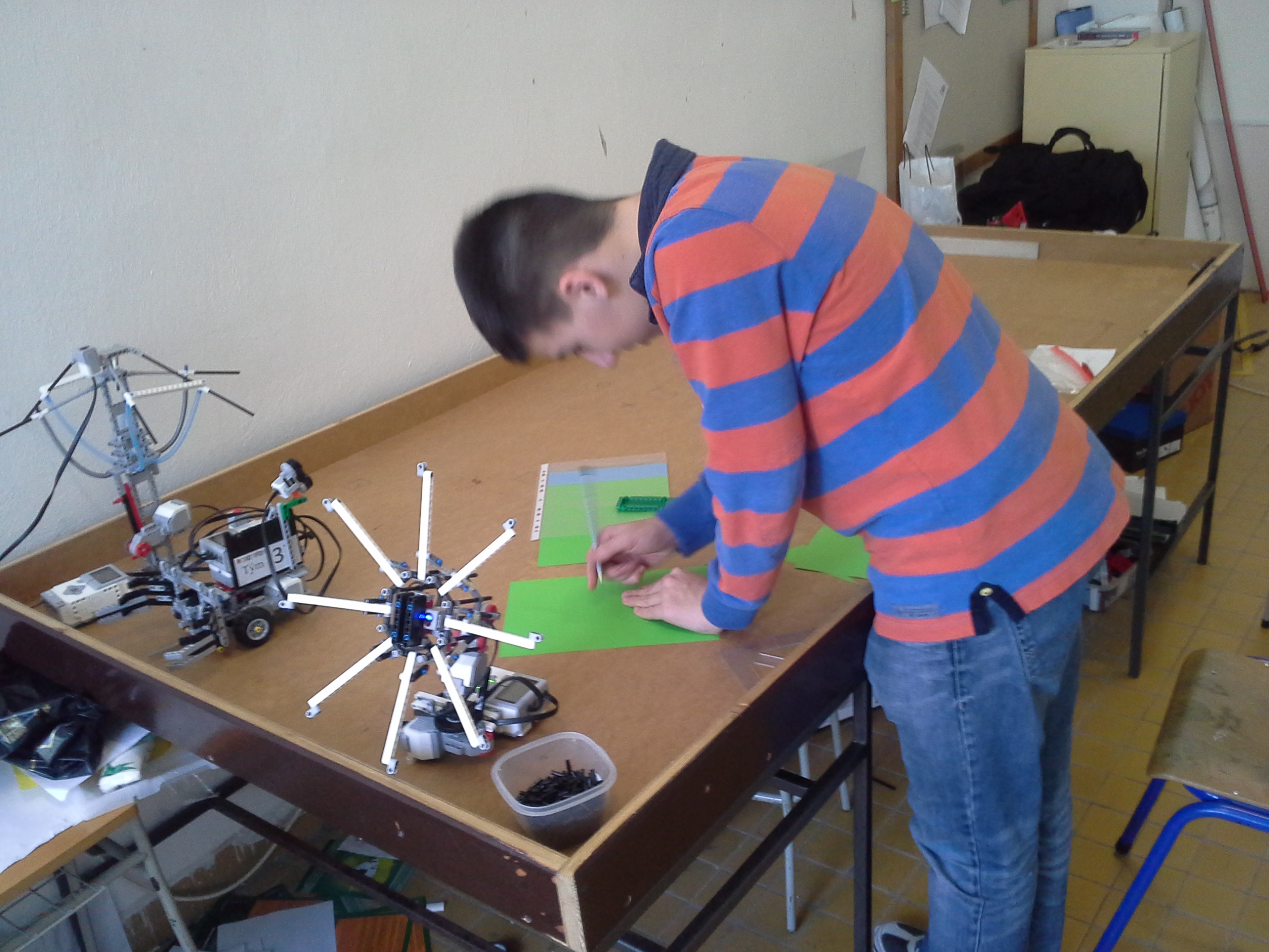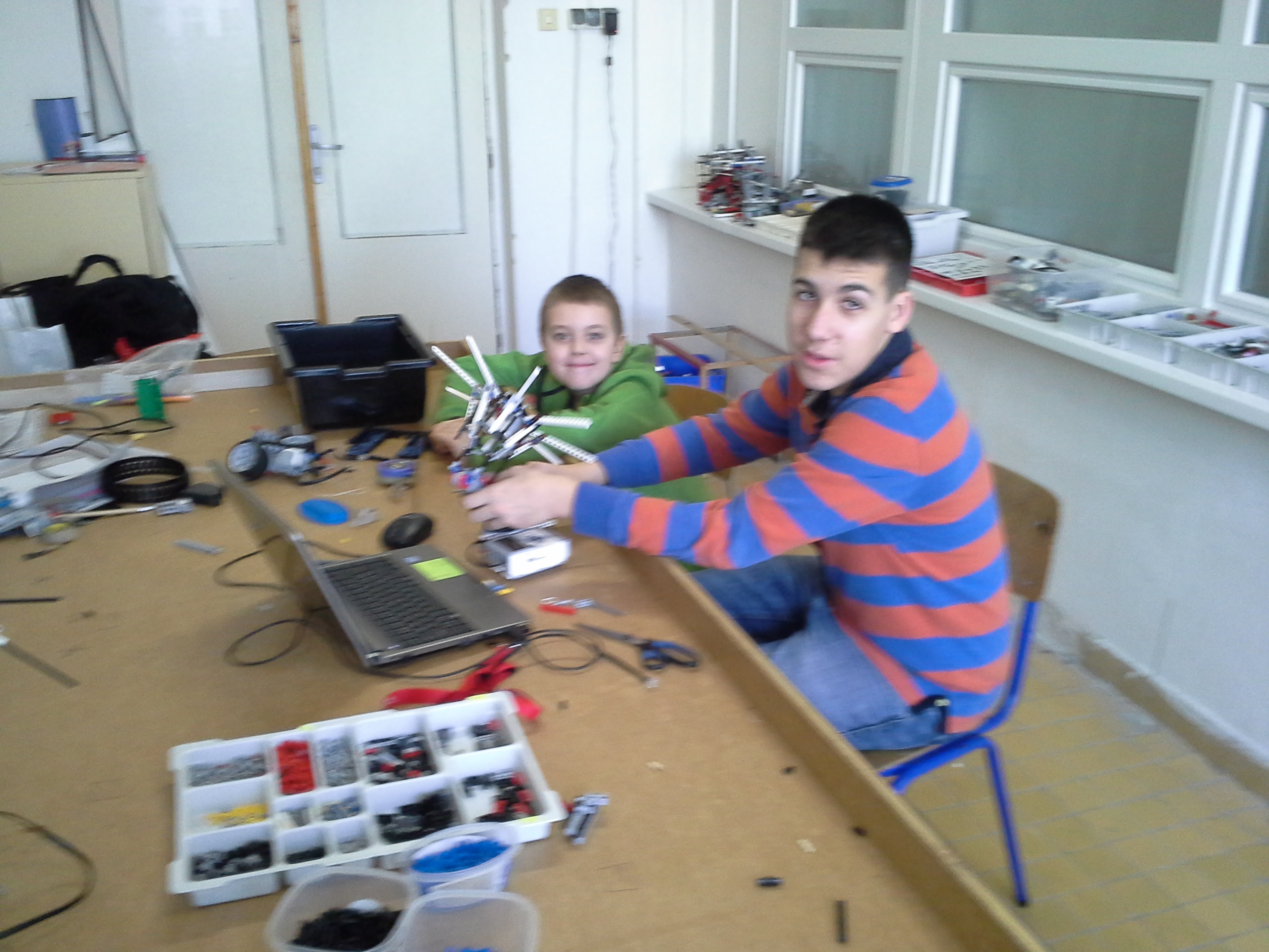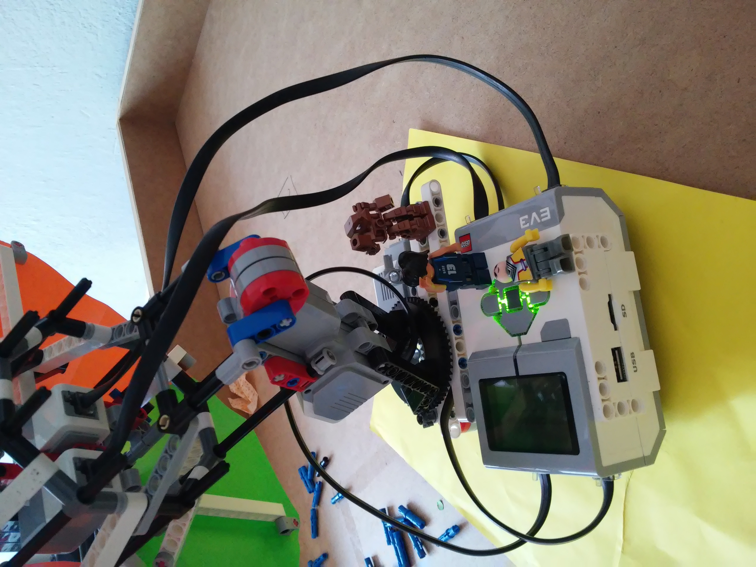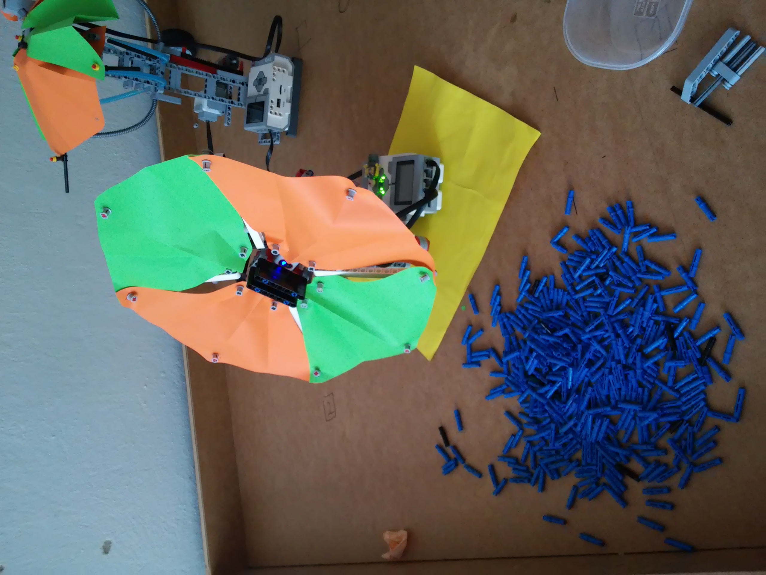 1.Rozhodli sme sa postaviť dvoch robotov č.1 a č.2. Robot č. 1 fungoval na princípe jedného motora a jedného color sensora. Fungoval pomocou jedného ozubeného kolieska a lišty, viac podrobností môžete vidieť na videu. Robot č.2 funguje na princípe dvoch motorov a dvoch color sensorov. Jeden motor má na starosti otváranie a druhý otáčanie. Otáčanie pomocou color sensorov funguje tak, že robot sa otáča dovtedy, kým sa obidve hodnoty sensorov nezhodujú. 2.Otestovali sme ultrazvukový sensor a zistili sme, že jeho rozpätie ide do tvaru kužela a tak je to smerom hore aj dole. Sensor dokáže zachytiť objekt o veľkosti napr. aj čajovej sviečky ale aj človeka. A program sme nepoužili.