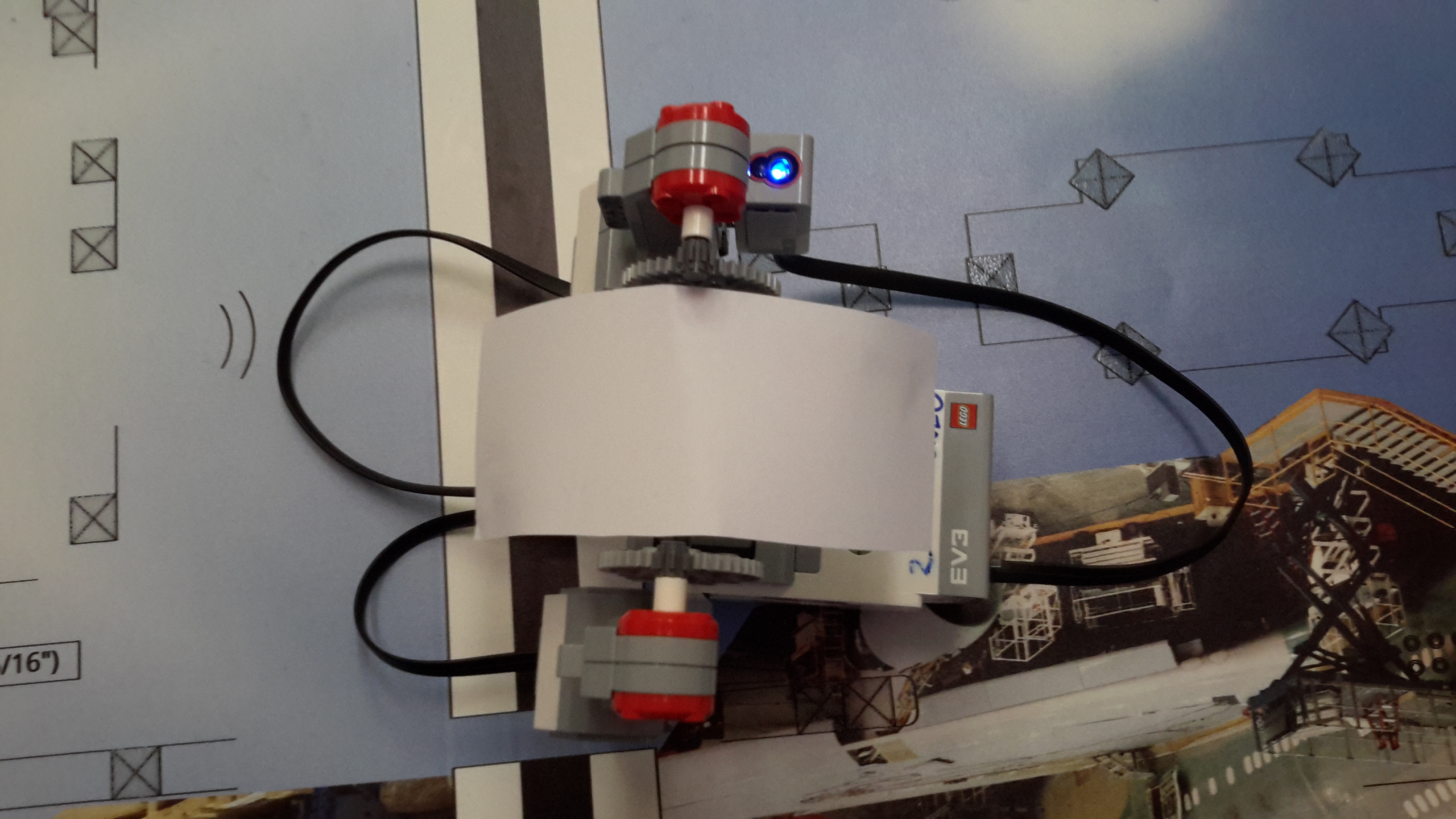 Robot má 2 stredné motory, ktoré sa pohybujú naraz do 2 opačných smerov, tým otvárajú a zatvárajú slnečník. Farebný senzor v pravidelných časových intervaloch meria intenzitu svetla. Program zapisuje do „kufríku“, či je slnečník otvorený alebo zatvorený a podľa nameranej intenzity svetla a podľa toho sa otvára a zatvára. 1. Ak je v kufríku zapísané, že je slnečník otvorený a zhasneme svetlo, slnečník sa zatvorí a zapíšeme to do kufríka. 2. Ak je v kufríku zapísané, že je slnečník zatvorený a zasvietime svetlo, slnečník sa otvorí a zapíšeme to do kufríka. 3. + 4. Ak je v kufríku, že je slnečník otvorený a slnečník je otvorený a je dostatok svetla, slnečník sa nezačne otvárať. To isté platí aj v opačnom prípade.