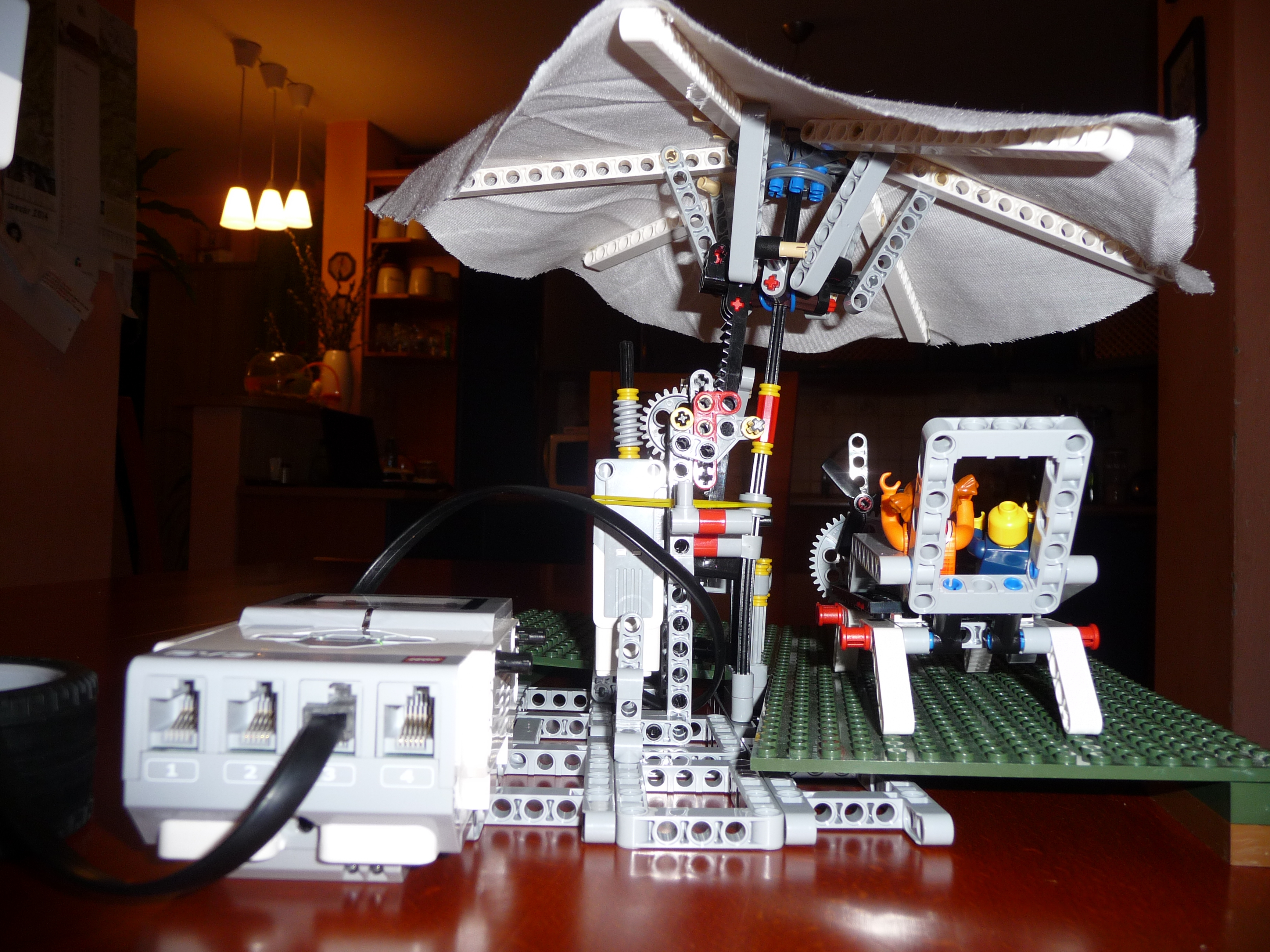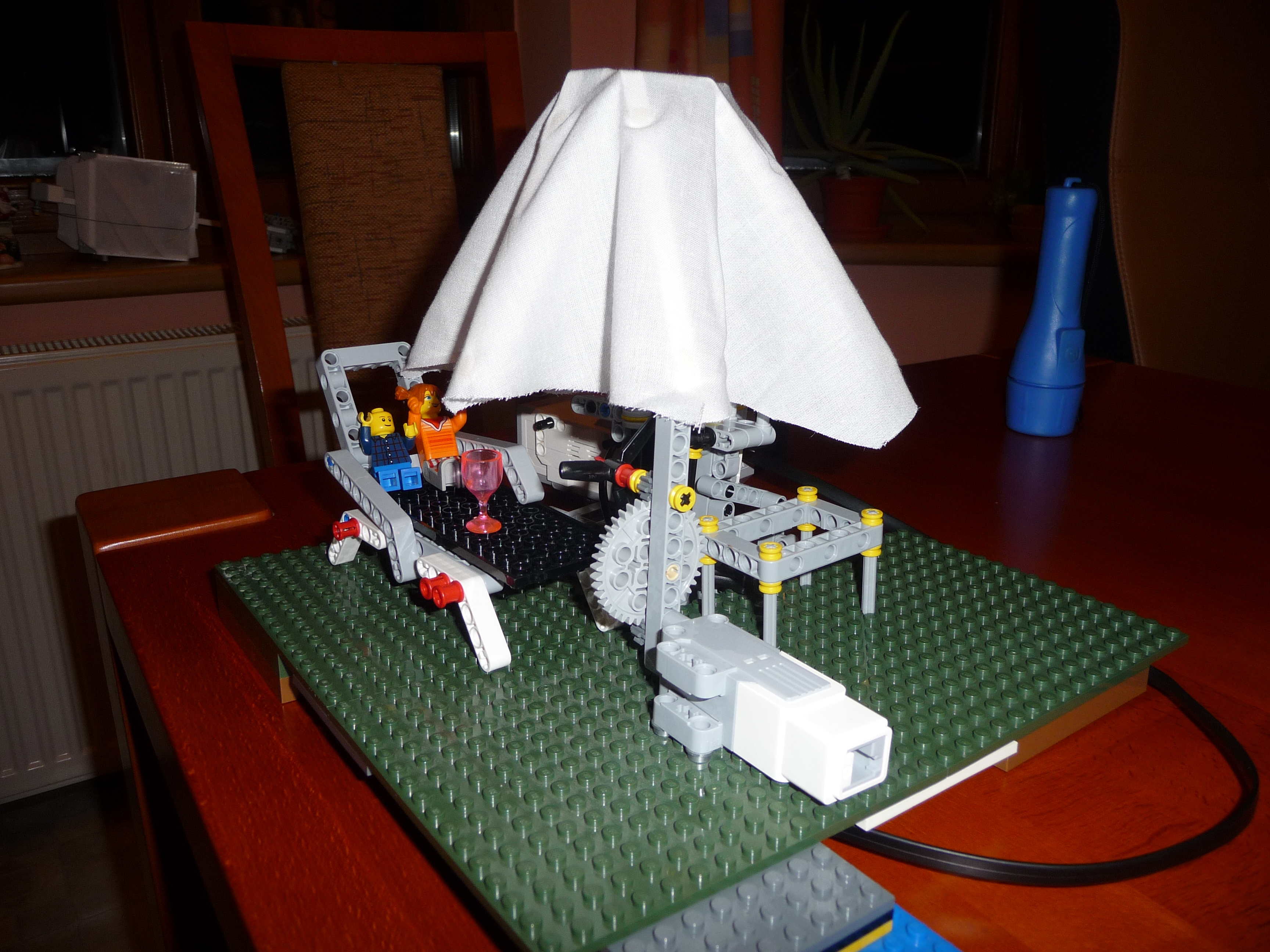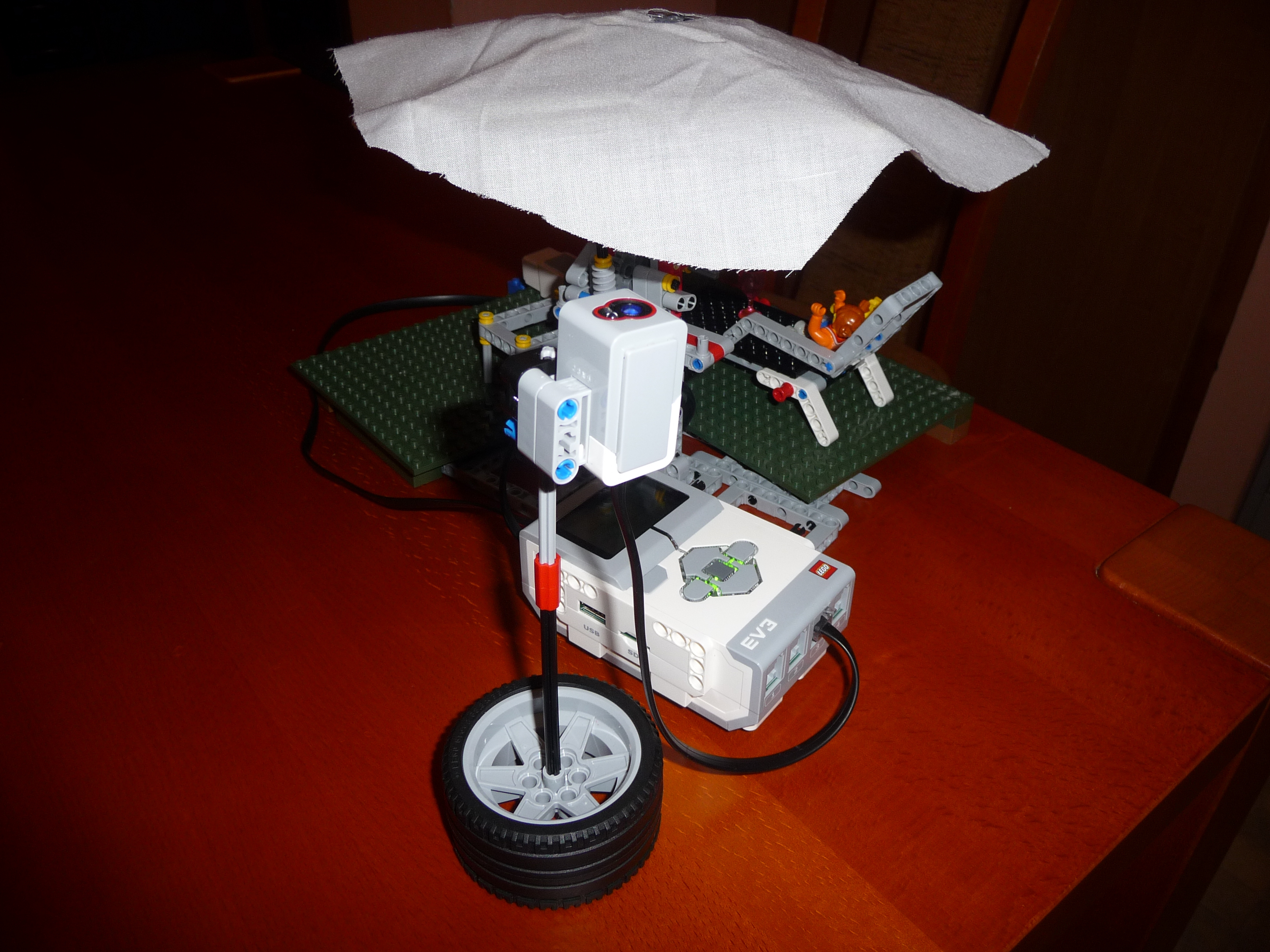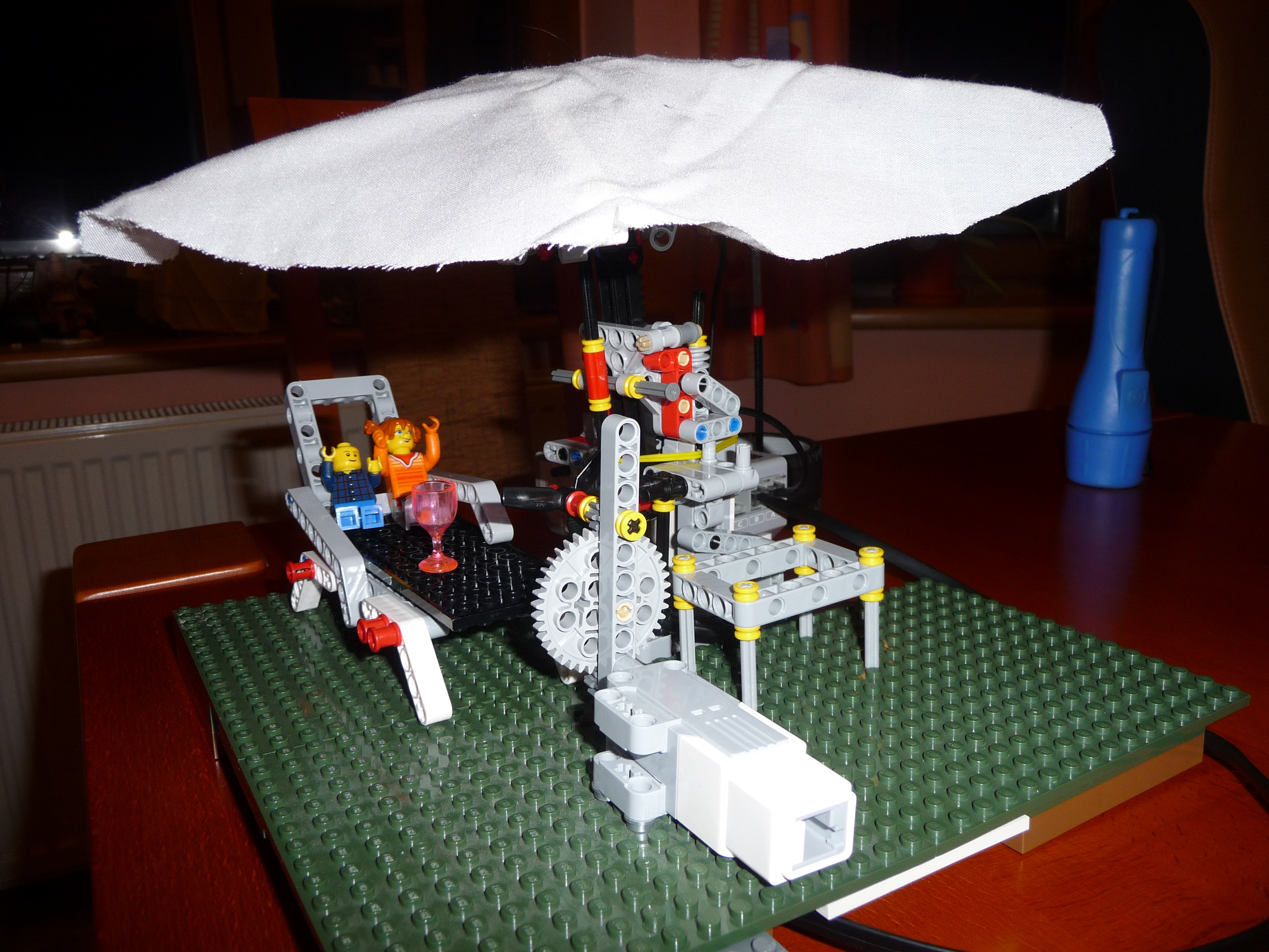 Slnecnik: Prvy model slnecnika sme postavili zlozito so siestimi pohyblivymi ramenami a s krycou plochou navrchu. Model funguje podobne ako dazdnik, pohybom strednej casti hore a dole sa ramena zdvihaju a slnecnik sa otvara a zatvara. K tejto pohyblivej casti je pripojeny hreben a maly motor so snekom. Motor je ulozeny zvislo aby zaberal menej miesta pod slnecnikom. Ku kocke je este pripojemy druhy motor s vrtulou aby dovolenkari mali aj cerstvy vanok z ventilatora a meteorologicka stanica - snimac farby, ktory reaguje na slnecne osvetlenie. Pomocou snimaca sa slnecnik otvara ked je vela slnka a vytvori tak tien pre dovolenkarov a tiez sa zatvara ked slnko zajde za oblaky. Druhy slnecnik je trochu jednoduchsi, ma dve krycie plochy, ktore sa dvihaju a sklapaju za pomoci snurok, ktore su navinute na bubon, ktory je pripojeny k motoru. Slnecnik sa tak otvara a zatvara za pomoci snimaca farby, ktory reaguje na slnecne osvetlenie. Treti model slnecnika je odvodeny z prveho modelu. Slnecnik je napojeny priamo na motor, ten dostane pokyn zo snimaca farby, ktory reaguje na slnecne osvetlenie, roztoci cely slnecnik a za pomoci odstredivej sily sa slnecnik roztvori. Dodatocny ventilator uz nie je potrebny, tociaci sa slnecnik vytvara dostatocny vanok pre dovolenkarov.