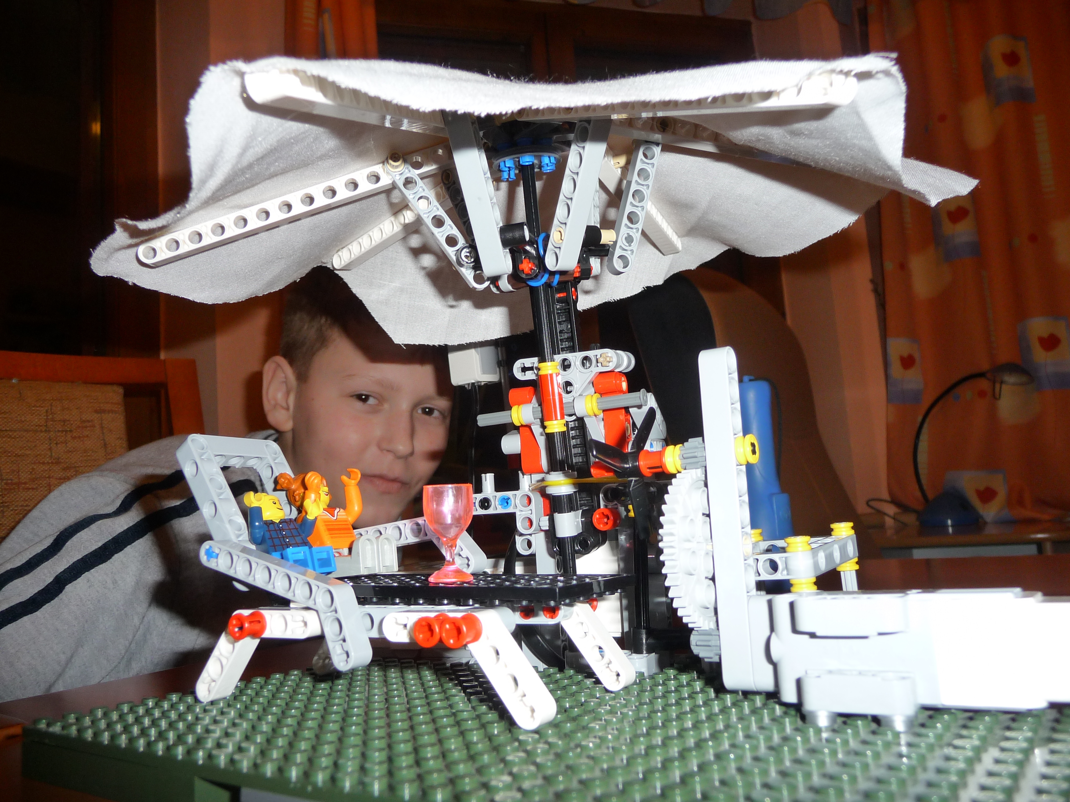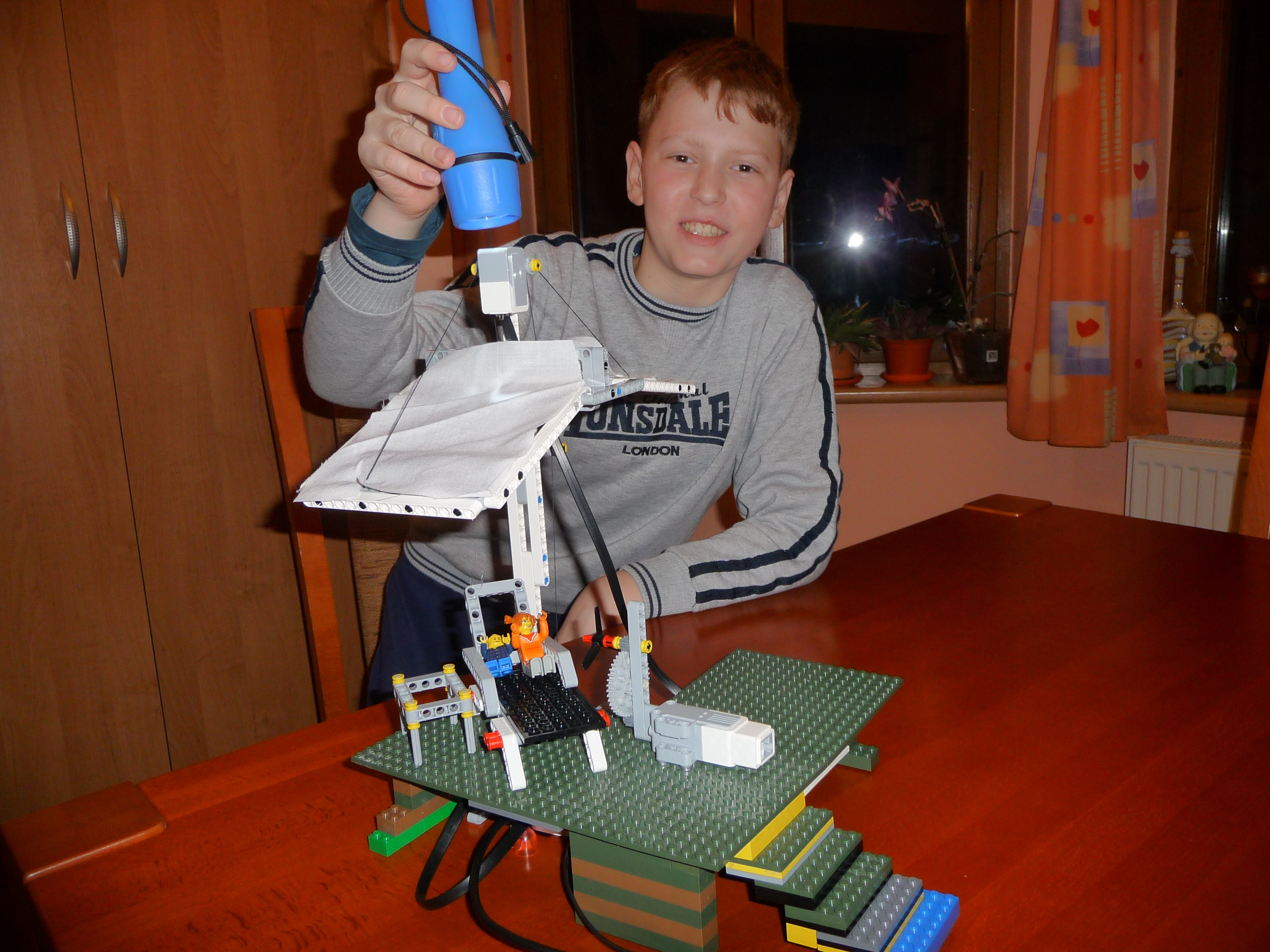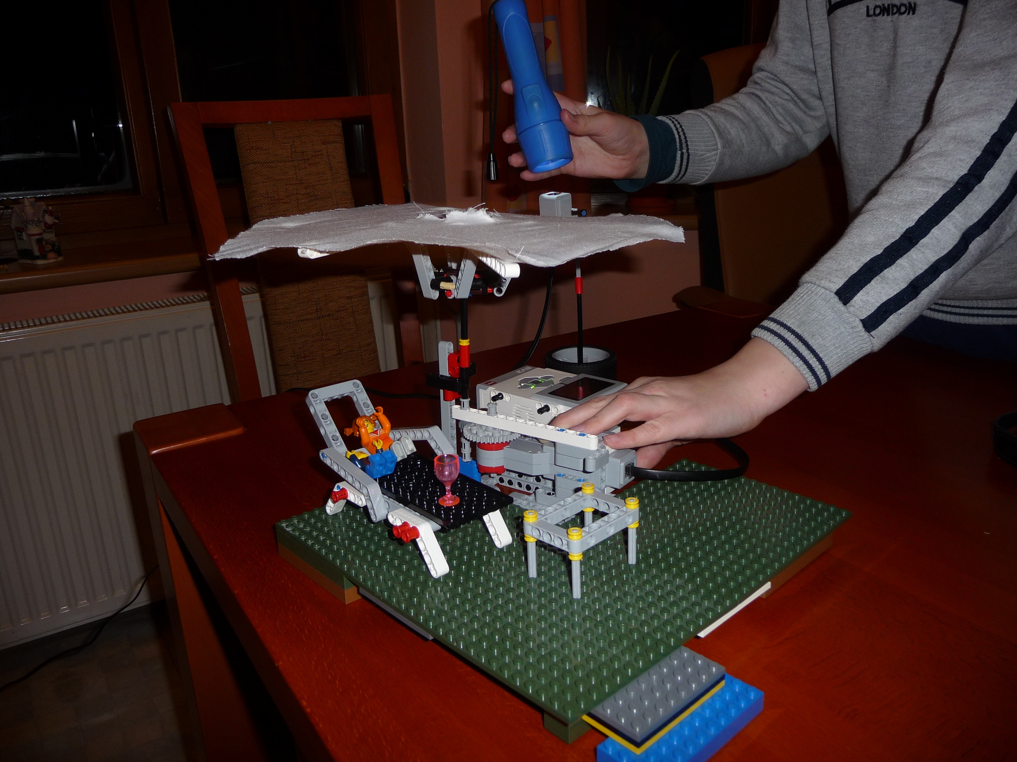 Slnecnik: Prvy model slnecnika sme postavili zlozito so siestimi pohyblivymi ramenami a s krycou plochou navrchu. Model funguje podobne ako dazdnik, pohybom strednej casti hore a dole sa ramena zdvihaju a slnecnik sa otvara a zatvara. K tejto pohyblivej casti je pripojeny hreben a maly motor so snekom. Motor je ulozeny zvislo aby zaberal menej miesta pod slnecnikom. Ku kocke je este pripojemy druhy motor s vrtulou aby dovolenkari mali aj cerstvy vanok z ventilatora a meteorologicka stanica - snimac farby, ktory reaguje na slnecne osvetlenie. Pomocou snimaca sa slnecnik otvara ked je vela slnka a vytvori tak tien pre dovolenkarov a tiez sa zatvara ked slnko zajde za oblaky. Druhy slnecnik je trochu jednoduchsi, ma dve krycie plochy, ktore sa dvihaju a sklapaju za pomoci snurok, ktore su navinute na bubon, ktory je pripojeny k motoru. Slnecnik sa tak otvara a zatvara za pomoci snimaca farby, ktory reaguje na slnecne osvetlenie. Treti model slnecnika je odvodeny z prveho modelu. Slnecnik je napojeny priamo na motor, ten dostane pokyn zo snimaca farby, ktory reaguje na slnecne osvetlenie, roztoci cely slnecnik a za pomoci odstredivej sily sa slnecnik roztvori. Dodatocny ventilator uz nie je potrebny, tociaci sa slnecnik vytvara dostatocny vanok pre dovolenkarov.