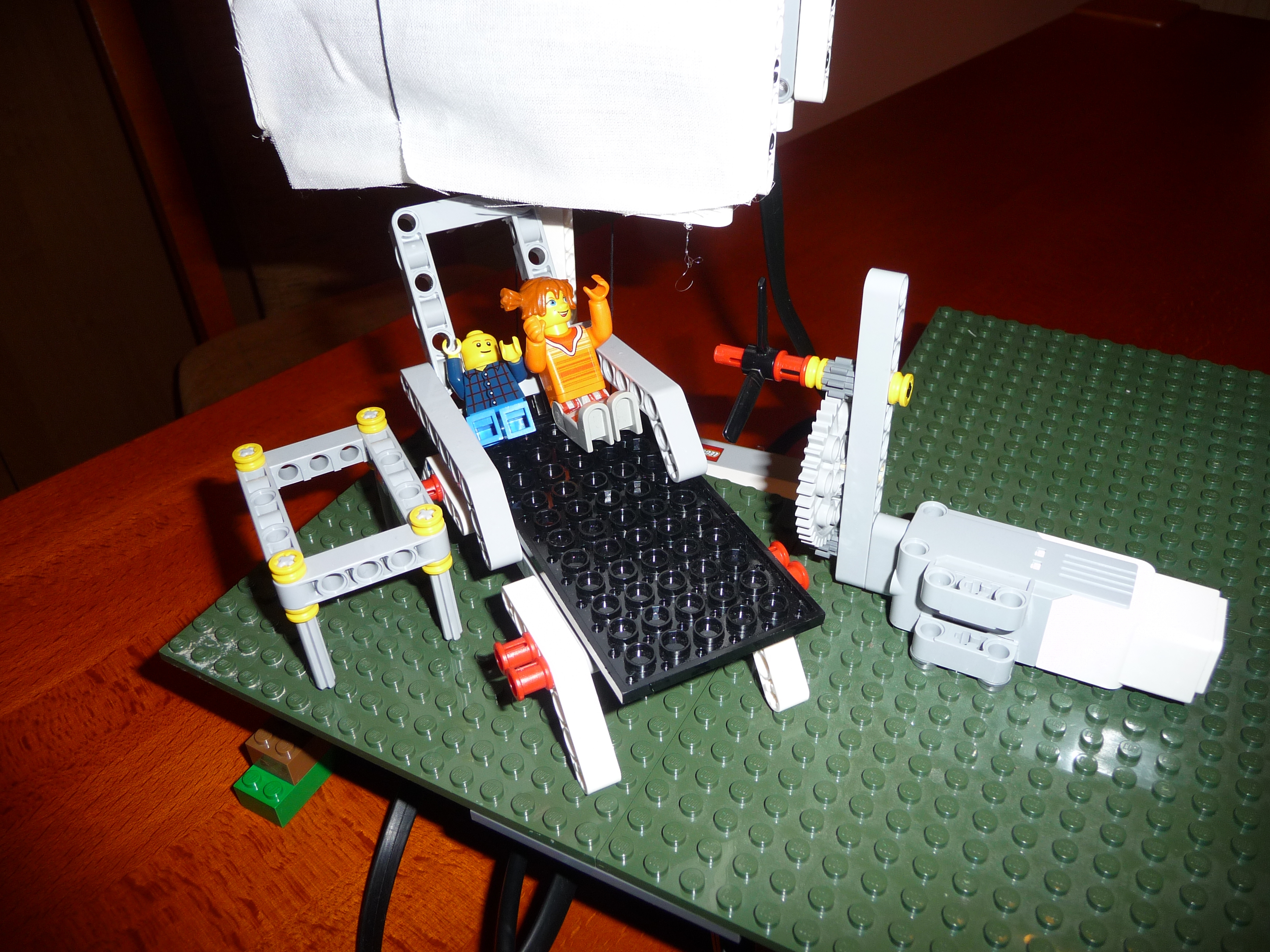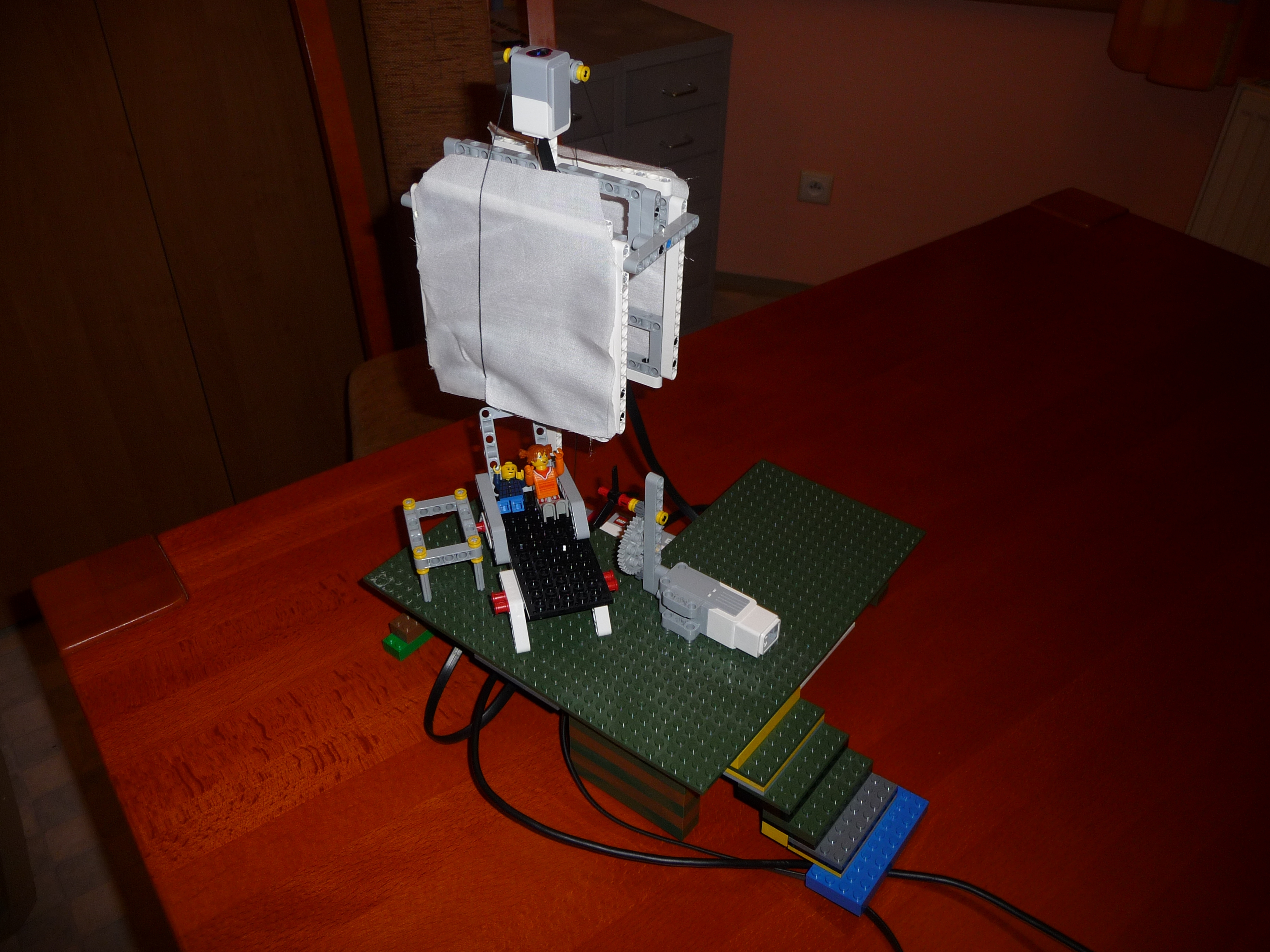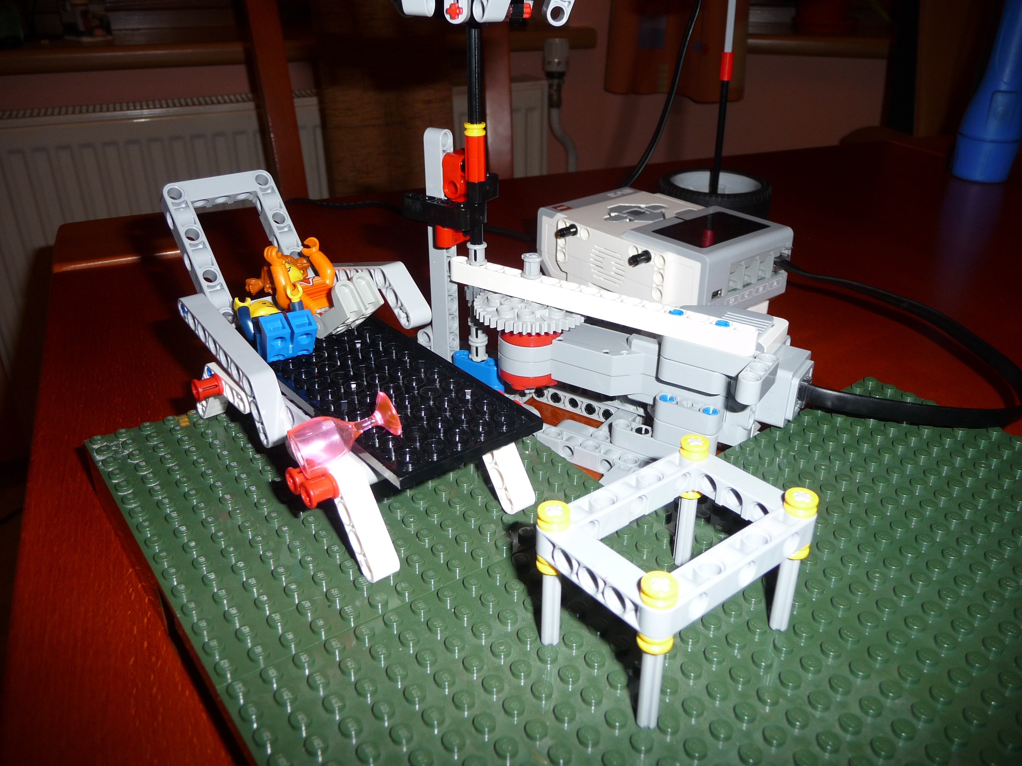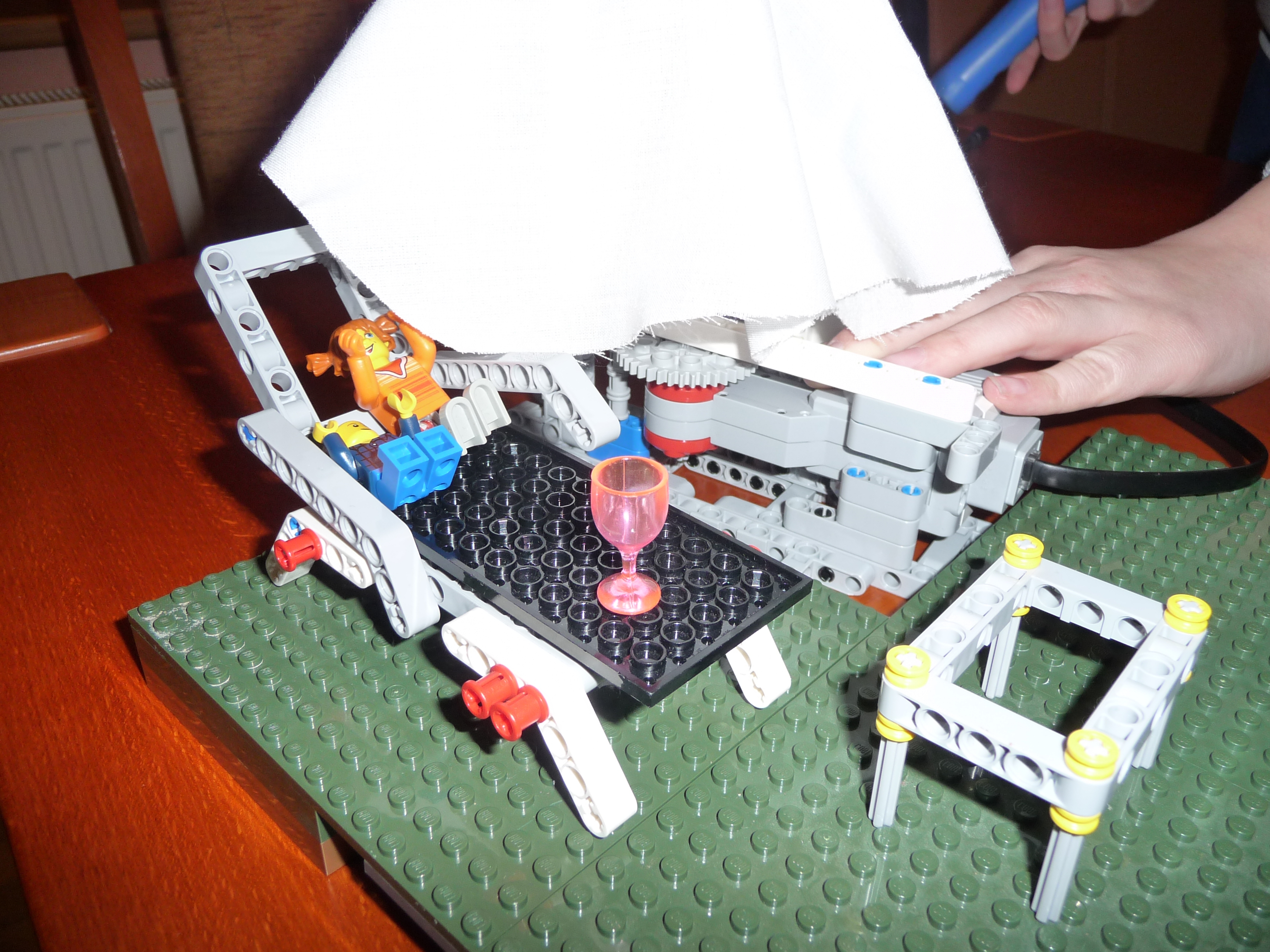 Slnecnik: Prvy model slnecnika sme postavili zlozito so siestimi pohyblivymi ramenami a s krycou plochou navrchu. Model funguje podobne ako dazdnik, pohybom strednej casti hore a dole sa ramena zdvihaju a slnecnik sa otvara a zatvara. K tejto pohyblivej casti je pripojeny hreben a maly motor so snekom. Motor je ulozeny zvislo aby zaberal menej miesta pod slnecnikom. Ku kocke je este pripojemy druhy motor s vrtulou aby dovolenkari mali aj cerstvy vanok z ventilatora a meteorologicka stanica - snimac farby, ktory reaguje na slnecne osvetlenie. Pomocou snimaca sa slnecnik otvara ked je vela slnka a vytvori tak tien pre dovolenkarov a tiez sa zatvara ked slnko zajde za oblaky. Druhy slnecnik je trochu jednoduchsi, ma dve krycie plochy, ktore sa dvihaju a sklapaju za pomoci snurok, ktore su navinute na bubon, ktory je pripojeny k motoru. Slnecnik sa tak otvara a zatvara za pomoci snimaca farby, ktory reaguje na slnecne osvetlenie. Treti model slnecnika je odvodeny z prveho modelu. Slnecnik je napojeny priamo na motor, ten dostane pokyn zo snimaca farby, ktory reaguje na slnecne osvetlenie, roztoci cely slnecnik a za pomoci odstredivej sily sa slnecnik roztvori. Dodatocny ventilator uz nie je potrebny, tociaci sa slnecnik vytvara dostatocny vanok pre dovolenkarov.