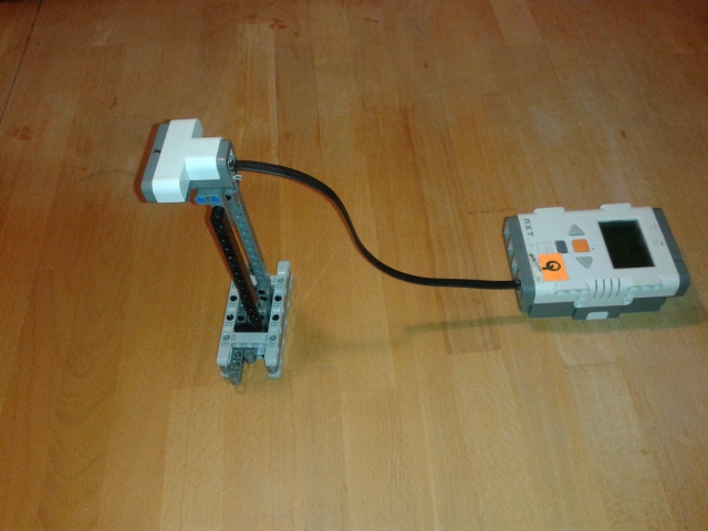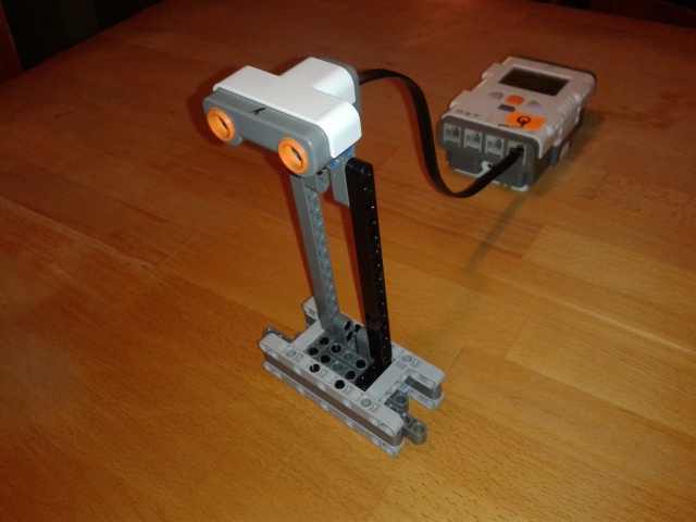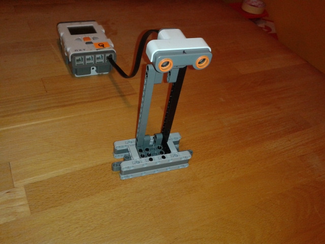 2.úloha- Na stojan sme pripevnili ultrazvukový senzor. NXT kocka je mimo modelu. Senzor je nastavený tak,aby keď niečo zaznamená vydá zvuk. Ako sme dávali knihu tak sme zistili,že má tvar kužele s vrcholom pri senzore.