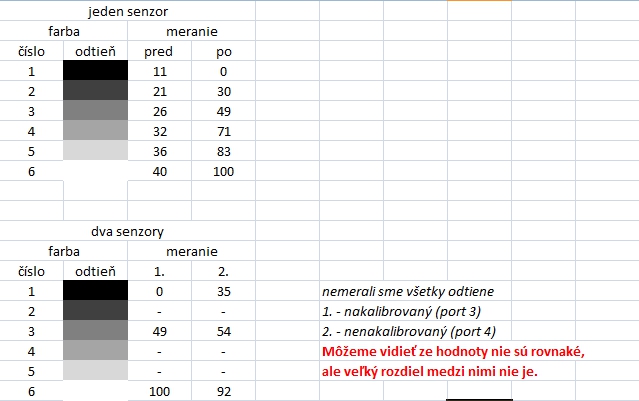 1. Robot po príchode do stredného pásma hľadá puk tým, že sa otáča, pokým senzor puk nezaznamená. Následne sa za ním vyberie. Keď ho má, nájde bránku a dá gól. Na robota sme použili dva motory a ultrasonický senzor. 2. Najprv sme senzor nakalibrovali na maximalne hraničné hodnoty (minimalna hodnota-tmava komora, maximalna hodnota-svetlom sme zasvietili to senzora) a to preto, že senzor ostal nakalibrovaný z inej súťaže a honoty boli vo väčšine prípadov rovnaké pred aj po nakalibrovaní. Potom sme senzor postupne prikladali na jednotlivé odtiene a hodnoty sme si zapisovali. Následne sme senzor nakalibrovali a meranie sme zopakovali. Týmto istým spôsobom sme namerali hodnoty aj po pridaní druhého senzora. Výsledky meraní môžete vidieť v priloženom Excel súbore(alebo fotka). Pri programe kalibracia sme využili My Blocks a to preto, že niektoré časti sme potrebovali opakovať až šesťkrát a keby sme to mali nechať bez blokov tak program by bol veľmi rozťahaný. A tie bloky sa nám neskôr zídu.