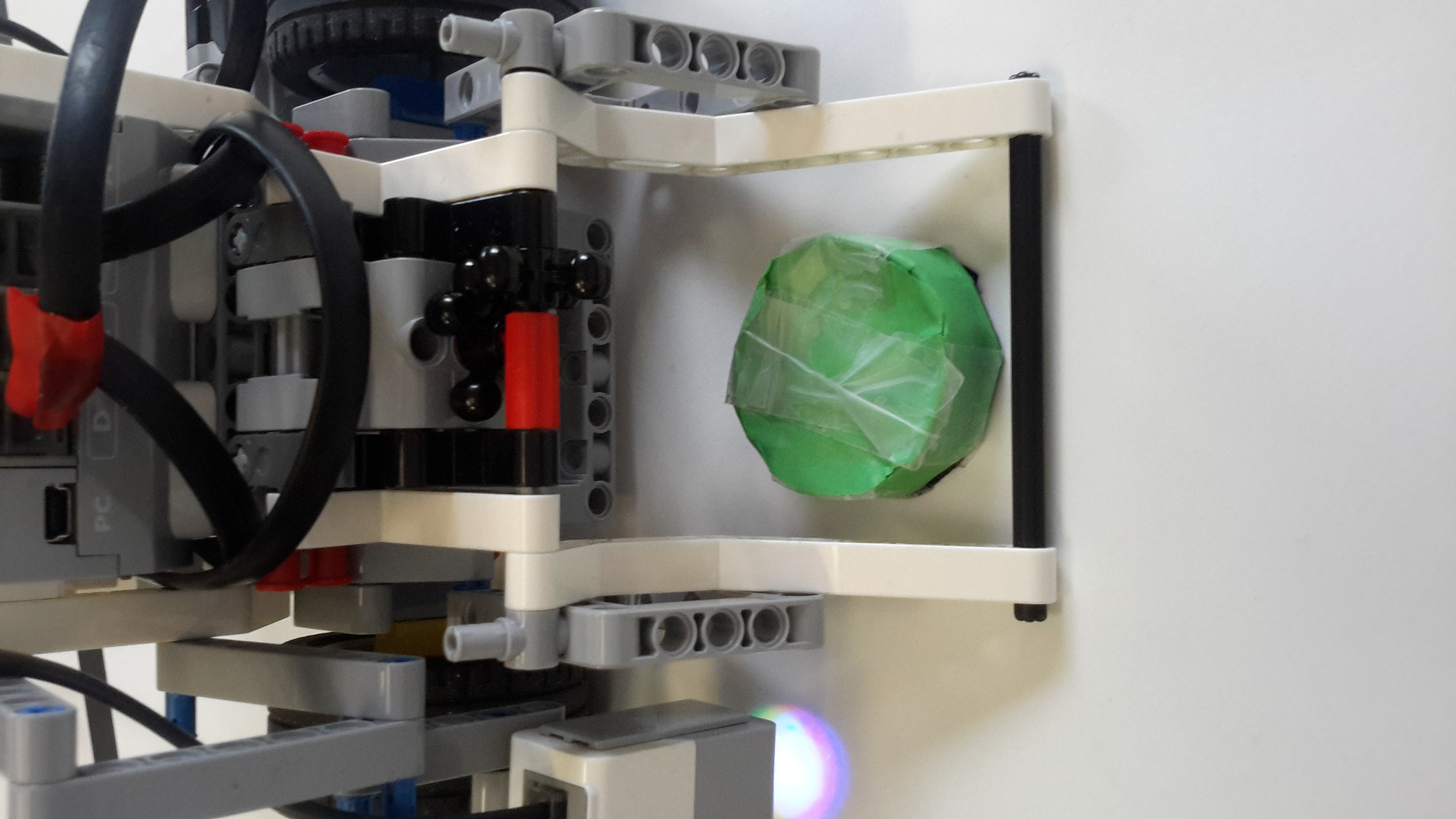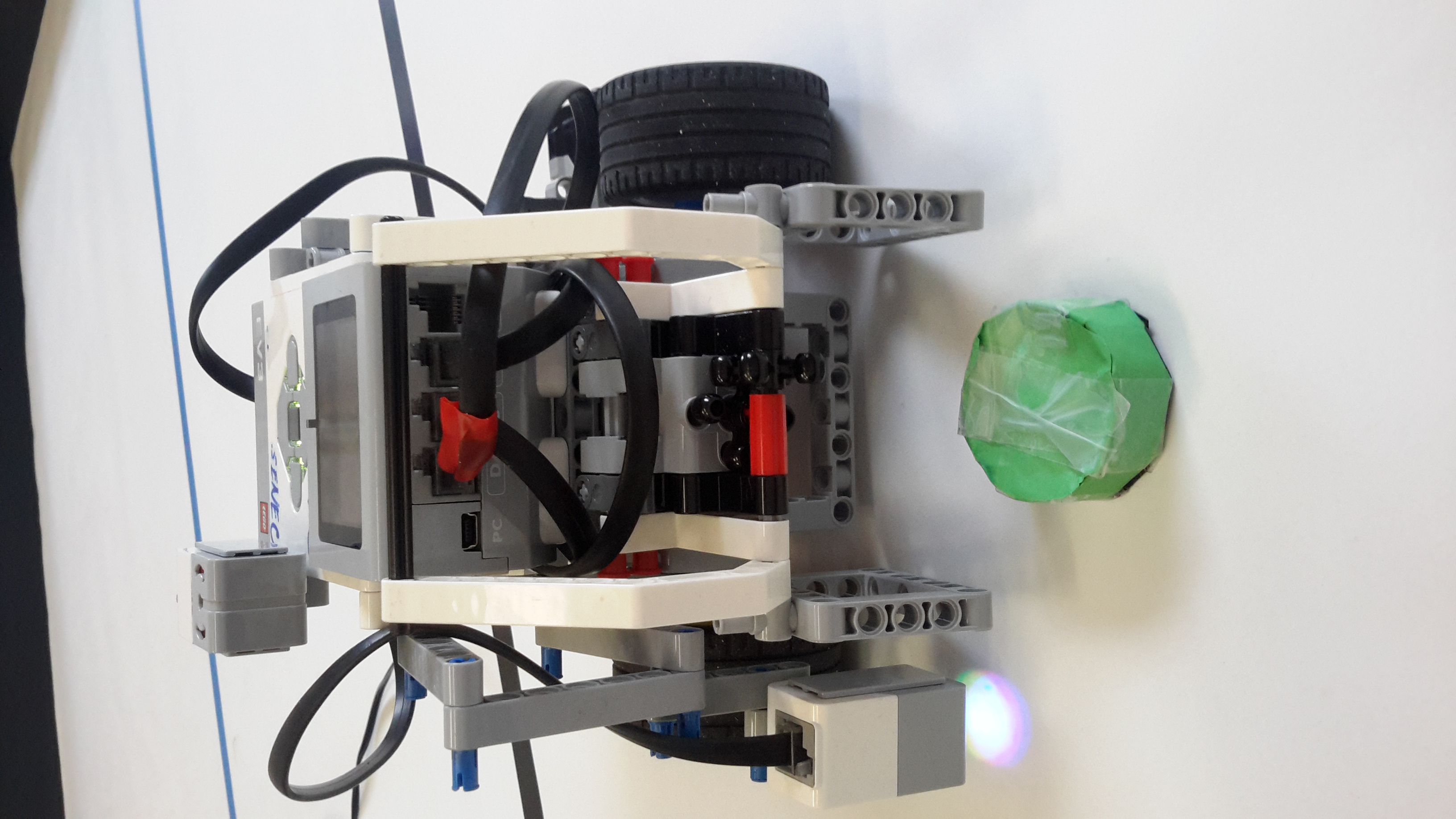 Robot sa skladá z 2 veľkých motorov, ktoré poháňajú robota. Ďalej 1 motor, ktorý zatvára a otvára vidlicu, ktorá uchopí puk. Máme tu ďalej farebný senzor, ktorý zistí, keď nájde modrú farbu. Nakoniec tu je ešte ultrasonický senzor, ktorý meria vzdialenosť a tým hľadá puk. Program: Robot ide po kraji ihriska a čaká, kým ultrasonický senzor uvidí puk. Keď puk nájde, otočí sa vľavo k puku o 90 stupňov, ide cez ihrisko, kým znova ultrasonický senzor na ľavej strane nenájde puk. Znova sa otočí vľavo o 90 stupňov, príde k puku, vidlicou uchopí puk, otočí sa späť k čiare. Zastane na modrej čiare, ktorá ohraničuje ihrisko (farebný senzor), otočí sa smerom do ihriska, ide do polovice ihriska, otočí sa smerom k bráne a dotlačí tam puk.