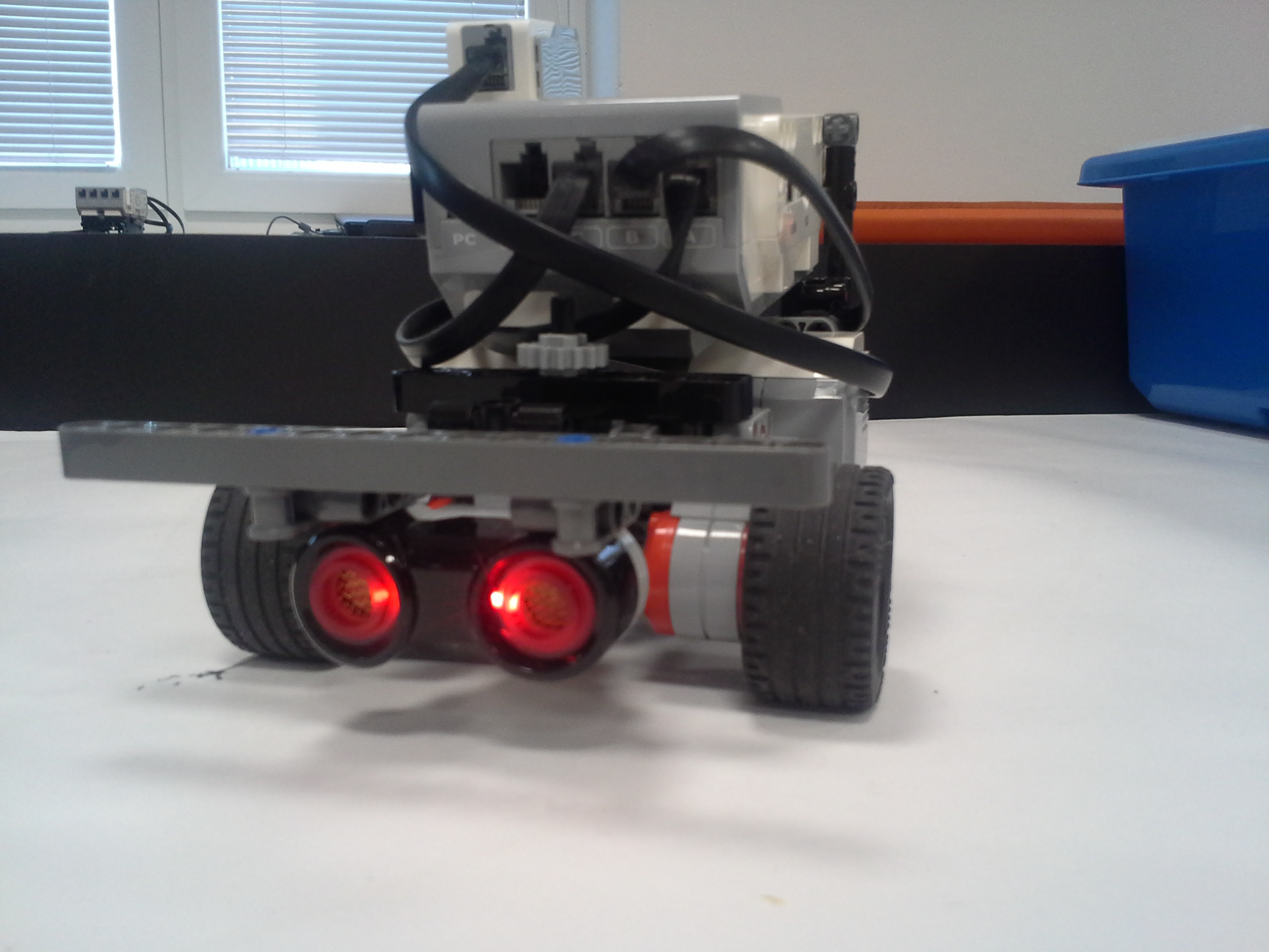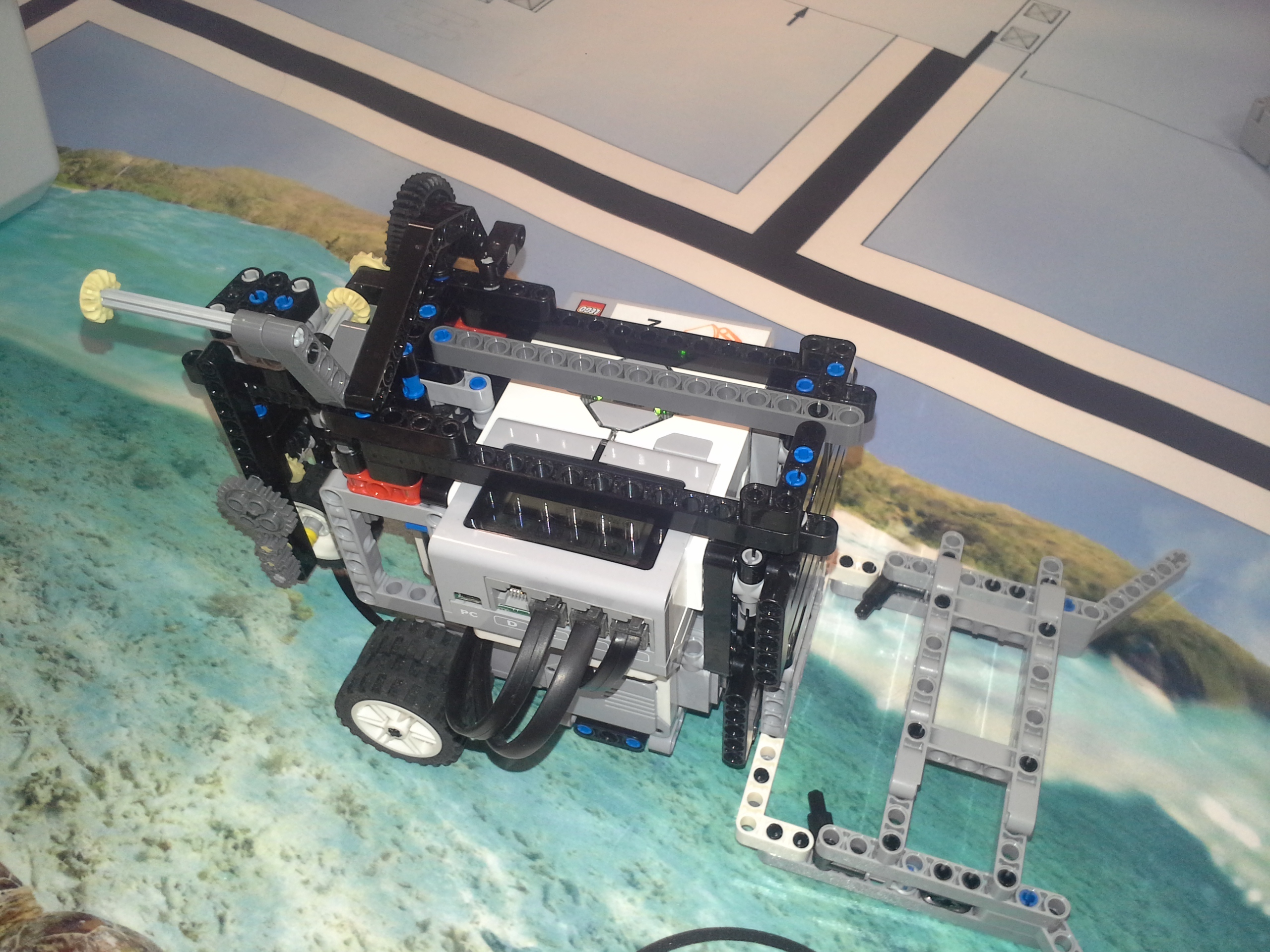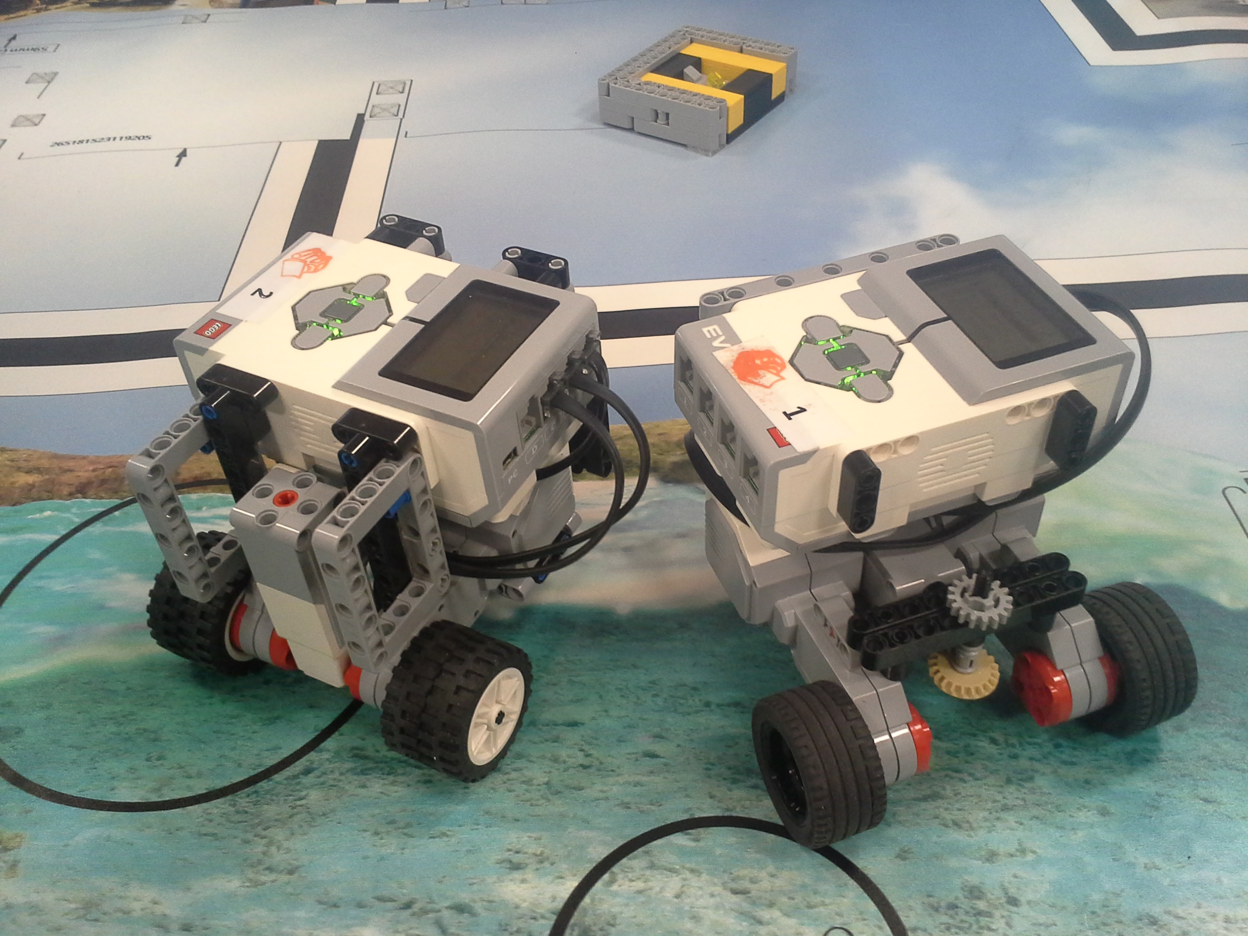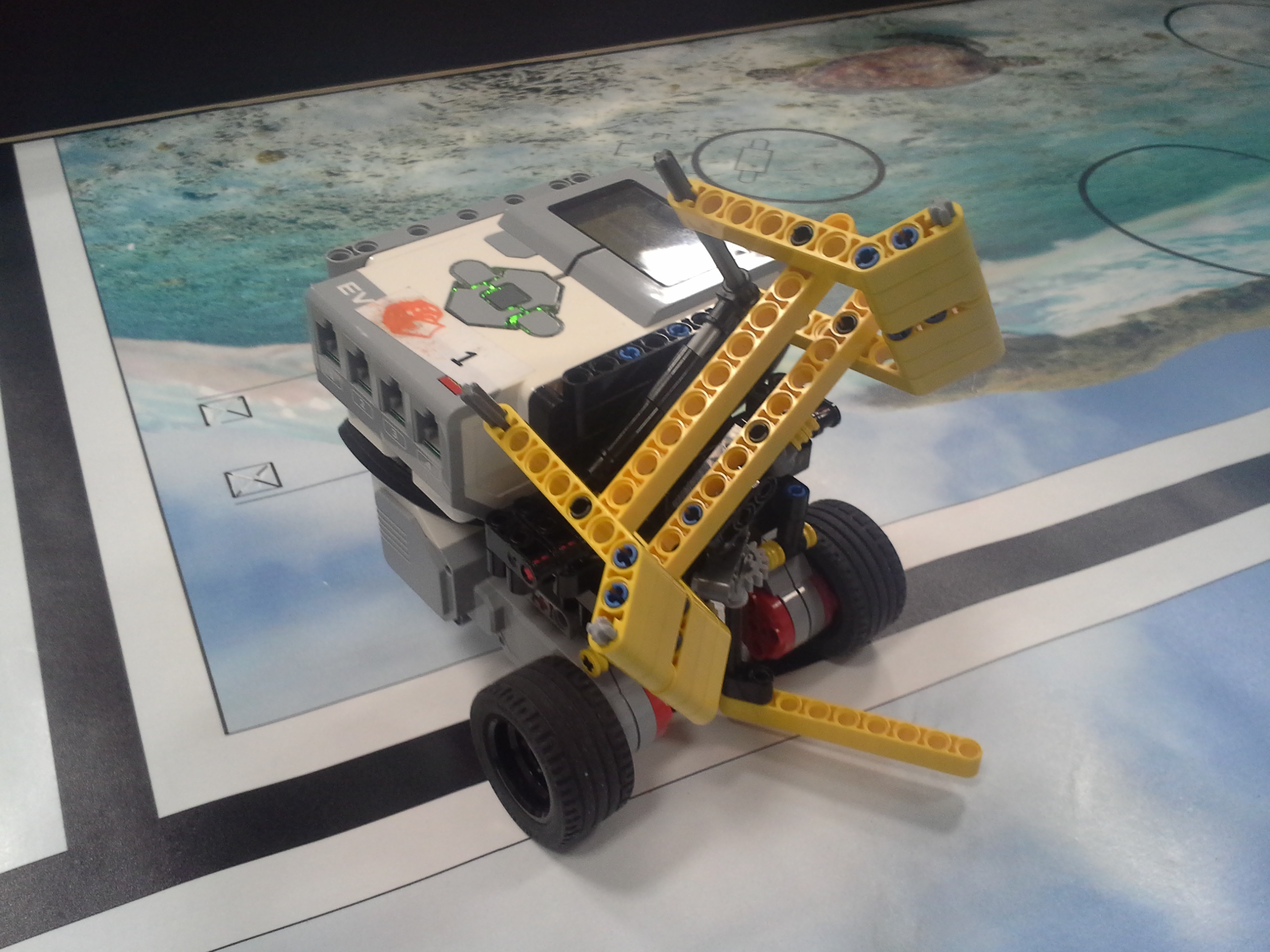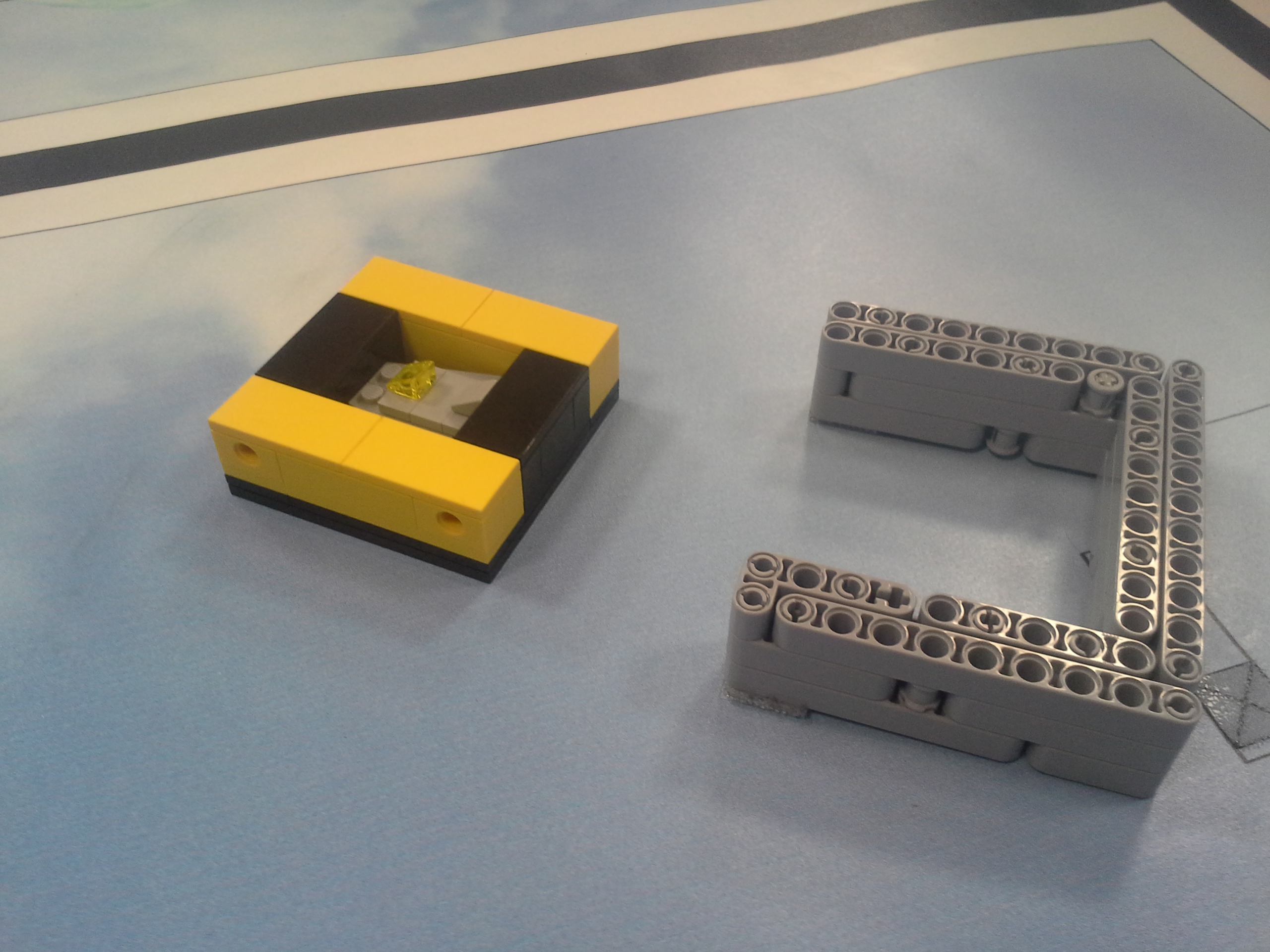 Možnosť A Robot: Robot má svoj tretí motor uložený medzi motormi určenými na pohon kolies. Nástavce sa mu napájajú na malé ozubené koliesko v prednej časti, aby sa dali ľahko odpojiť potiahnutím dohora. Všetky jeho doplnky sa dajú ľahko pripojiť aj odpojiť, pretože sú na ňom akoby len položené (nijako sa nepripájajú - držia len vďaka gravitácií a tomu, že sú tvarované presne na robota). Program: Lietadielko do ukladacieho priestoru vkladá tak, že naň položí žlté "koľajnice", ktoré sú otočené o 45° doprava, a potom ho už len posunie ramenom cez koľajnice do ukladacieho priestoru. Vďaka týmto koľajniciam robot dokáže vsunúť lietadielko aj do krabice, ktorá je presne veľkosti lietadielka. Koľajnice zhodí pri prvom pohybe ramenom, ktoré je potom voľné a dá sa použiť na iné funkcie. Na ďalších doplnkoch je jasné čo robia, takže si myslím že nie je potrebné vysvetľovať ich. Vždy počas nasádzania doplnku robot otáča ozubeným kolieskom sem-tam aby prevody doplnku lepšie "dosadli" na robota. // Možnosť B Robot: Obyčajný robot s výstupom malého motora smerom nahor. Pretože v tejto úlohe máme plniť úlohy a používať "doplnky" ako na FLL, tak som sa rozhodol, že ako aj na FLL sa pokúsim splniť všetky úlohy s jediným nasadzovacím "doplnkom" a na jeden program. Na tomto doplnku je na motor prevodmi napojené aj koleso a zároveň aj zdvíhacie rameno na slučku a vzadu sa nachádza niečo ako štvorcová radlica na zarovnanie krabice s lietadielkom o ukladací priestor a na zarovnávanie o mantinel. // Program: Robot najprv prejde na miesto oproti ukladaciemu priestoru na lietadlo, zacúva k nemu, pričom zhrnie a zarovná lietadlo, a zasunie ho dovnútra. Pri odchode sa prudko otočí, čím lietadlo dotlačí do odkladacieho priestoru. Zarovná sa o mantinel, vysunie rameno a vezme slučku. Potom ide smerom na základňu kde sa dva-krát zarovná, následne ide ku kolesu a otočí ním o 3 otáčky. Nakoniec, pretože pri otáčaní kolesom dal rameno zo slučkou dolu, musí trochu vycúvať a dať ho zase nahor. Potom sa robot vráti na základňu. // Na presné počiatočné umiestnenie robota používame zarovnávacie dosky alebo "základne". Naše koleso, ktoré je pevne prilepené ku podložke, je prevodom napojené na otočné rameno tak aby po otočení kolesom o tri otáčky spravilo rameno presne jednu otáčku. Ako podložku používame tohtoročné FLL plátno, ale ako základňu používame severovýchodnú oblasť, pretože narozdiel od tohtoročnej základne má obdĺžnikový tvar a rozmery približne rovnaké ako mali minuloročné základne. // - // Úloha 2: Robot: Použili sme robota z prvej úlohy s pridaným ultrazvukovým senzorom. Nad senzorom má široké rameno na zarovnávanie o stenu. // Program A: V programe A robot nehľadá najbližšie/najvzdialenejšie miesto (roh) ale najbližšiu/najvzdialenejšiu stenu, ako to bolo v zadaní. Robot si najprv uloží uhol, v ktorom sa na začiatku nachádza. Potom ide rovno, až kým sa nezarovná ramenom o nejakú stenu, a gyro senzorom zaznamená o koľko stupňov sa otočil, trochu vycúva a otočí sa späť presne o toľko stupňov o koľko sa zarovnal, zacúva na pôvodné miesto kde stál na začiatku a potom sa otočí kolmo na stenu pred ním, aby mohol zmerať vzdialenosti všetkých stien. Potom sa pomocou gyro-senzora otáča vždy o 90 stupňov a zmeria svoju vzdialenosť od každej steny. Situáciu vyhodnotí a na display-i ukáže obrázok svojej pozície na stole. Potom sa nás spýta či má ísť ku najbližšej alebo najvzdialenejšej stene, nakoniec ku nej dojde a spustia sa fanfáry. // Program B: Spravili sme aj možnosť B, pretože sme chceli spraviť aj robota, ktorý nájde nielen najbližšiu/najvzdialenejšiu stenu ale aj celkovo najbližšie/najvzdialenejšie mieto (roh). Program je veľmi jednoduchý, robot sa otáča, a keď nájde menšiu/väčšiu vzdialenosť ako bola tá predošlá - pípne a zapíše si ju. Nakoniec sa otočí na smer, kde videl najlepšiu vzdialenosť a prejde na ten smer toľko Cm koľko si na začiatku nameral.