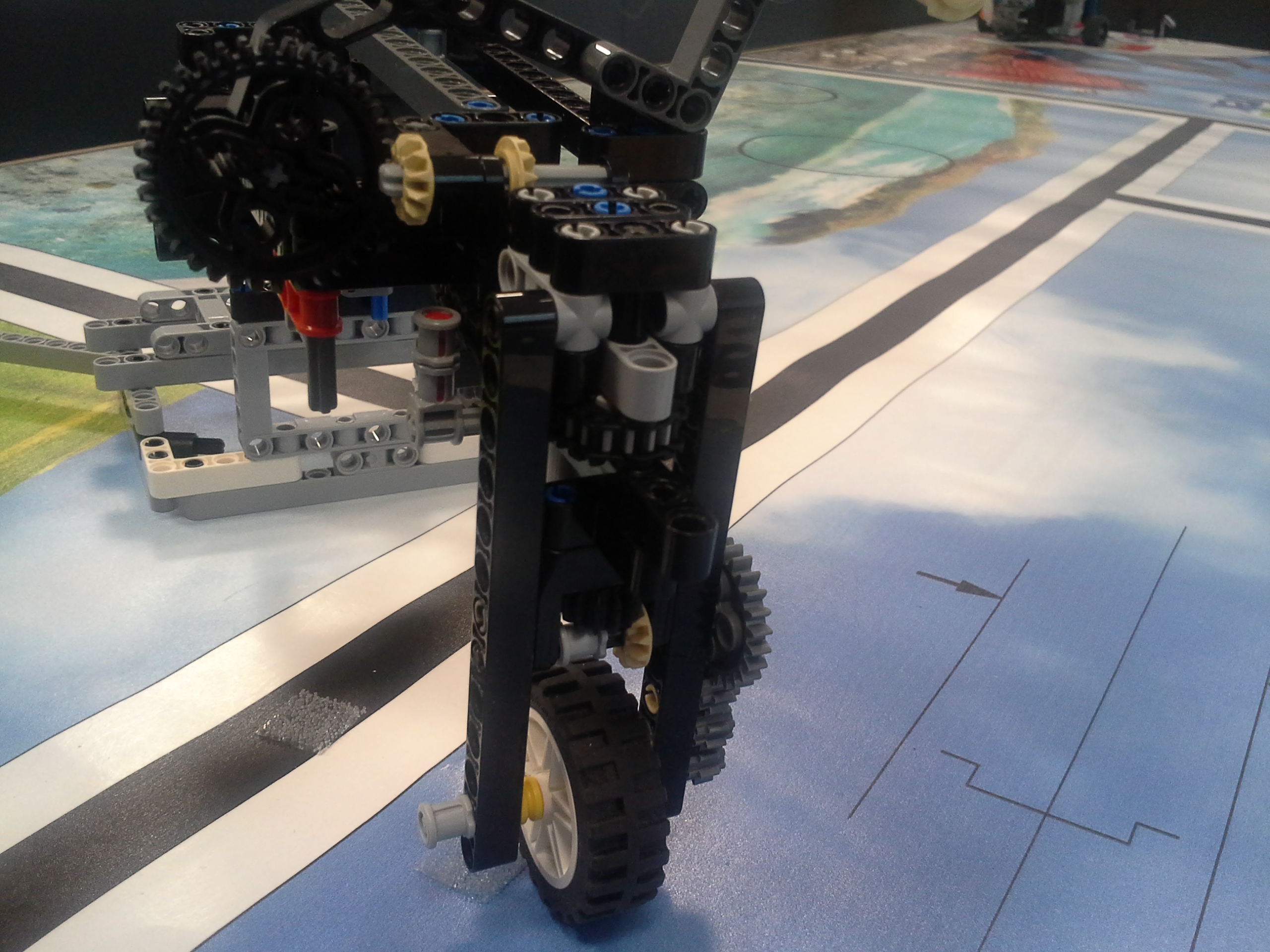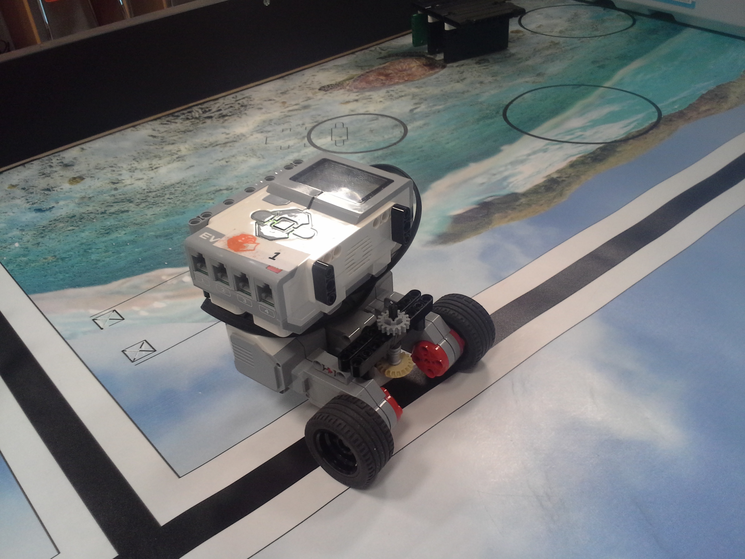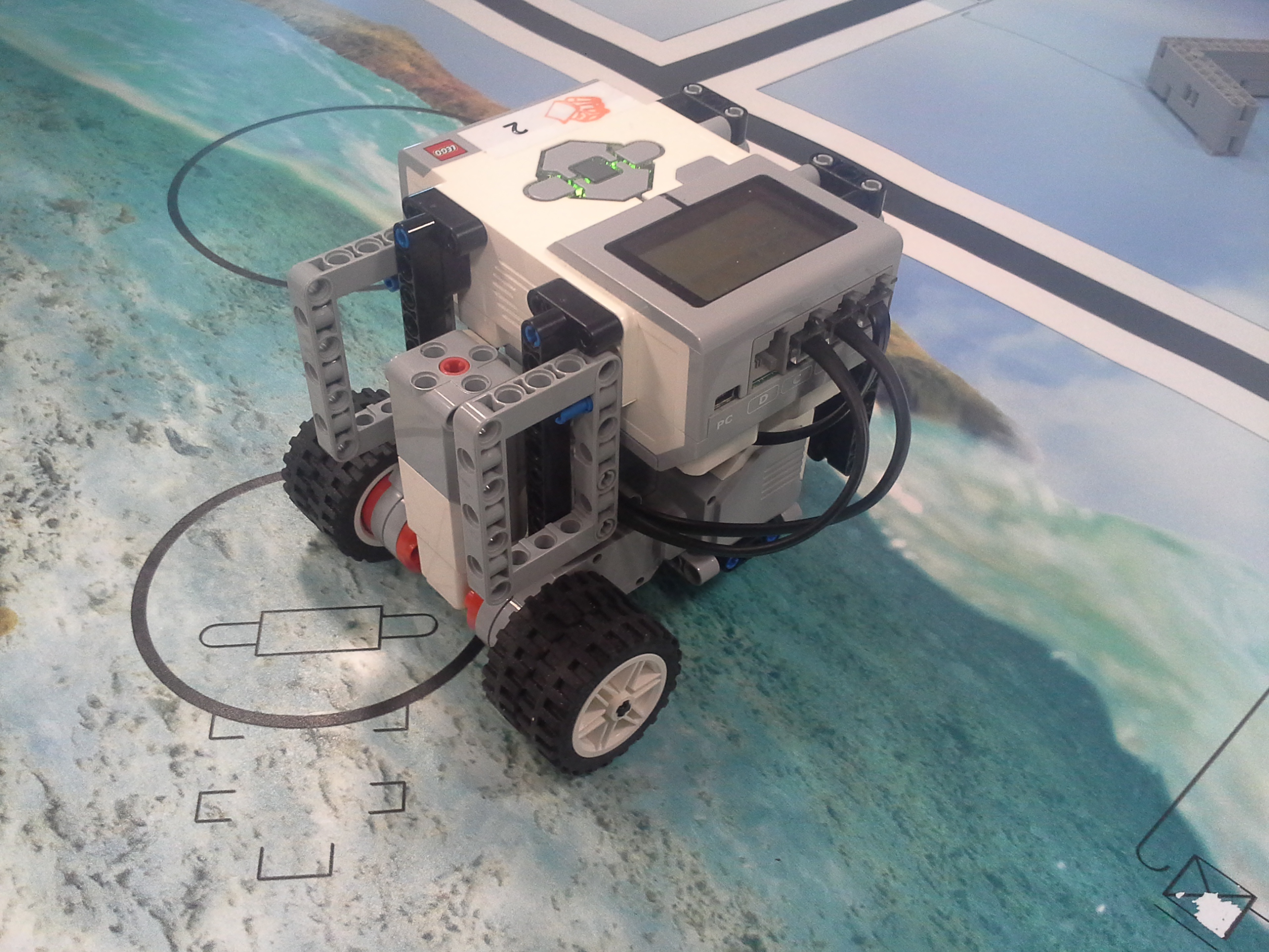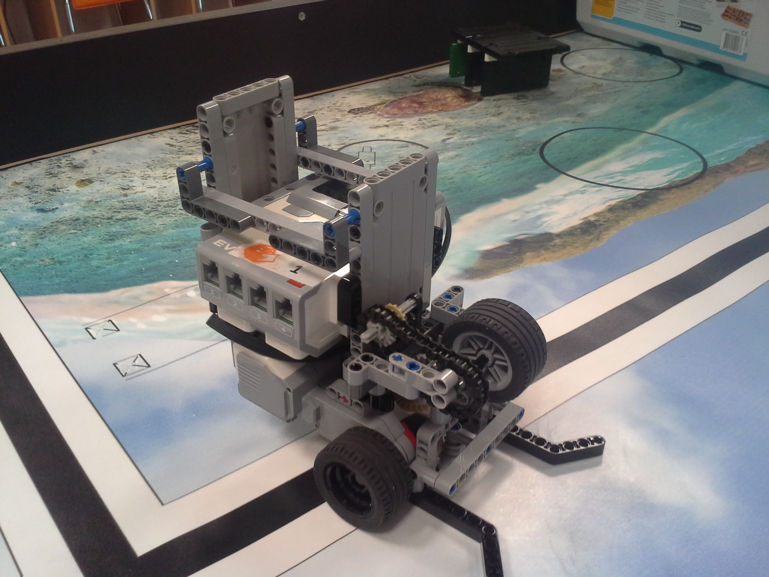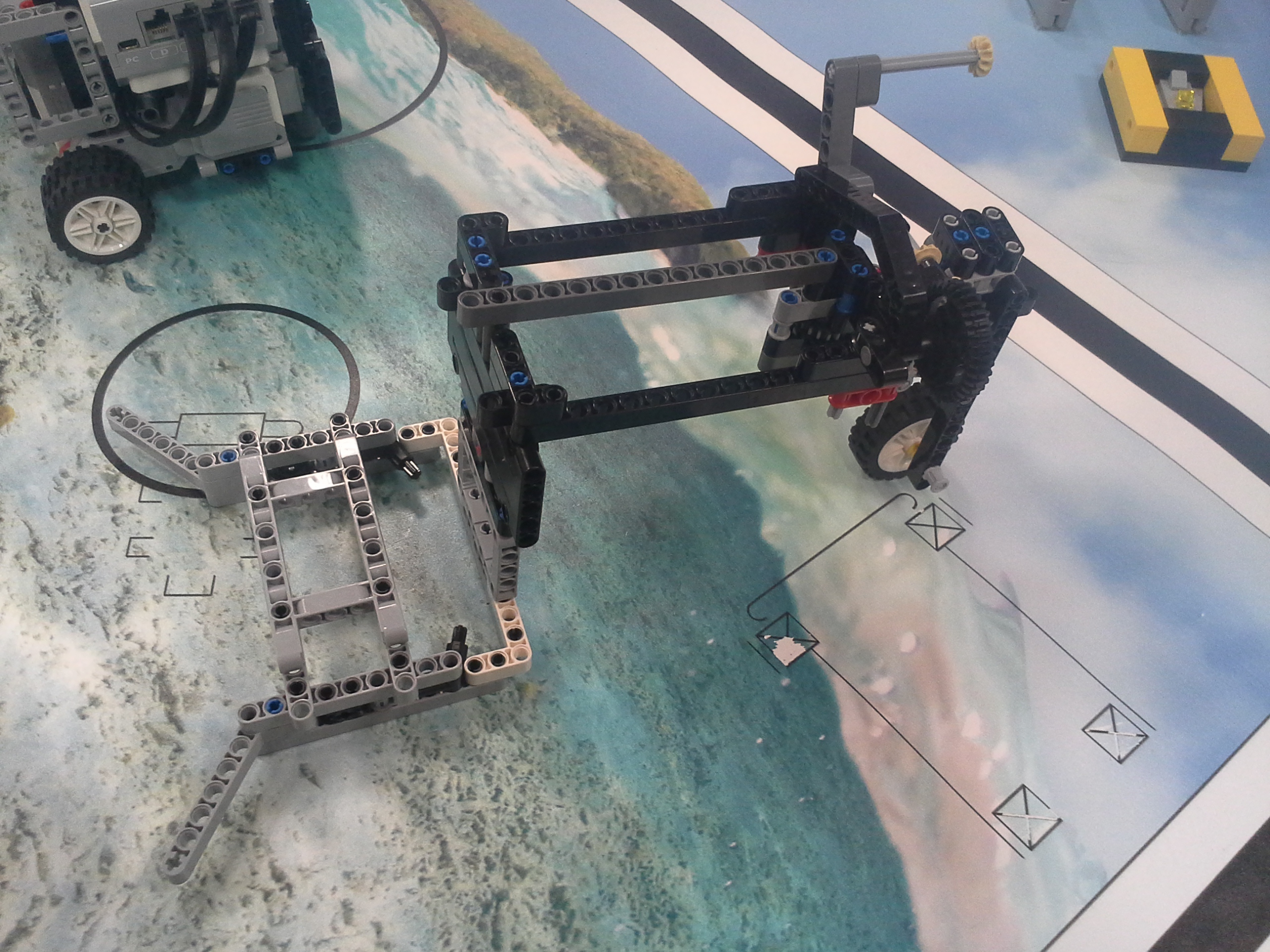 Možnosť A Robot: Robot má svoj tretí motor uložený medzi motormi určenými na pohon kolies. Nástavce sa mu napájajú na malé ozubené koliesko v prednej časti, aby sa dali ľahko odpojiť potiahnutím dohora. Všetky jeho doplnky sa dajú ľahko pripojiť aj odpojiť, pretože sú na ňom akoby len položené (nijako sa nepripájajú - držia len vďaka gravitácií a tomu, že sú tvarované presne na robota). Program: Lietadielko do ukladacieho priestoru vkladá tak, že naň položí žlté "koľajnice", ktoré sú otočené o 45° doprava, a potom ho už len posunie ramenom cez koľajnice do ukladacieho priestoru. Vďaka týmto koľajniciam robot dokáže vsunúť lietadielko aj do krabice, ktorá je presne veľkosti lietadielka. Koľajnice zhodí pri prvom pohybe ramenom, ktoré je potom voľné a dá sa použiť na iné funkcie. Na ďalších doplnkoch je jasné čo robia, takže si myslím že nie je potrebné vysvetľovať ich. Vždy počas nasádzania doplnku robot otáča ozubeným kolieskom sem-tam aby prevody doplnku lepšie "dosadli" na robota. // Možnosť B Robot: Obyčajný robot s výstupom malého motora smerom nahor. Pretože v tejto úlohe máme plniť úlohy a používať "doplnky" ako na FLL, tak som sa rozhodol, že ako aj na FLL sa pokúsim splniť všetky úlohy s jediným nasadzovacím "doplnkom" a na jeden program. Na tomto doplnku je na motor prevodmi napojené aj koleso a zároveň aj zdvíhacie rameno na slučku a vzadu sa nachádza niečo ako štvorcová radlica na zarovnanie krabice s lietadielkom o ukladací priestor a na zarovnávanie o mantinel. // Program: Robot najprv prejde na miesto oproti ukladaciemu priestoru na lietadlo, zacúva k nemu, pričom zhrnie a zarovná lietadlo, a zasunie ho dovnútra. Pri odchode sa prudko otočí, čím lietadlo dotlačí do odkladacieho priestoru. Zarovná sa o mantinel, vysunie rameno a vezme slučku. Potom ide smerom na základňu kde sa dva-krát zarovná, následne ide ku kolesu a otočí ním o 3 otáčky. Nakoniec, pretože pri otáčaní kolesom dal rameno zo slučkou dolu, musí trochu vycúvať a dať ho zase nahor. Potom sa robot vráti na základňu. // Na presné počiatočné umiestnenie robota používame zarovnávacie dosky alebo "základne". Naše koleso, ktoré je pevne prilepené ku podložke, je prevodom napojené na otočné rameno tak aby po otočení kolesom o tri otáčky spravilo rameno presne jednu otáčku. Ako podložku používame tohtoročné FLL plátno, ale ako základňu používame severovýchodnú oblasť, pretože narozdiel od tohtoročnej základne má obdĺžnikový tvar a rozmery približne rovnaké ako mali minuloročné základne. // - // Úloha 2: Robot: Použili sme robota z prvej úlohy s pridaným ultrazvukovým senzorom. Nad senzorom má široké rameno na zarovnávanie o stenu. // Program A: V programe A robot nehľadá najbližšie/najvzdialenejšie miesto (roh) ale najbližšiu/najvzdialenejšiu stenu, ako to bolo v zadaní. Robot si najprv uloží uhol, v ktorom sa na začiatku nachádza. Potom ide rovno, až kým sa nezarovná ramenom o nejakú stenu, a gyro senzorom zaznamená o koľko stupňov sa otočil, trochu vycúva a otočí sa späť presne o toľko stupňov o koľko sa zarovnal, zacúva na pôvodné miesto kde stál na začiatku a potom sa otočí kolmo na stenu pred ním, aby mohol zmerať vzdialenosti všetkých stien. Potom sa pomocou gyro-senzora otáča vždy o 90 stupňov a zmeria svoju vzdialenosť od každej steny. Situáciu vyhodnotí a na display-i ukáže obrázok svojej pozície na stole. Potom sa nás spýta či má ísť ku najbližšej alebo najvzdialenejšej stene, nakoniec ku nej dojde a spustia sa fanfáry. // Program B: Spravili sme aj možnosť B, pretože sme chceli spraviť aj robota, ktorý nájde nielen najbližšiu/najvzdialenejšiu stenu ale aj celkovo najbližšie/najvzdialenejšie mieto (roh). Program je veľmi jednoduchý, robot sa otáča, a keď nájde menšiu/väčšiu vzdialenosť ako bola tá predošlá - pípne a zapíše si ju. Nakoniec sa otočí na smer, kde videl najlepšiu vzdialenosť a prejde na ten smer toľko Cm koľko si na začiatku nameral.