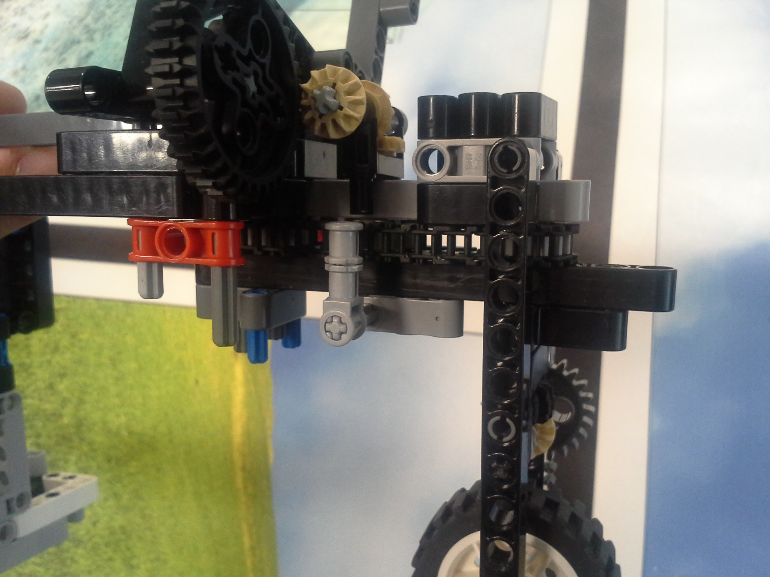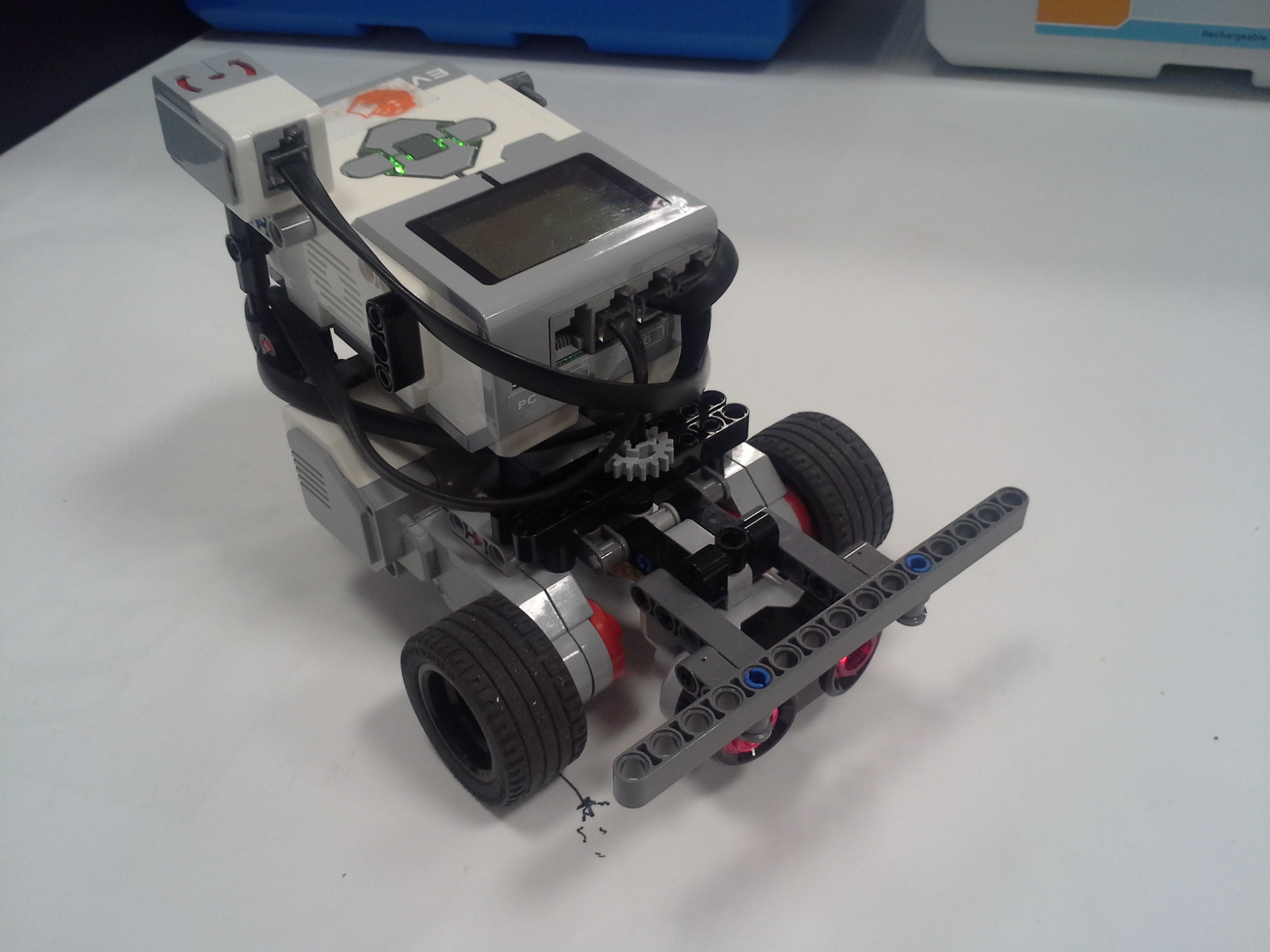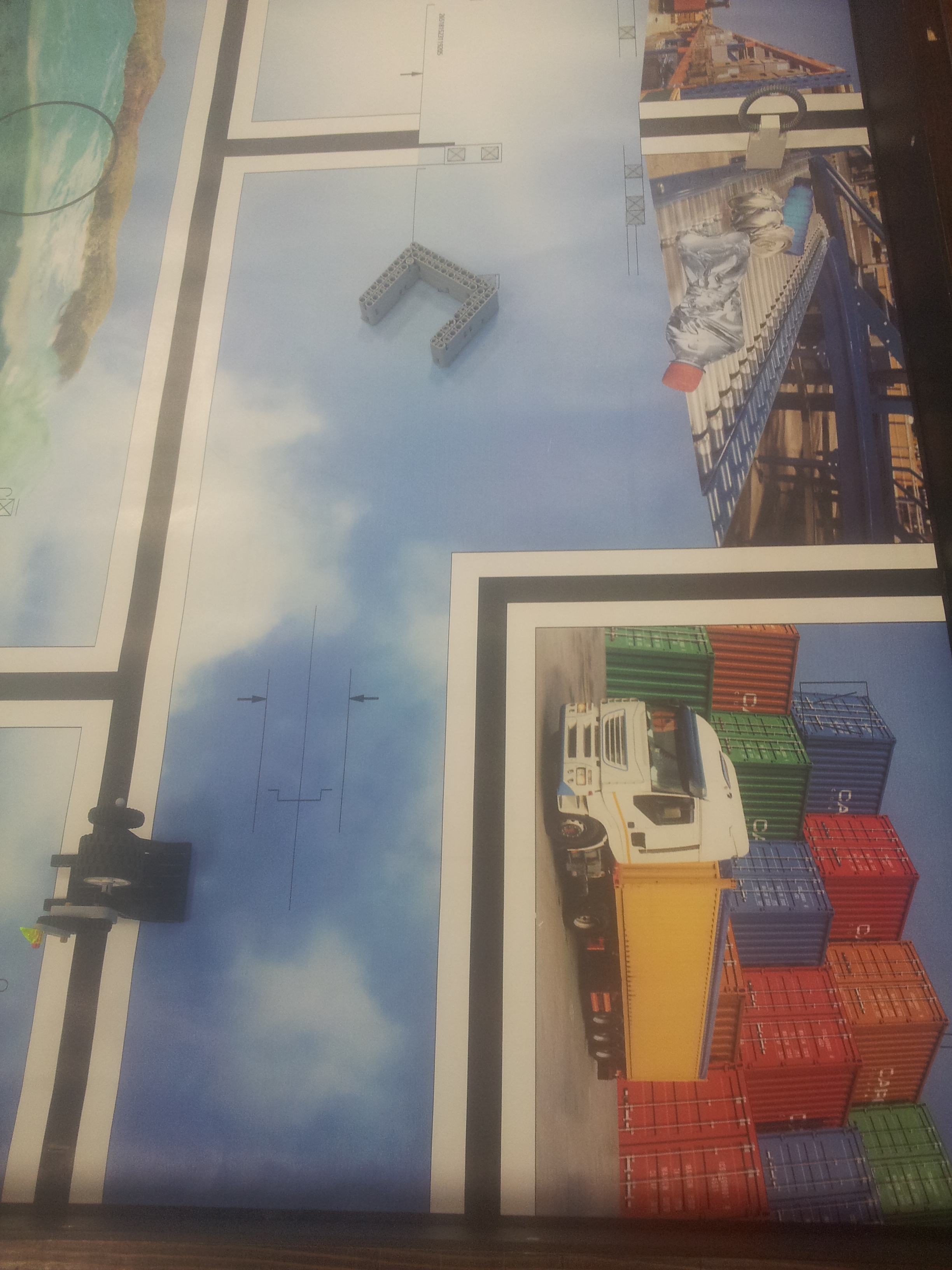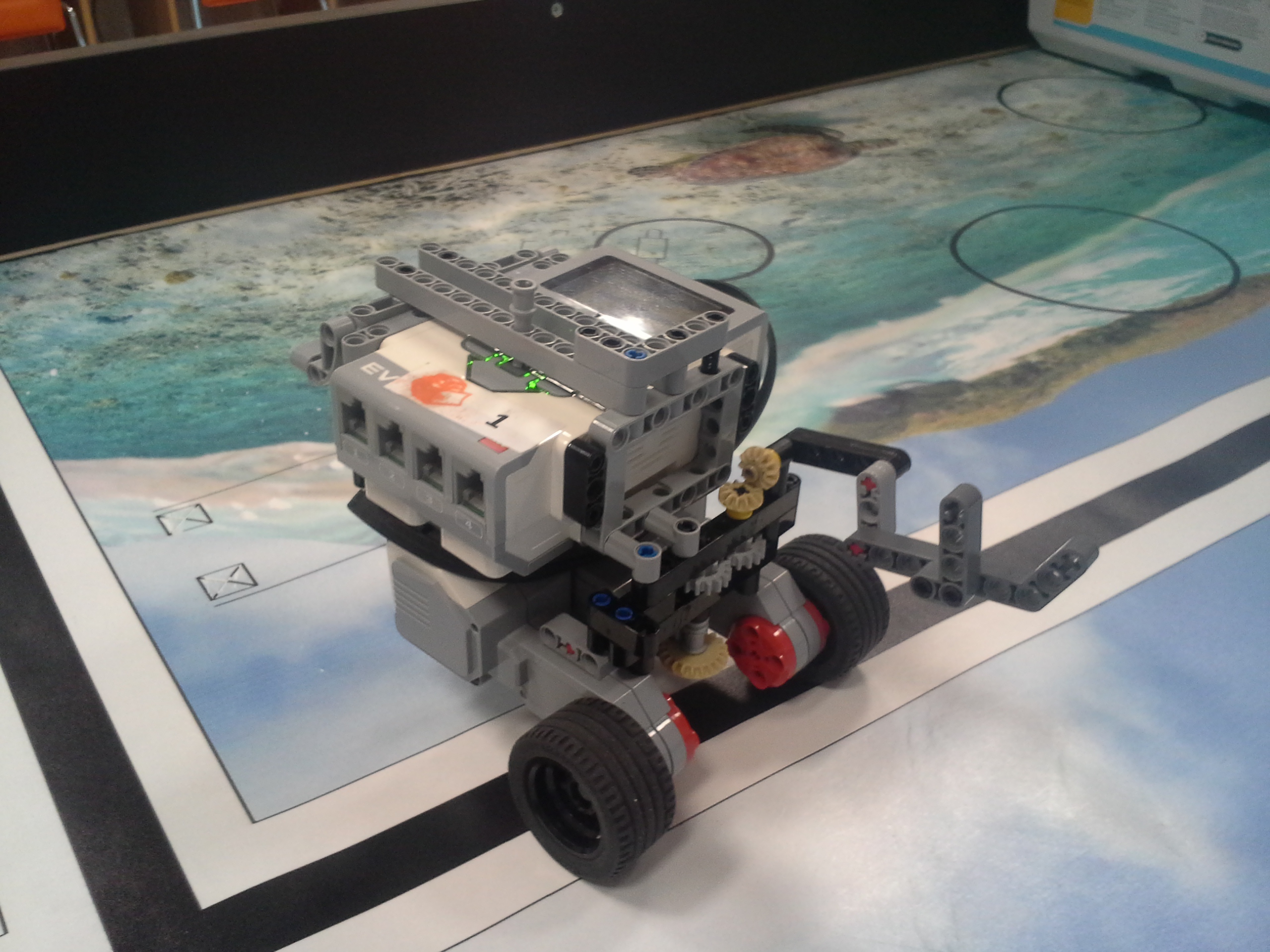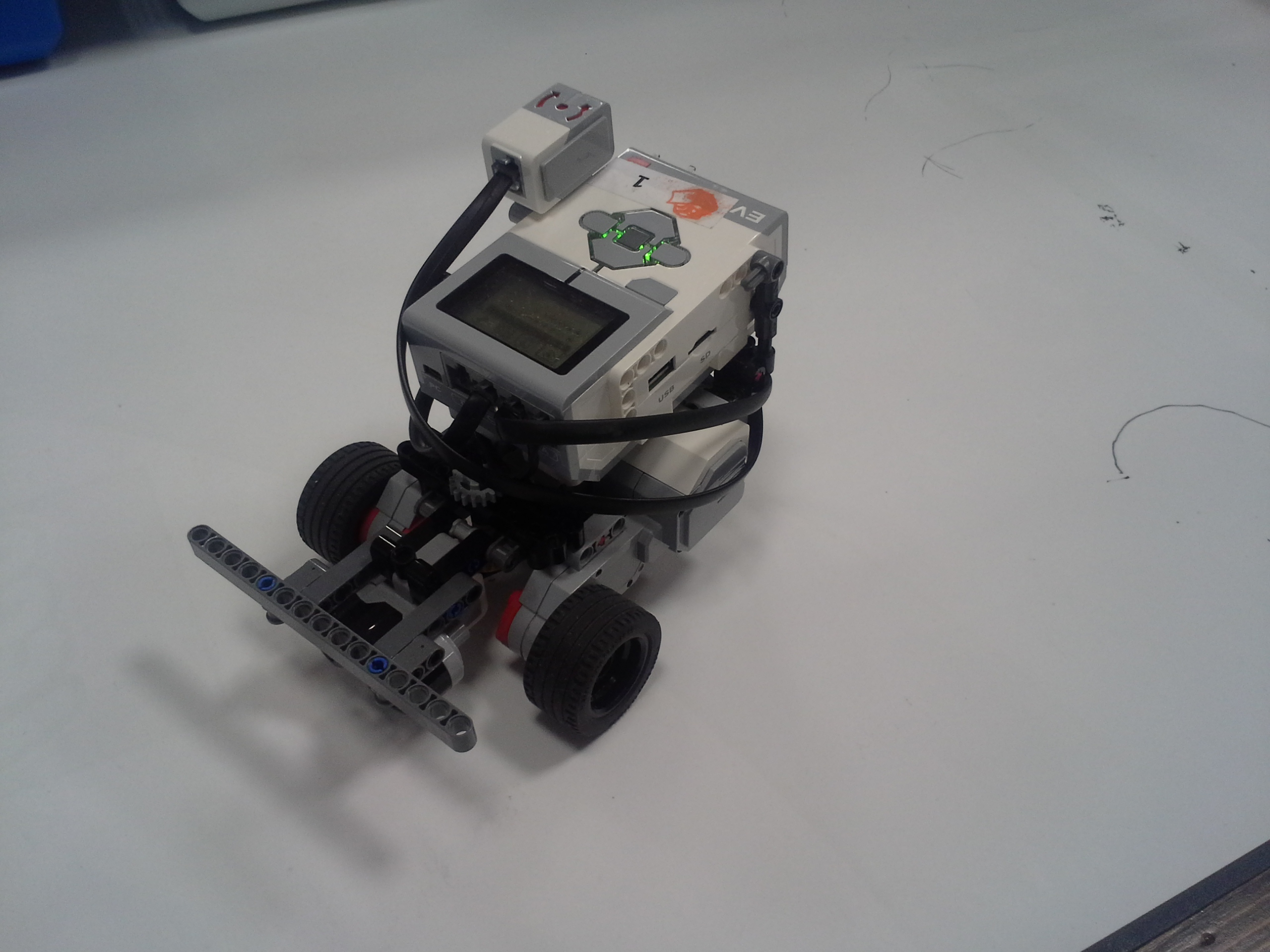 Možnosť A Robot: Robot má svoj tretí motor uložený medzi motormi určenými na pohon kolies. Nástavce sa mu napájajú na malé ozubené koliesko v prednej časti, aby sa dali ľahko odpojiť potiahnutím dohora. Všetky jeho doplnky sa dajú ľahko pripojiť aj odpojiť, pretože sú na ňom akoby len položené (nijako sa nepripájajú - držia len vďaka gravitácií a tomu, že sú tvarované presne na robota). Program: Lietadielko do ukladacieho priestoru vkladá tak, že naň položí žlté "koľajnice", ktoré sú otočené o 45° doprava, a potom ho už len posunie ramenom cez koľajnice do ukladacieho priestoru. Vďaka týmto koľajniciam robot dokáže vsunúť lietadielko aj do krabice, ktorá je presne veľkosti lietadielka. Koľajnice zhodí pri prvom pohybe ramenom, ktoré je potom voľné a dá sa použiť na iné funkcie. Na ďalších doplnkoch je jasné čo robia, takže si myslím že nie je potrebné vysvetľovať ich. Vždy počas nasádzania doplnku robot otáča ozubeným kolieskom sem-tam aby prevody doplnku lepšie "dosadli" na robota. // Možnosť B Robot: Obyčajný robot s výstupom malého motora smerom nahor. Pretože v tejto úlohe máme plniť úlohy a používať "doplnky" ako na FLL, tak som sa rozhodol, že ako aj na FLL sa pokúsim splniť všetky úlohy s jediným nasadzovacím "doplnkom" a na jeden program. Na tomto doplnku je na motor prevodmi napojené aj koleso a zároveň aj zdvíhacie rameno na slučku a vzadu sa nachádza niečo ako štvorcová radlica na zarovnanie krabice s lietadielkom o ukladací priestor a na zarovnávanie o mantinel. // Program: Robot najprv prejde na miesto oproti ukladaciemu priestoru na lietadlo, zacúva k nemu, pričom zhrnie a zarovná lietadlo, a zasunie ho dovnútra. Pri odchode sa prudko otočí, čím lietadlo dotlačí do odkladacieho priestoru. Zarovná sa o mantinel, vysunie rameno a vezme slučku. Potom ide smerom na základňu kde sa dva-krát zarovná, následne ide ku kolesu a otočí ním o 3 otáčky. Nakoniec, pretože pri otáčaní kolesom dal rameno zo slučkou dolu, musí trochu vycúvať a dať ho zase nahor. Potom sa robot vráti na základňu. // Na presné počiatočné umiestnenie robota používame zarovnávacie dosky alebo "základne". Naše koleso, ktoré je pevne prilepené ku podložke, je prevodom napojené na otočné rameno tak aby po otočení kolesom o tri otáčky spravilo rameno presne jednu otáčku. Ako podložku používame tohtoročné FLL plátno, ale ako základňu používame severovýchodnú oblasť, pretože narozdiel od tohtoročnej základne má obdĺžnikový tvar a rozmery približne rovnaké ako mali minuloročné základne. // - // Úloha 2: Robot: Použili sme robota z prvej úlohy s pridaným ultrazvukovým senzorom. Nad senzorom má široké rameno na zarovnávanie o stenu. // Program A: V programe A robot nehľadá najbližšie/najvzdialenejšie miesto (roh) ale najbližšiu/najvzdialenejšiu stenu, ako to bolo v zadaní. Robot si najprv uloží uhol, v ktorom sa na začiatku nachádza. Potom ide rovno, až kým sa nezarovná ramenom o nejakú stenu, a gyro senzorom zaznamená o koľko stupňov sa otočil, trochu vycúva a otočí sa späť presne o toľko stupňov o koľko sa zarovnal, zacúva na pôvodné miesto kde stál na začiatku a potom sa otočí kolmo na stenu pred ním, aby mohol zmerať vzdialenosti všetkých stien. Potom sa pomocou gyro-senzora otáča vždy o 90 stupňov a zmeria svoju vzdialenosť od každej steny. Situáciu vyhodnotí a na display-i ukáže obrázok svojej pozície na stole. Potom sa nás spýta či má ísť ku najbližšej alebo najvzdialenejšej stene, nakoniec ku nej dojde a spustia sa fanfáry. // Program B: Spravili sme aj možnosť B, pretože sme chceli spraviť aj robota, ktorý nájde nielen najbližšiu/najvzdialenejšiu stenu ale aj celkovo najbližšie/najvzdialenejšie mieto (roh). Program je veľmi jednoduchý, robot sa otáča, a keď nájde menšiu/väčšiu vzdialenosť ako bola tá predošlá - pípne a zapíše si ju. Nakoniec sa otočí na smer, kde videl najlepšiu vzdialenosť a prejde na ten smer toľko Cm koľko si na začiatku nameral.