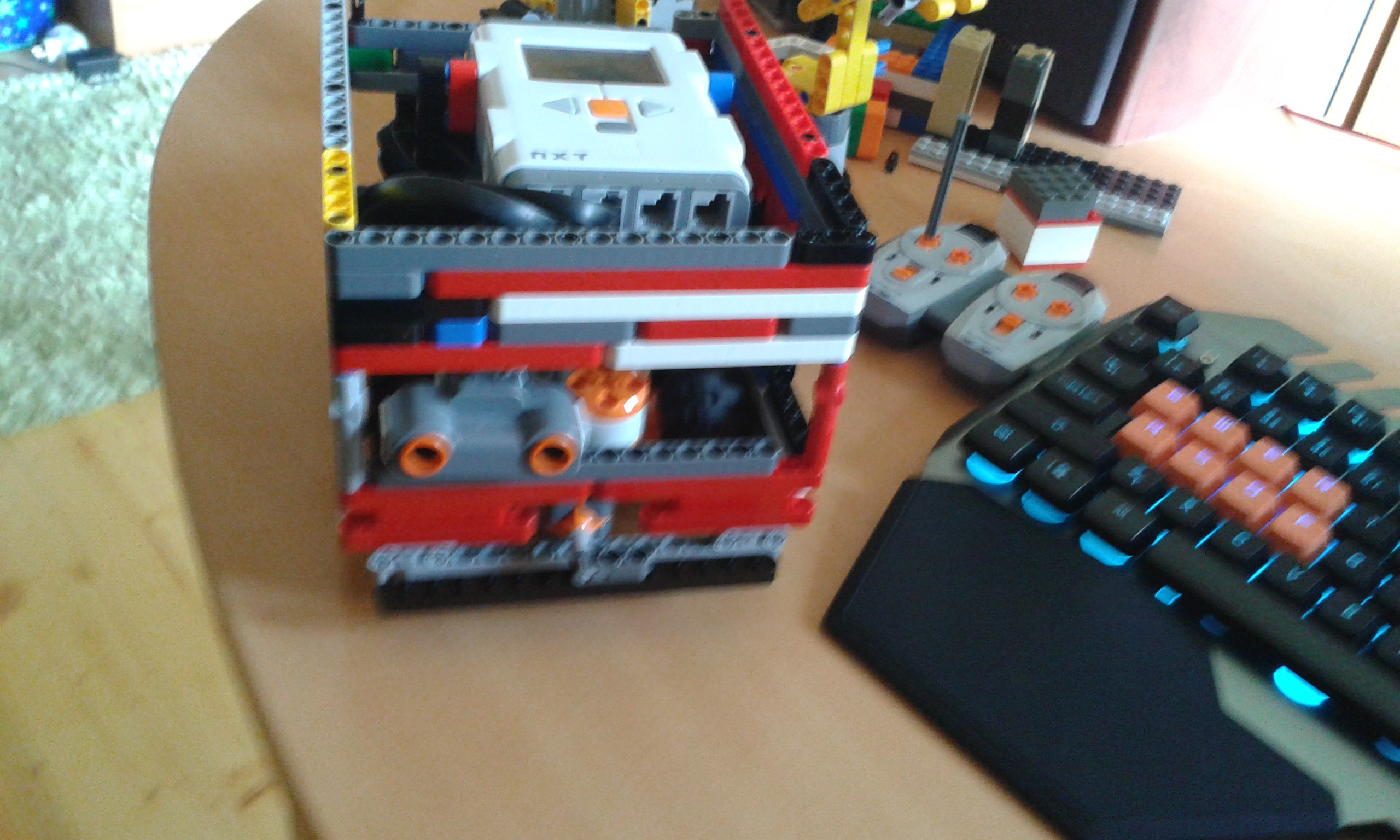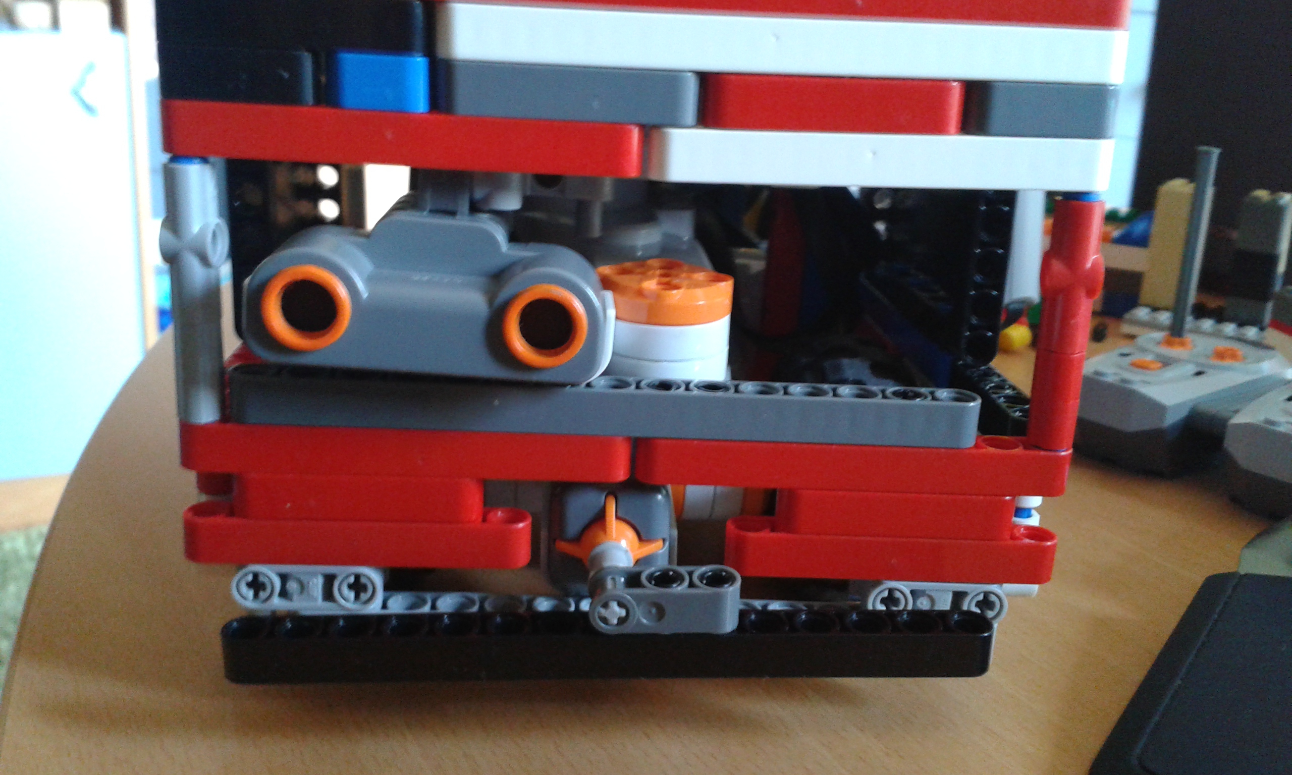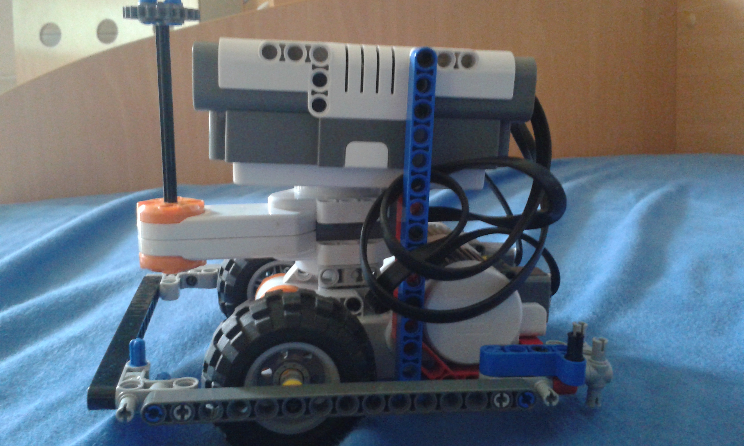 Náš robot na plnenie prekážok má konštrukciu z troch motorov, pričom jeden slúži na pohon nástavcov a dva na pohyb. Ukladanie nástavcov na robota sme riešili pomocou modrých polovičných kolíkov, pričom na spodnej časti nástavca sa nachádzajú modré kolíky, ktoré zapadajú do vonkajšieho plášťa robota . Prenos pohybu z motora A do nástavcov sme riešili pomocou dvoch ozubených kolies, ktoré sú nad sebou a v spodnom sú tiež modré kolíky, takže keď sa nástavec položí na robota , tak motor A sa s ním spojí. Na zistenie , ktorá zo štyroch stien je najďalej alebo najbližšie používame ultrazvukový senzor . Na určenie, či už robot narazil do steny používame touchsenzor. Program robota je robený tak, že najprv nameria vzdialenosti od všetkých štyroch stien a potom zistí, ktorá je najďalej alebo najbližšie a natočí sa k nej. Potom ide vpred pokiaľ do steny nenarazí. Následne vydá zvukový signál.
