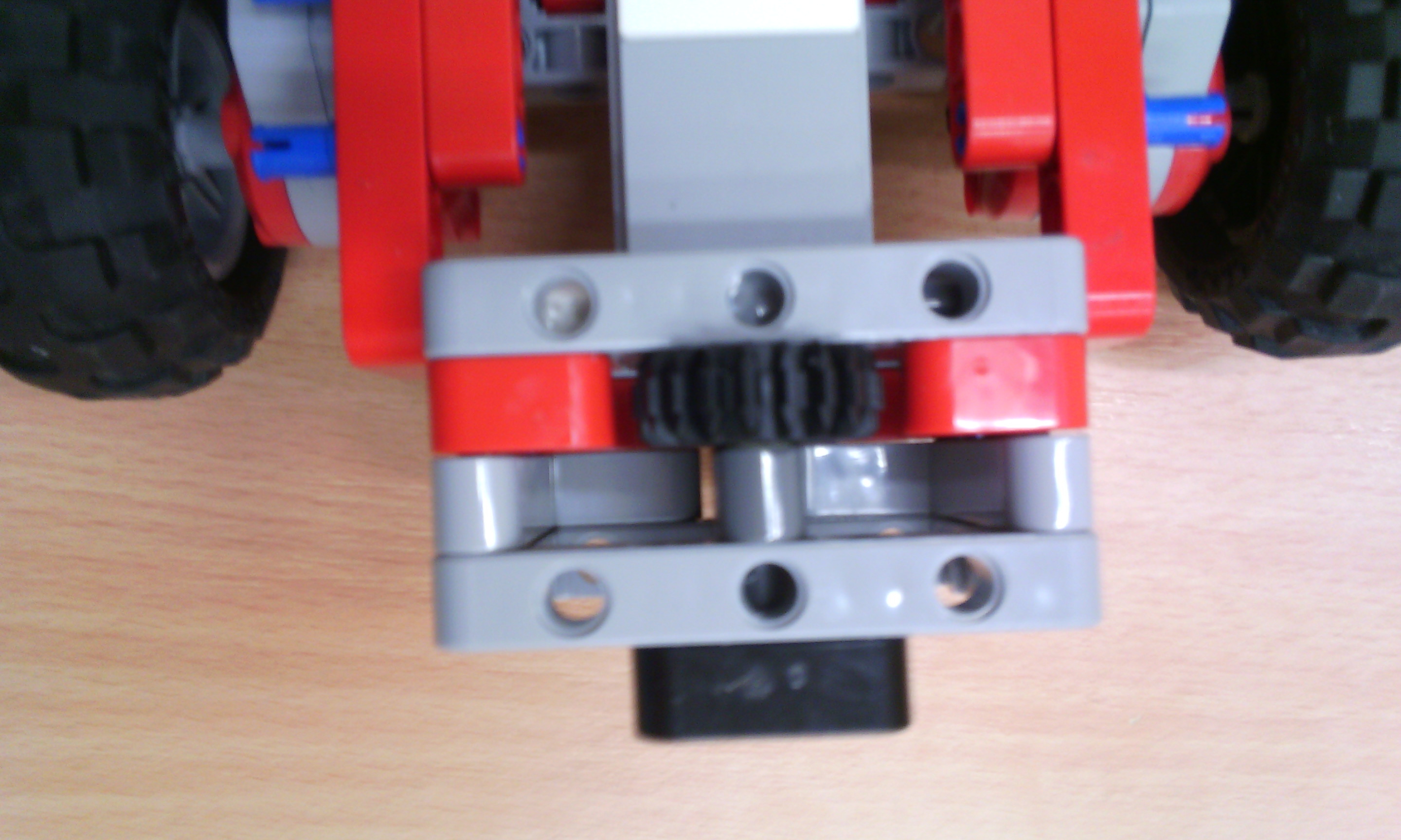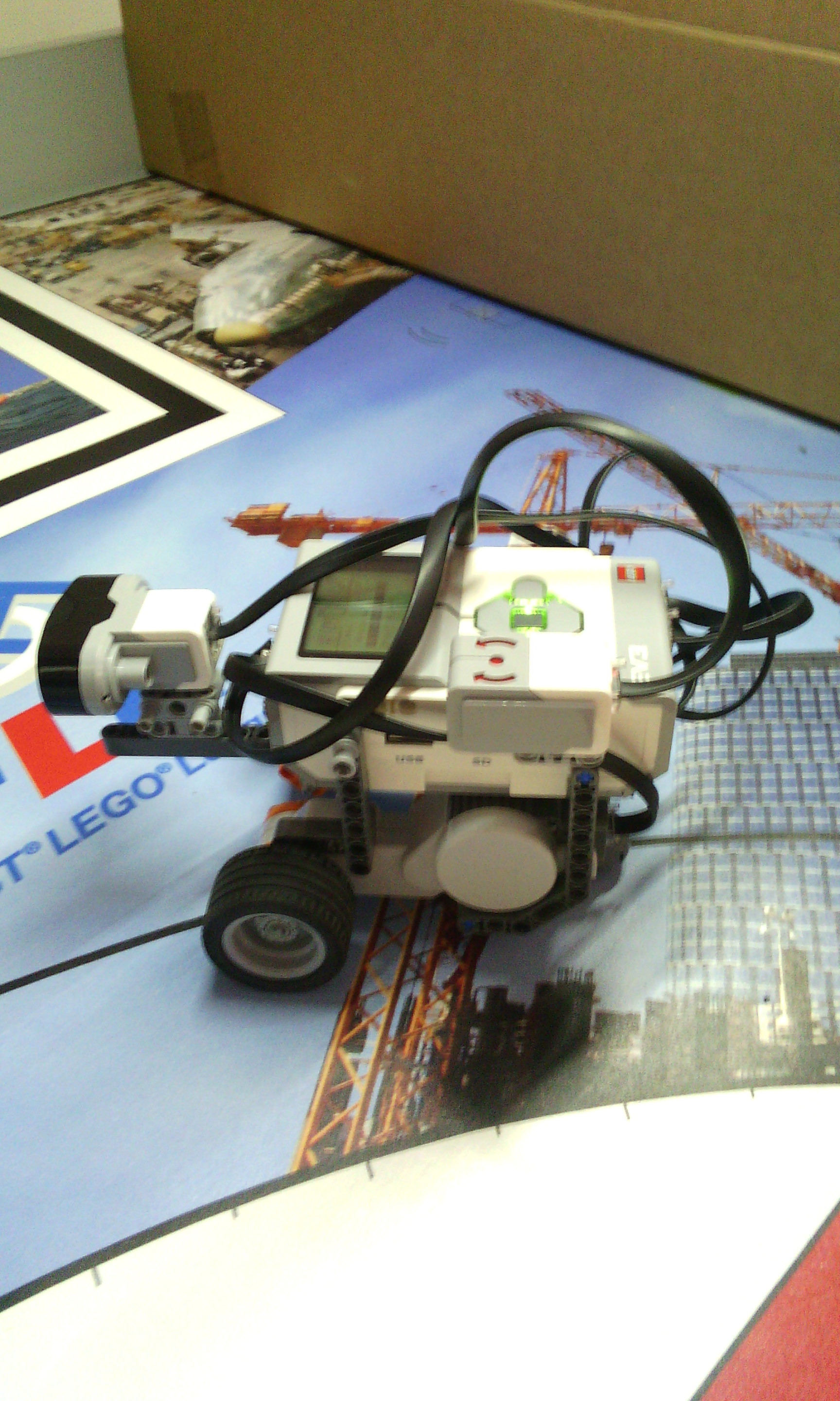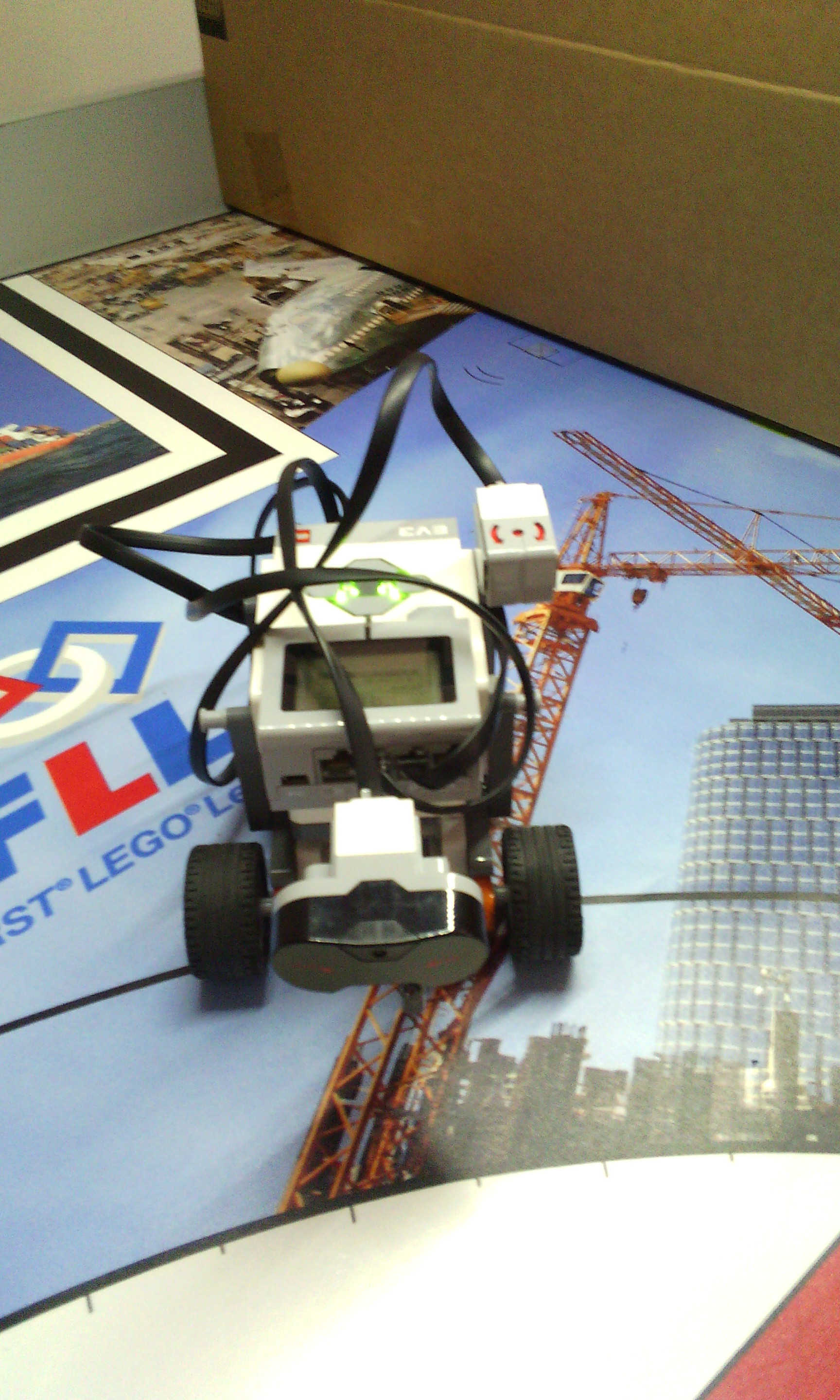 Riešenie 4. kolo Letná liga: Efektívne doplnky a meranie vzdialenosti Efektívne doplnky Náš robot má 2 motory na pohyb a 1 motor na ovládanie nadstavcov. Nadstavce sa ľahko vymieňajú vďaka tomu, že sa zhora nasunia tyčky nadstavca a zacvakne zopár cuplíkov. Nadstavce sa rovno môžu pripojiť na motor. Nadstavce: 1. zobratie slučky: Ruka je priamym prevodom a prevodom 90° napojená na motor. 2. zasunutie krabice: Nepohyblivý nadstavec, ktorý len zasunie krabicu. 3. točenie kolesa: Koleso s pneumatikou je prevodom spojené s motorom. Nestihli sme urobiť ihrisko a program. Meranie vzdialenosti Náš robot má 2 motory na pohyb, 1 ultrasonic senzor a gyroskop. A: K najbližšej stene je to jednoduché, stačí nájsť najmenšiu vzdialenosť, lebo najbližšie je vždy stena. Robot sa točí a mapuje pri tom priestor. Meria vzdialenosť 60 krát každých 6° gyroskopu. Ak je vzdialenosť menšia ako doterajšia najmenšia vzdialenosť, vzdialenosť je zapísaná ako najmenšia vzdialenosť a je zapamätané natočenie robota. Keď skončí mapovanie robot sa točí dokým nie je natočený zapamätané natočenie a ide dopredu dokým vzdialenosť od steny nie je menšia ako 10. Potom robot vydá zvukový signál. B: K stene najďalej je to už zložitejšie. Nestačí nájsť najväčšiu vzdialenosť, lebo najväčšiu vzdialenosť nájde v rohoch. Urobili sme to tak, že najprv zmapuje miestnosť ako v A. Potom zmapuje miestnosť druhýkrát tak, že si z prvého mapovania zapamätá v akom otočení našiel najmenšiu vzdialenosť, lebo vtedy je otočený kolmo na stenu. Meria vzdialenosť 4 krát každých 90° gyroskopu (zmapuje každú zo 4 stien). Keď skončí mapovanie robot sa točí dokým nie je natočený zapamätané natočenie a ide dopredu dokým vzdialenosť od steny nie je menšia ako 10. Potom robot vydá zvukový signál.