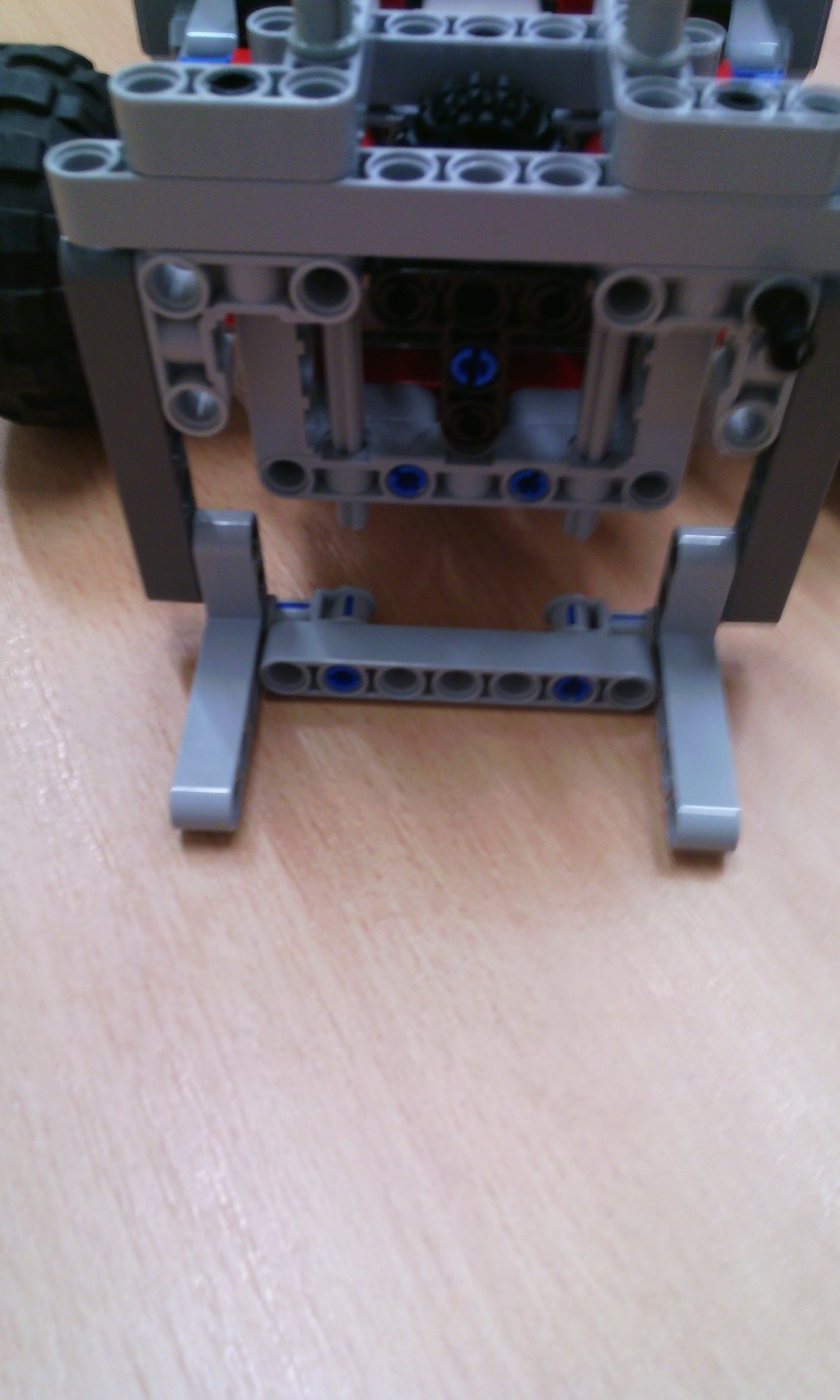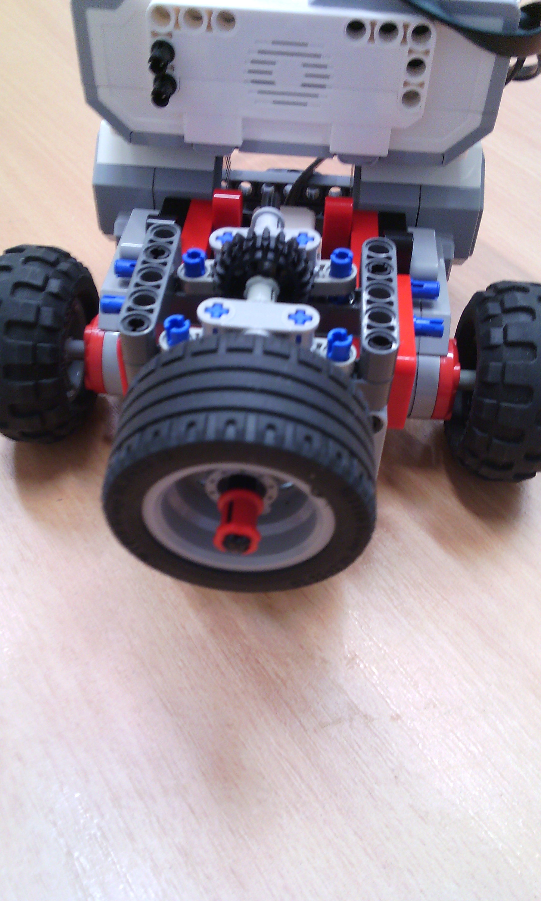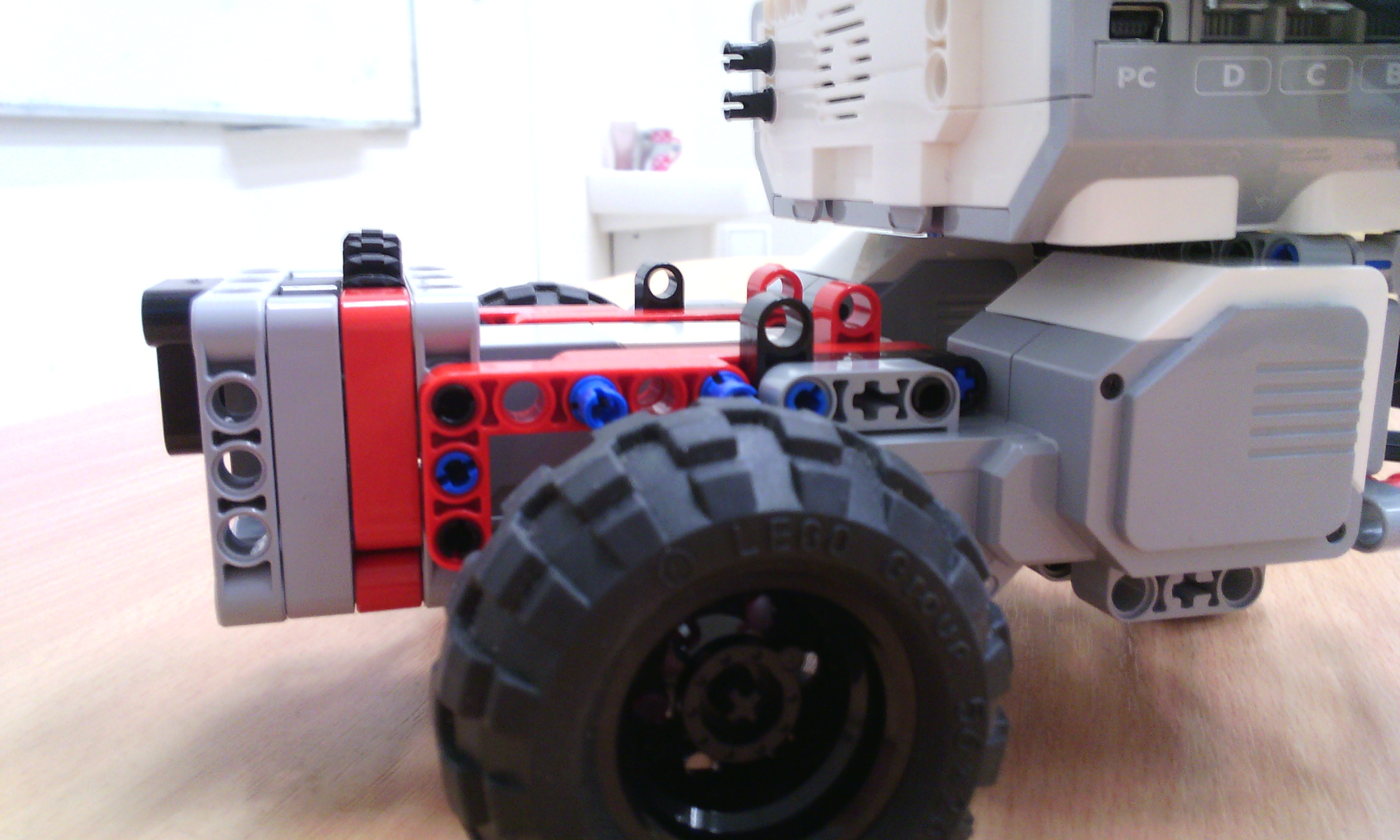 Riešenie 4. kolo Letná liga: Efektívne doplnky a meranie vzdialenosti Efektívne doplnky Náš robot má 2 motory na pohyb a 1 motor na ovládanie nadstavcov. Nadstavce sa ľahko vymieňajú vďaka tomu, že sa zhora nasunia tyčky nadstavca a zacvakne zopár cuplíkov. Nadstavce sa rovno môžu pripojiť na motor. Nadstavce: 1. zobratie slučky: Ruka je priamym prevodom a prevodom 90° napojená na motor. 2. zasunutie krabice: Nepohyblivý nadstavec, ktorý len zasunie krabicu. 3. točenie kolesa: Koleso s pneumatikou je prevodom spojené s motorom. Nestihli sme urobiť ihrisko a program. Meranie vzdialenosti Náš robot má 2 motory na pohyb, 1 ultrasonic senzor a gyroskop. A: K najbližšej stene je to jednoduché, stačí nájsť najmenšiu vzdialenosť, lebo najbližšie je vždy stena. Robot sa točí a mapuje pri tom priestor. Meria vzdialenosť 60 krát každých 6° gyroskopu. Ak je vzdialenosť menšia ako doterajšia najmenšia vzdialenosť, vzdialenosť je zapísaná ako najmenšia vzdialenosť a je zapamätané natočenie robota. Keď skončí mapovanie robot sa točí dokým nie je natočený zapamätané natočenie a ide dopredu dokým vzdialenosť od steny nie je menšia ako 10. Potom robot vydá zvukový signál. B: K stene najďalej je to už zložitejšie. Nestačí nájsť najväčšiu vzdialenosť, lebo najväčšiu vzdialenosť nájde v rohoch. Urobili sme to tak, že najprv zmapuje miestnosť ako v A. Potom zmapuje miestnosť druhýkrát tak, že si z prvého mapovania zapamätá v akom otočení našiel najmenšiu vzdialenosť, lebo vtedy je otočený kolmo na stenu. Meria vzdialenosť 4 krát každých 90° gyroskopu (zmapuje každú zo 4 stien). Keď skončí mapovanie robot sa točí dokým nie je natočený zapamätané natočenie a ide dopredu dokým vzdialenosť od steny nie je menšia ako 10. Potom robot vydá zvukový signál.