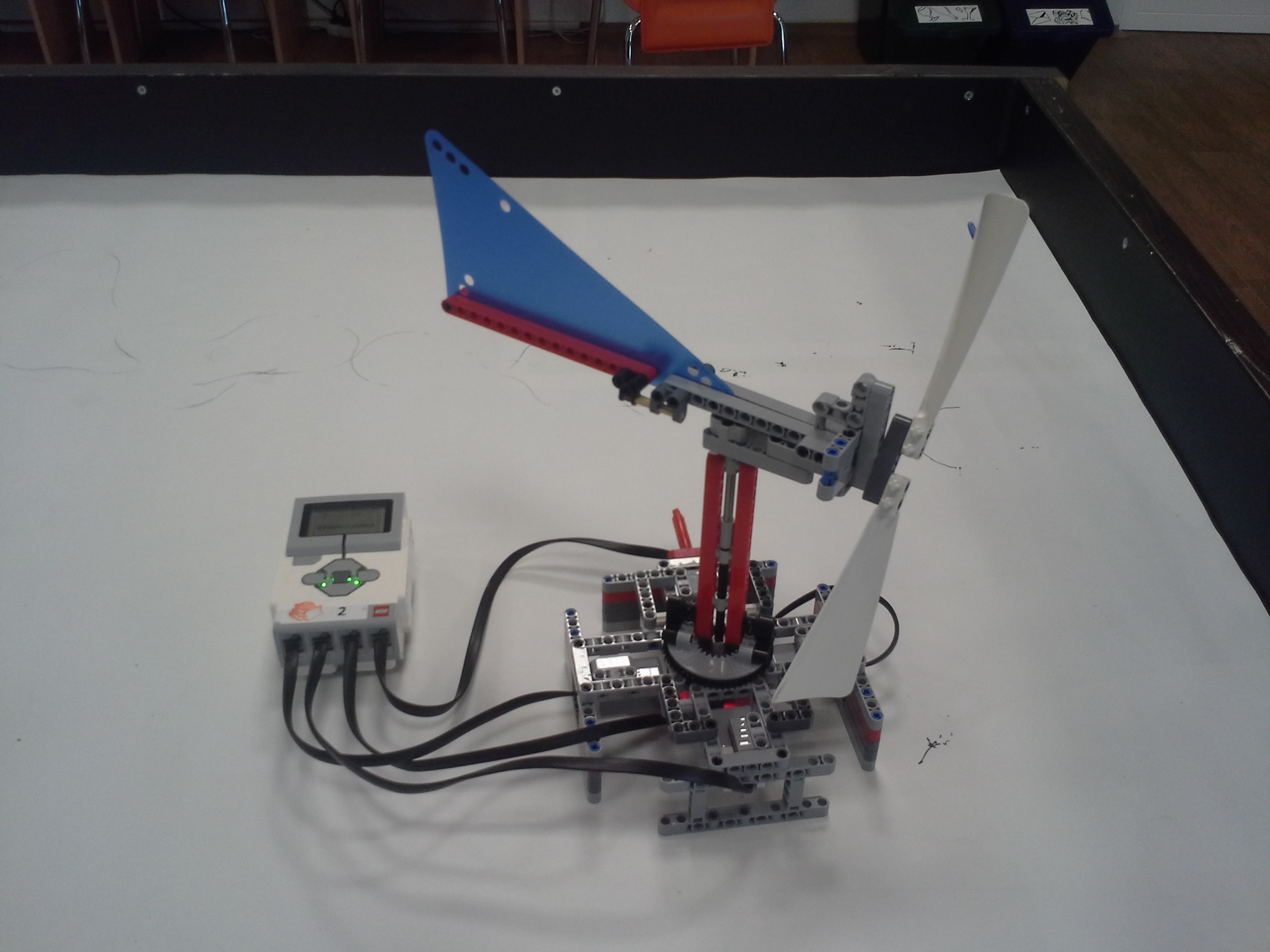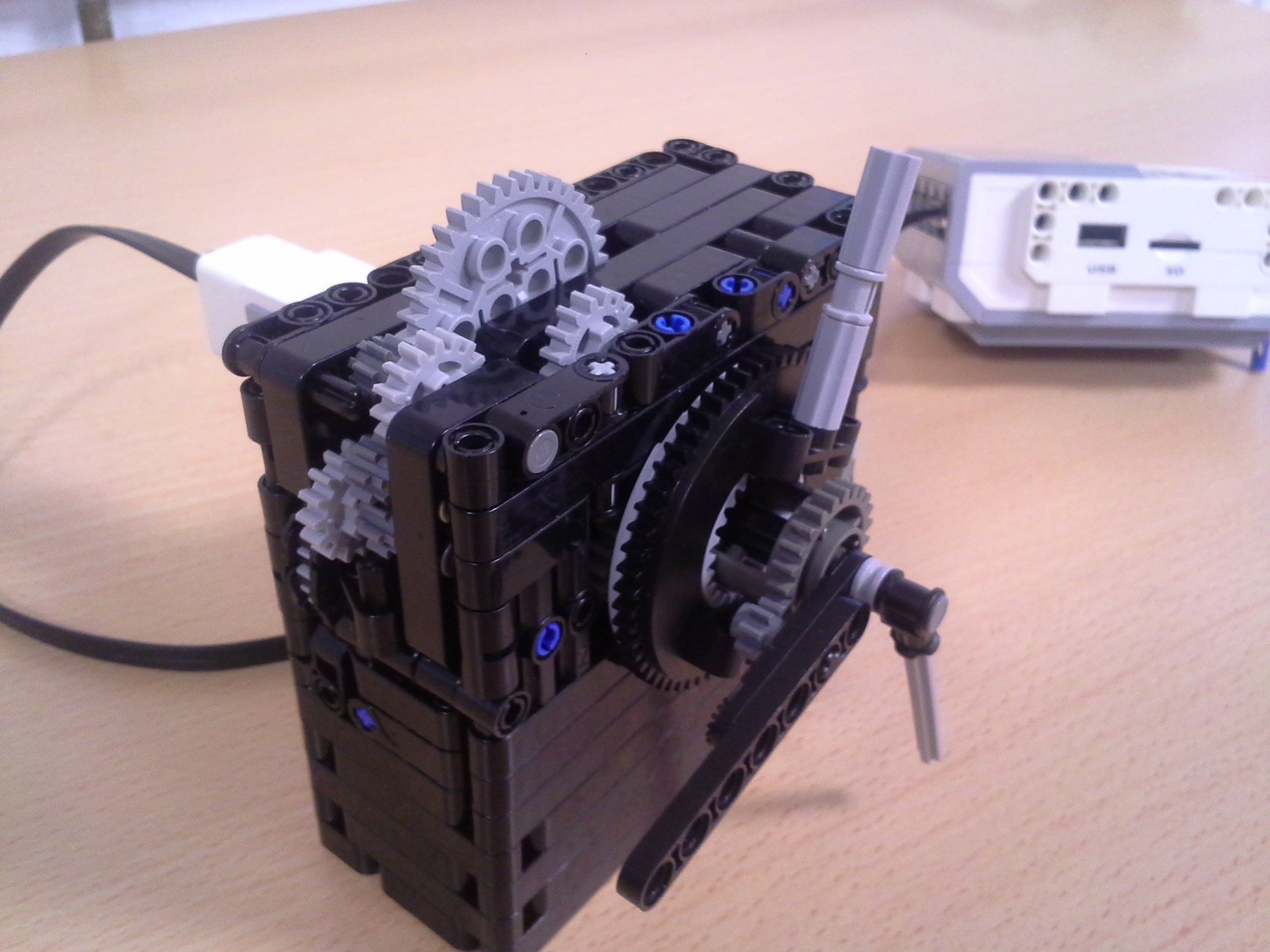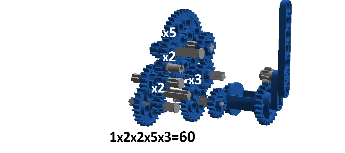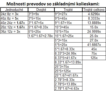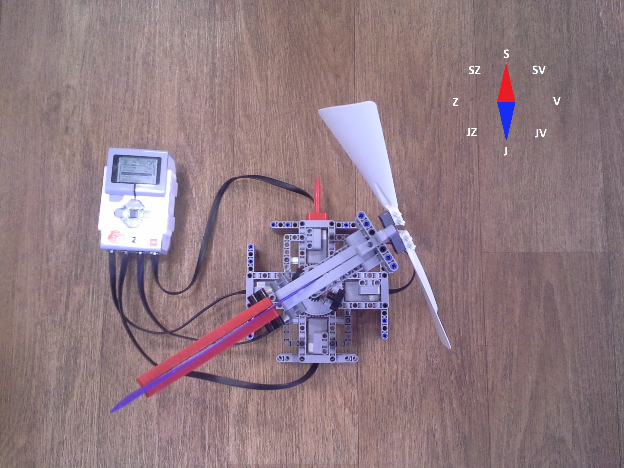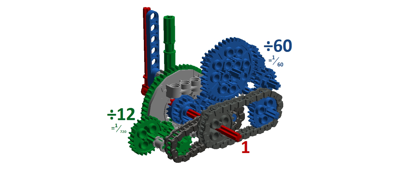 Hodiny: Rozhodli sme sa spraviť hodiny so všetkými tromi ručičkami, ale aby sme mohli mať 3 ručičky na rovnakej osi, museli sme použiť ozubené koliesko s 56 zubmi, ktoré má uprostred dieru, pretože sme tade museli naviesť osi pre ďalšie dve ručičky. Ale aby nám vyšli výpočty v prevodoch, museli sme na toto ozubené koleso napojiť ozubené koliesko s počtom zúbkov deliteľným 7, takže sme museli použiť koliesko so 14 zubmi zo starších LEGO stavebníc. Obidve hodiny fungujú na v podstate rovnakom systéme. Sekundová ručička je napojená rovno na motor a od nej je prevodmi odvedená minútová a na ňu hodinová. Minútová je od sekundovej 60x spomalená v Možnosti B prevodmi 5x3x2x1x2= 60 a v Možnosti A prevodmi 2x1x2x5x1x3= 60 znázorneními na obrázku modrou farbou. Hodinová je od minútovej 12x spomalená (a od sekundovej 720x) v Možnosti B prevodmi 5x3x2x3x2x1x4= 720 a v Možnosti A prevodmi (2x1x2x5x1x3) x3x4= 60x12= 720, znázorneními na obrázku zelenou farbou. K riešeniu pridávame aj LDD-model hodín z Možnosti A. Vzorec: Musíme vydeliť počet zubov väčšieho kolieska počtom zubov menšieho kolieska, a vyjde nám koľko-krát bude výstup prevodu rýchlejší/pomalší ako vstup. (Oa:Ob=v×) Zrýchlenia/zpomalenia sa navzájom násobia. Fotky všetkých jednoduchých prevodov nájdete na: https://goo.gl/photos/5UpXR31HEwf9zXKa9 a vypisovať aj dvojité či trojité sa nám zdalo zbytočné keďže to budú iba navzájom vynásobené jednoduché prevody, ale aj tak sme sa rozhodli o tom spraviť tabuľku. // Meteorológia: Zostrojili sme štyri meteorologické prístroje na meranie rýchlosti vetra, smeru vetra, množstva zrážok a jas slnka. - Zrážkomer - meria koľko ml zrážok naprší na plochu dna kadičky, premieňa to na ml/cm2. Výšku hladiny meria pomocou plaváku na hladine, ktorého výšku sníma ultrazvukový senzor pomocou systému dvojramennej váhy. - Snímač jasnosti slnka - meria jasnosť slnka 2 senzormi (NXT, EV3), a potom vypočíta priemer hodnôt a napíše ho na display-i. - Miskový anemometer - rýchlosť vetra zaznamenávame štyrmi lopatkami na osi ku ktorej je zospodu pripojená súčiastka ktorú každých 360° zaznamená senzor svetla, zapíše si čas medzi jednotlivými záznamami, prepočíta to a z toho vyhodnotí rýchlosť vetra (v km/h), ktorú potom napíše na display-i. Kvôli bezveternému počasiu sme museli použiť namiesto vetra zmotorizovanú vrtuľu. - Anemometer - smer vetra sme merali vrtuľou s chvostom o ktorý sa zaprie vietor a vyrovná vrtuľu v smere vetra. Polohu vrtule zaznamenávajú farebné senzory na spodku konštrukcie pred ktorými je koleso z farebne označenými časťami. Podľa toho na ktorú stranu je otočená označená časť kolesa, tú svetovú stranu robot napíše na obrazovke. Sever označuje červený ukazateľ na spodku konštrukcie. // Pridávame linku na videá vo vysokej kvalite, keďže na YouTube videu nevidno dobre displej: - meteorologia (199 MB) - hodiny (523 MB)