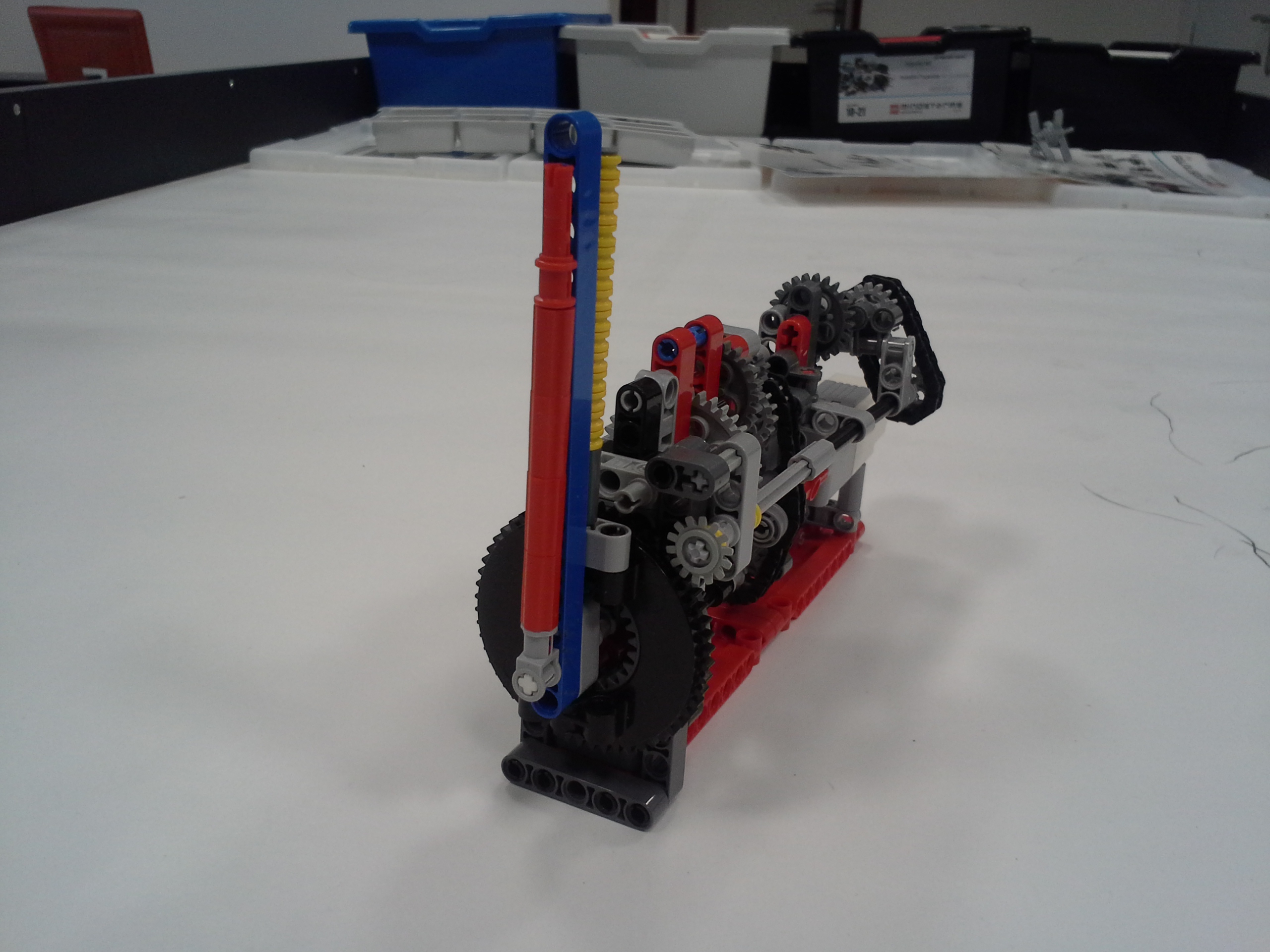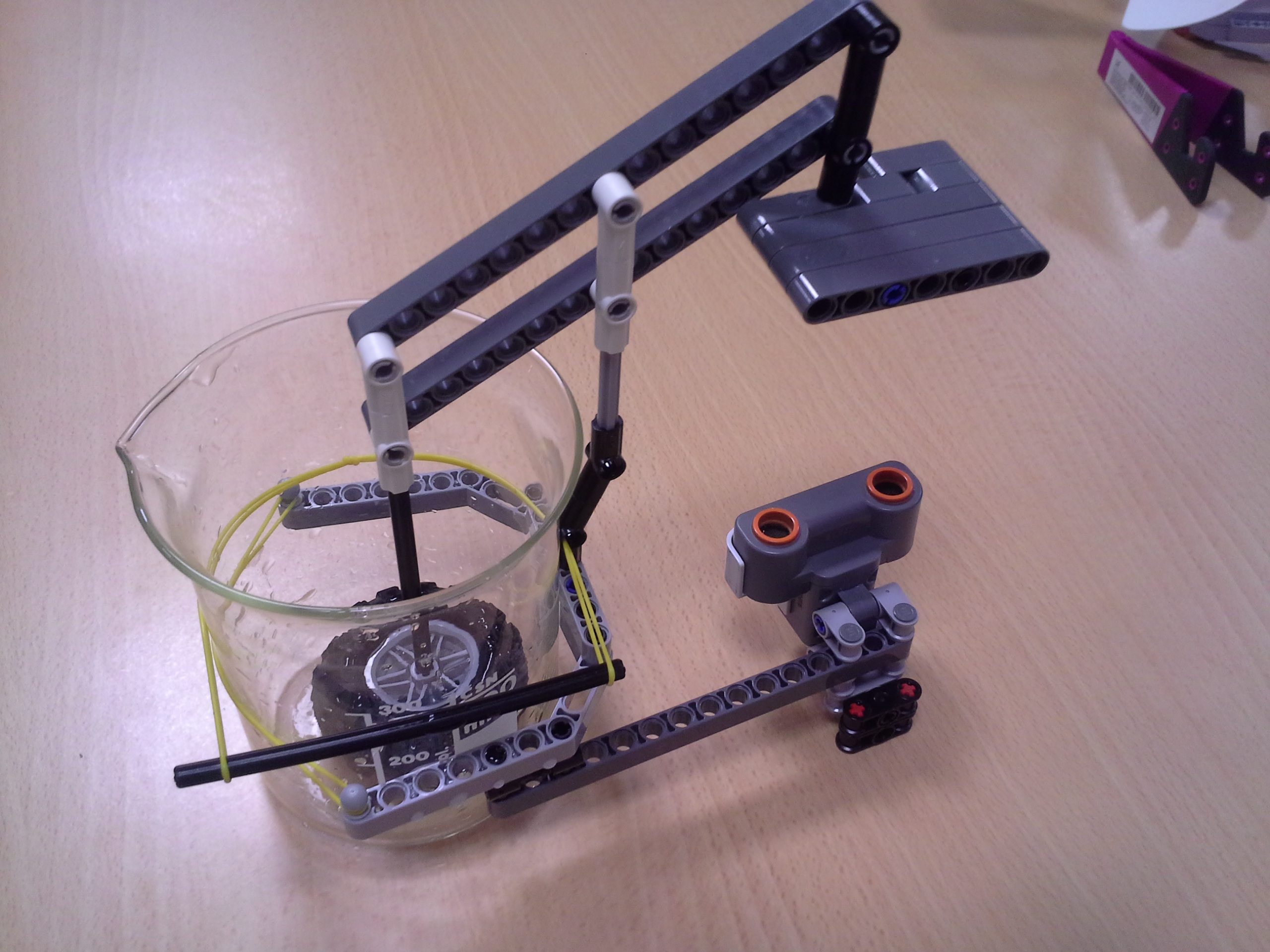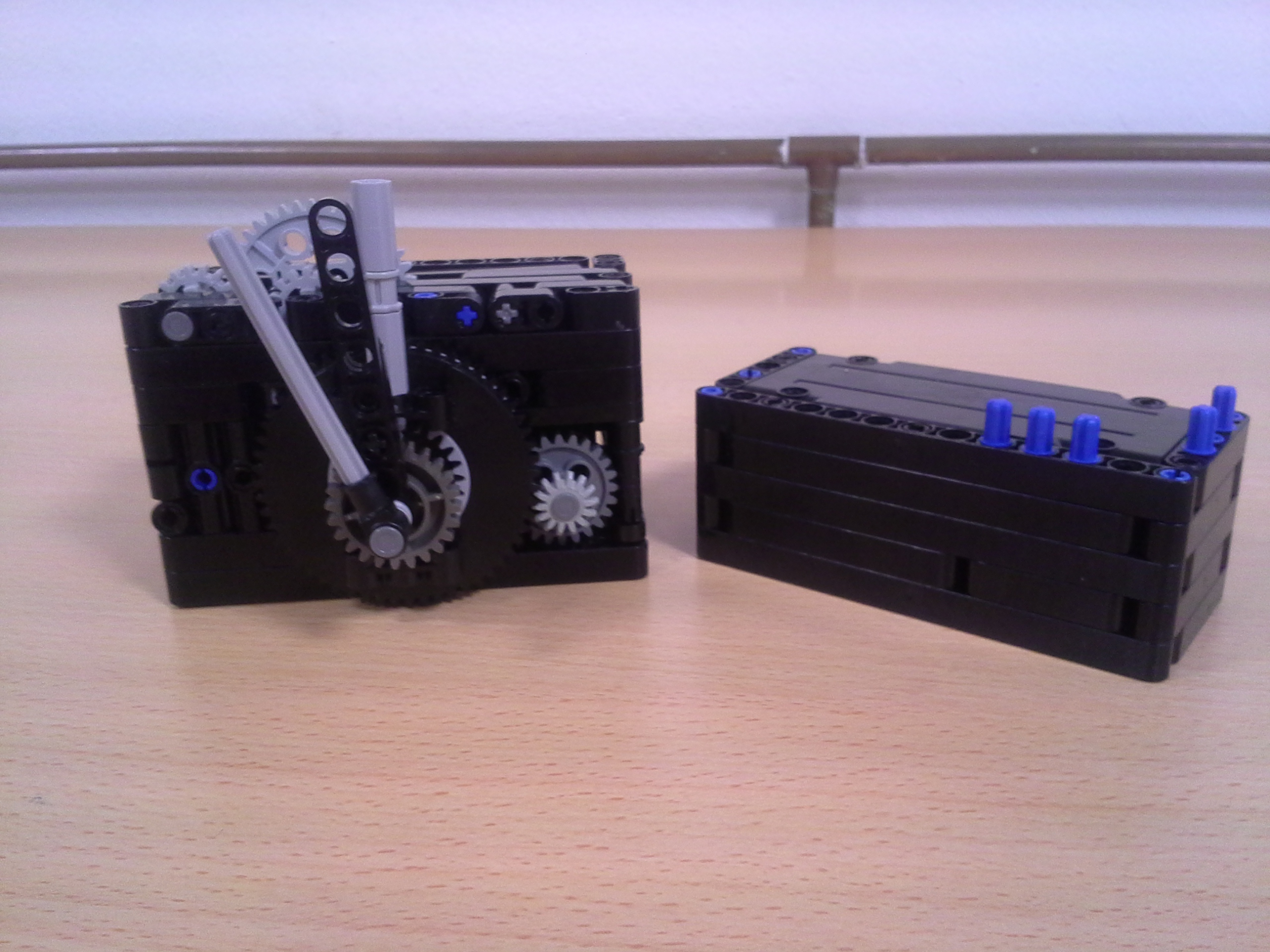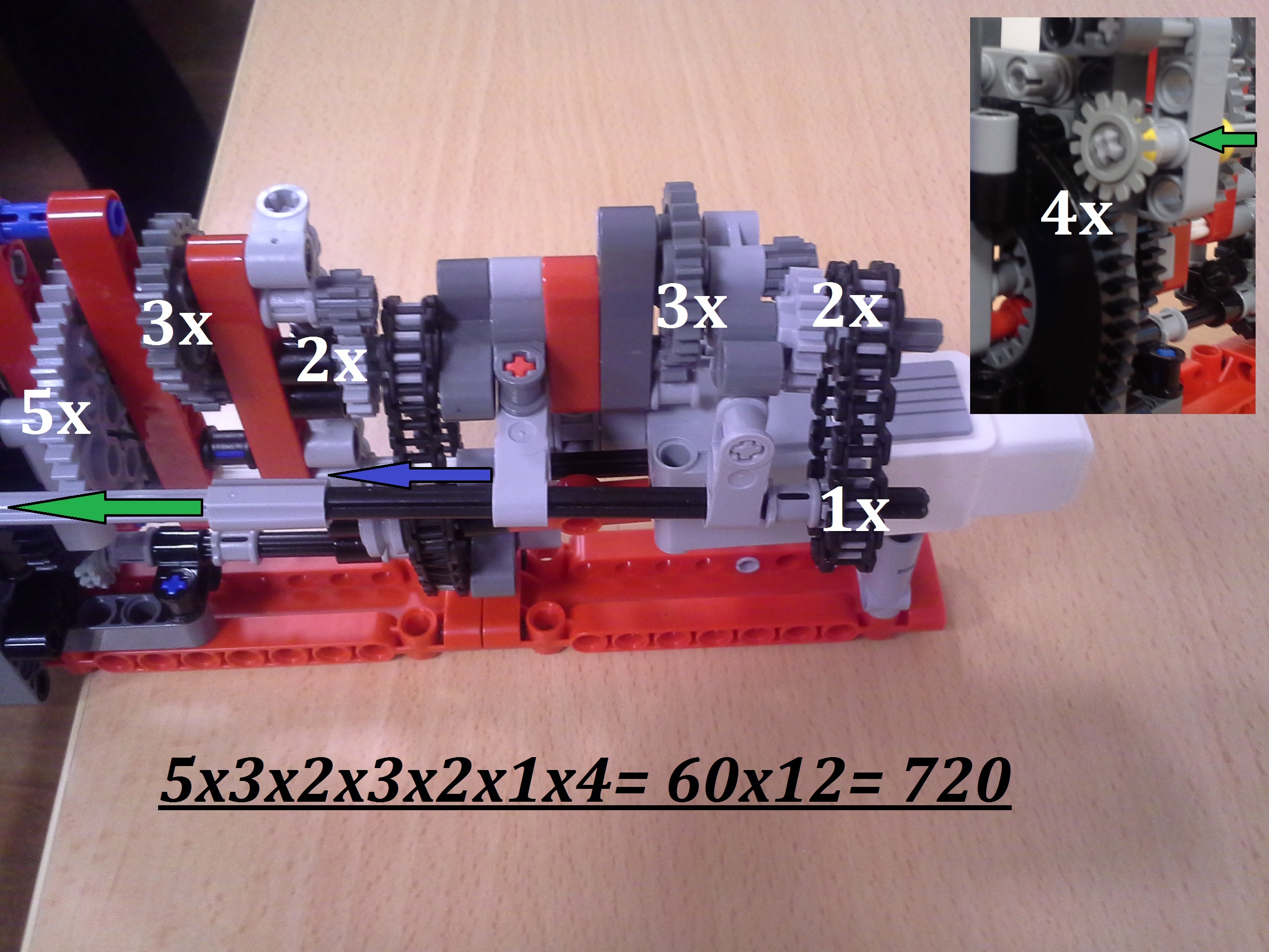 Hodiny: Rozhodli sme sa spraviť hodiny so všetkými tromi ručičkami, ale aby sme mohli mať 3 ručičky na rovnakej osi, museli sme použiť ozubené koliesko s 56 zubmi, ktoré má uprostred dieru, pretože sme tade museli naviesť osi pre ďalšie dve ručičky. Ale aby nám vyšli výpočty v prevodoch, museli sme na toto ozubené koleso napojiť ozubené koliesko s počtom zúbkov deliteľným 7, takže sme museli použiť koliesko so 14 zubmi zo starších LEGO stavebníc. Obidve hodiny fungujú na v podstate rovnakom systéme. Sekundová ručička je napojená rovno na motor a od nej je prevodmi odvedená minútová a na ňu hodinová. Minútová je od sekundovej 60x spomalená v Možnosti B prevodmi 5x3x2x1x2= 60 a v Možnosti A prevodmi 2x1x2x5x1x3= 60 znázorneními na obrázku modrou farbou. Hodinová je od minútovej 12x spomalená (a od sekundovej 720x) v Možnosti B prevodmi 5x3x2x3x2x1x4= 720 a v Možnosti A prevodmi (2x1x2x5x1x3) x3x4= 60x12= 720, znázorneními na obrázku zelenou farbou. K riešeniu pridávame aj LDD-model hodín z Možnosti A. Vzorec: Musíme vydeliť počet zubov väčšieho kolieska počtom zubov menšieho kolieska, a vyjde nám koľko-krát bude výstup prevodu rýchlejší/pomalší ako vstup. (Oa:Ob=v×) Zrýchlenia/zpomalenia sa navzájom násobia. Fotky všetkých jednoduchých prevodov nájdete na: https://goo.gl/photos/5UpXR31HEwf9zXKa9 a vypisovať aj dvojité či trojité sa nám zdalo zbytočné keďže to budú iba navzájom vynásobené jednoduché prevody, ale aj tak sme sa rozhodli o tom spraviť tabuľku. // Meteorológia: Zostrojili sme štyri meteorologické prístroje na meranie rýchlosti vetra, smeru vetra, množstva zrážok a jas slnka. - Zrážkomer - meria koľko ml zrážok naprší na plochu dna kadičky, premieňa to na ml/cm2. Výšku hladiny meria pomocou plaváku na hladine, ktorého výšku sníma ultrazvukový senzor pomocou systému dvojramennej váhy. - Snímač jasnosti slnka - meria jasnosť slnka 2 senzormi (NXT, EV3), a potom vypočíta priemer hodnôt a napíše ho na display-i. - Miskový anemometer - rýchlosť vetra zaznamenávame štyrmi lopatkami na osi ku ktorej je zospodu pripojená súčiastka ktorú každých 360° zaznamená senzor svetla, zapíše si čas medzi jednotlivými záznamami, prepočíta to a z toho vyhodnotí rýchlosť vetra (v km/h), ktorú potom napíše na display-i. Kvôli bezveternému počasiu sme museli použiť namiesto vetra zmotorizovanú vrtuľu. - Anemometer - smer vetra sme merali vrtuľou s chvostom o ktorý sa zaprie vietor a vyrovná vrtuľu v smere vetra. Polohu vrtule zaznamenávajú farebné senzory na spodku konštrukcie pred ktorými je koleso z farebne označenými časťami. Podľa toho na ktorú stranu je otočená označená časť kolesa, tú svetovú stranu robot napíše na obrazovke. Sever označuje červený ukazateľ na spodku konštrukcie. // Pridávame linku na videá vo vysokej kvalite, keďže na YouTube videu nevidno dobre displej: - meteorologia (199 MB) - hodiny (523 MB)
