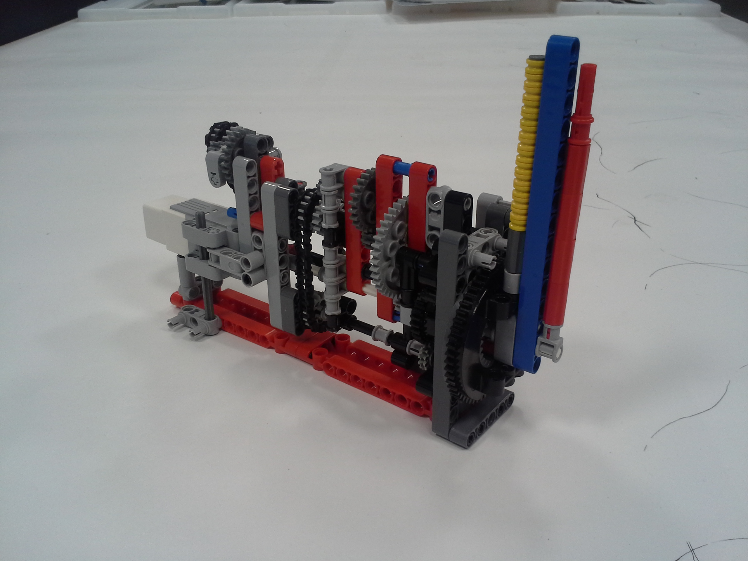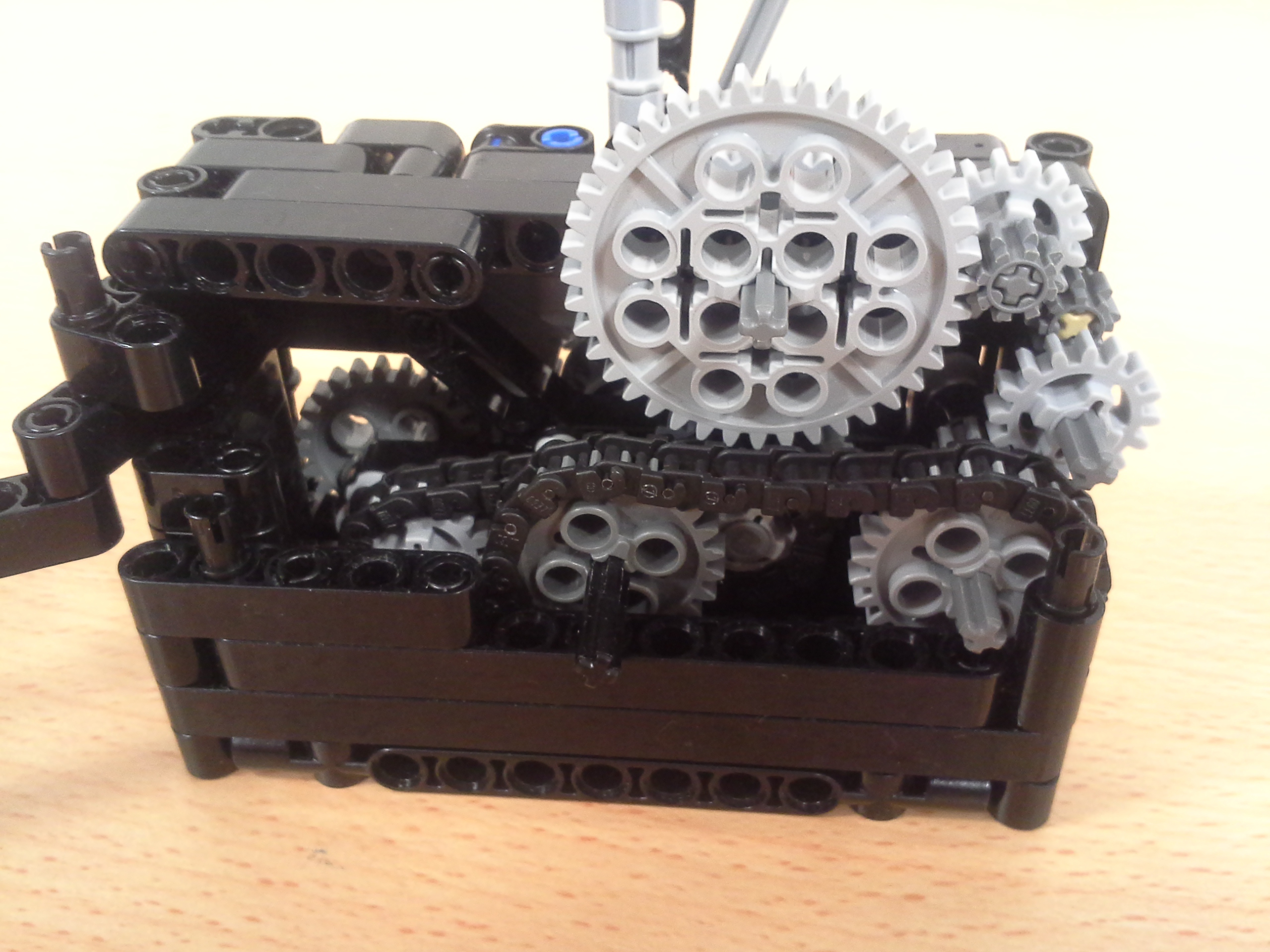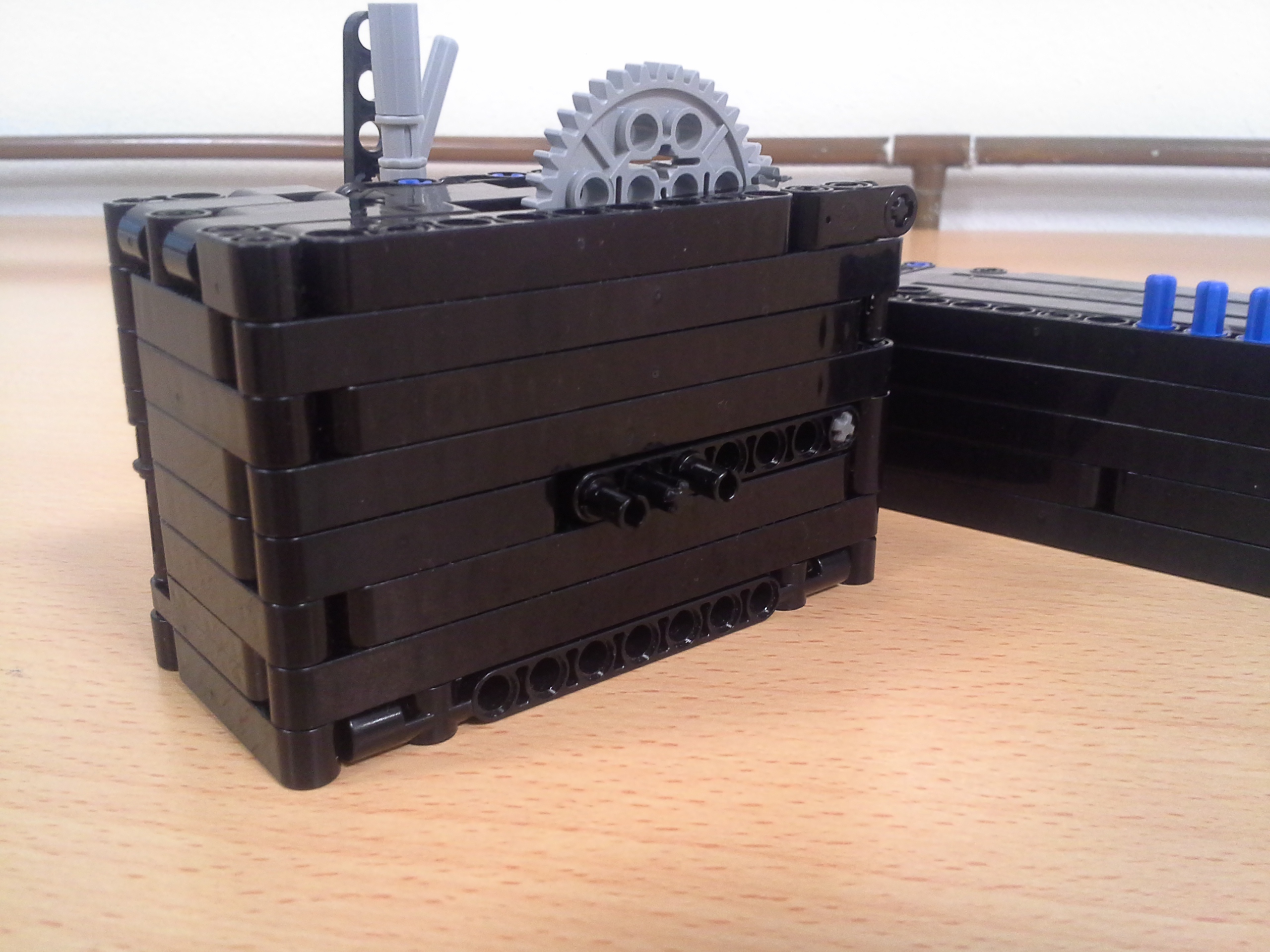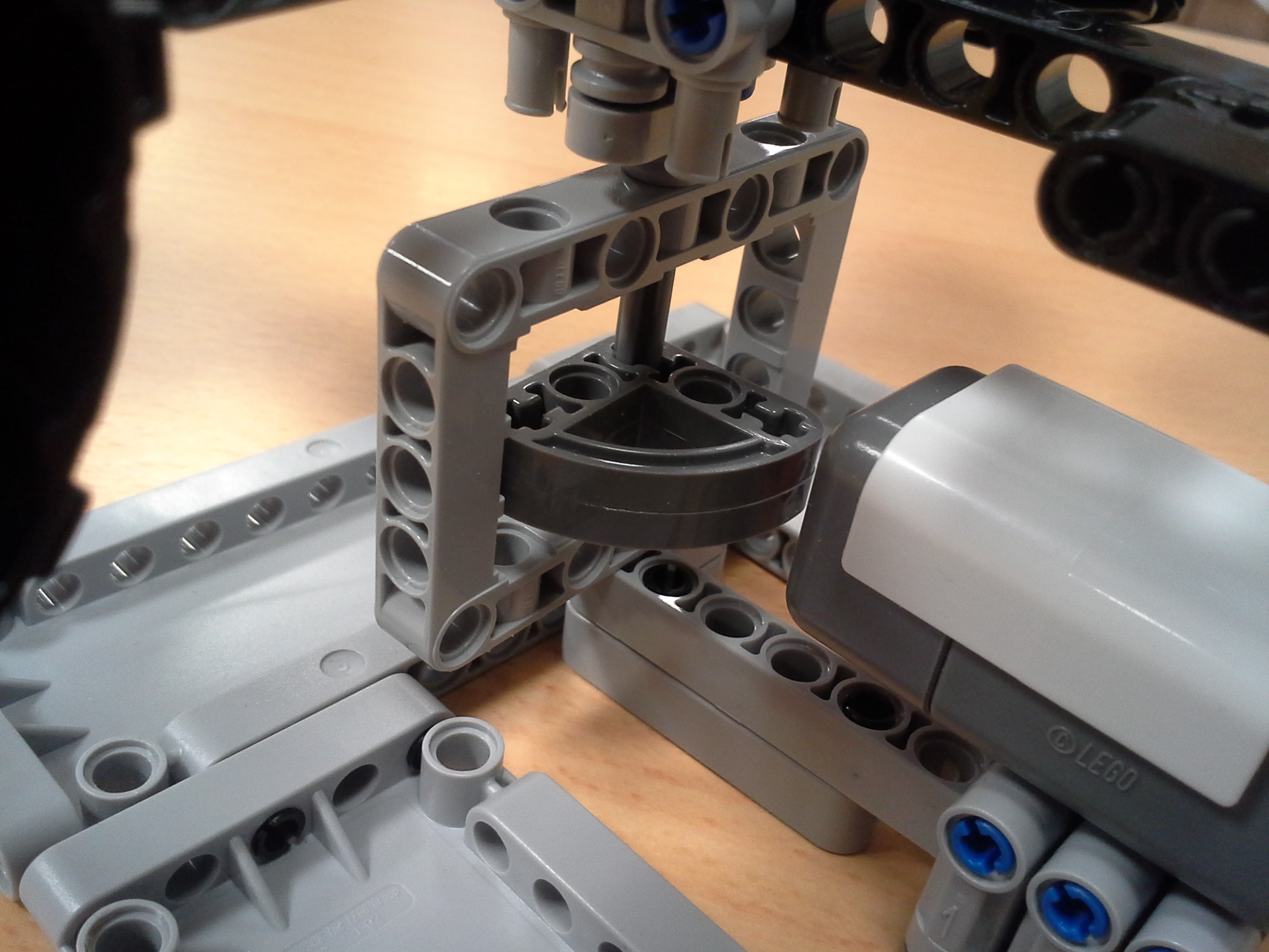 Hodiny: Rozhodli sme sa spraviť hodiny so všetkými tromi ručičkami, ale aby sme mohli mať 3 ručičky na rovnakej osi, museli sme použiť ozubené koliesko s 56 zubmi, ktoré má uprostred dieru, pretože sme tade museli naviesť osi pre ďalšie dve ručičky. Ale aby nám vyšli výpočty v prevodoch, museli sme na toto ozubené koleso napojiť ozubené koliesko s počtom zúbkov deliteľným 7, takže sme museli použiť koliesko so 14 zubmi zo starších LEGO stavebníc. Obidve hodiny fungujú na v podstate rovnakom systéme. Sekundová ručička je napojená rovno na motor a od nej je prevodmi odvedená minútová a na ňu hodinová. Minútová je od sekundovej 60x spomalená v Možnosti B prevodmi 5x3x2x1x2= 60 a v Možnosti A prevodmi 2x1x2x5x1x3= 60 znázorneními na obrázku modrou farbou. Hodinová je od minútovej 12x spomalená (a od sekundovej 720x) v Možnosti B prevodmi 5x3x2x3x2x1x4= 720 a v Možnosti A prevodmi (2x1x2x5x1x3) x3x4= 60x12= 720, znázorneními na obrázku zelenou farbou. K riešeniu pridávame aj LDD-model hodín z Možnosti A. Vzorec: Musíme vydeliť počet zubov väčšieho kolieska počtom zubov menšieho kolieska, a vyjde nám koľko-krát bude výstup prevodu rýchlejší/pomalší ako vstup. (Oa:Ob=v×) Zrýchlenia/zpomalenia sa navzájom násobia. Fotky všetkých jednoduchých prevodov nájdete na: https://goo.gl/photos/5UpXR31HEwf9zXKa9 a vypisovať aj dvojité či trojité sa nám zdalo zbytočné keďže to budú iba navzájom vynásobené jednoduché prevody, ale aj tak sme sa rozhodli o tom spraviť tabuľku. // Meteorológia: Zostrojili sme štyri meteorologické prístroje na meranie rýchlosti vetra, smeru vetra, množstva zrážok a jas slnka. - Zrážkomer - meria koľko ml zrážok naprší na plochu dna kadičky, premieňa to na ml/cm2. Výšku hladiny meria pomocou plaváku na hladine, ktorého výšku sníma ultrazvukový senzor pomocou systému dvojramennej váhy. - Snímač jasnosti slnka - meria jasnosť slnka 2 senzormi (NXT, EV3), a potom vypočíta priemer hodnôt a napíše ho na display-i. - Miskový anemometer - rýchlosť vetra zaznamenávame štyrmi lopatkami na osi ku ktorej je zospodu pripojená súčiastka ktorú každých 360° zaznamená senzor svetla, zapíše si čas medzi jednotlivými záznamami, prepočíta to a z toho vyhodnotí rýchlosť vetra (v km/h), ktorú potom napíše na display-i. Kvôli bezveternému počasiu sme museli použiť namiesto vetra zmotorizovanú vrtuľu. - Anemometer - smer vetra sme merali vrtuľou s chvostom o ktorý sa zaprie vietor a vyrovná vrtuľu v smere vetra. Polohu vrtule zaznamenávajú farebné senzory na spodku konštrukcie pred ktorými je koleso z farebne označenými časťami. Podľa toho na ktorú stranu je otočená označená časť kolesa, tú svetovú stranu robot napíše na obrazovke. Sever označuje červený ukazateľ na spodku konštrukcie. // Pridávame linku na videá vo vysokej kvalite, keďže na YouTube videu nevidno dobre displej: - meteorologia (199 MB) - hodiny (523 MB)