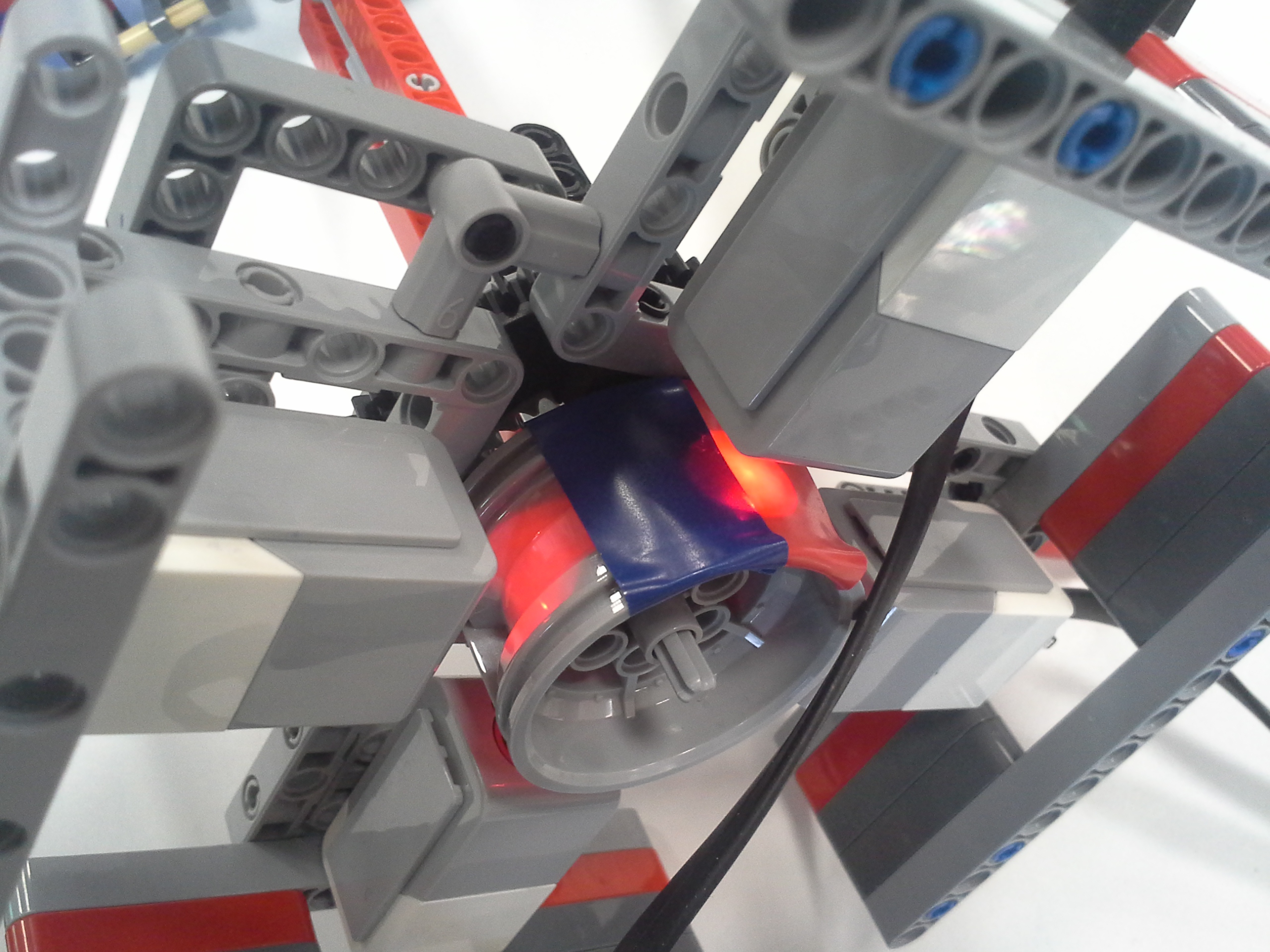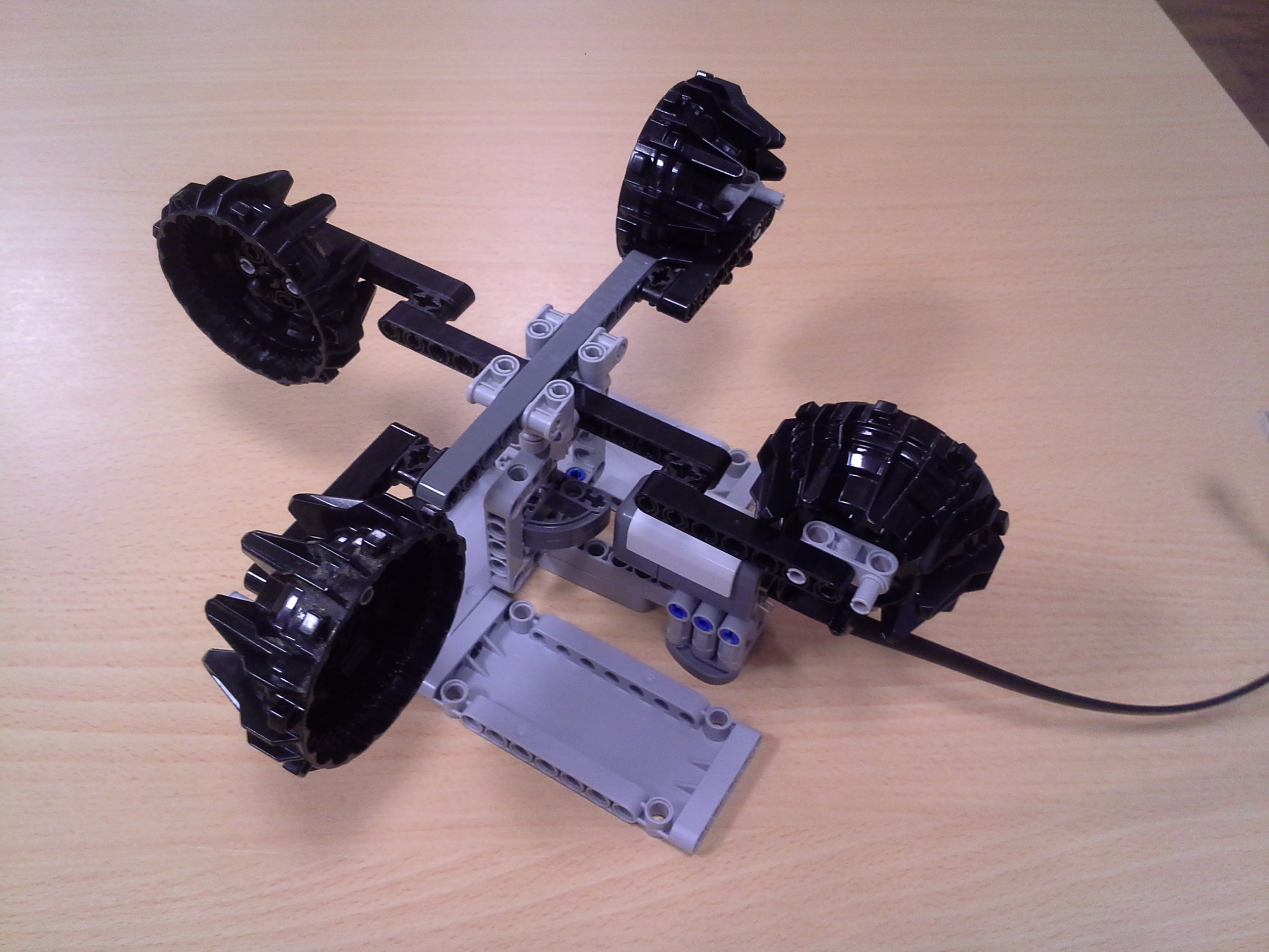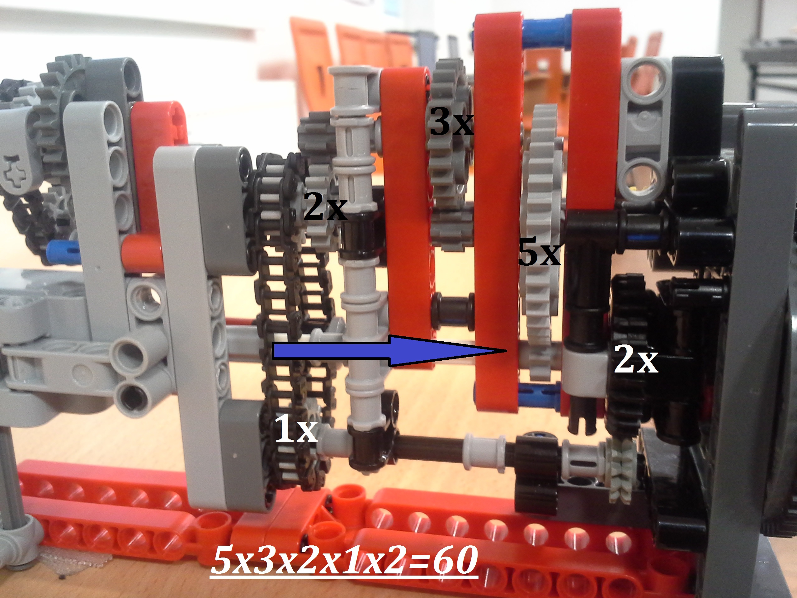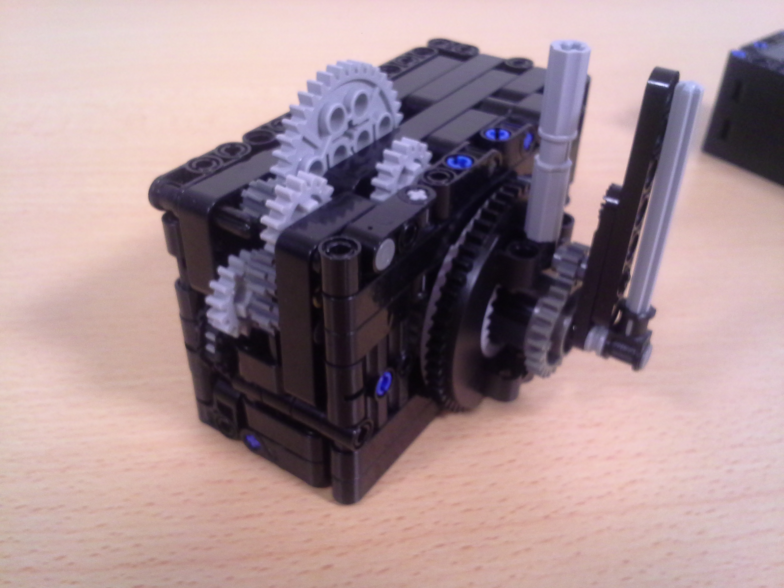 Hodiny: Rozhodli sme sa spraviť hodiny so všetkými tromi ručičkami, ale aby sme mohli mať 3 ručičky na rovnakej osi, museli sme použiť ozubené koliesko s 56 zubmi, ktoré má uprostred dieru, pretože sme tade museli naviesť osi pre ďalšie dve ručičky. Ale aby nám vyšli výpočty v prevodoch, museli sme na toto ozubené koleso napojiť ozubené koliesko s počtom zúbkov deliteľným 7, takže sme museli použiť koliesko so 14 zubmi zo starších LEGO stavebníc. Obidve hodiny fungujú na v podstate rovnakom systéme. Sekundová ručička je napojená rovno na motor a od nej je prevodmi odvedená minútová a na ňu hodinová. Minútová je od sekundovej 60x spomalená v Možnosti B prevodmi 5x3x2x1x2= 60 a v Možnosti A prevodmi 2x1x2x5x1x3= 60 znázorneními na obrázku modrou farbou. Hodinová je od minútovej 12x spomalená (a od sekundovej 720x) v Možnosti B prevodmi 5x3x2x3x2x1x4= 720 a v Možnosti A prevodmi (2x1x2x5x1x3) x3x4= 60x12= 720, znázorneními na obrázku zelenou farbou. K riešeniu pridávame aj LDD-model hodín z Možnosti A. Vzorec: Musíme vydeliť počet zubov väčšieho kolieska počtom zubov menšieho kolieska, a vyjde nám koľko-krát bude výstup prevodu rýchlejší/pomalší ako vstup. (Oa:Ob=v×) Zrýchlenia/zpomalenia sa navzájom násobia. Fotky všetkých jednoduchých prevodov nájdete na: https://goo.gl/photos/5UpXR31HEwf9zXKa9 a vypisovať aj dvojité či trojité sa nám zdalo zbytočné keďže to budú iba navzájom vynásobené jednoduché prevody, ale aj tak sme sa rozhodli o tom spraviť tabuľku. // Meteorológia: Zostrojili sme štyri meteorologické prístroje na meranie rýchlosti vetra, smeru vetra, množstva zrážok a jas slnka. - Zrážkomer - meria koľko ml zrážok naprší na plochu dna kadičky, premieňa to na ml/cm2. Výšku hladiny meria pomocou plaváku na hladine, ktorého výšku sníma ultrazvukový senzor pomocou systému dvojramennej váhy. - Snímač jasnosti slnka - meria jasnosť slnka 2 senzormi (NXT, EV3), a potom vypočíta priemer hodnôt a napíše ho na display-i. - Miskový anemometer - rýchlosť vetra zaznamenávame štyrmi lopatkami na osi ku ktorej je zospodu pripojená súčiastka ktorú každých 360° zaznamená senzor svetla, zapíše si čas medzi jednotlivými záznamami, prepočíta to a z toho vyhodnotí rýchlosť vetra (v km/h), ktorú potom napíše na display-i. Kvôli bezveternému počasiu sme museli použiť namiesto vetra zmotorizovanú vrtuľu. - Anemometer - smer vetra sme merali vrtuľou s chvostom o ktorý sa zaprie vietor a vyrovná vrtuľu v smere vetra. Polohu vrtule zaznamenávajú farebné senzory na spodku konštrukcie pred ktorými je koleso z farebne označenými časťami. Podľa toho na ktorú stranu je otočená označená časť kolesa, tú svetovú stranu robot napíše na obrazovke. Sever označuje červený ukazateľ na spodku konštrukcie. // Pridávame linku na videá vo vysokej kvalite, keďže na YouTube videu nevidno dobre displej: - meteorologia (199 MB) - hodiny (523 MB)